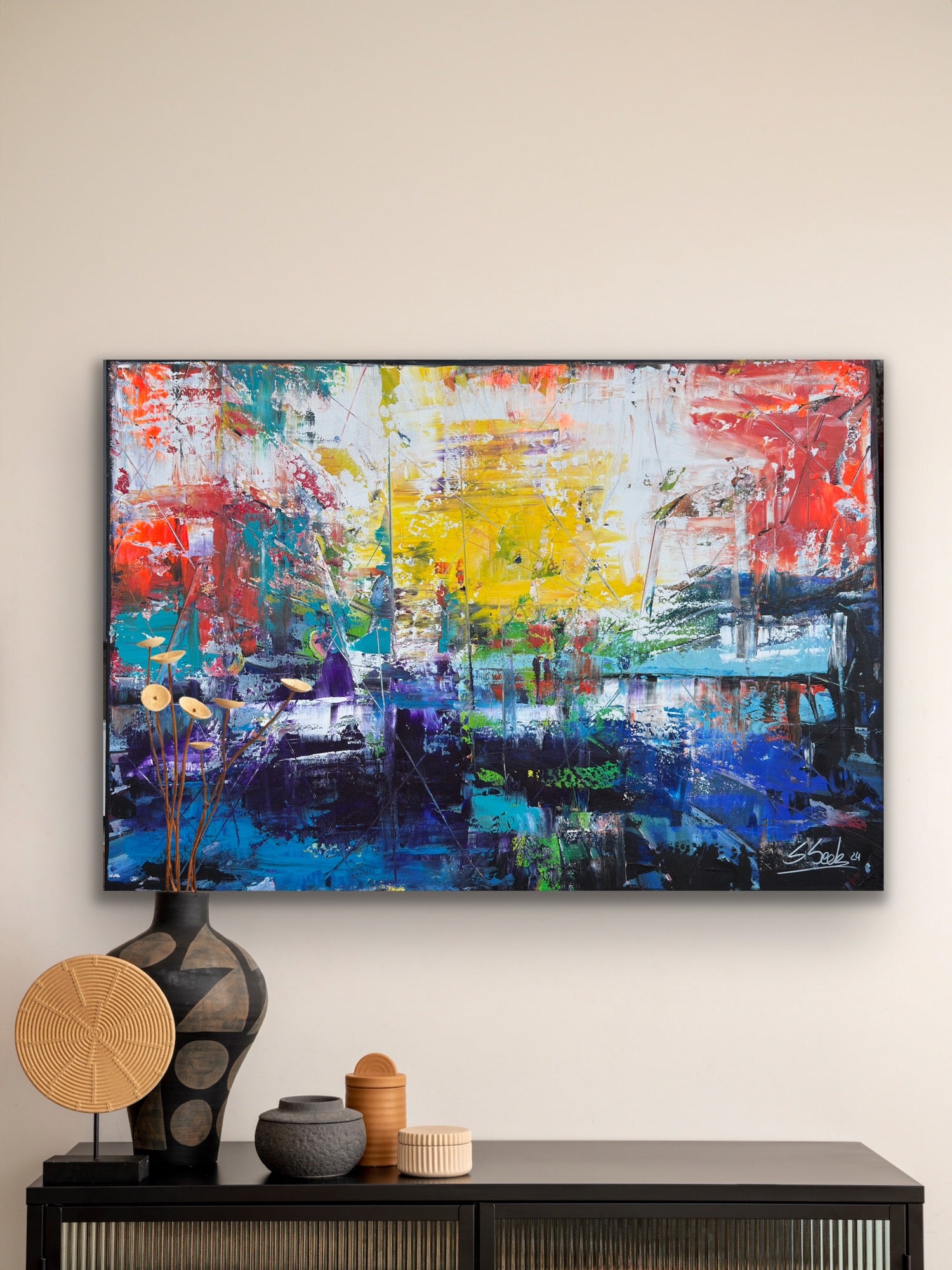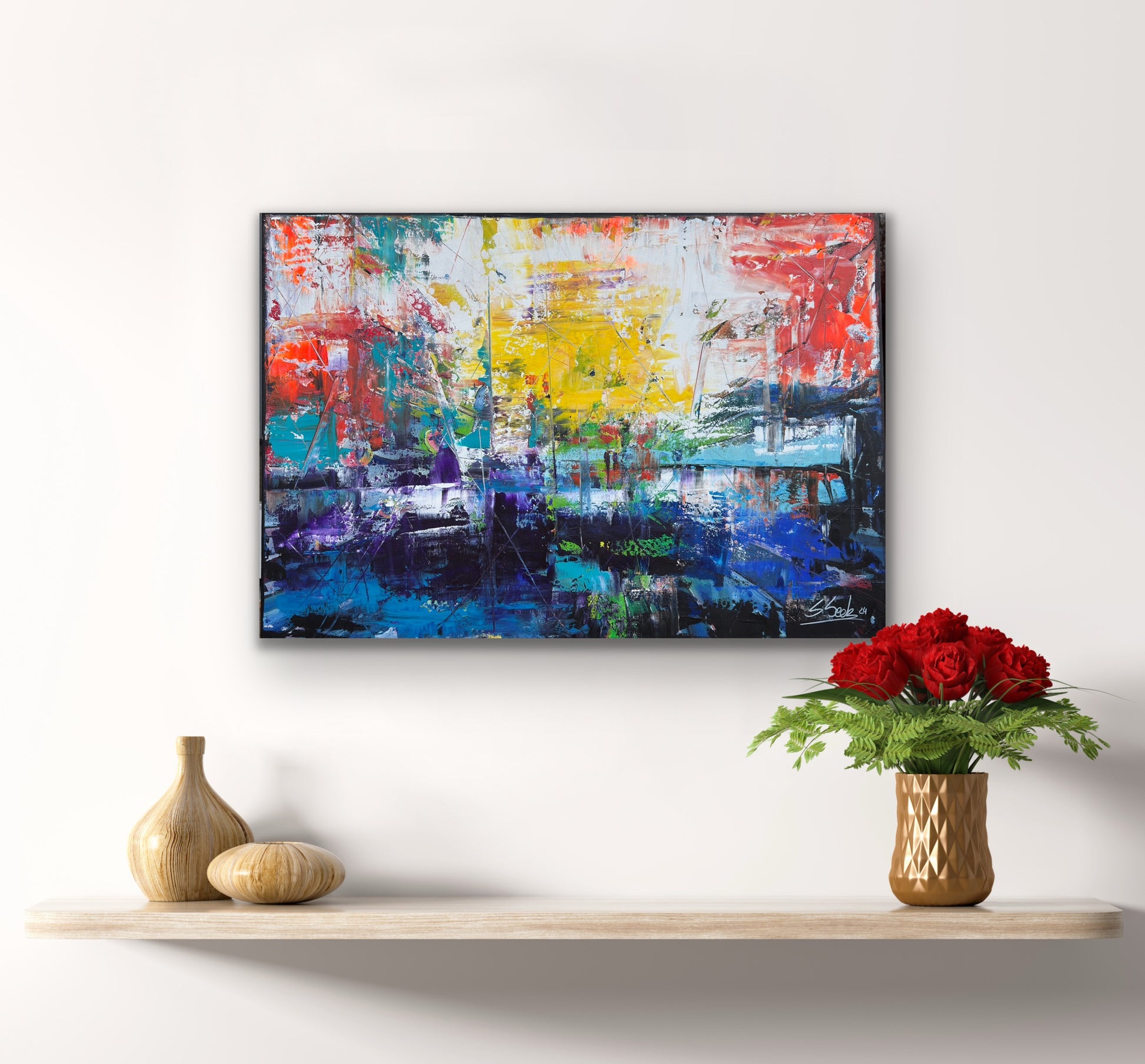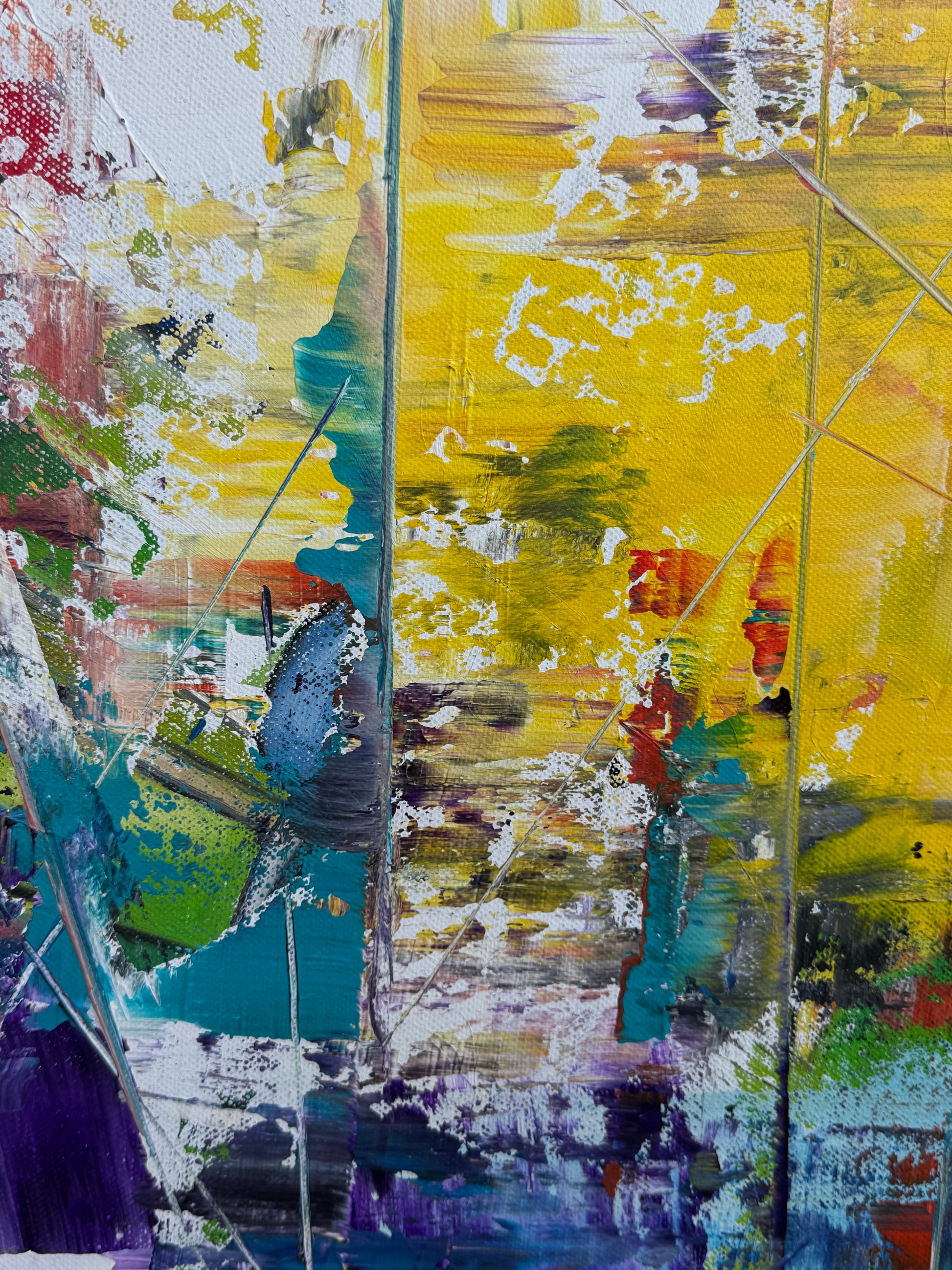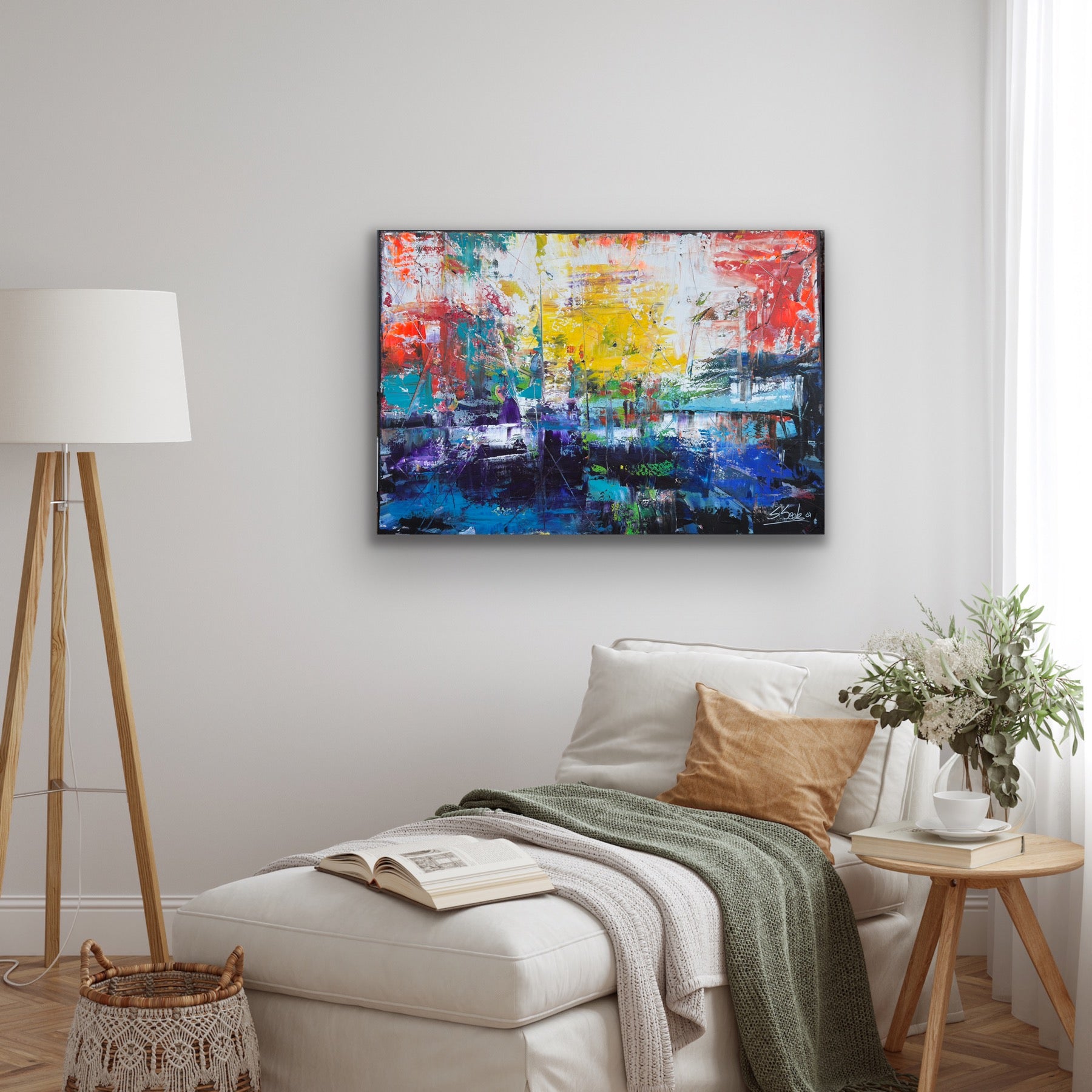 In this work, I have captured the vibrant energy of a bustling harbor through abstract acrylic paints. The intense blues and reds contrast with the lively yellows and whites reflect the bustle and dynamism of the place. This composition invites you to lose yourself in the depths of color and feel the emotional movement that the harbor represents. In your home, this painting will create an aura of energy and inspiration. radiate a quality that enlivens every room.