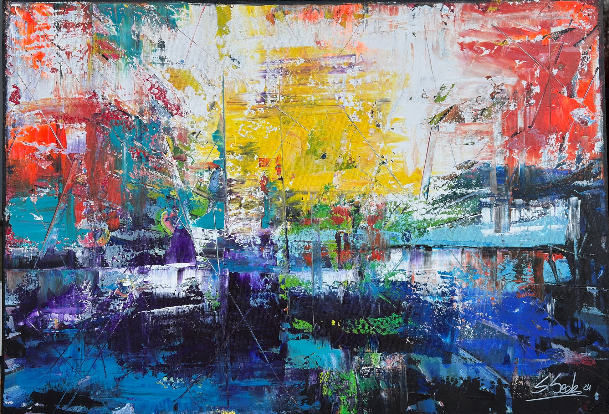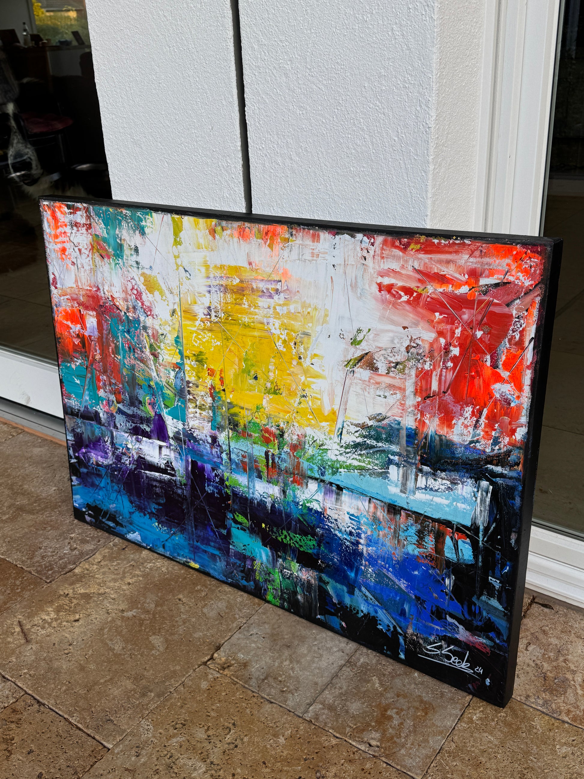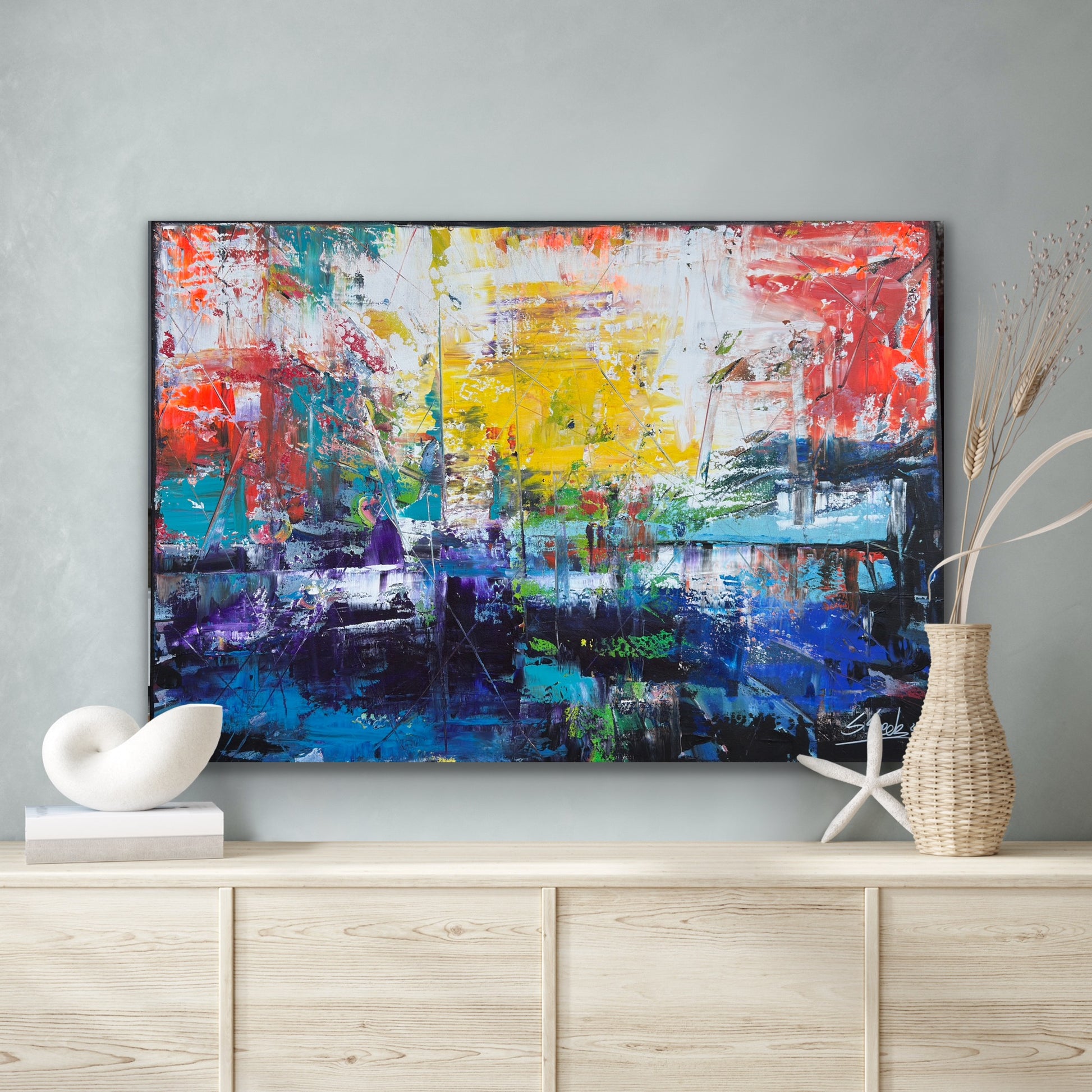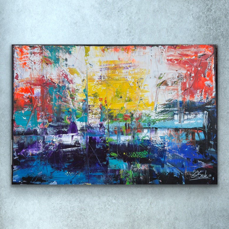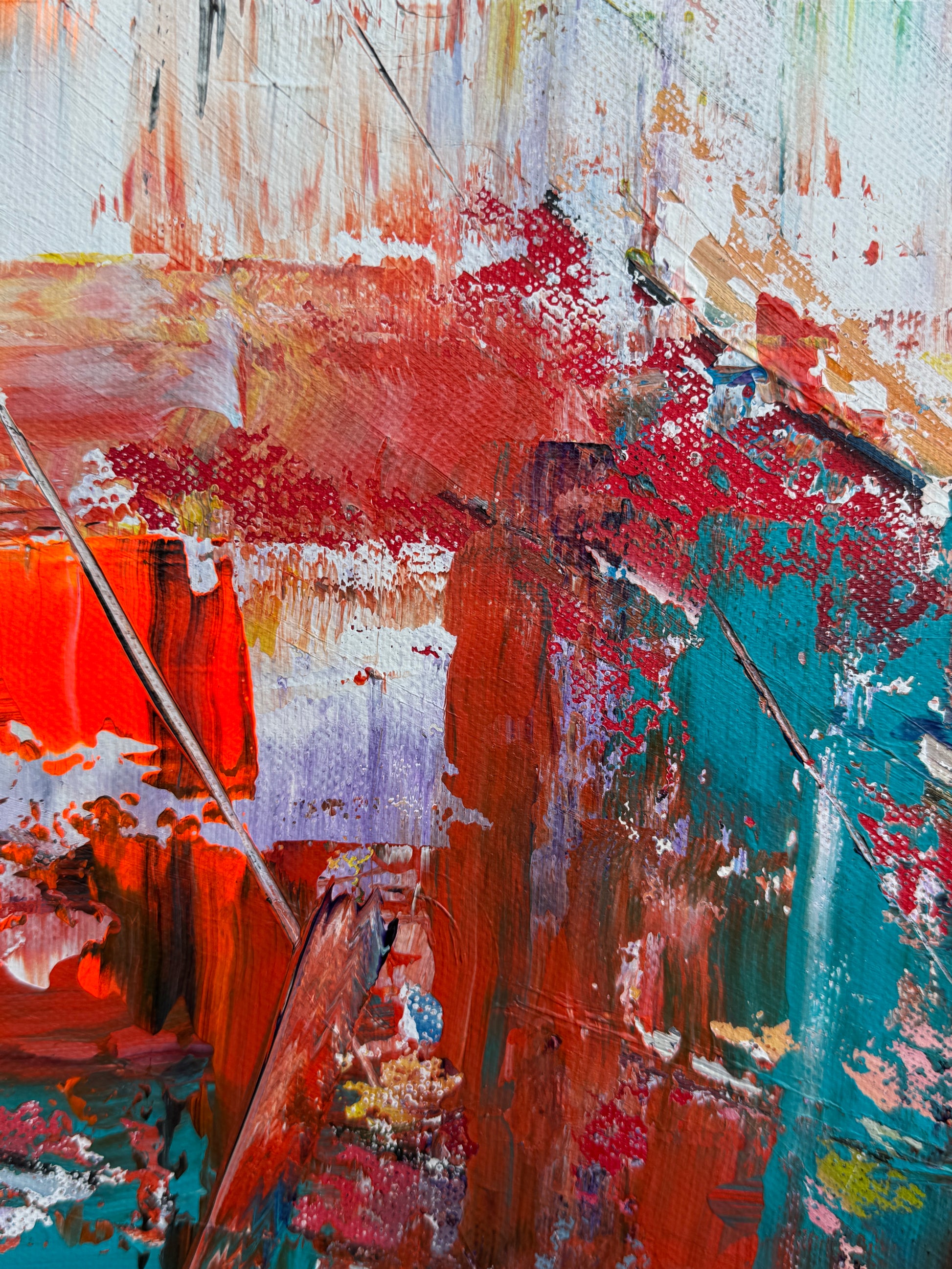 In this work, I have captured the vibrant energy of a bustling harbor through abstract acrylic paints. The intense blues and reds contrast with the lively yellows and whites reflect the bustle and dynamism of the place. This composition invites you to lose yourself in the depths of color and feel the emotional movement that the harbor represents. In your home, this painting will create an aura of energy and inspiration. radiate a quality that enlivens every room.