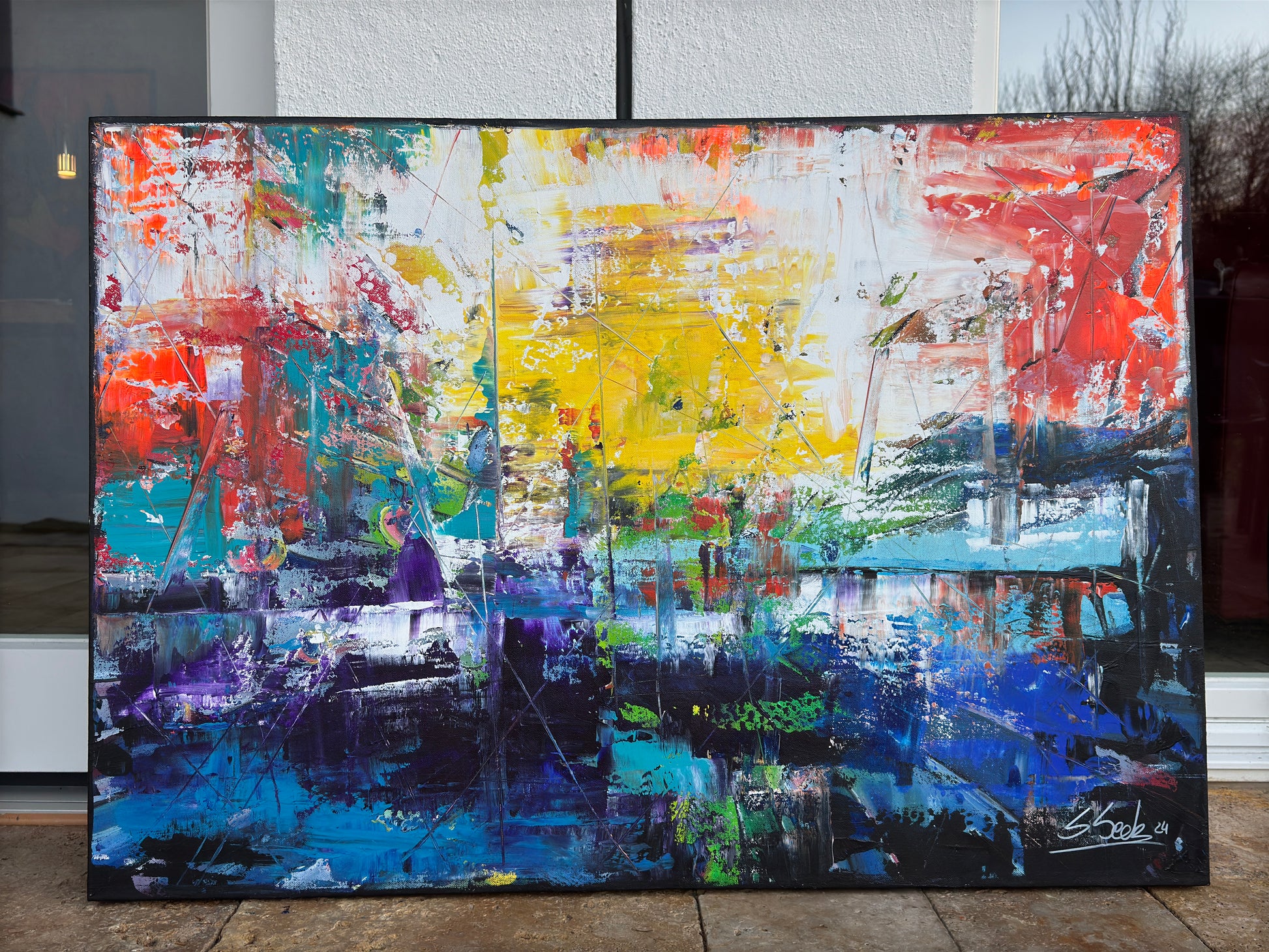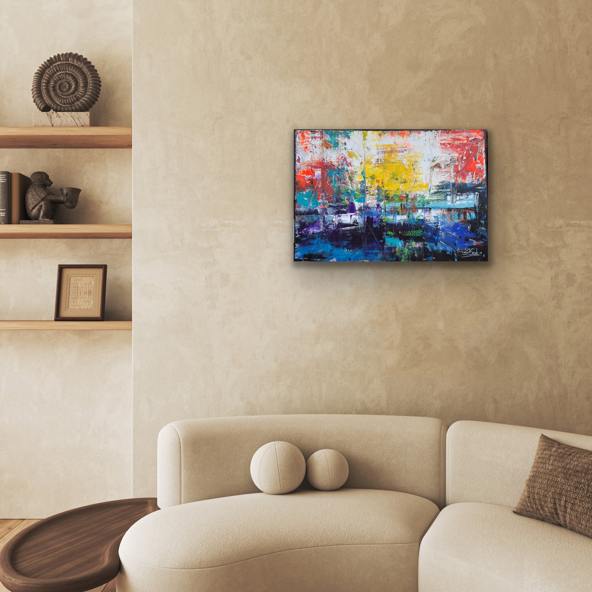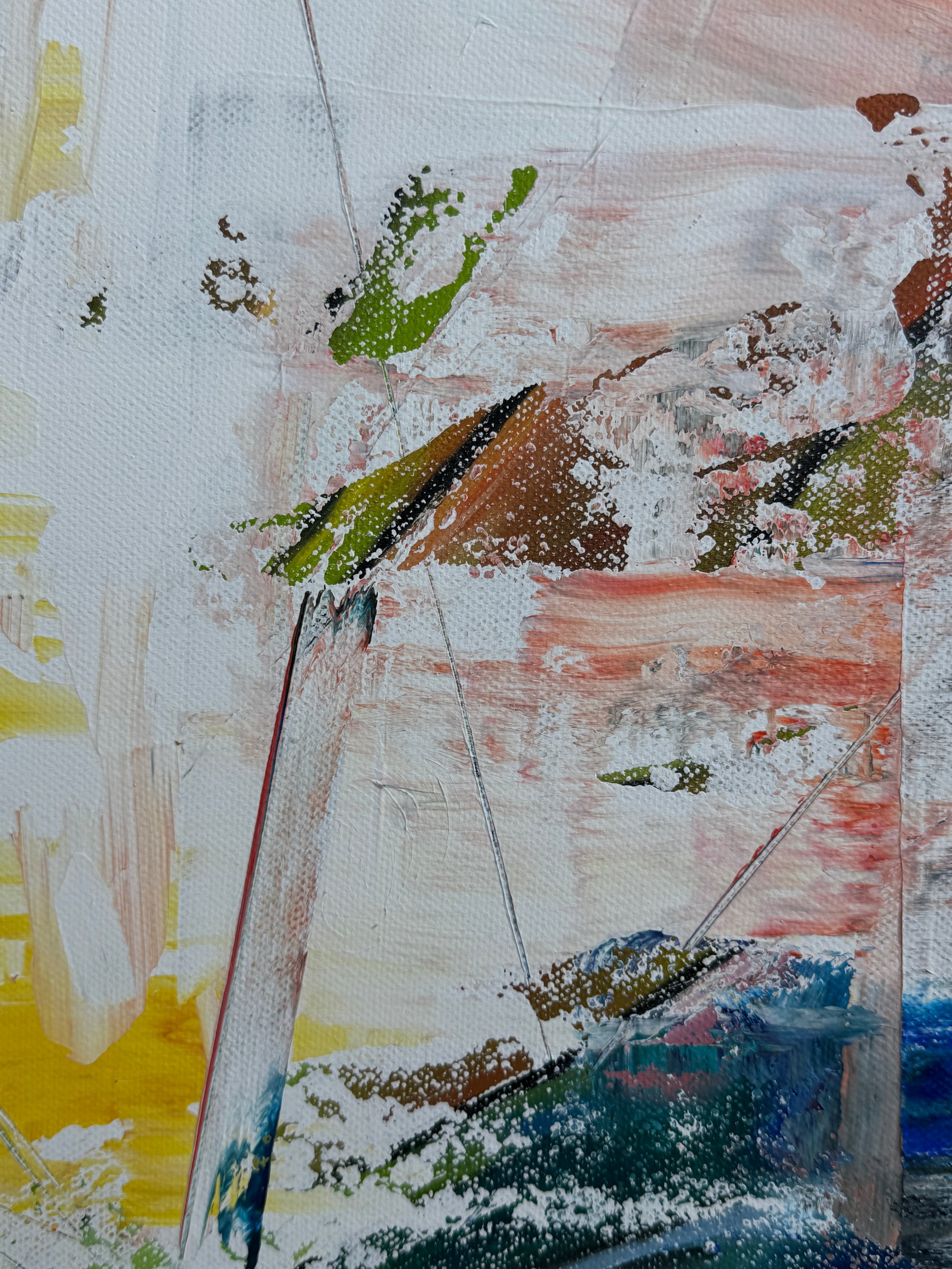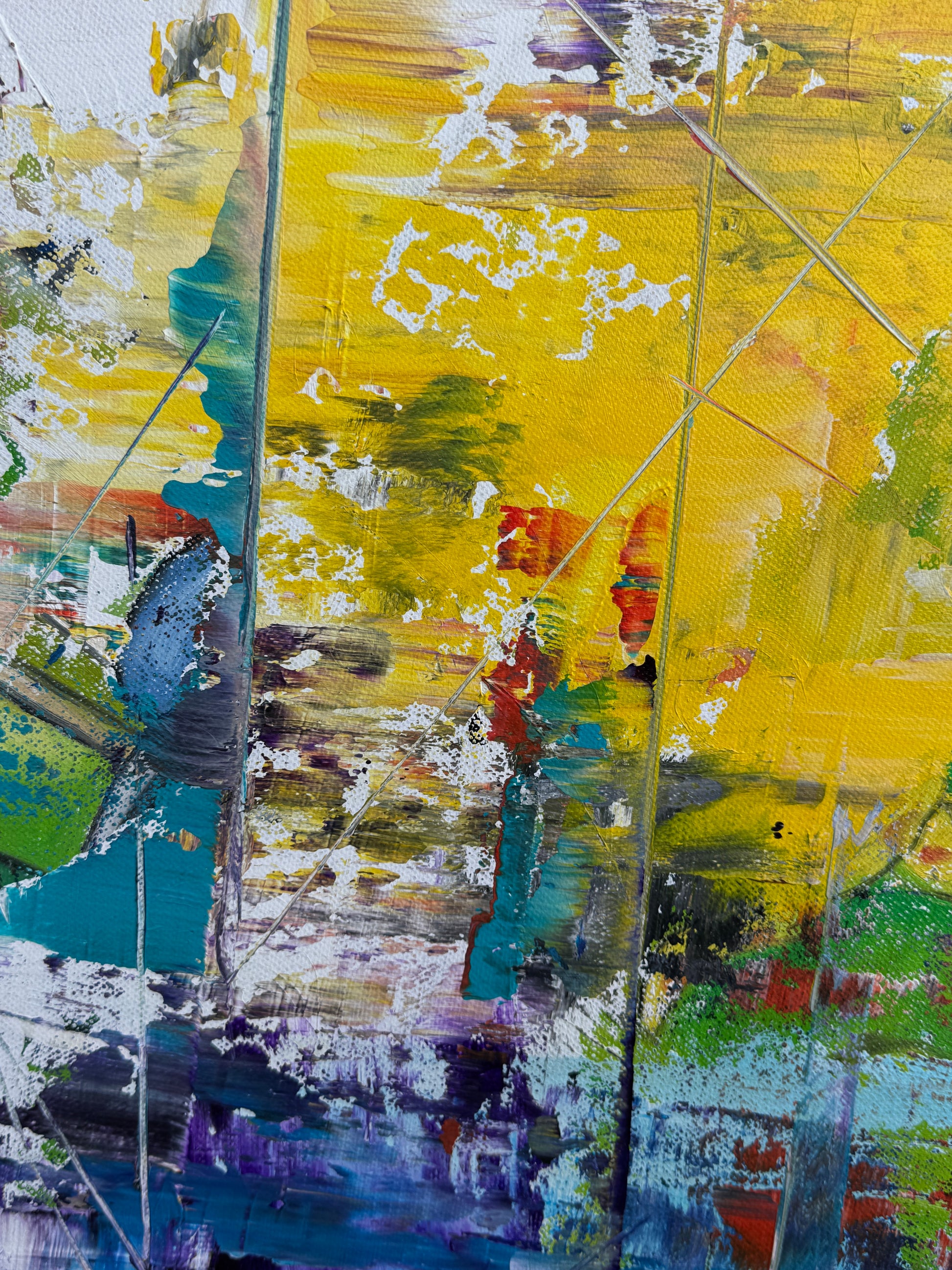 In this work, I have captured the vibrant energy of a bustling harbor through abstract acrylic paints. The intense blues and reds contrast with the lively yellows and whites reflect the bustle and dynamism of the place. This composition invites you to lose yourself in the depths of color and feel the emotional movement that the harbor represents. In your home, this painting will create an aura of energy and inspiration. radiate a quality that enlivens every room.