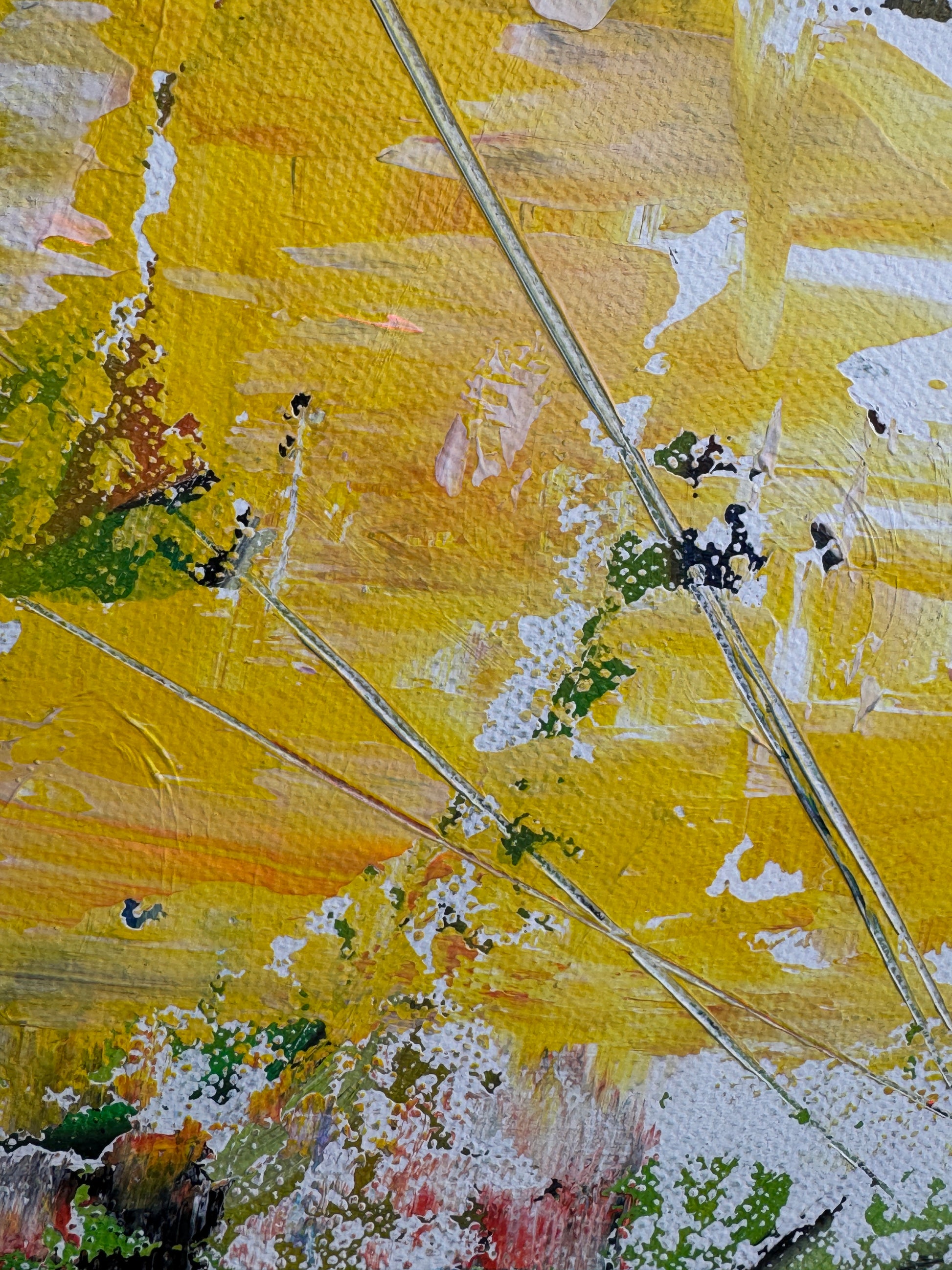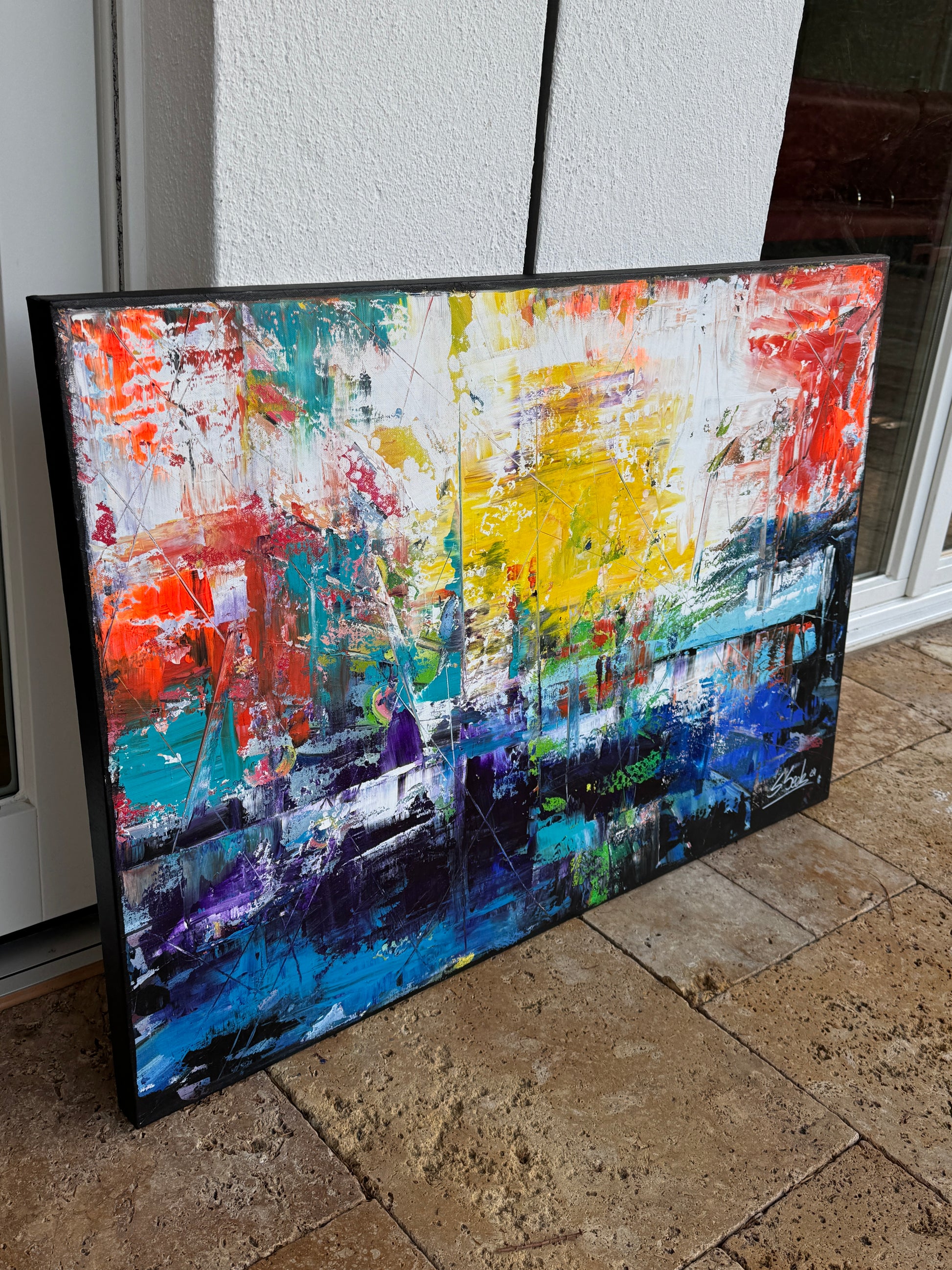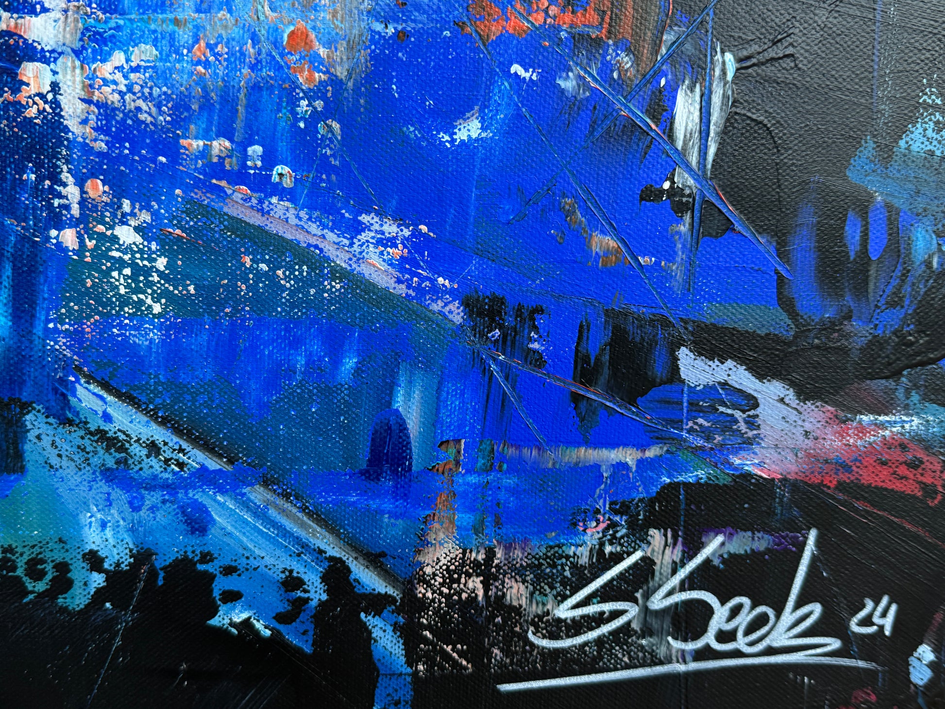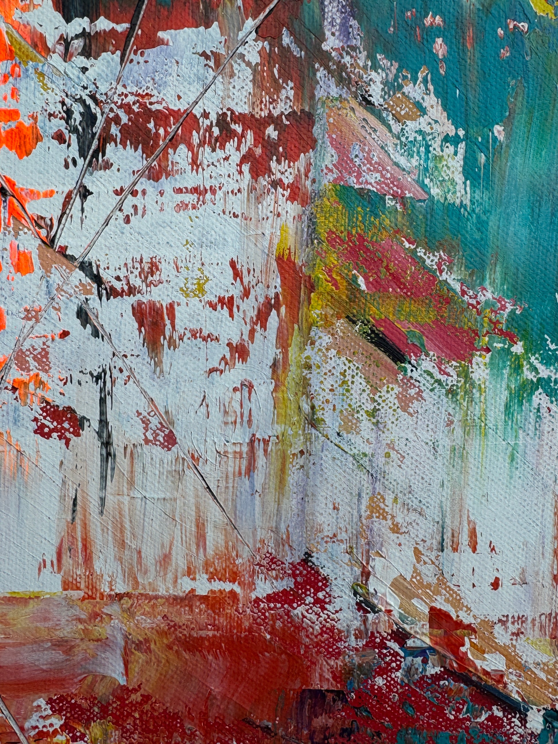 In this work, I have captured the vibrant energy of a bustling harbor through abstract acrylic paints. The intense blues and reds contrast with the lively yellows and whites reflect the bustle and dynamism of the place. This composition invites you to lose yourself in the depths of color and feel the emotional movement that the harbor represents. In your home, this painting will create an aura of energy and inspiration. radiate a quality that enlivens every room.