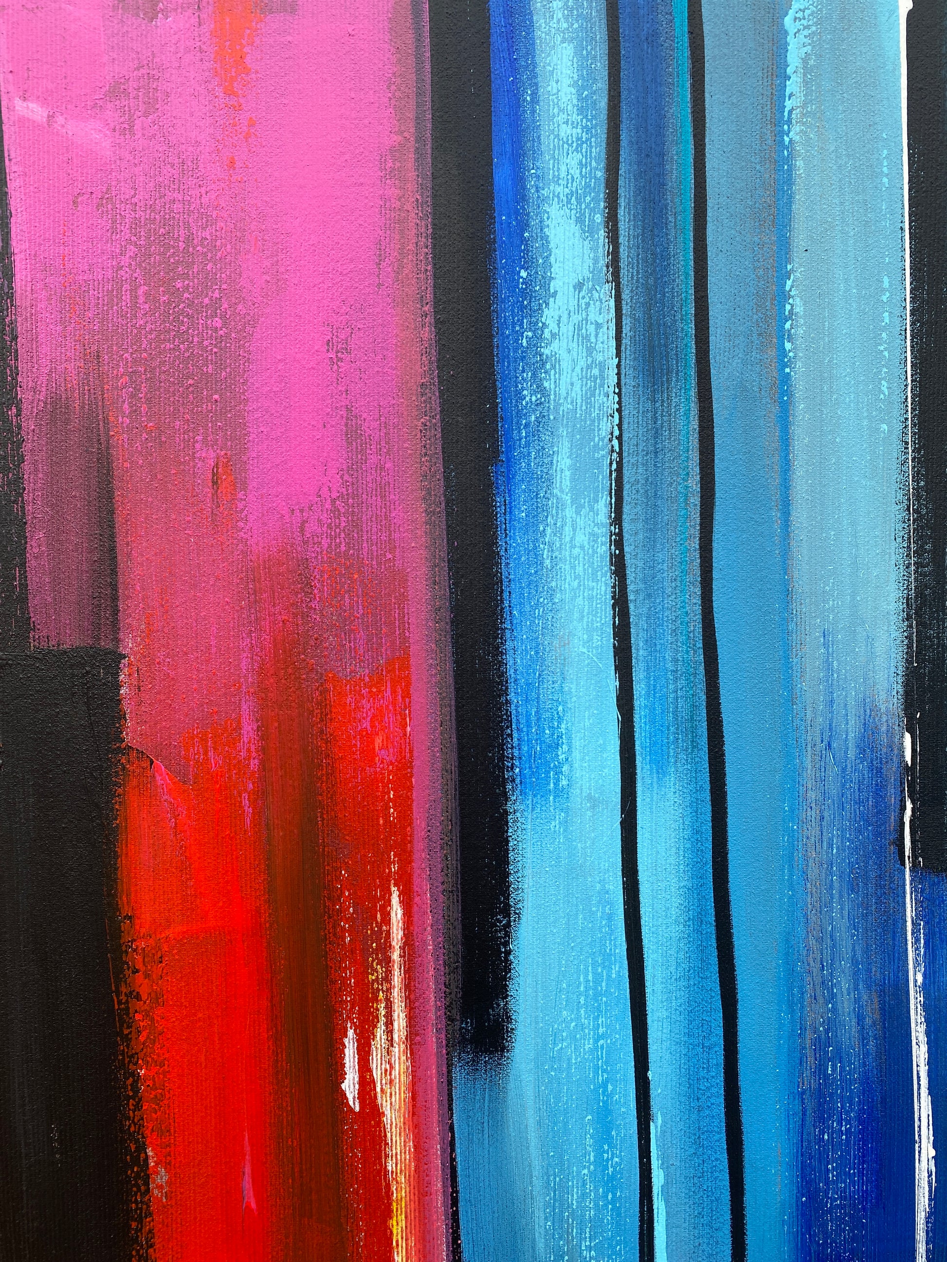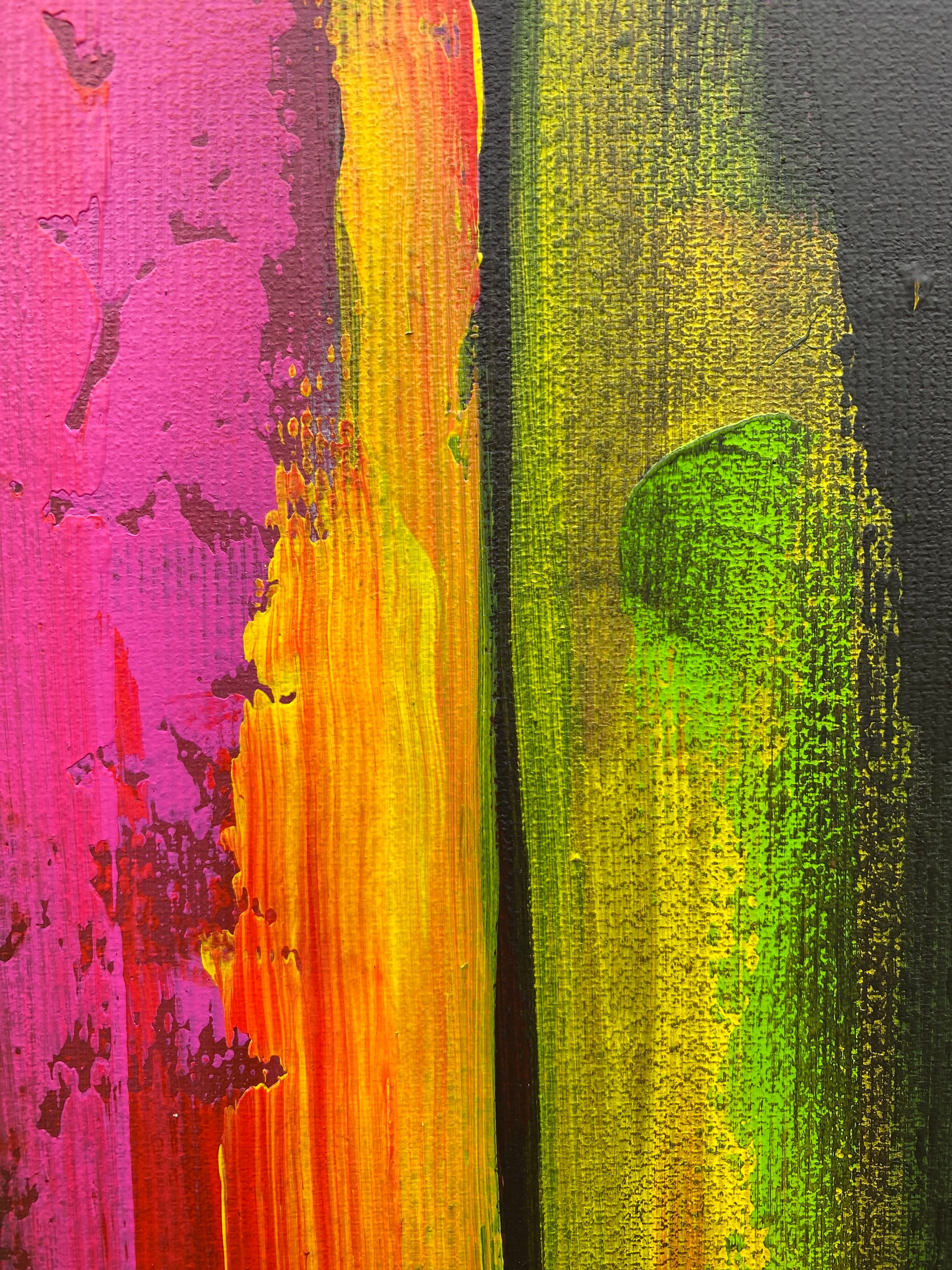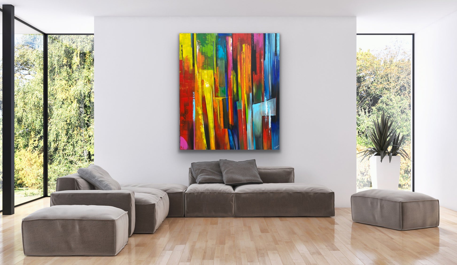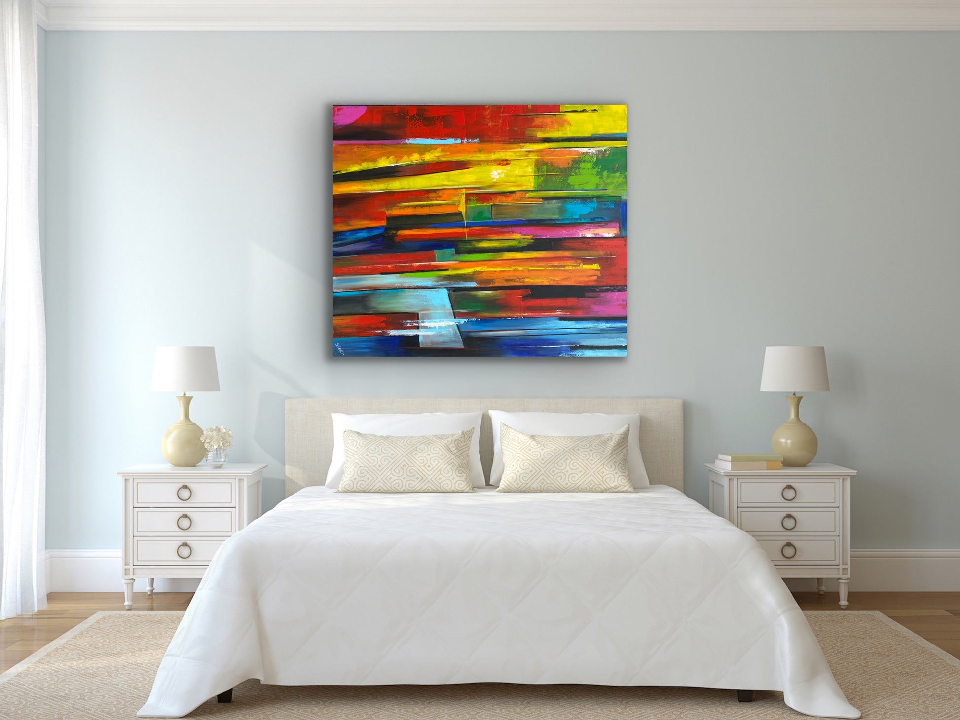 This artwork can be hung in two ways: either horizontally or vertically. Regardless of the chosen arrangement, this colorful piece will make any wall shine.