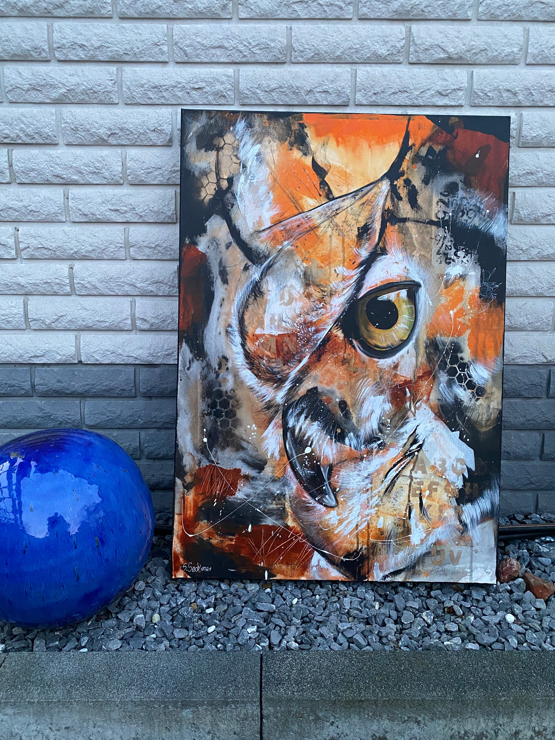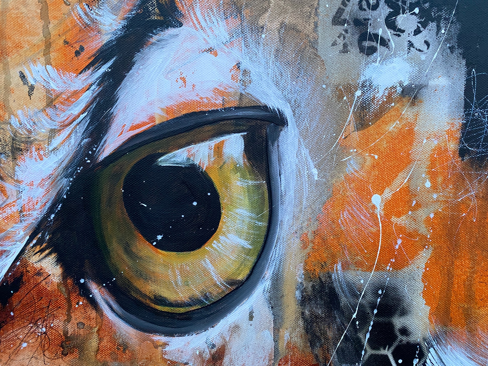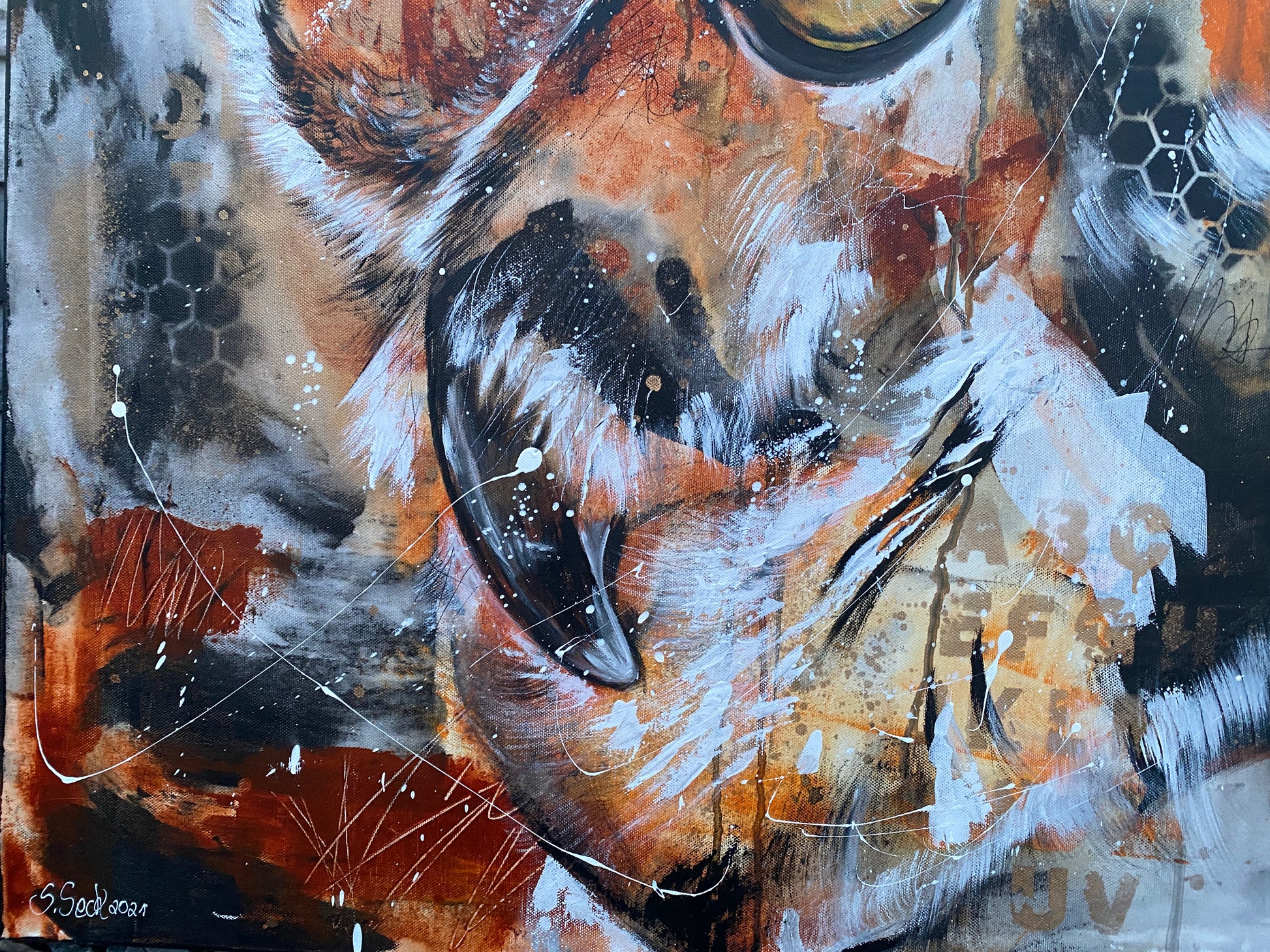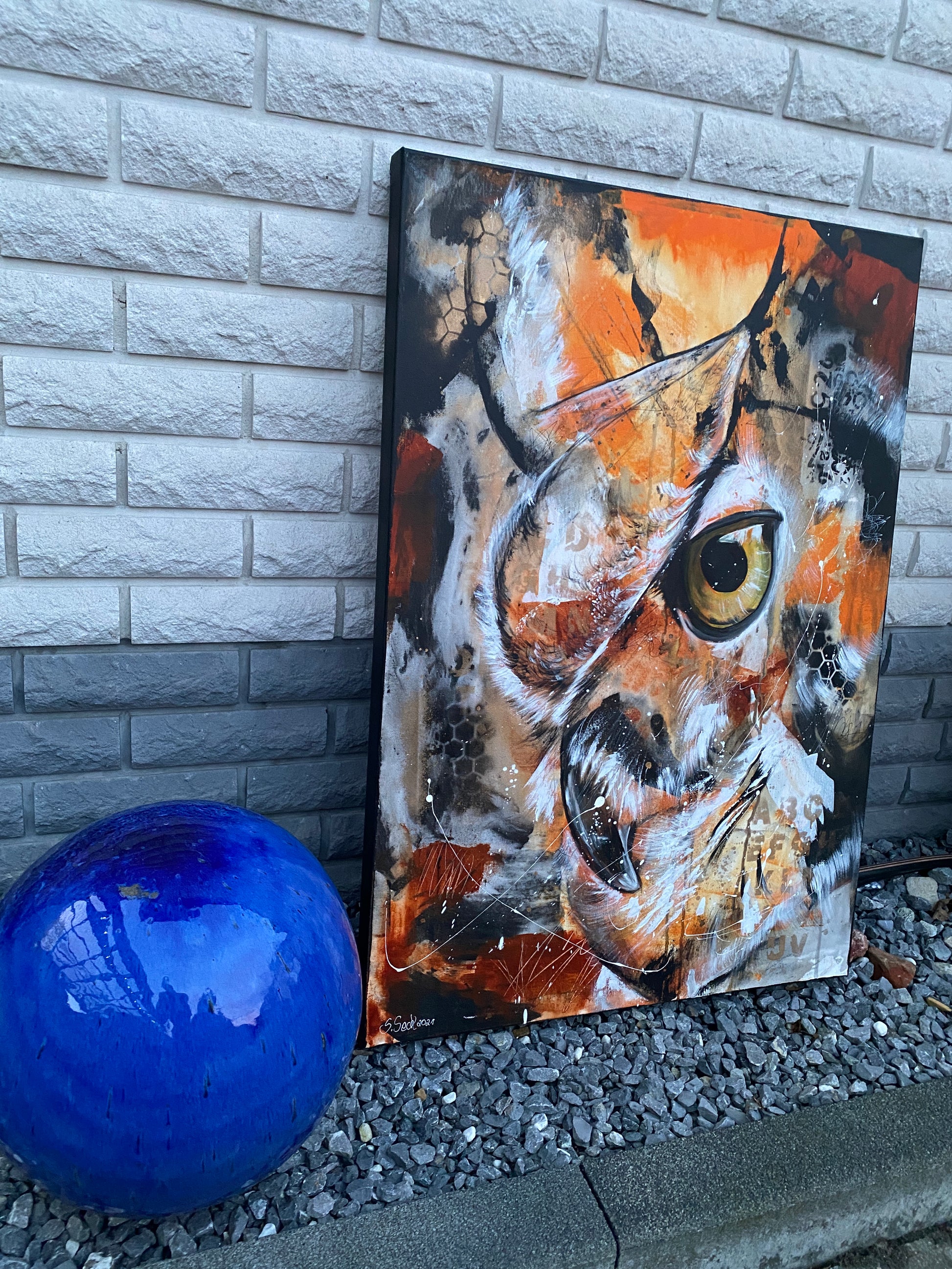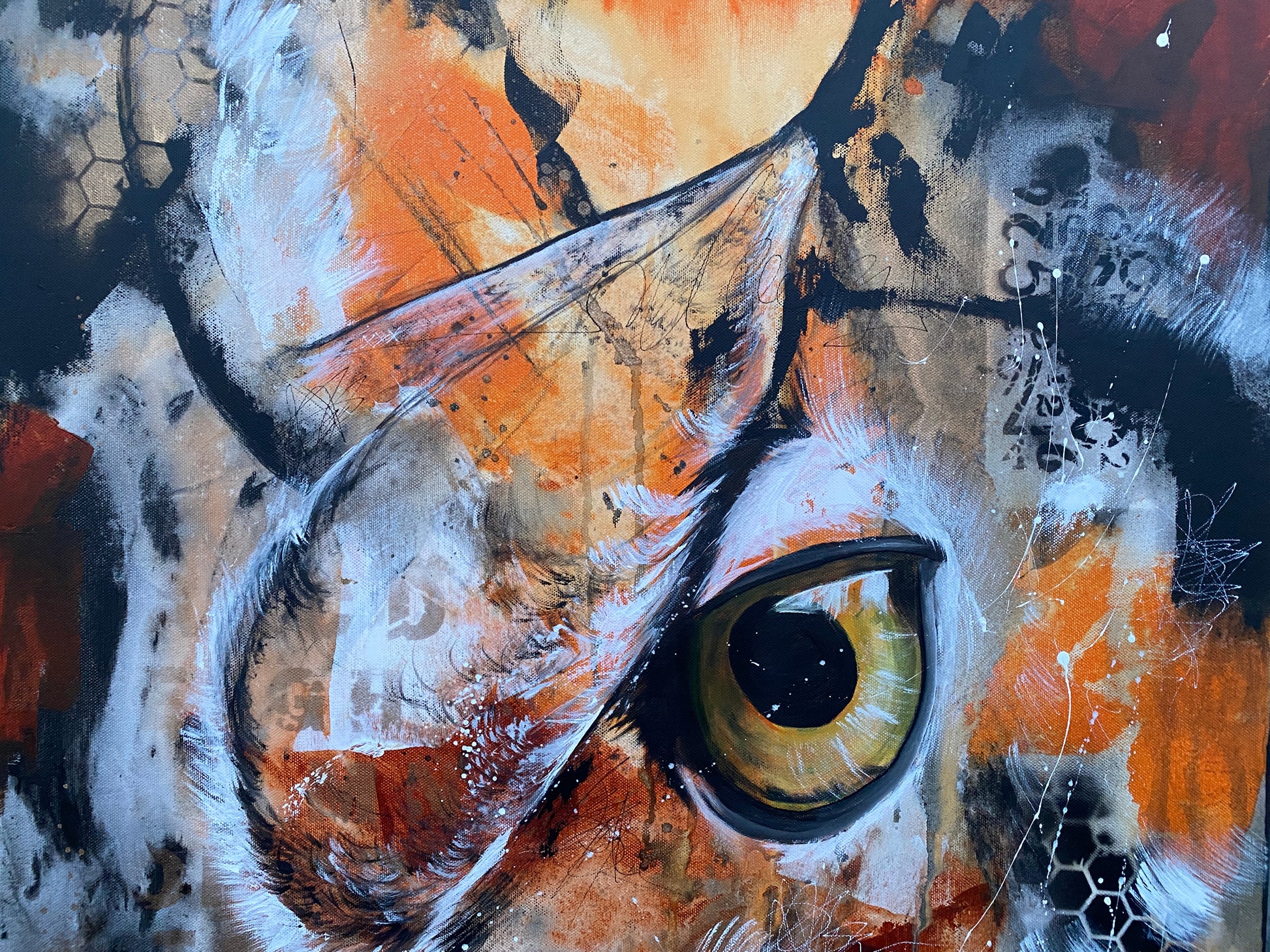 In this work, I captured the powerful presence of a bird of prey by playing with vibrant acrylic paints, delicate colored pencil lines, and dynamic spray paint effects. The expression conveys wildness and alertness, a symbiosis of realism and expressiveness. This painting brings energy and intensity to any room—it invites the viewer to be vigilant and courageous, with a touch of pop art freshness.