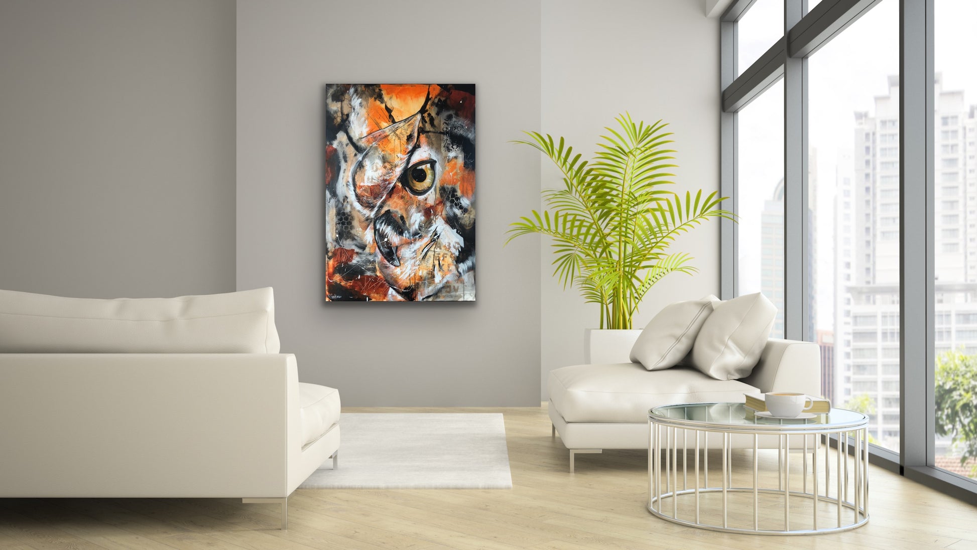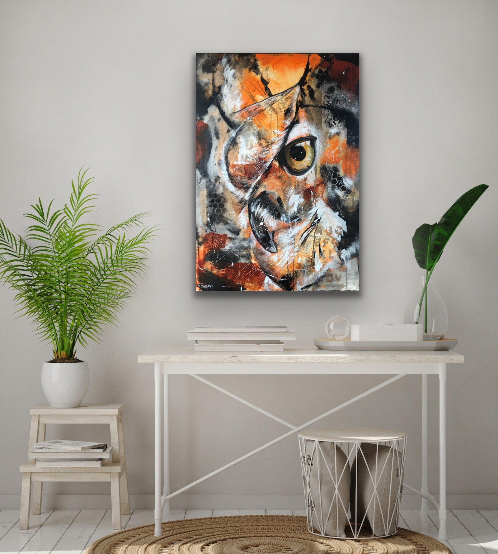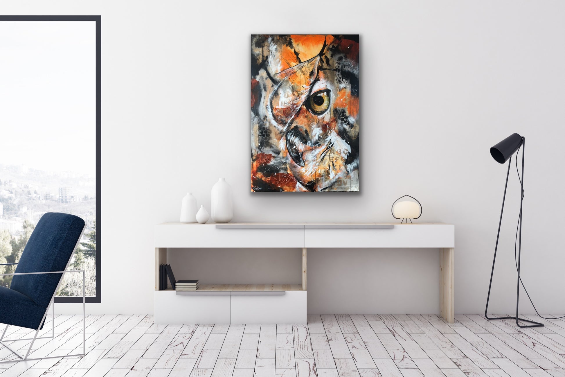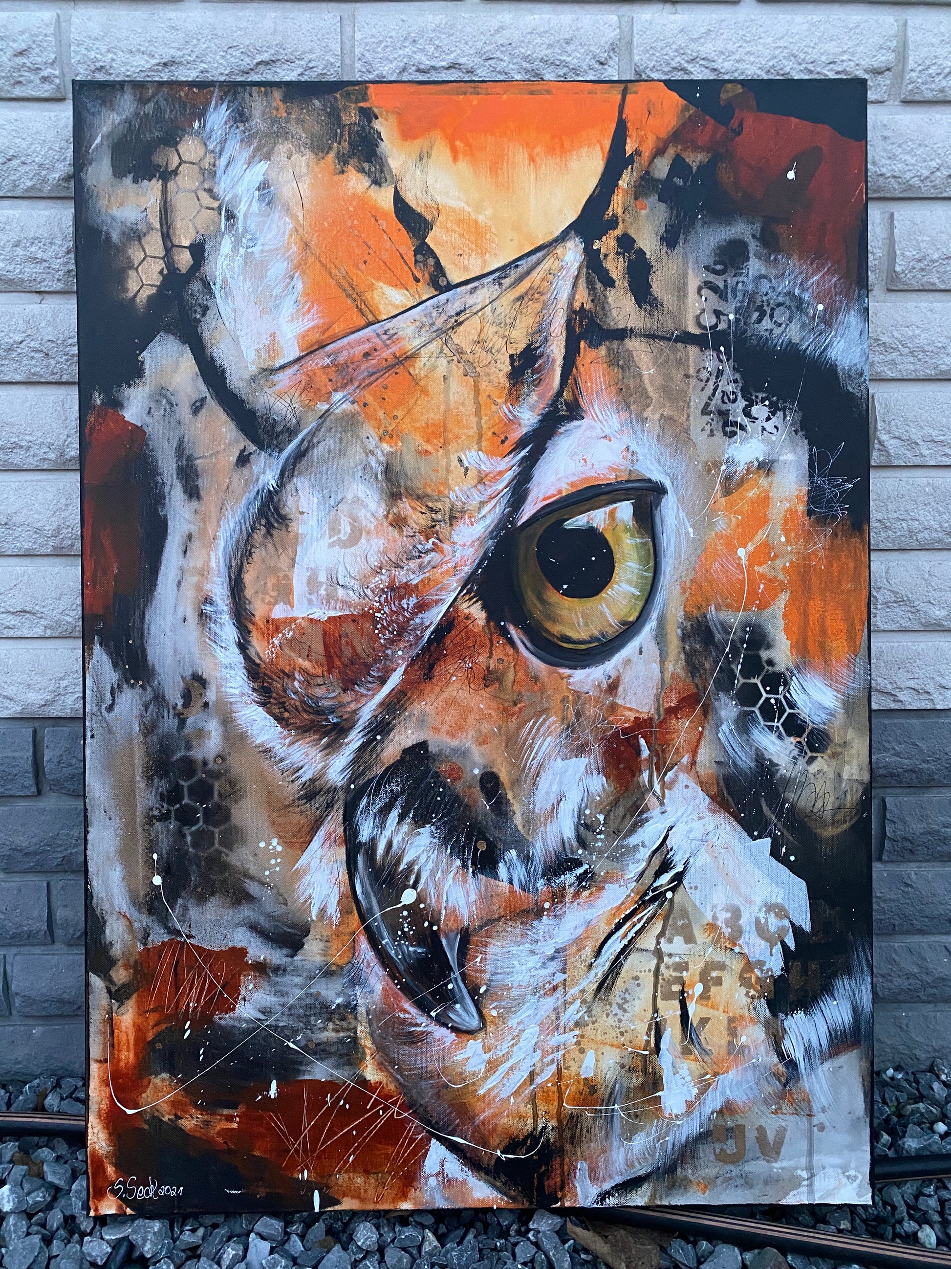 In this work, I captured the powerful presence of a bird of prey by playing with vibrant acrylic paints, delicate colored pencil lines, and dynamic spray paint effects. The expression conveys wildness and alertness, a symbiosis of realism and expressiveness. This painting brings energy and intensity to any room—it invites the viewer to be vigilant and courageous, with a touch of pop art freshness.