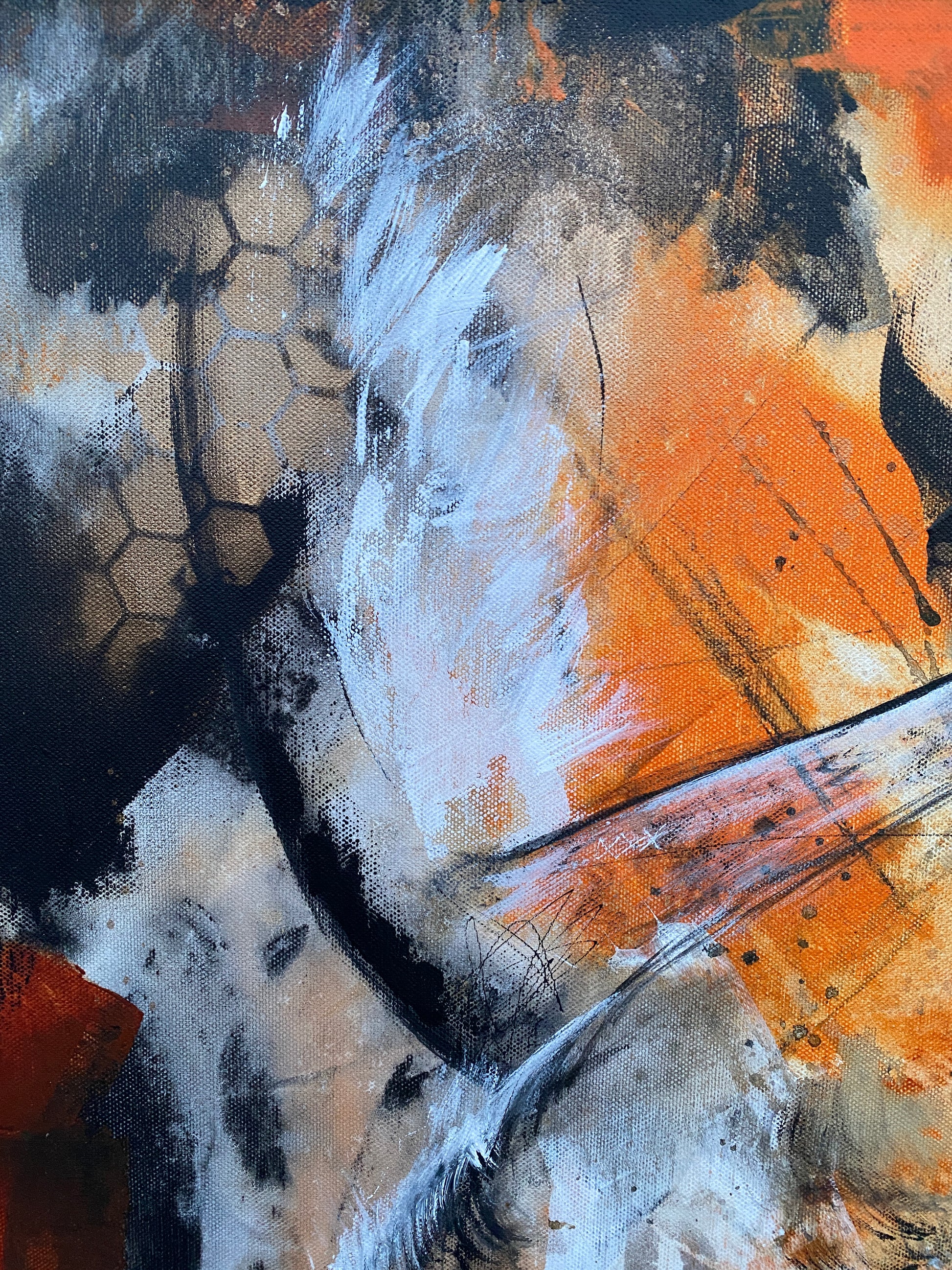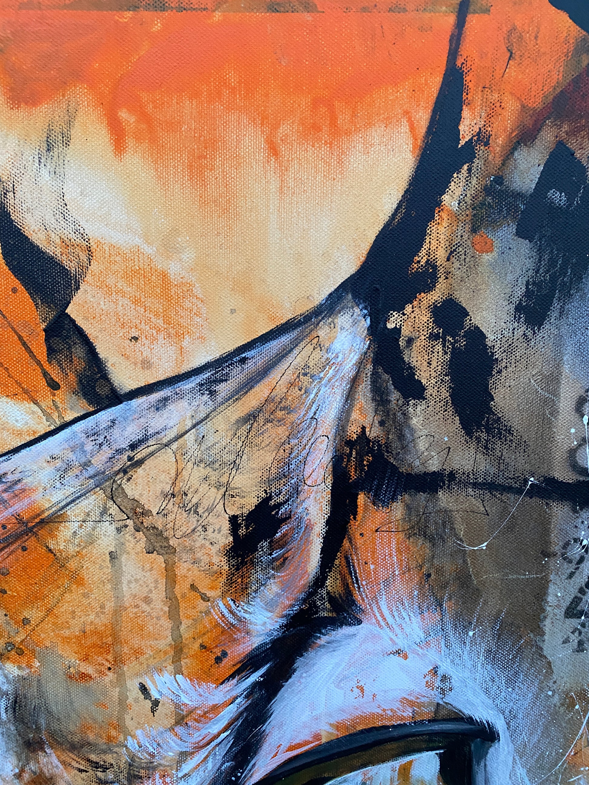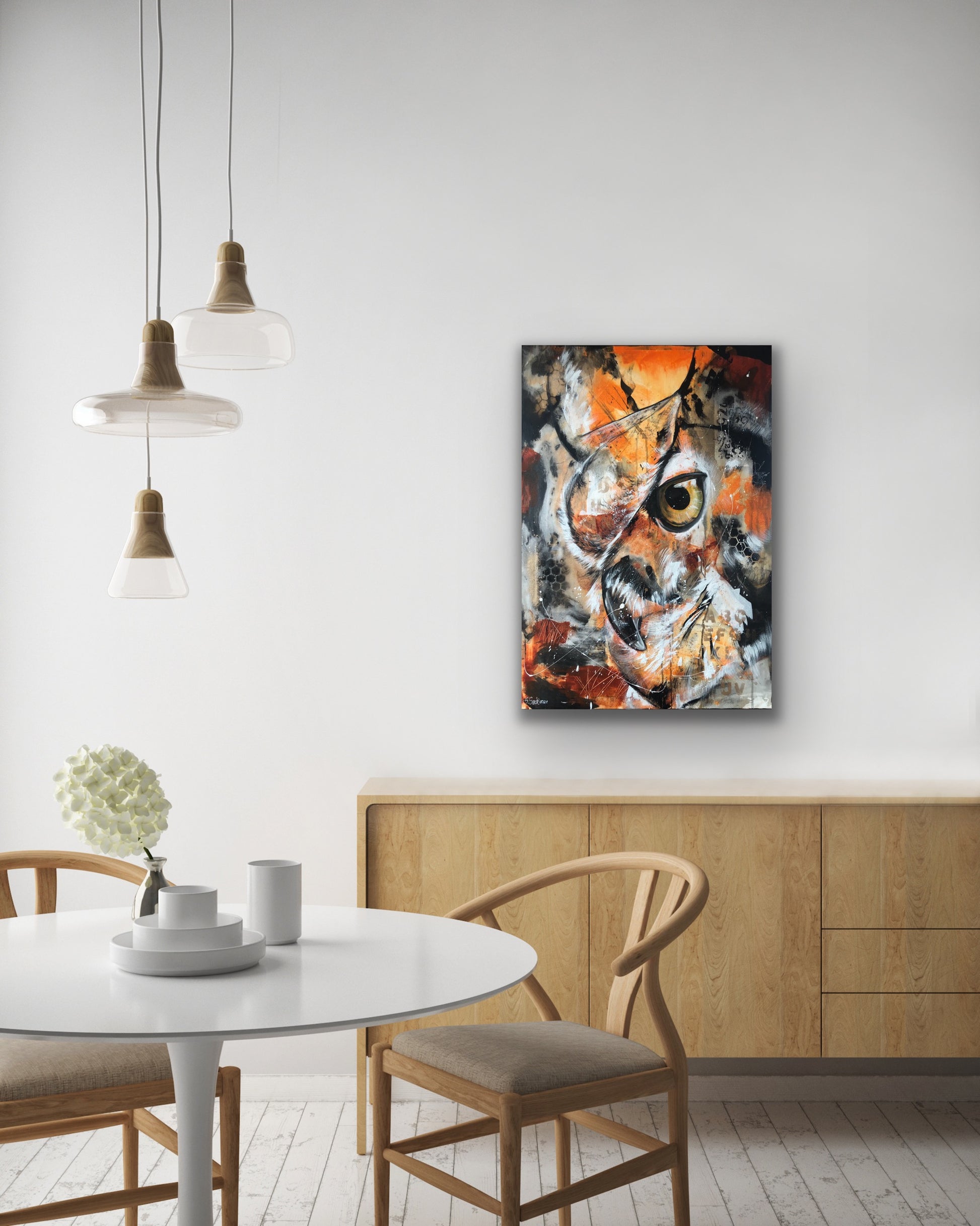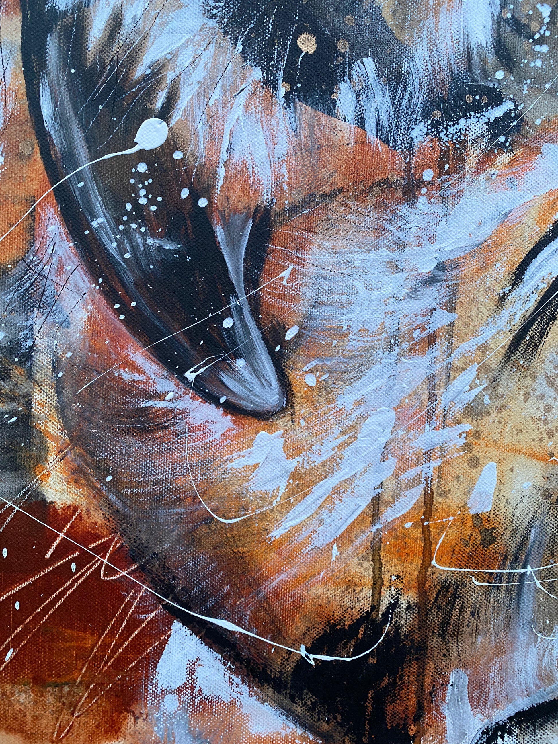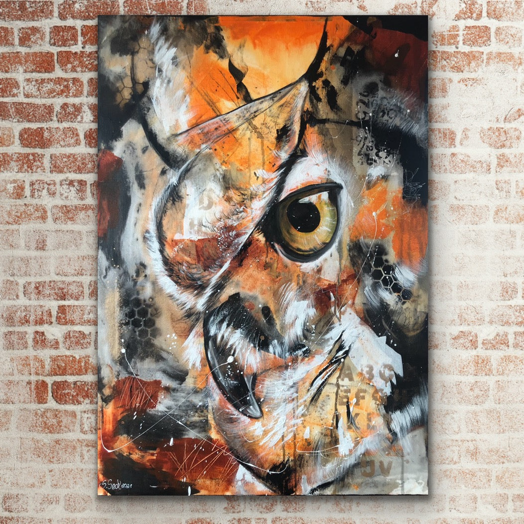 In this work, I captured the powerful presence of a bird of prey by playing with vibrant acrylic paints, delicate colored pencil lines, and dynamic spray paint effects. The expression conveys wildness and alertness, a symbiosis of realism and expressiveness. This painting brings energy and intensity to any room—it invites the viewer to be vigilant and courageous, with a touch of pop art freshness.