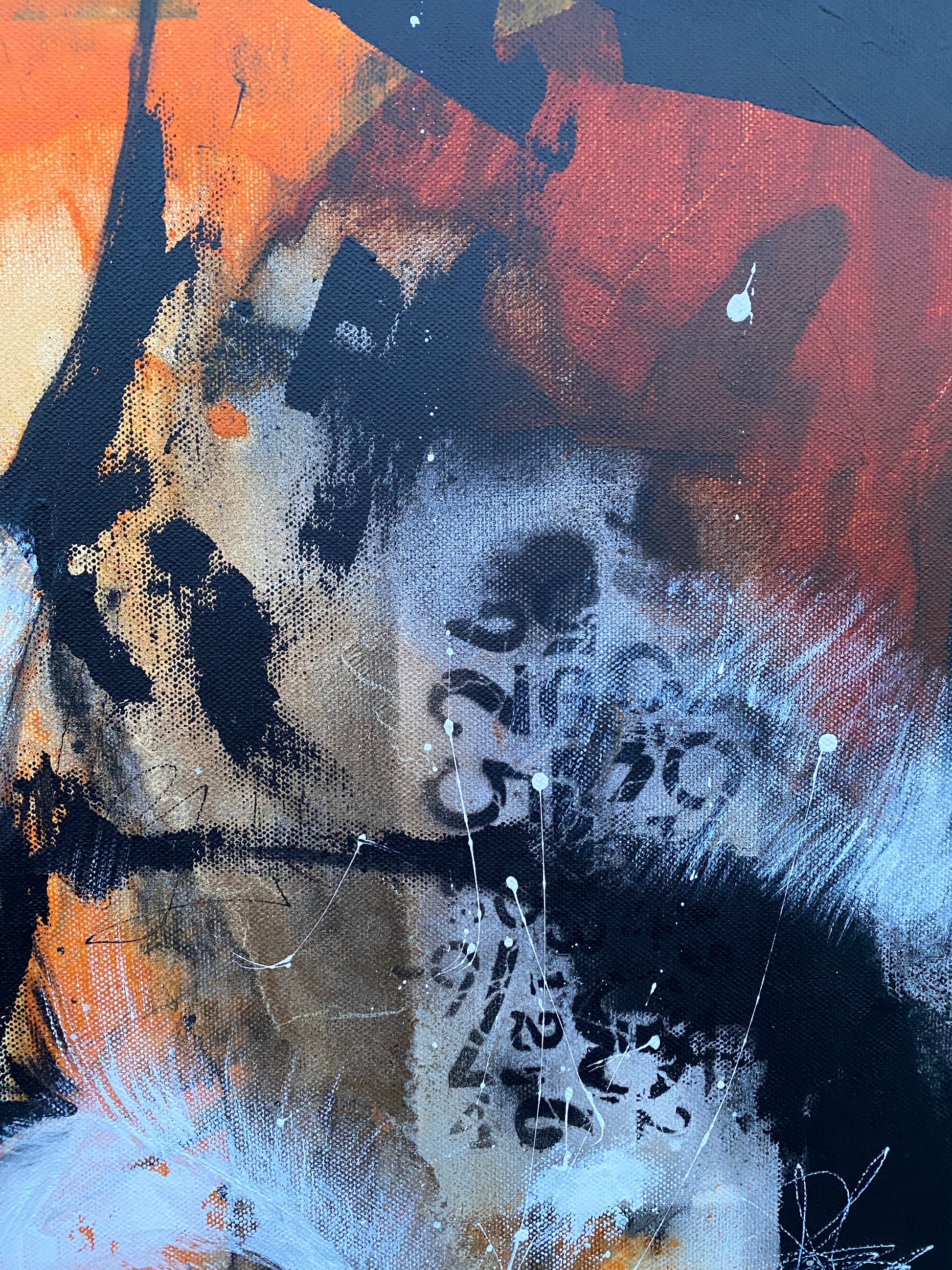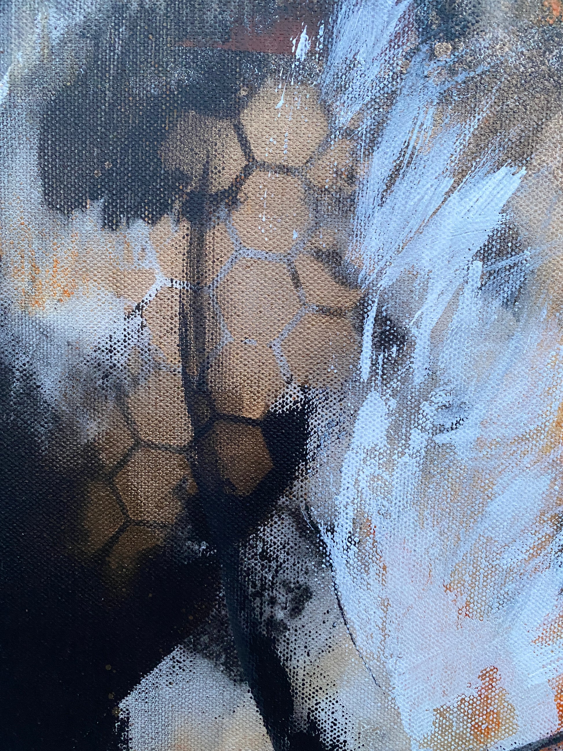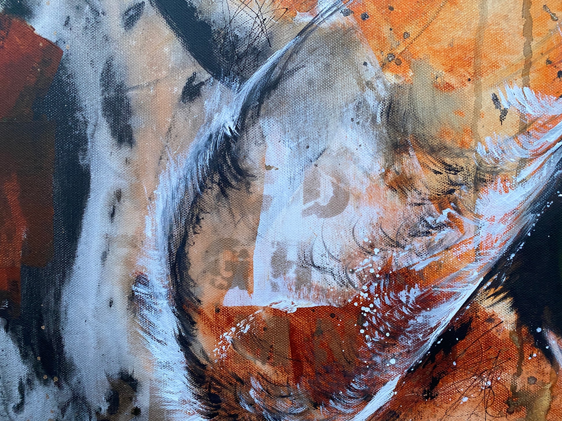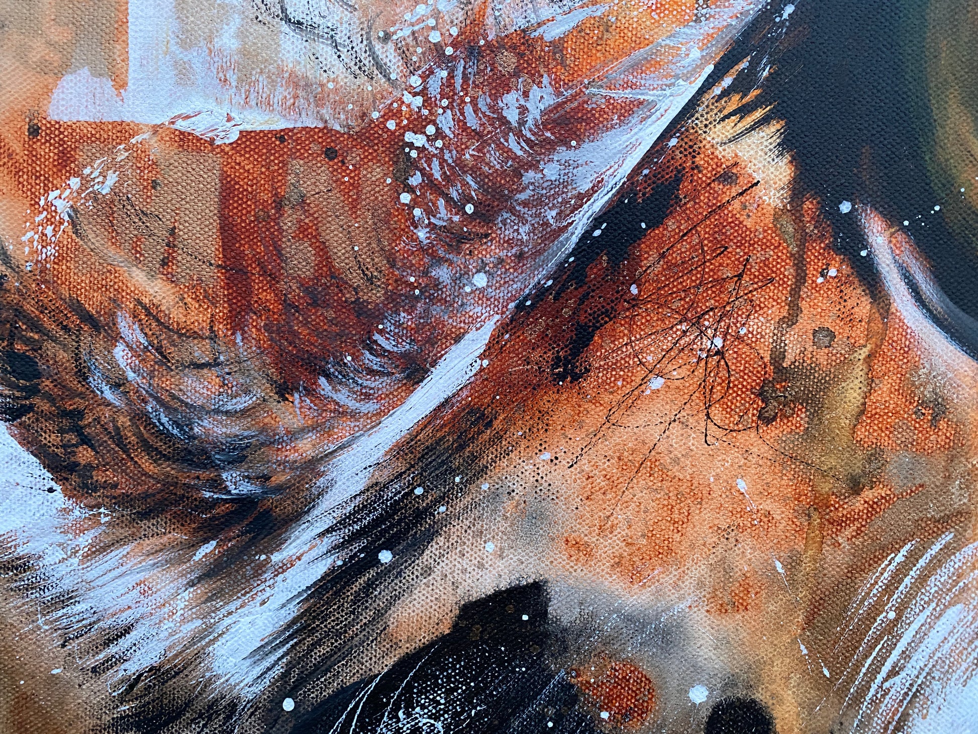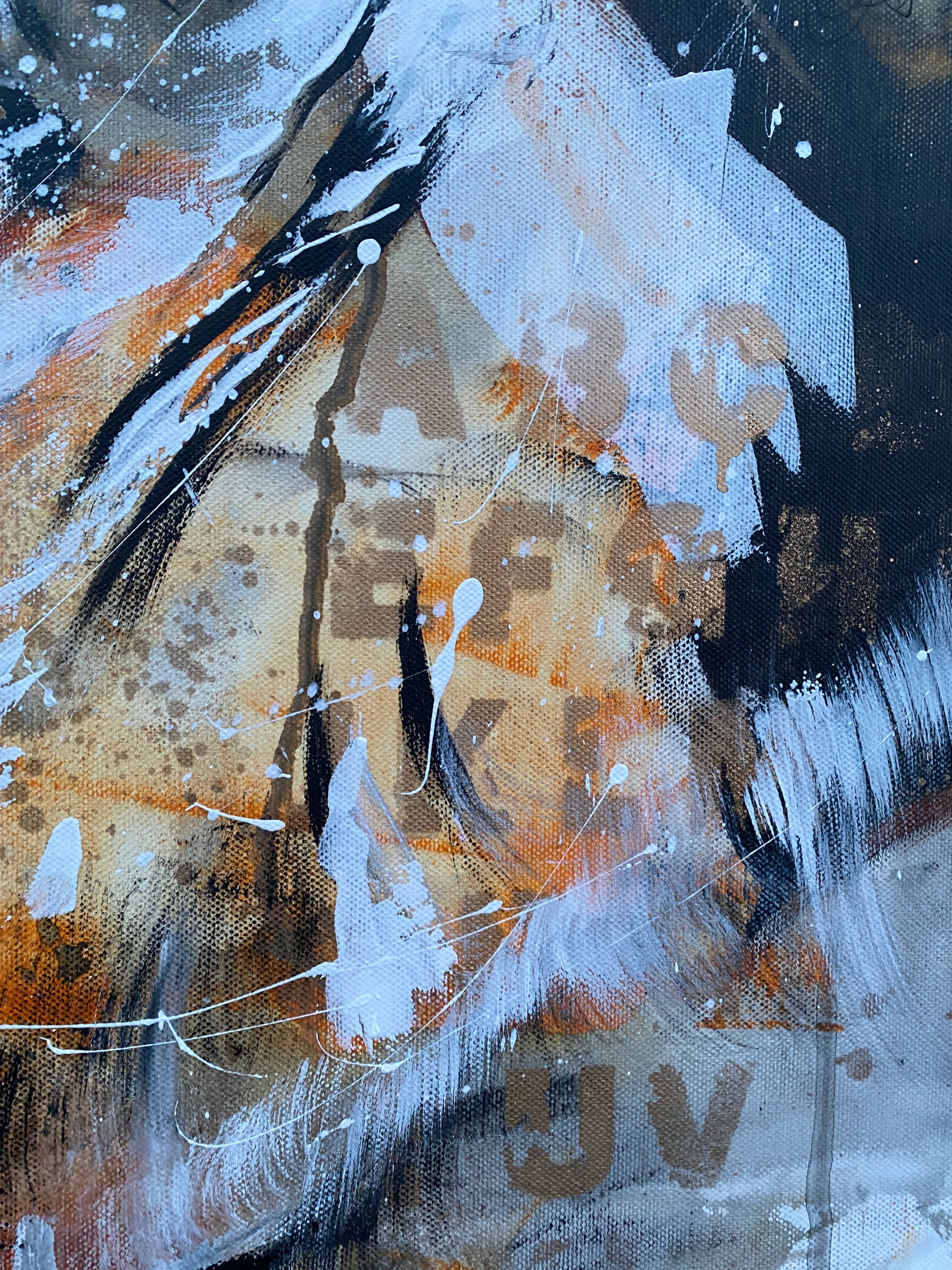 In this work, I captured the powerful presence of a bird of prey by playing with vibrant acrylic paints, delicate colored pencil lines, and dynamic spray paint effects. The expression conveys wildness and alertness, a symbiosis of realism and expressiveness. This painting brings energy and intensity to any room—it invites the viewer to be vigilant and courageous, with a touch of pop art freshness.