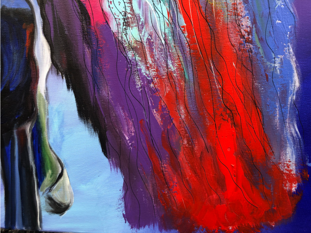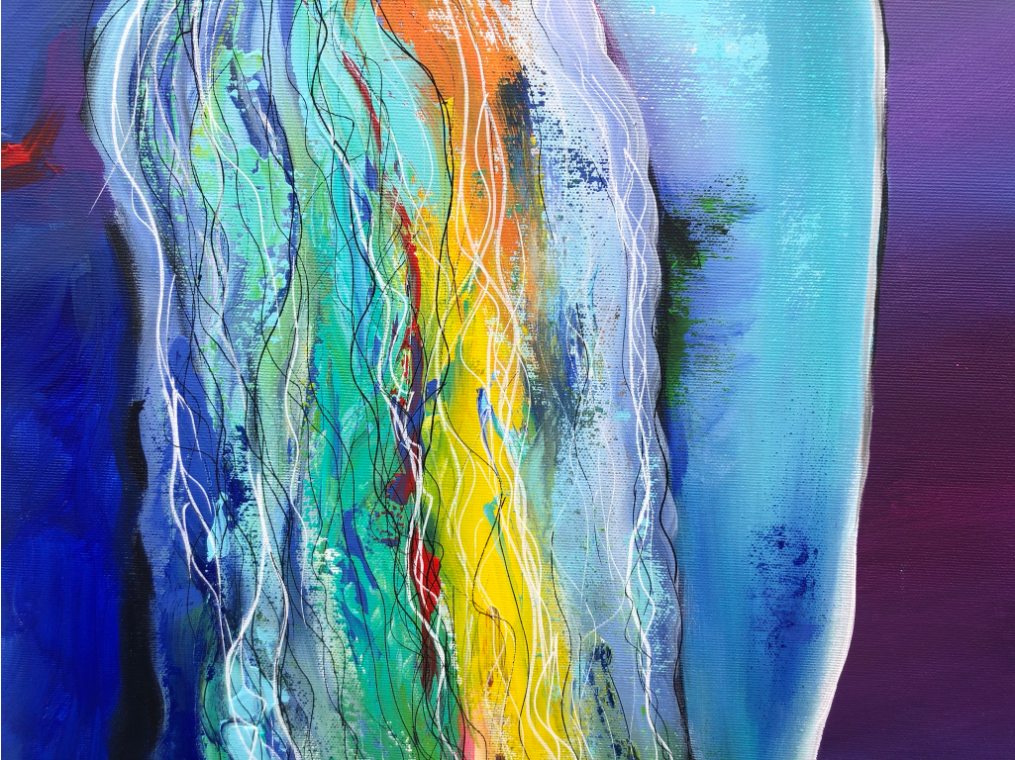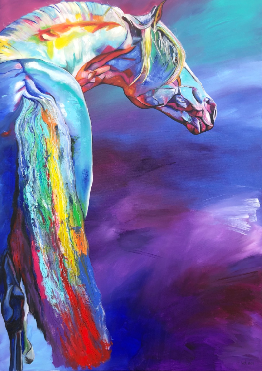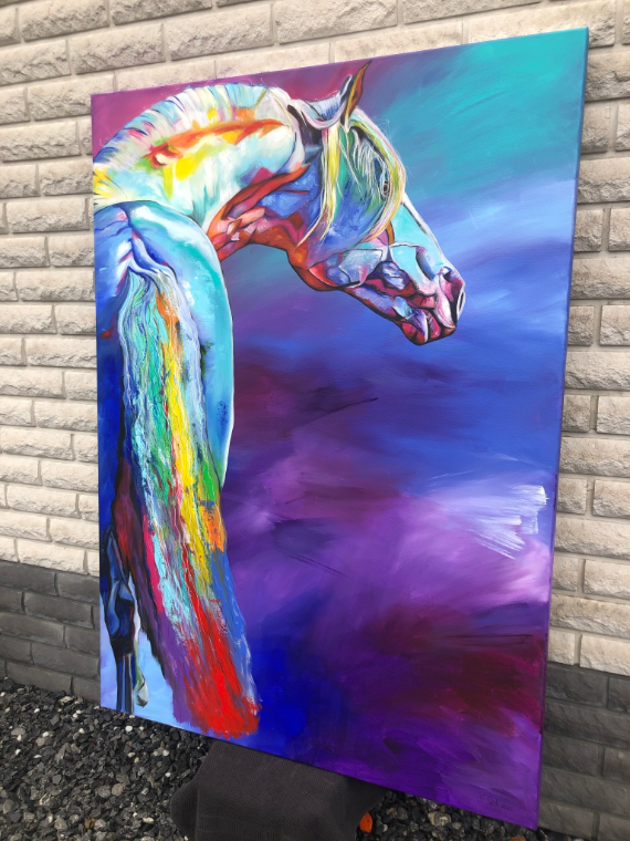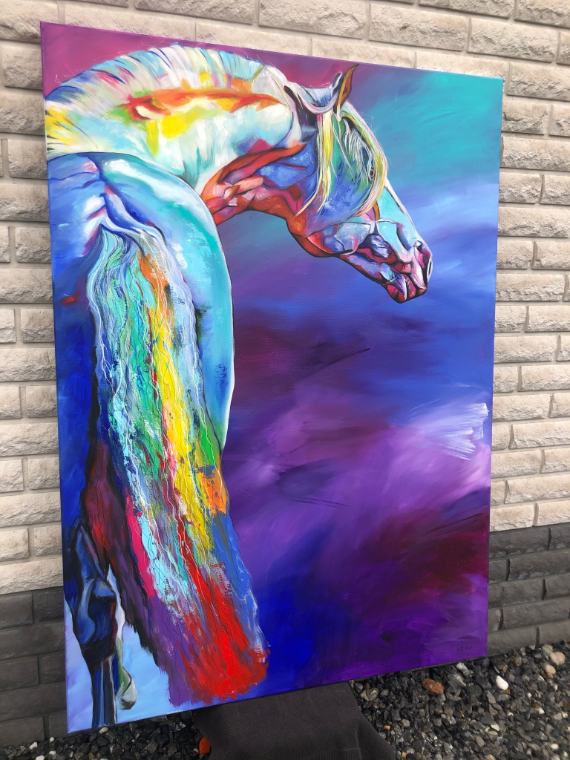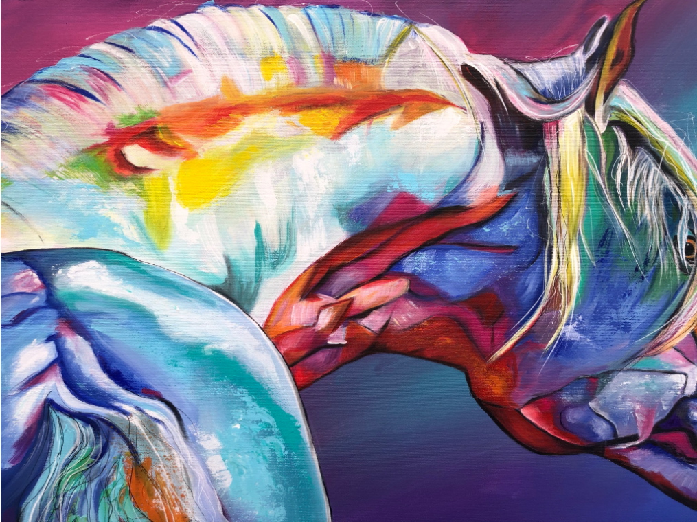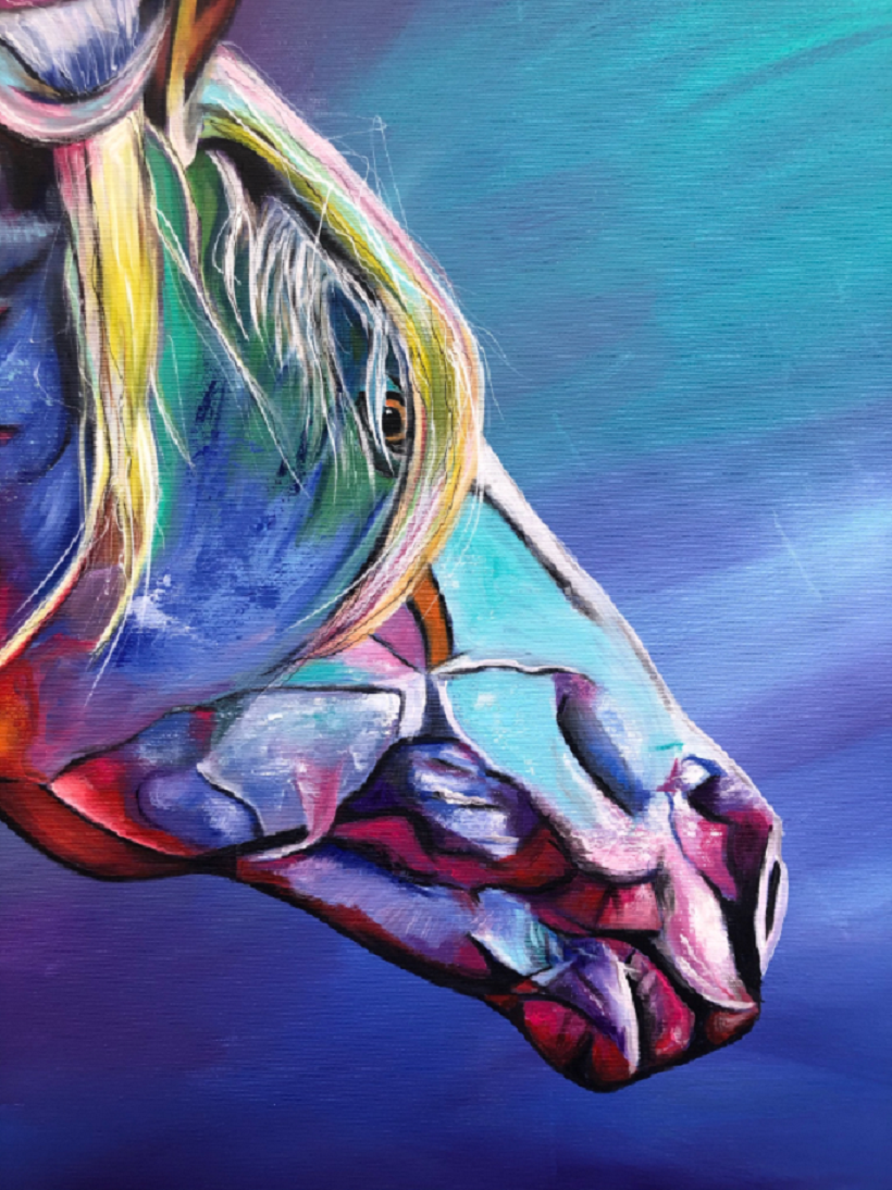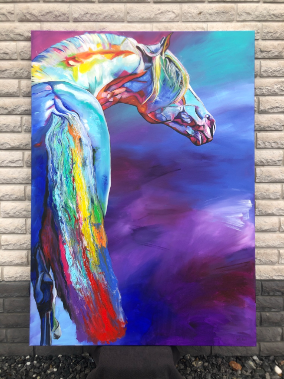 In this piece, I have captured the powerful energy and elegance of a horse in vibrant colors. The expressive acrylic and colored pencil lines convey movement and emotion that flow directly into the room. It is meant to radiate courage and freedom and deeply touch the viewer – a vibrant heartbeat in every home!