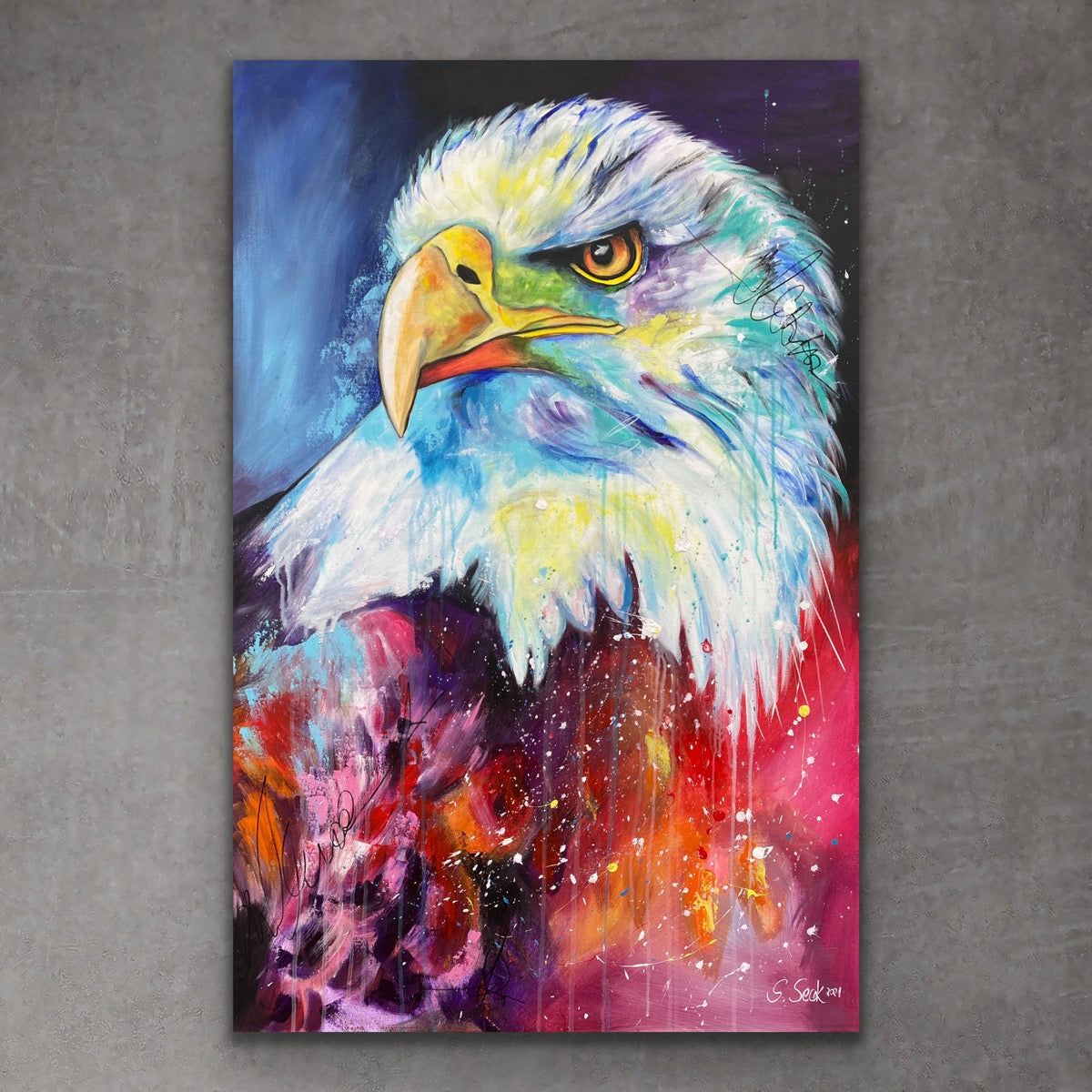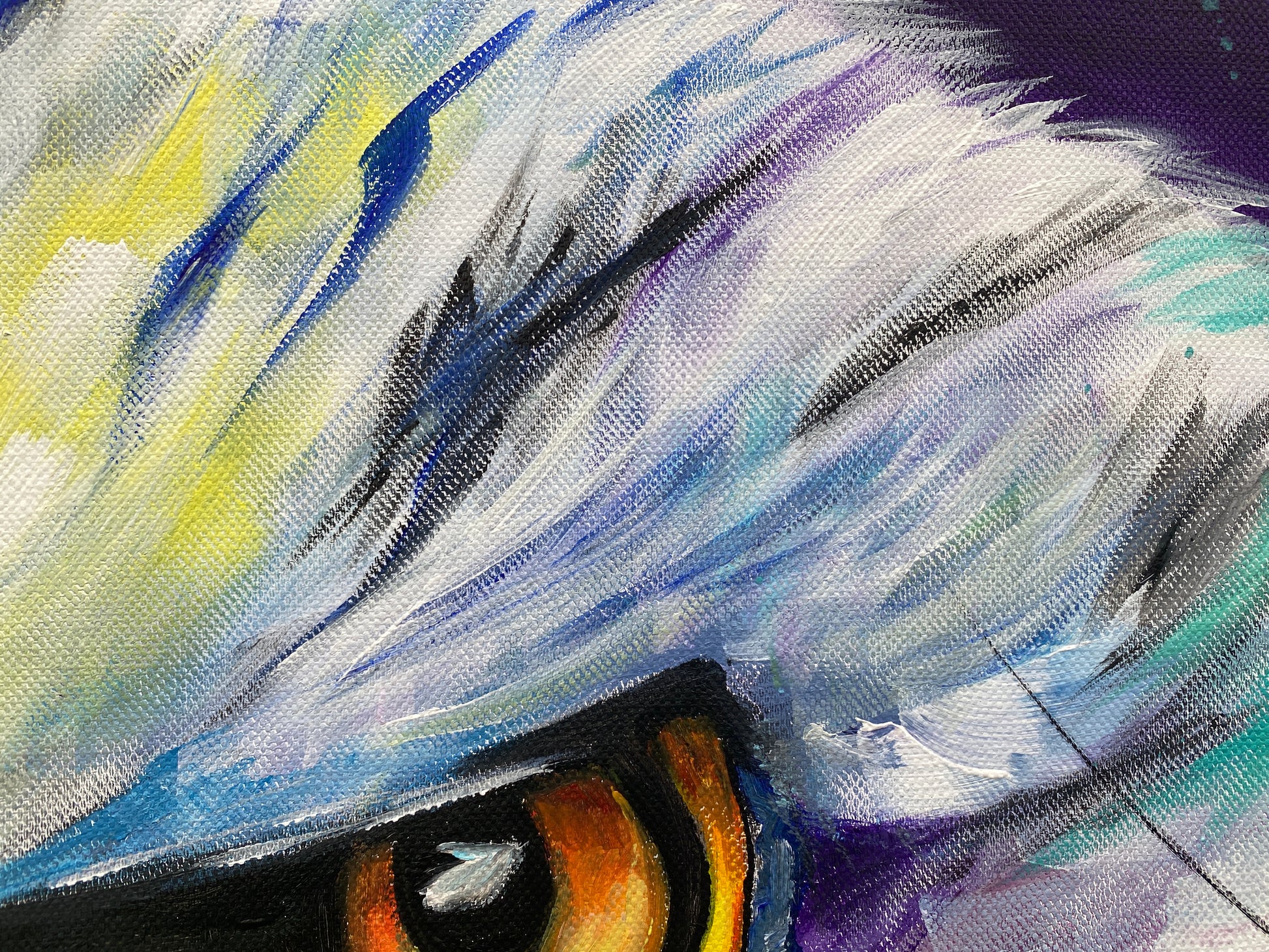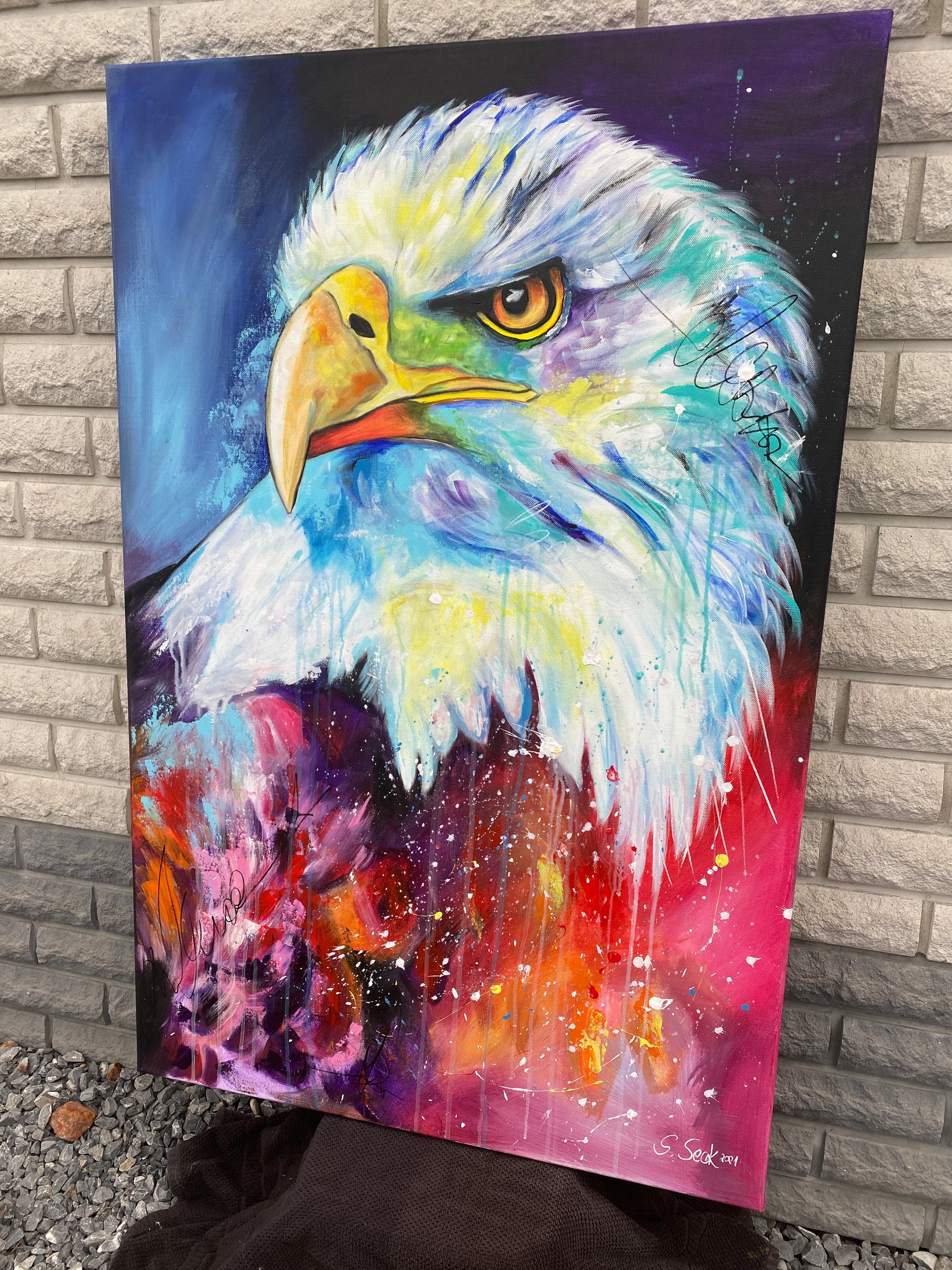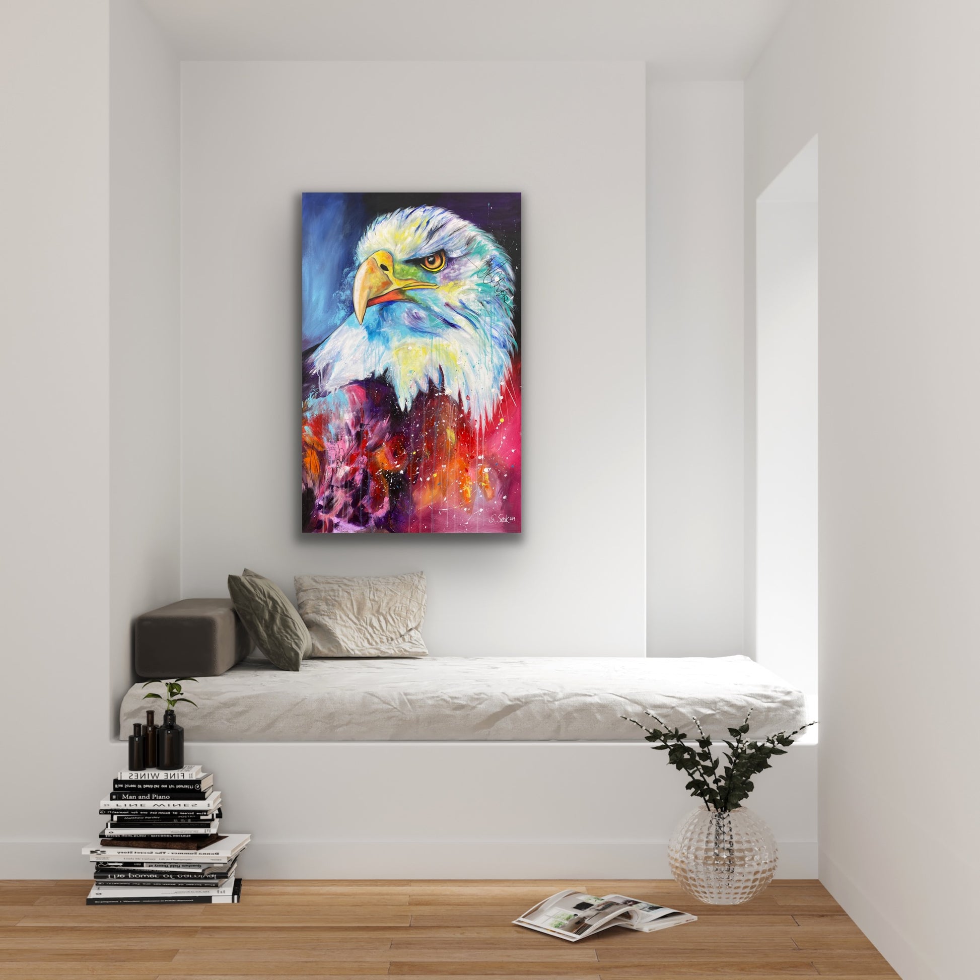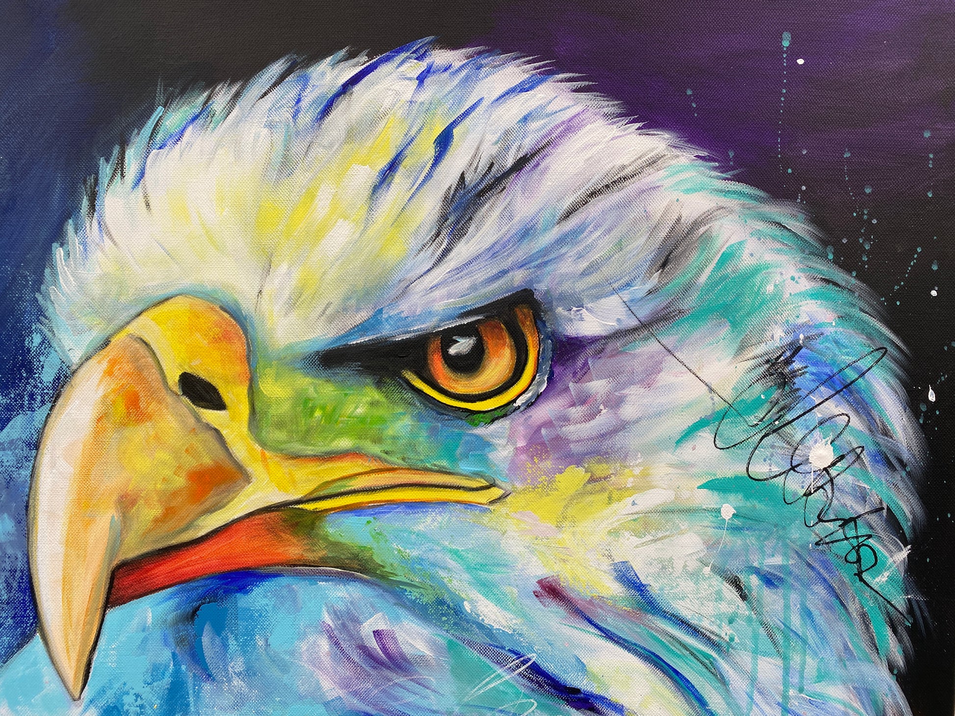 In this painting, I have captured the powerful presence of the eagle, combined with vibrant, expressive colors that underscore its majestic energy. The blend of acrylic and colored pencil brings details to life while simultaneously lending emotional depth to the realism. This work brings strength and freedom to any space and inspires courage and determination.