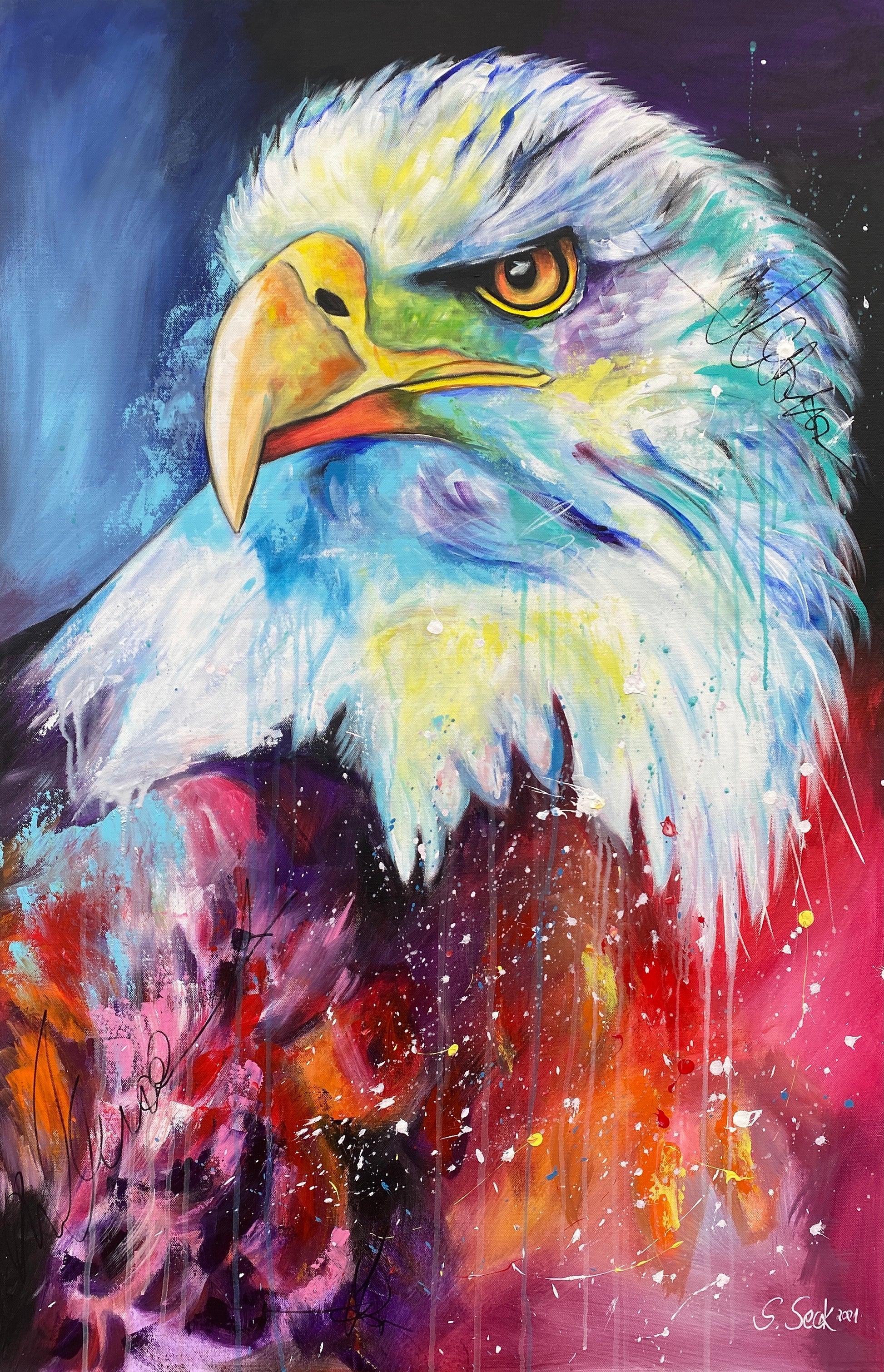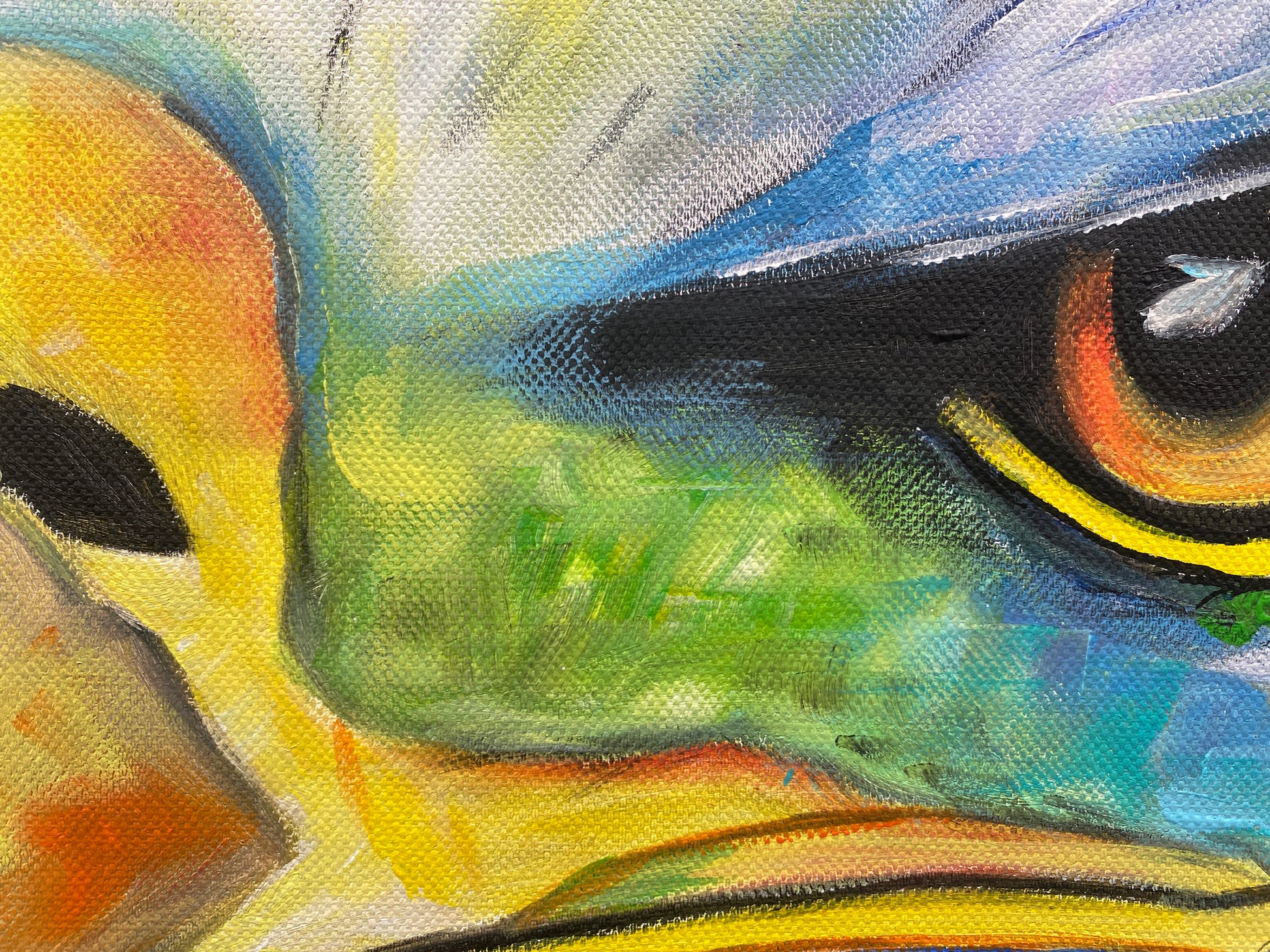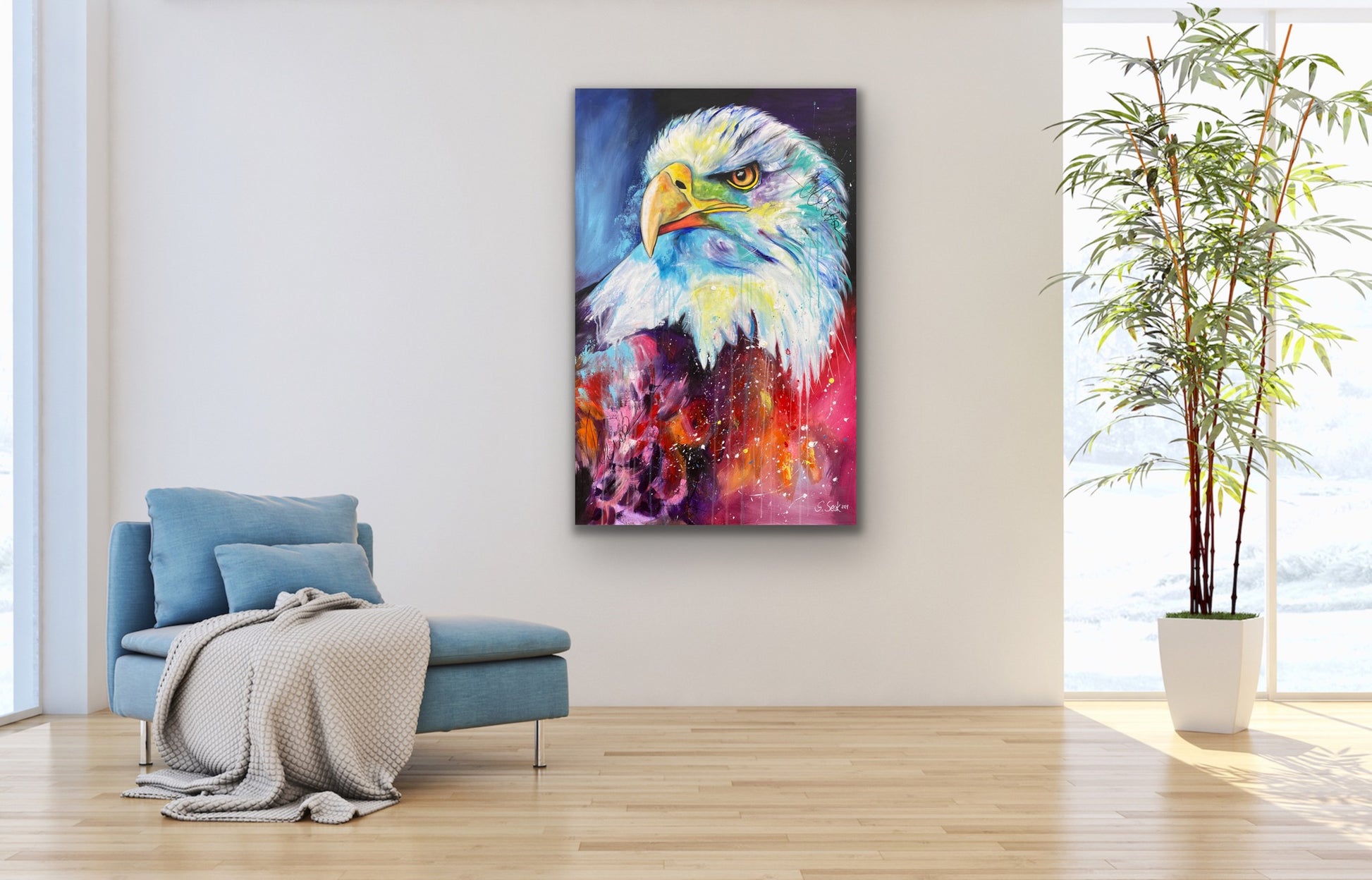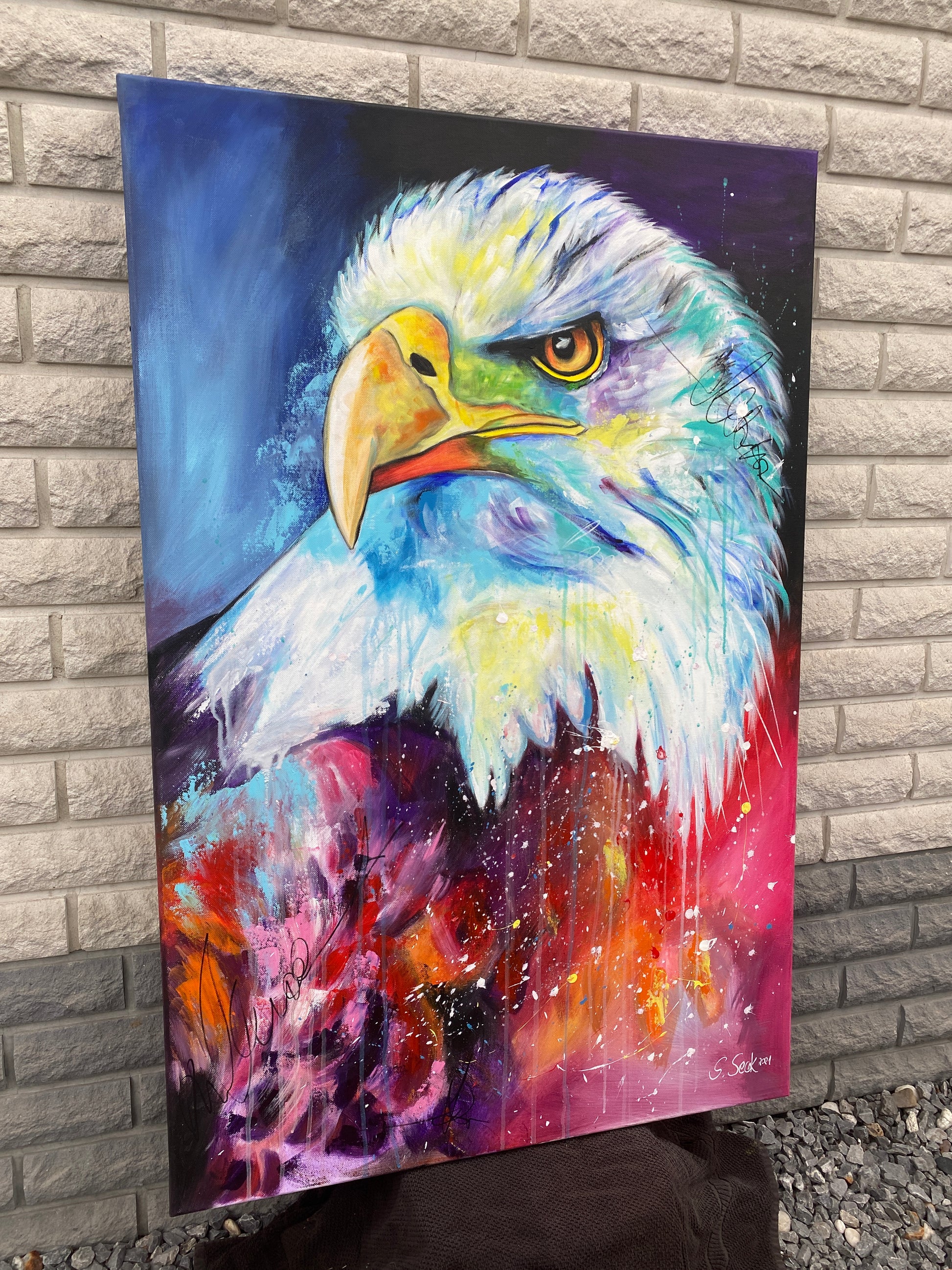 In this painting, I have captured the powerful presence of the eagle, combined with vibrant, expressive colors that underscore its majestic energy. The blend of acrylic and colored pencil brings details to life while simultaneously lending emotional depth to the realism. This work brings strength and freedom to any space and inspires courage and determination.