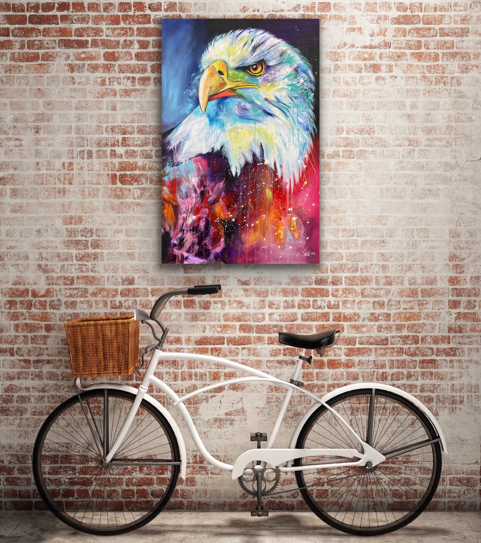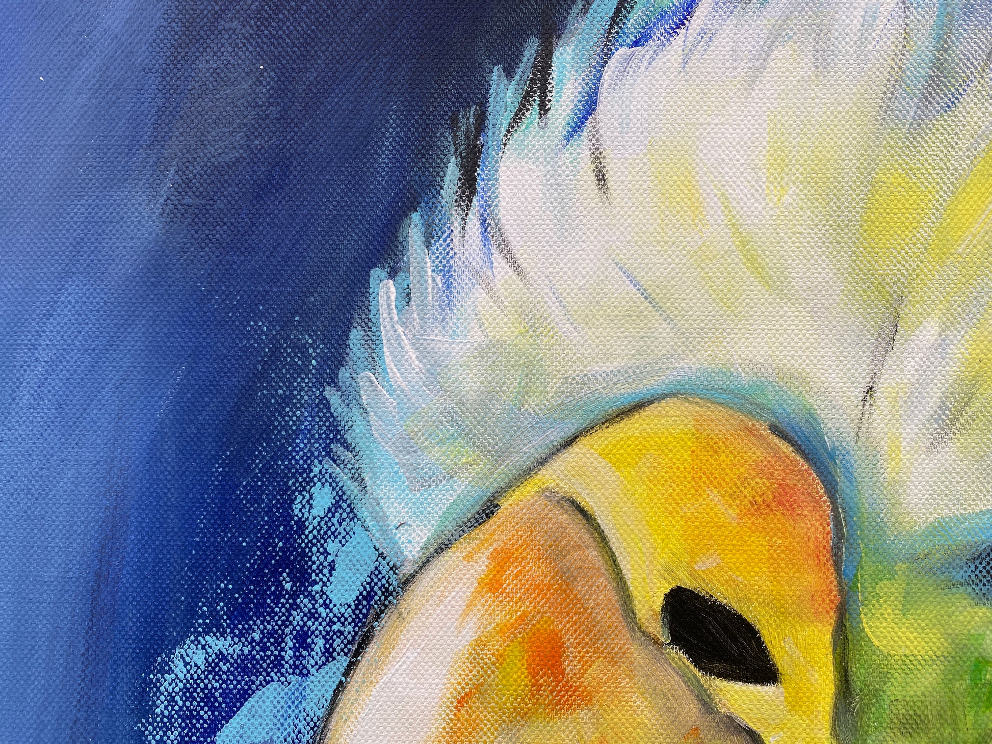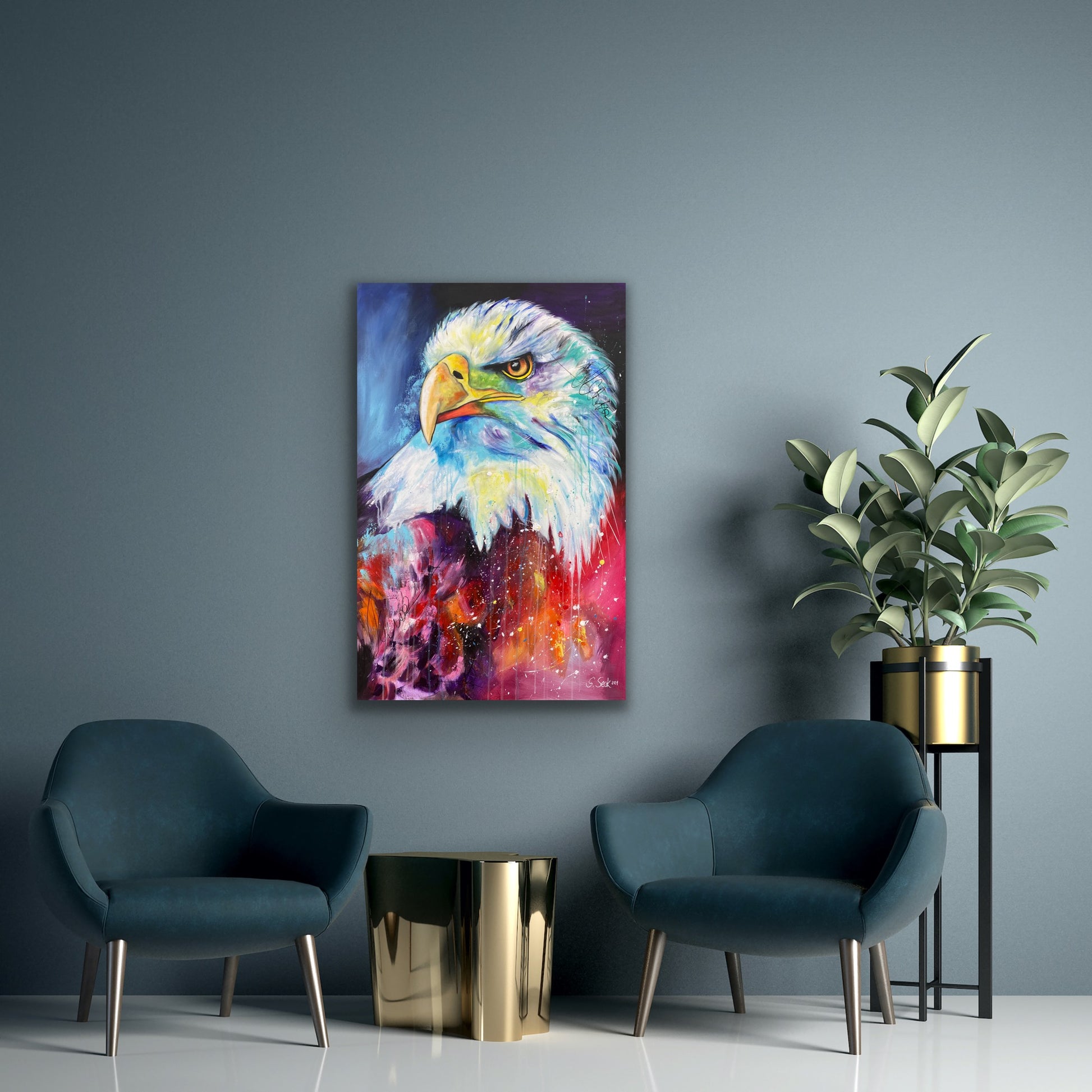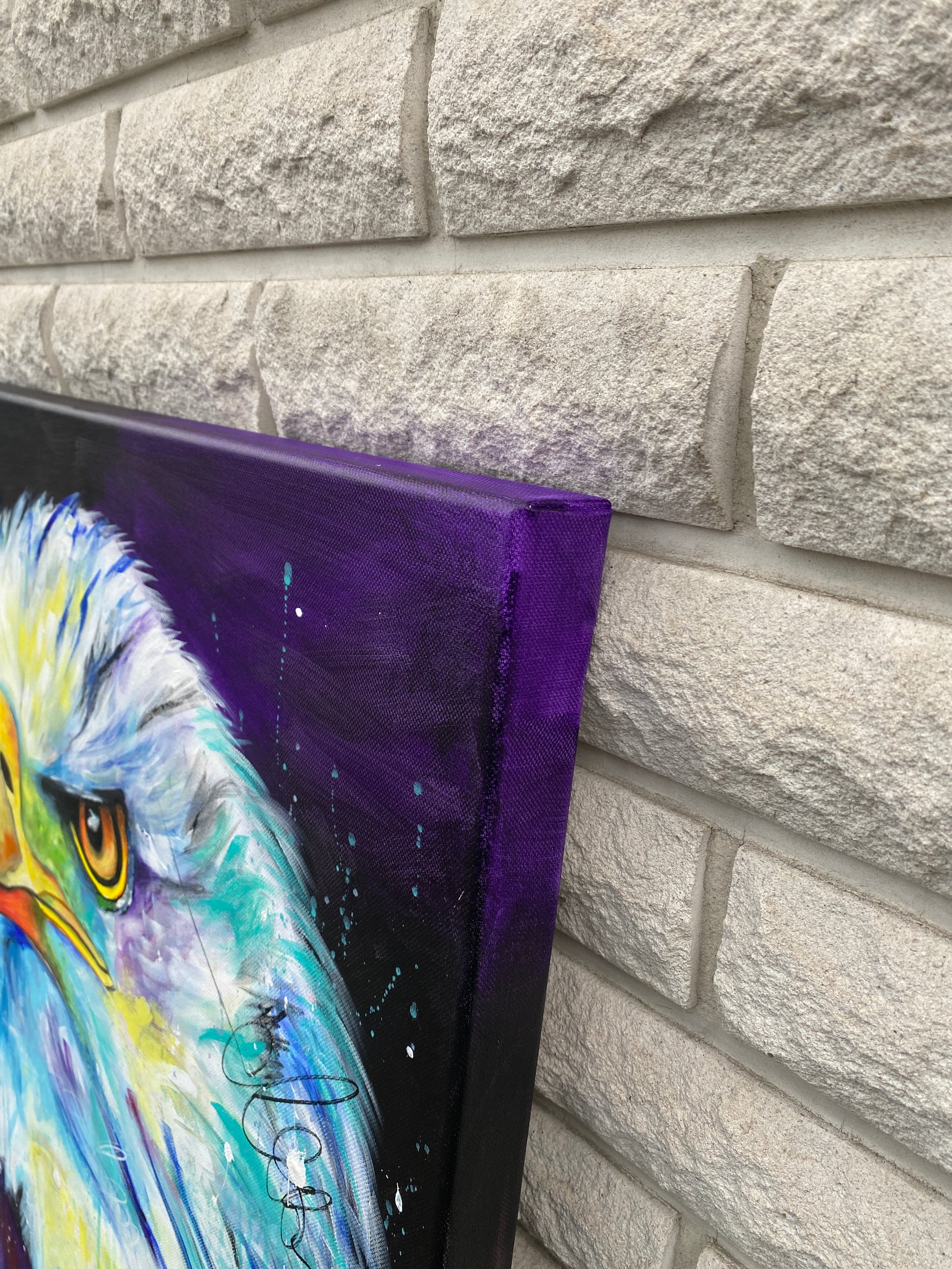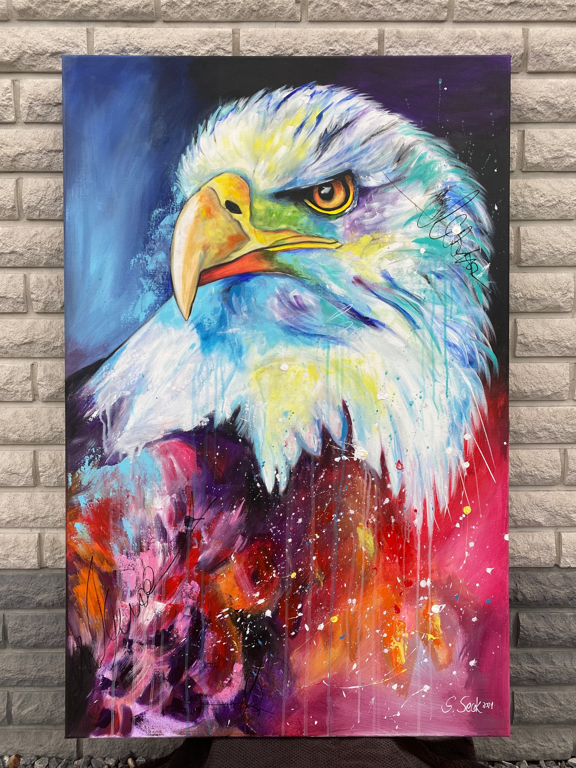 In this painting, I have captured the powerful presence of the eagle, combined with vibrant, expressive colors that underscore its majestic energy. The blend of acrylic and colored pencil brings details to life while simultaneously lending emotional depth to the realism. This work brings strength and freedom to any space and inspires courage and determination.