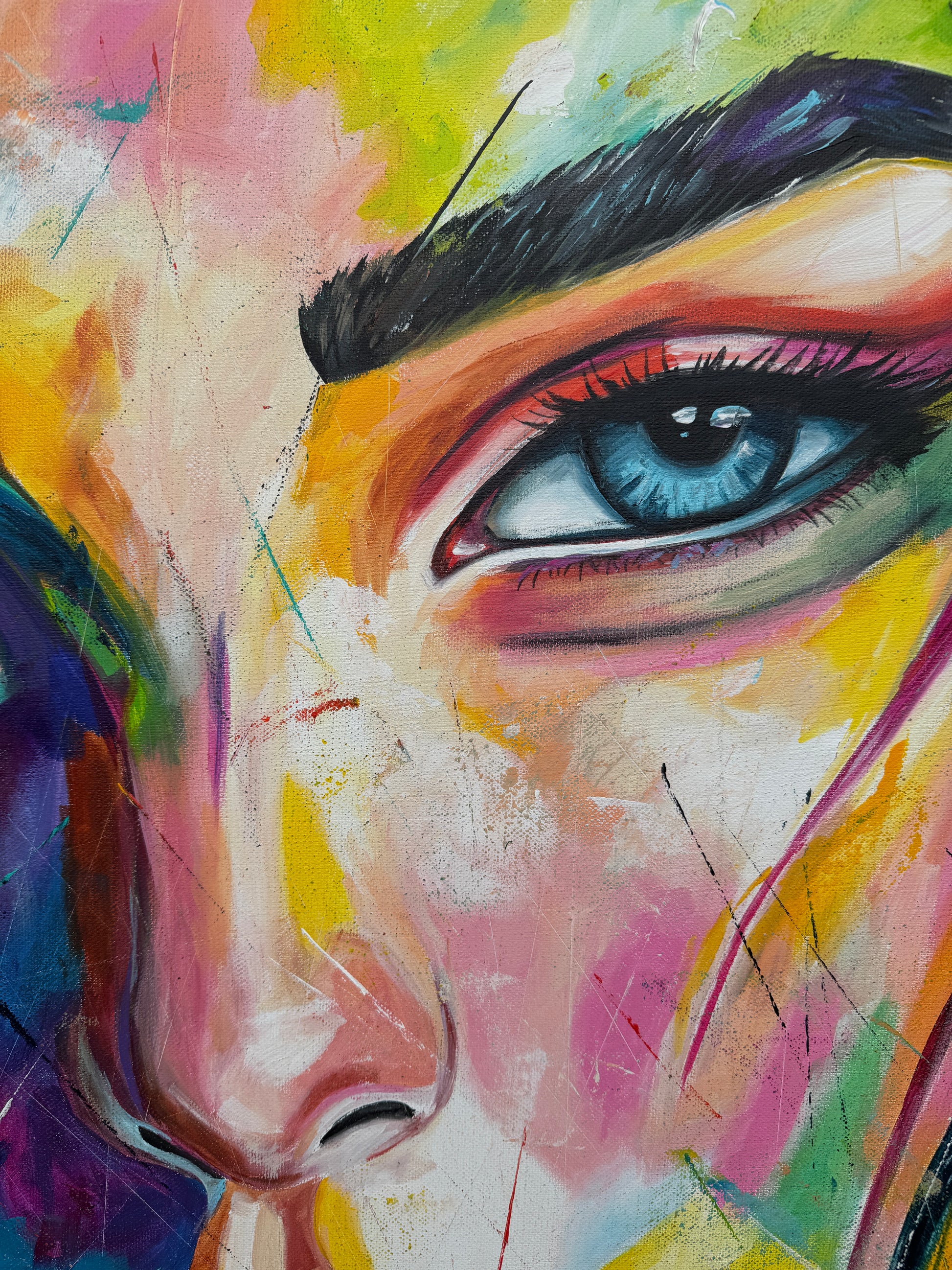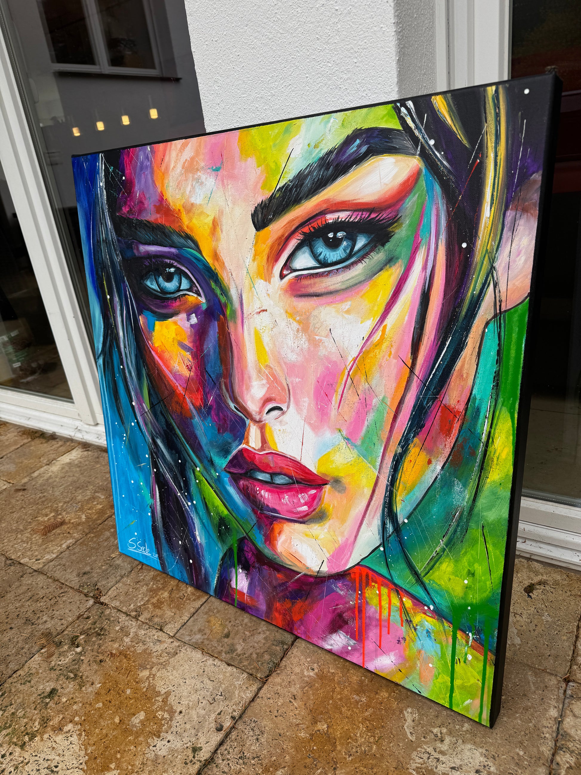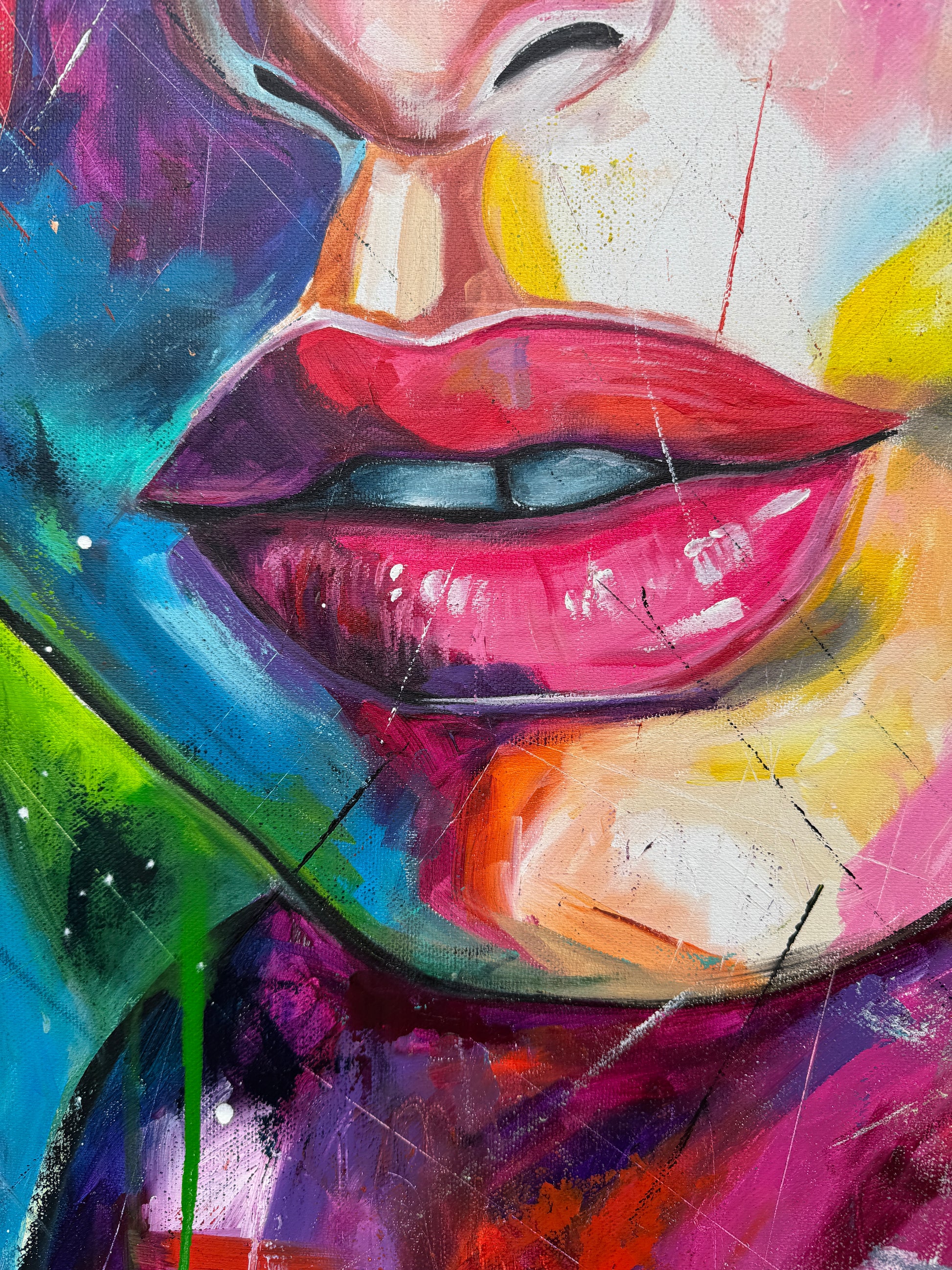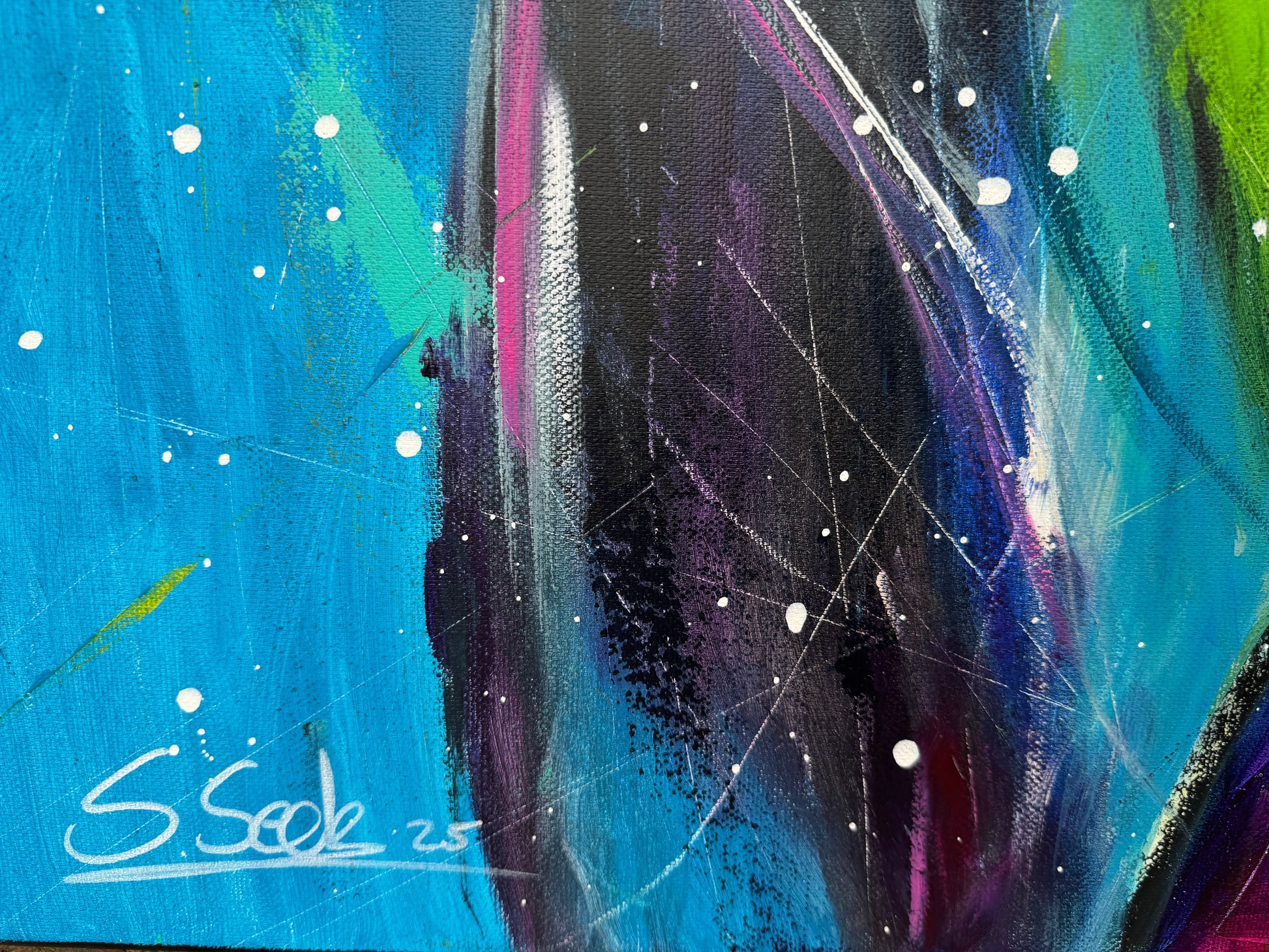Die Sonne ist untergegangen und der Mond steht am Himmel. Die Geräusche der Nacht begleiten uns, die Dunkelheit unser willkommener Begleiter. Die Mischung aus abstrakten und figurativen Elementen spiegelt das Spannungsfeld zwischen Innerem und Äußerem wider. Dieses Bild bringt Energie und Leidenschaft in jeden Raum, es lädt dazu ein, Gefühle zu fühlen und Geschichten zu entdecken, die unter der Oberfläche verborgen sind.