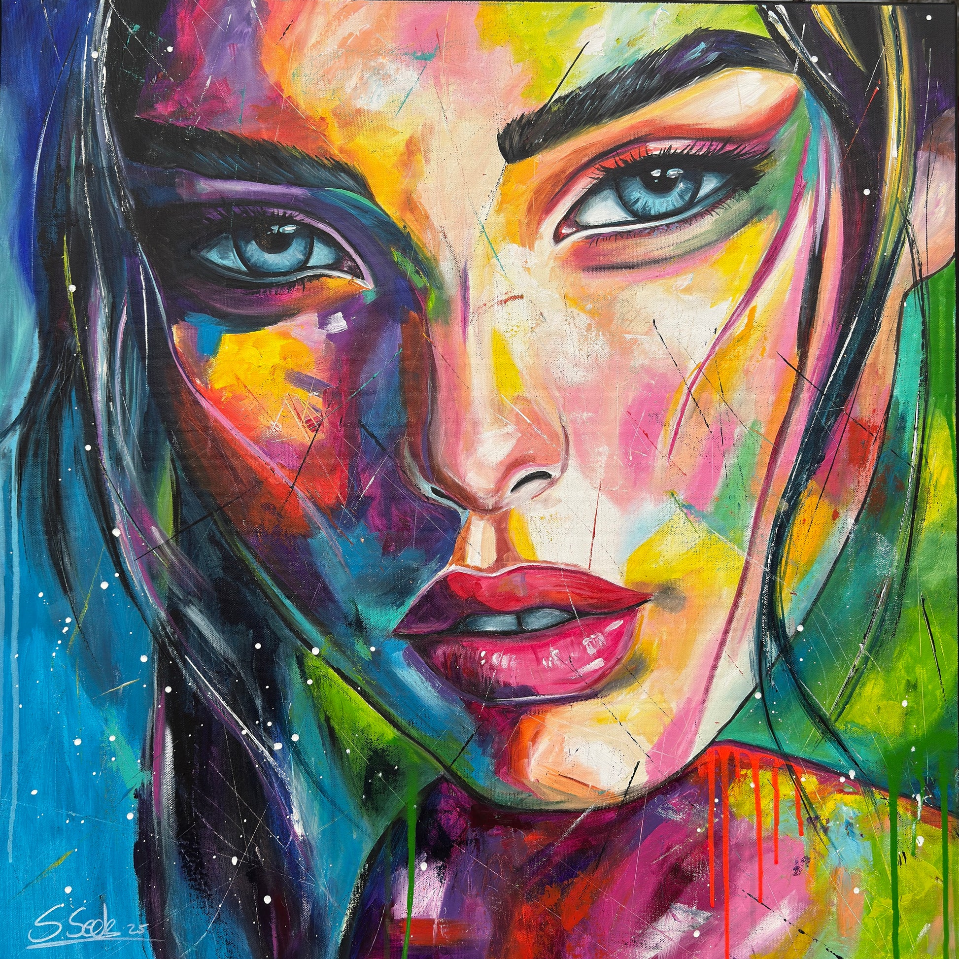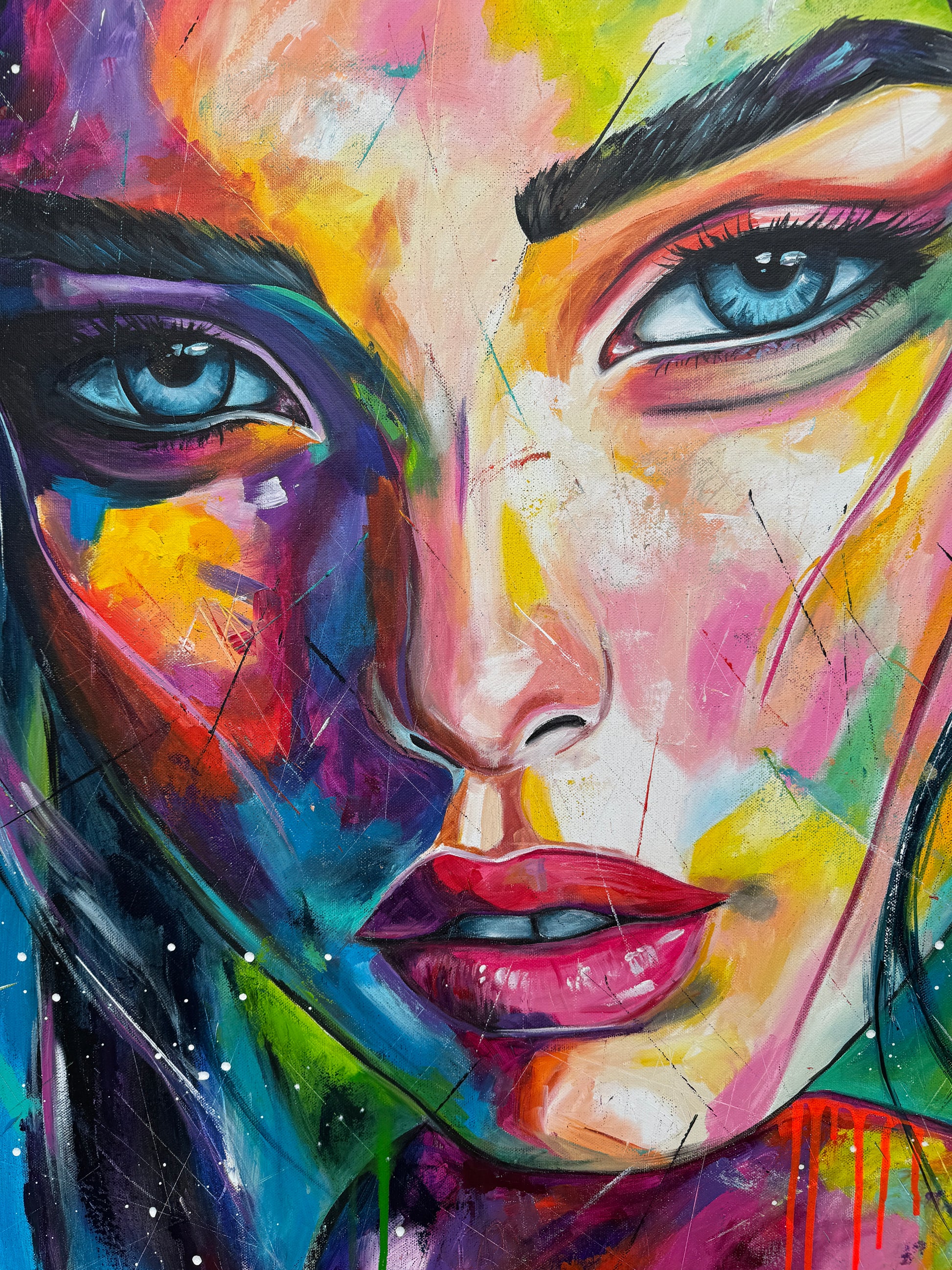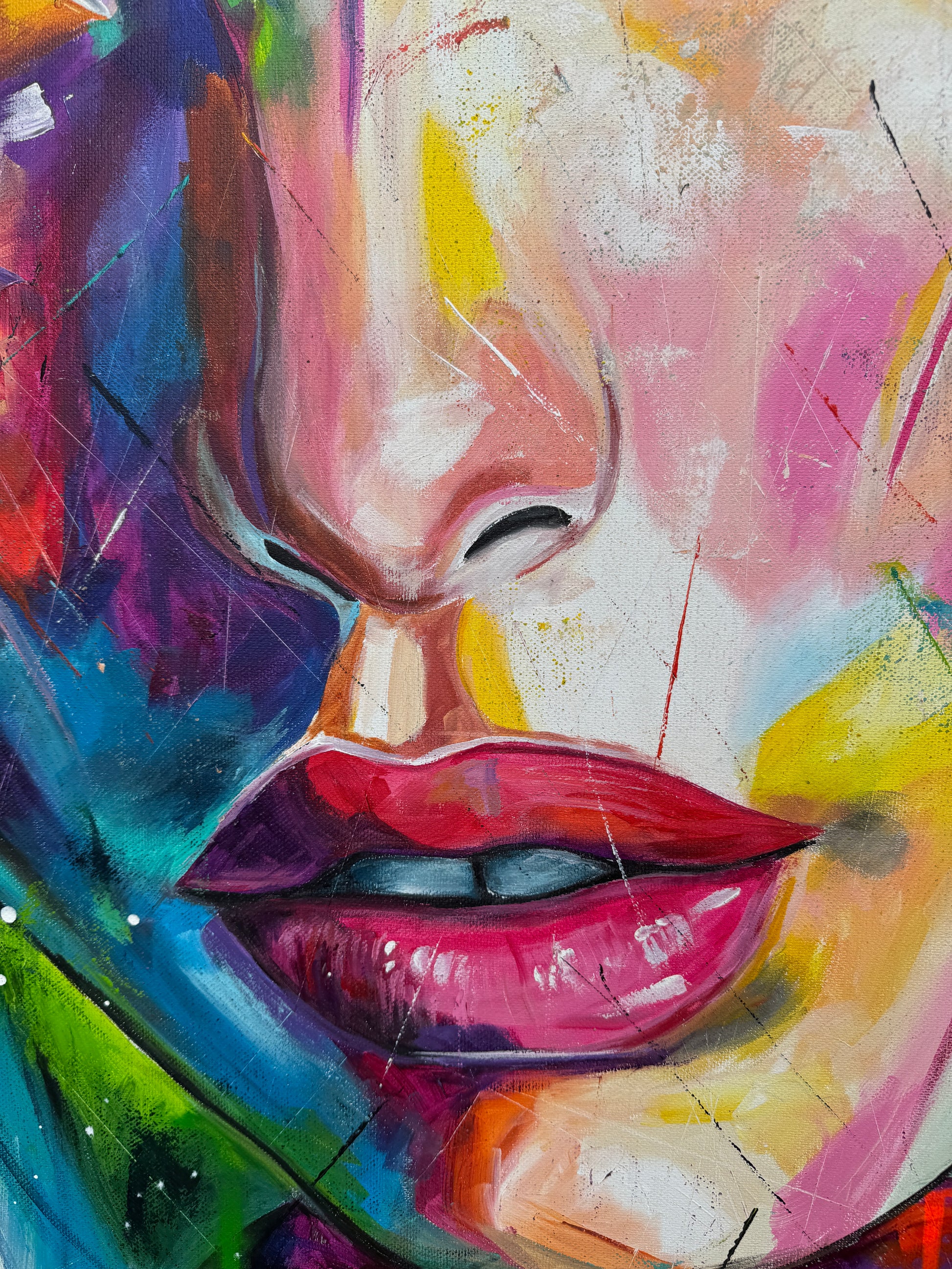 Die Sonne ist untergegangen und der Mond steht am Himmel. Die Geräusche der Nacht begleiten uns, die Dunkelheit unser willkommener Begleiter. Die Mischung aus abstrakten und figurativen Elementen spiegelt das Spannungsfeld zwischen Innerem und Äußerem wider. Dieses Bild bringt Energie und Leidenschaft in jeden Raum, es lädt dazu ein, Gefühle zu fühlen und Geschichten zu entdecken, die unter der Oberfläche verborgen sind.