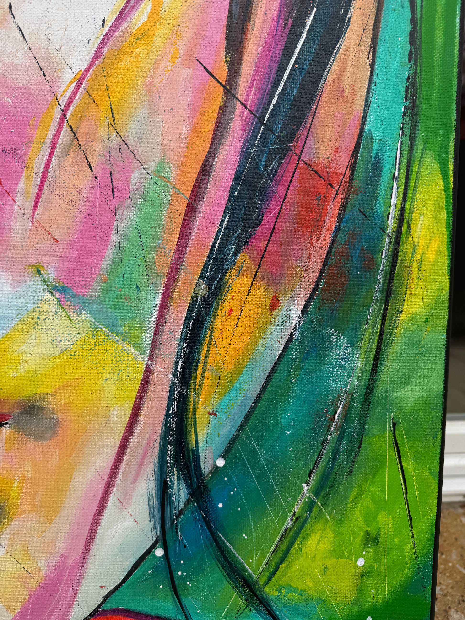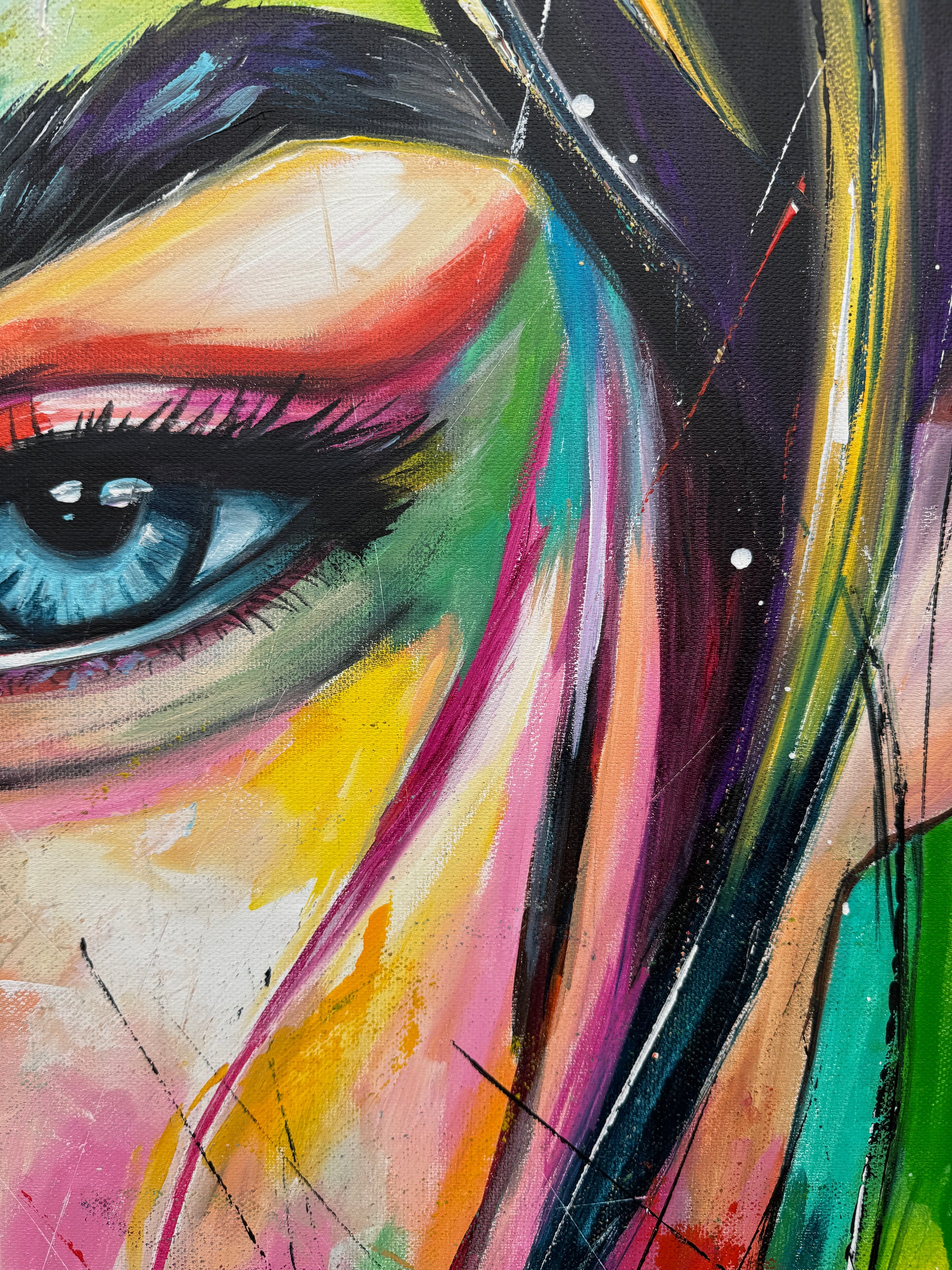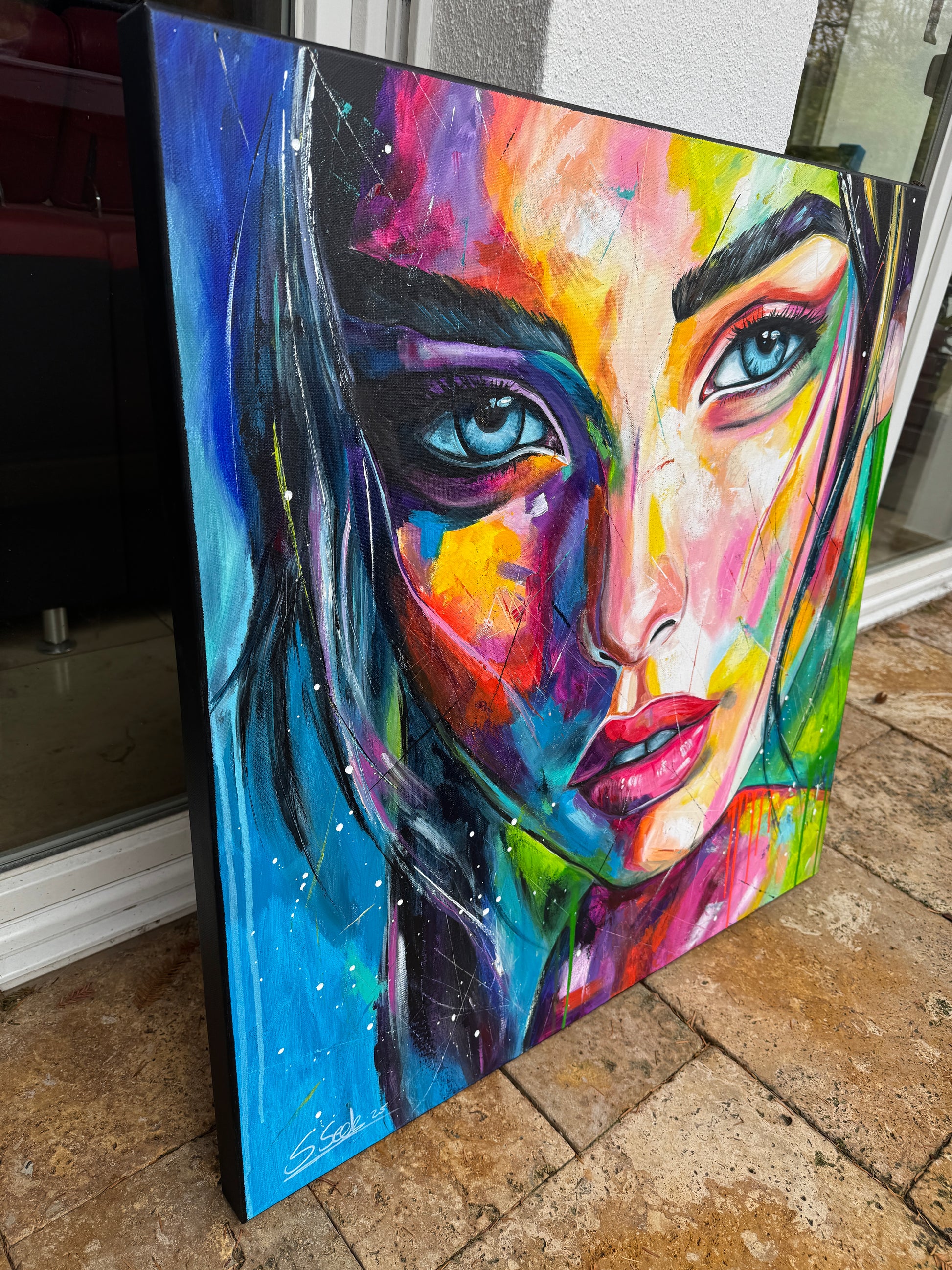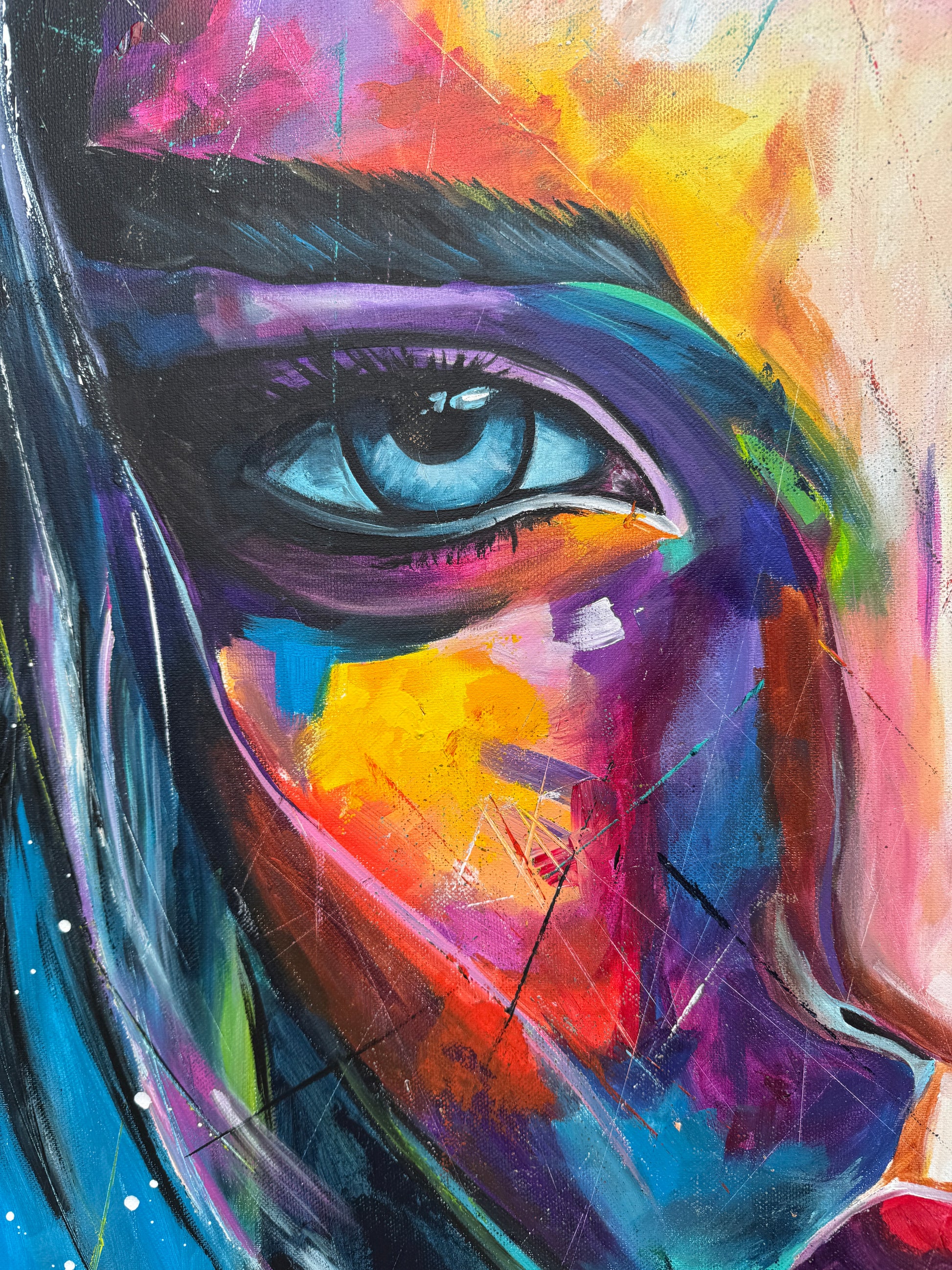 Die Sonne ist untergegangen und der Mond steht am Himmel. Die Geräusche der Nacht begleiten uns, die Dunkelheit unser willkommener Begleiter. Die Mischung aus abstrakten und figurativen Elementen spiegelt das Spannungsfeld zwischen Innerem und Äußerem wider. Dieses Bild bringt Energie und Leidenschaft in jeden Raum, es lädt dazu ein, Gefühle zu fühlen und Geschichten zu entdecken, die unter der Oberfläche verborgen sind.