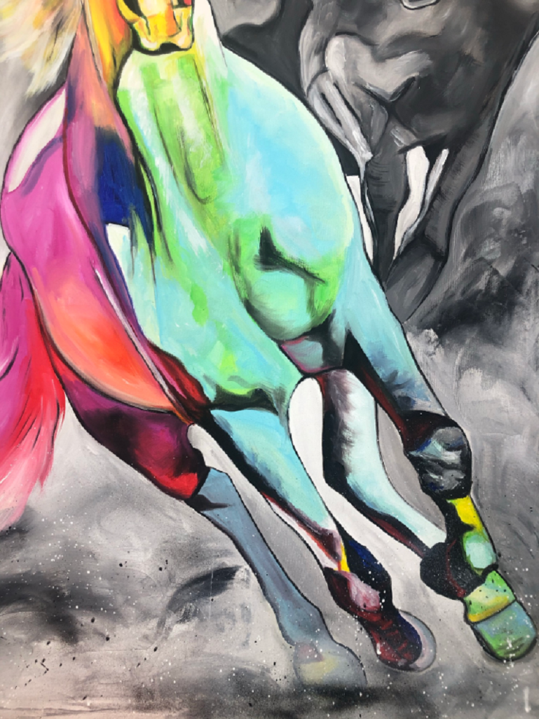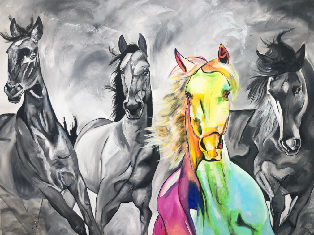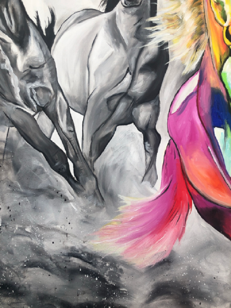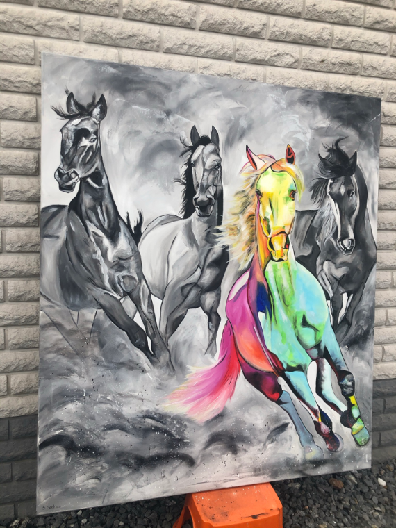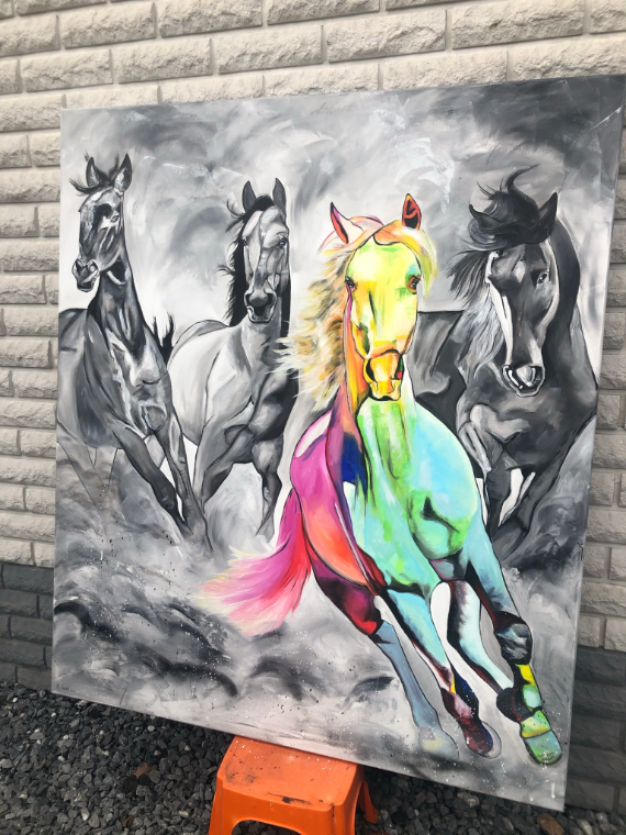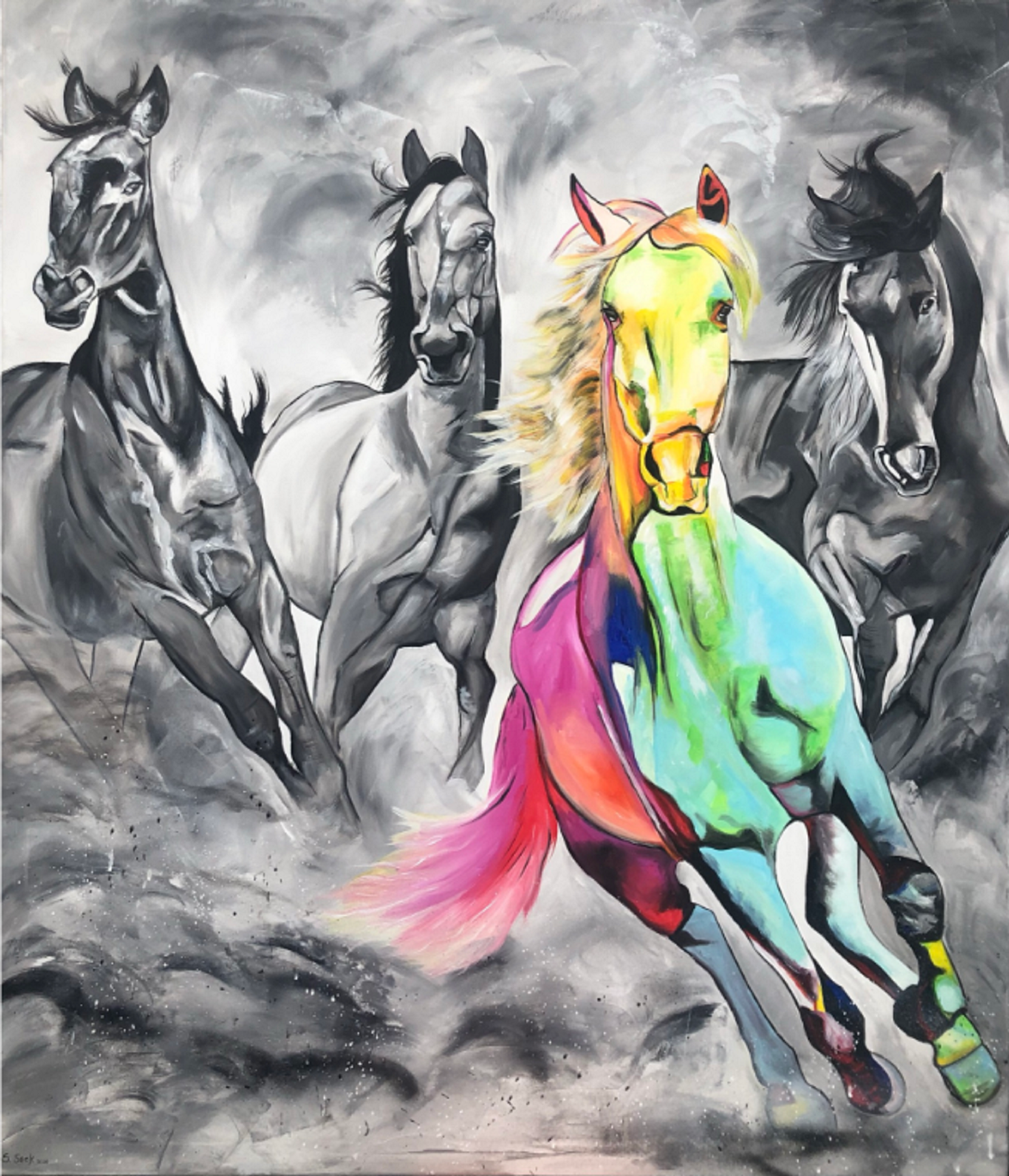 In this work, I have captured the untamed energy of horses by combining classical expression with bold, unexpected colors. The vibrant foreground symbolizes joie de vivre and individuality, while the monochrome background represents mass and conformity. This dynamic brings vibrant energy and emotion to any space, awakening freedom and movement.