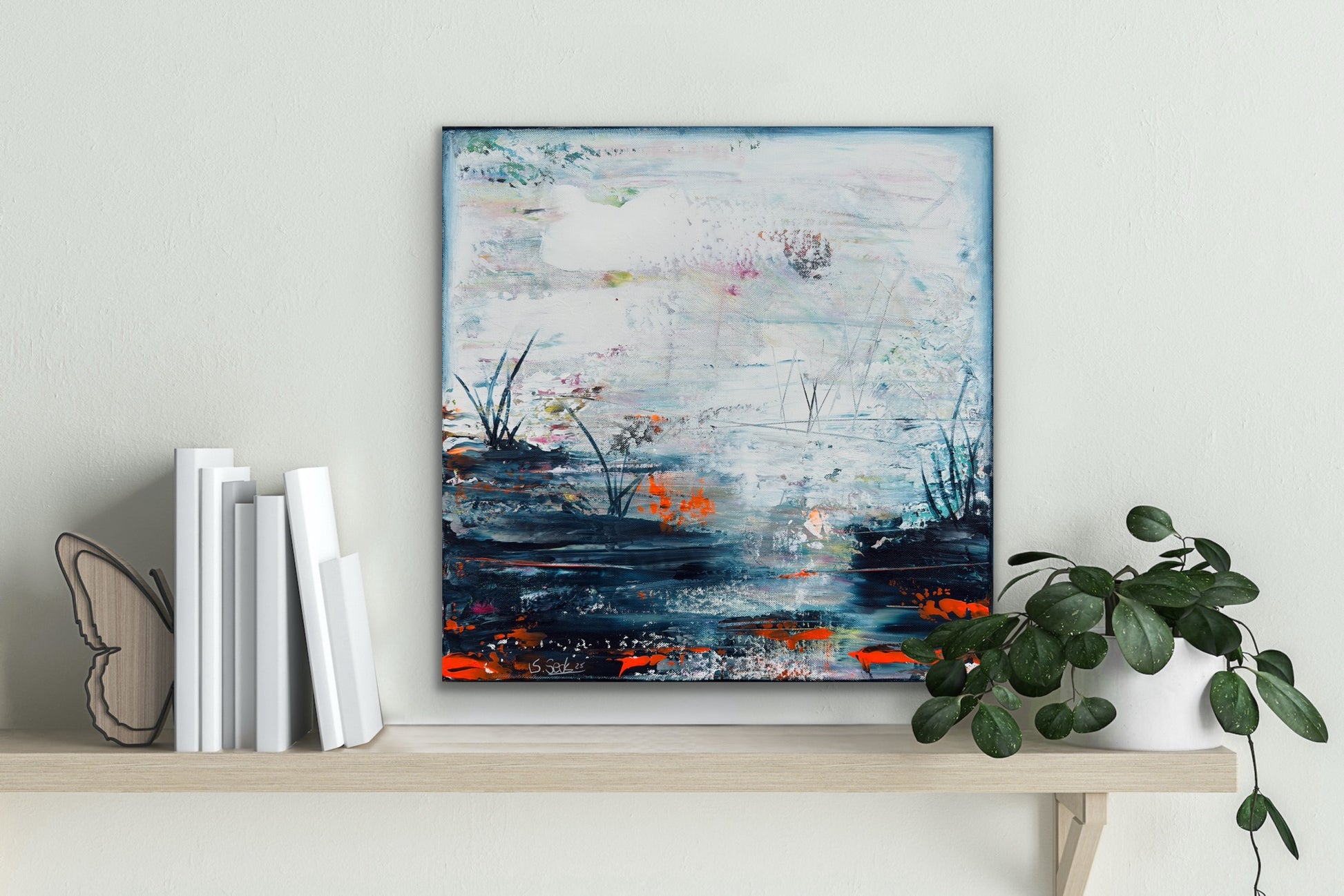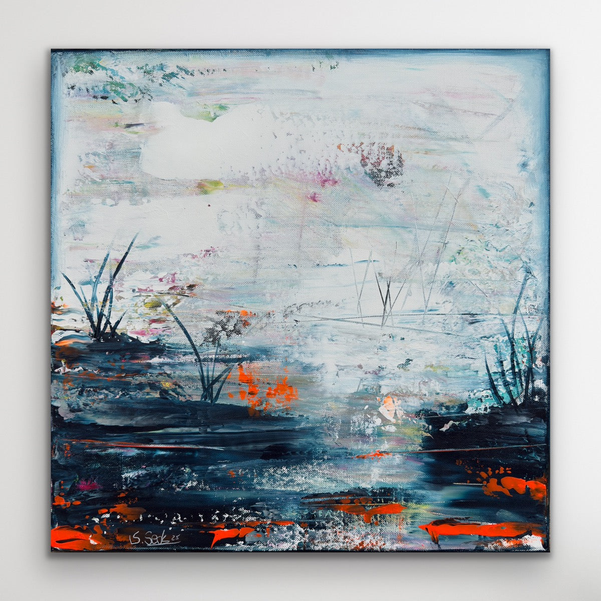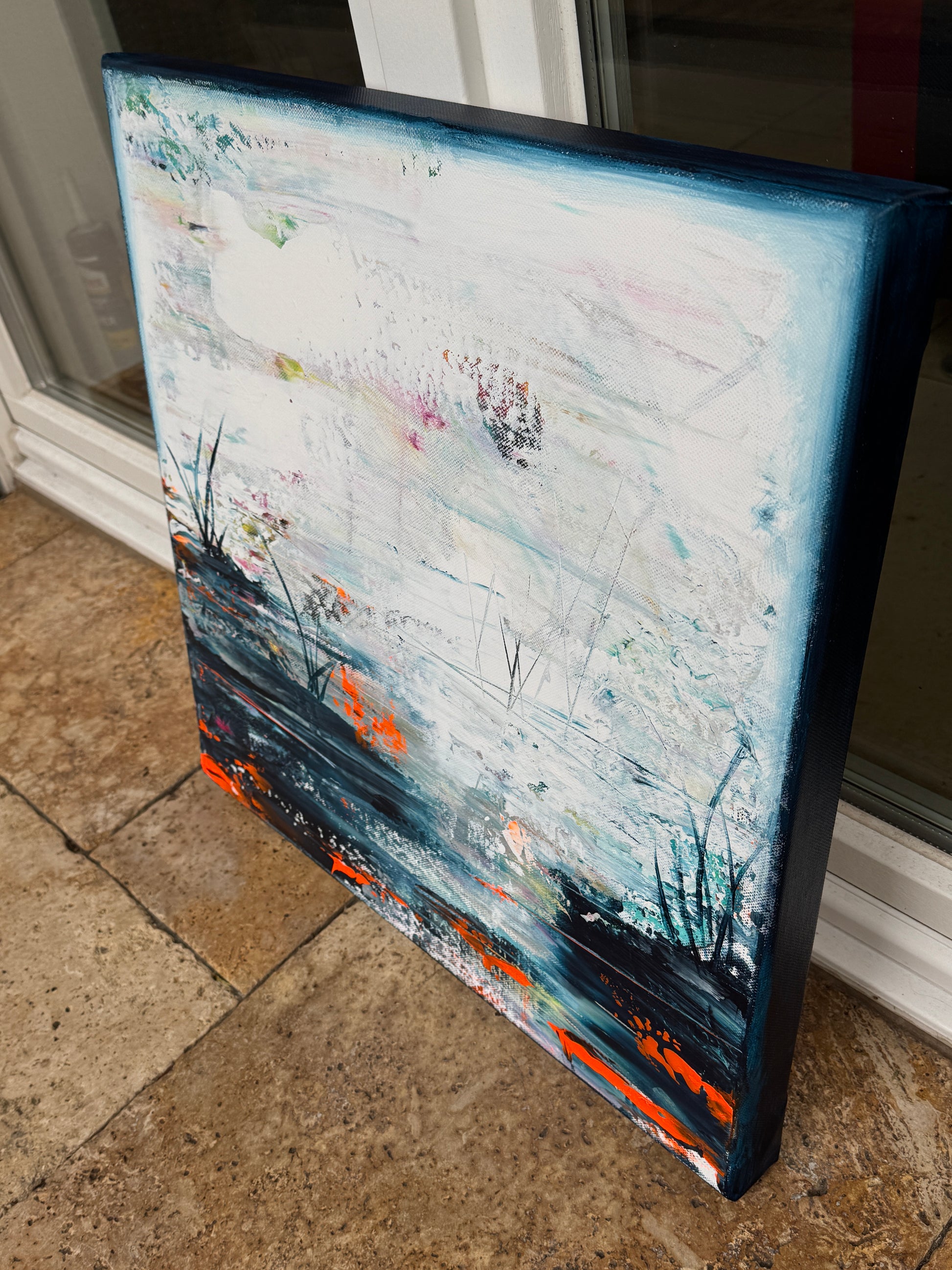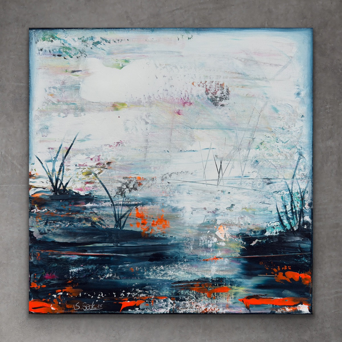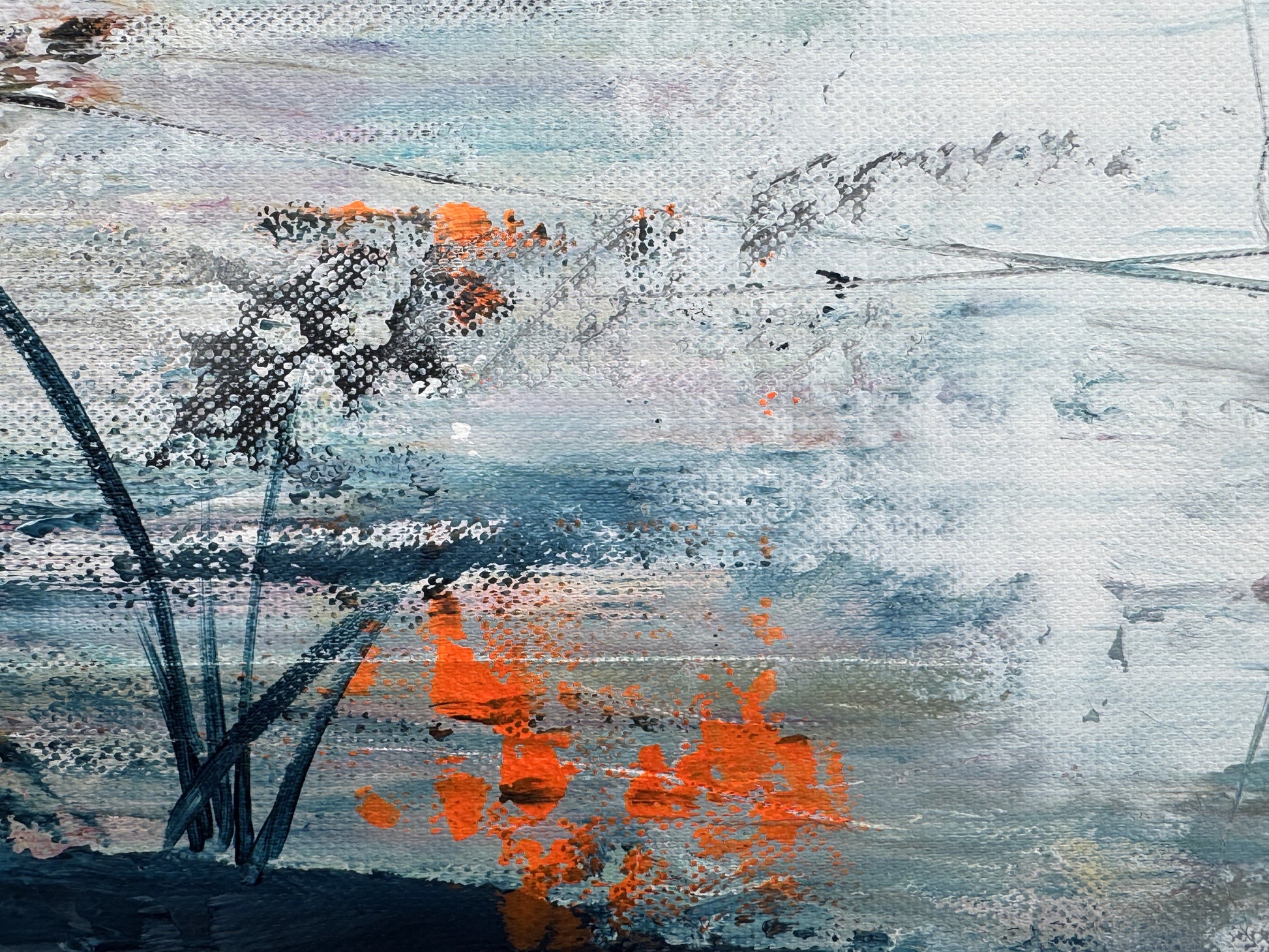 Using acrylic paints, I have created an abstract winter landscape by a lake, capturing both tranquility and coldness. The cool blues and delicate whites reflect the still water and frosty sky, while the darker shades and orange accents suggest energy and life beneath the surface. The fog lingers stubbornly. This work brings a peaceful yet dynamic atmosphere to any room.