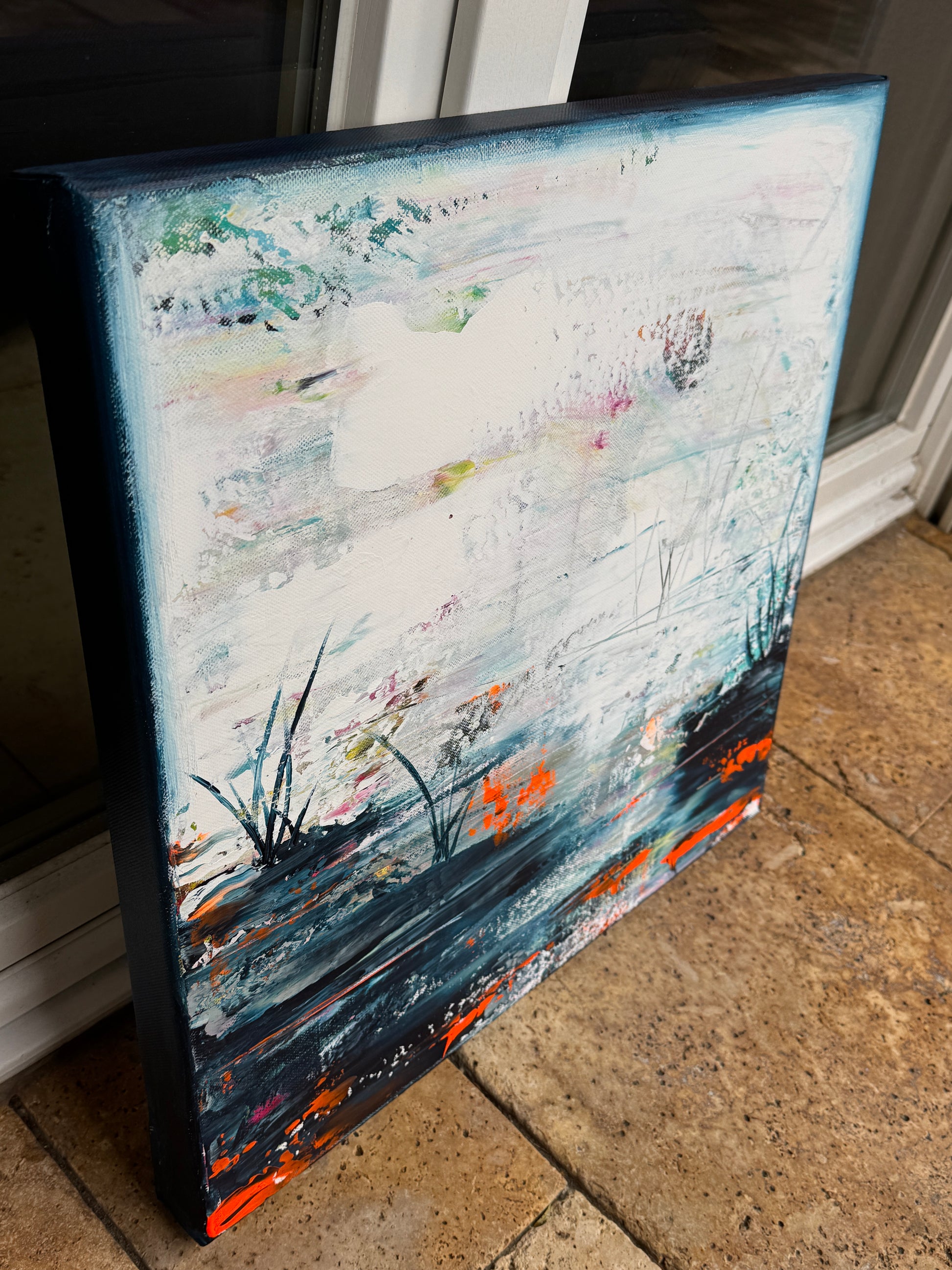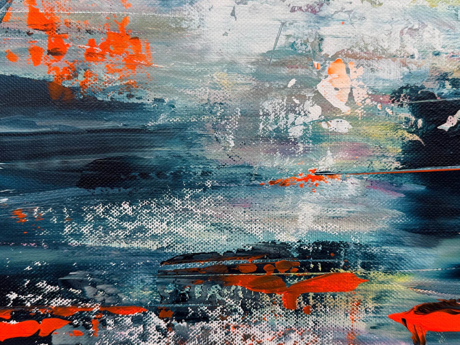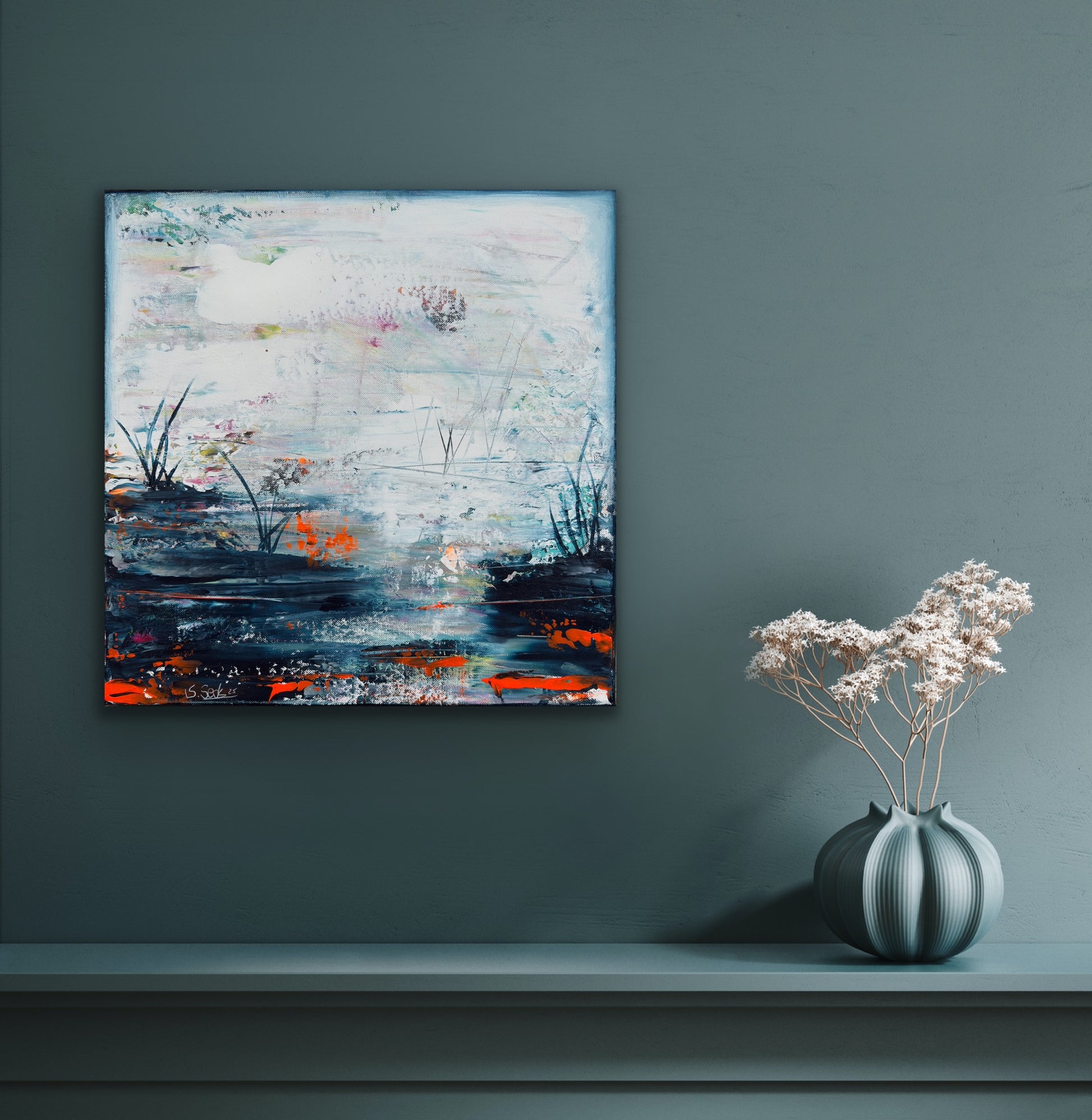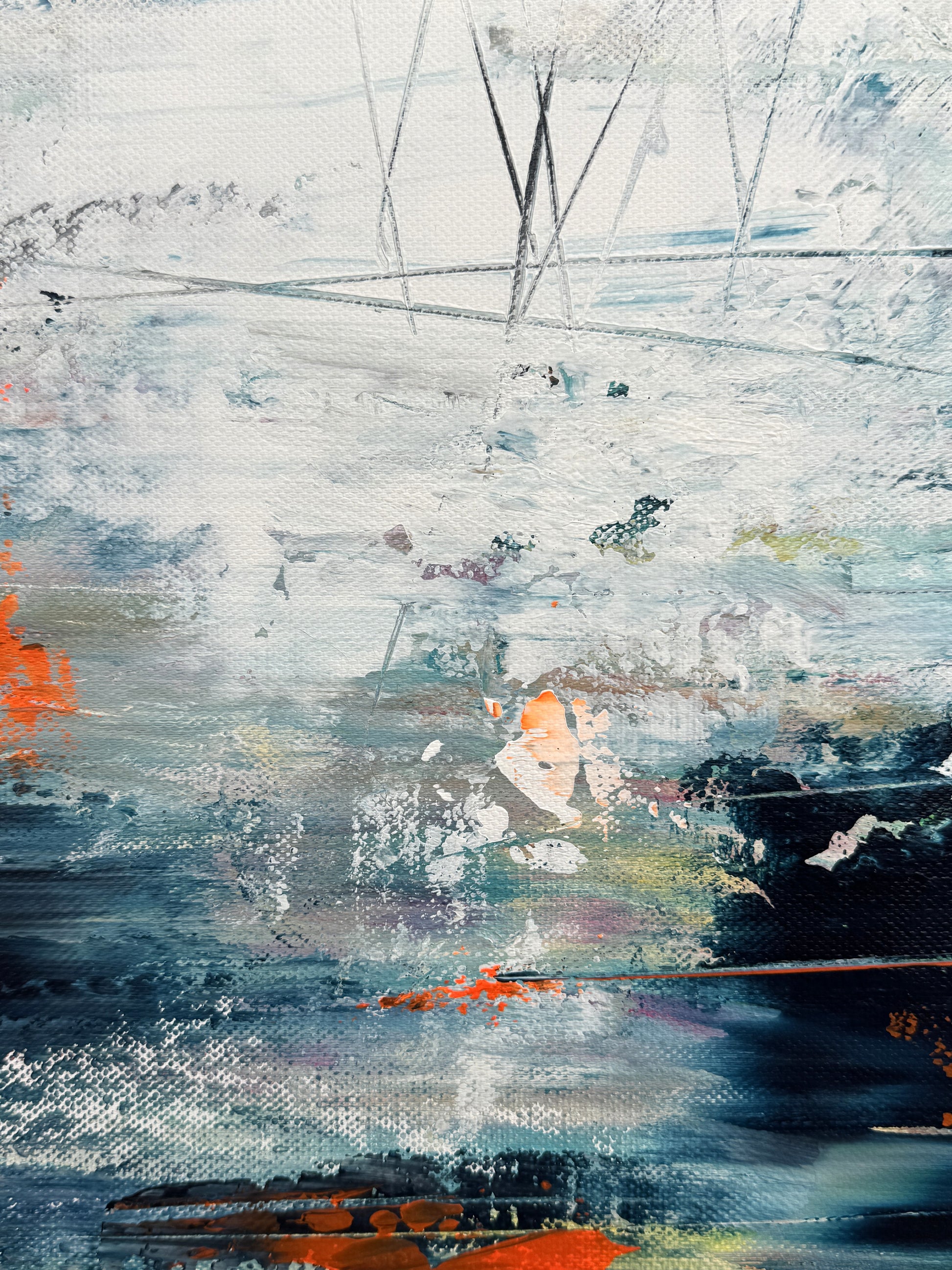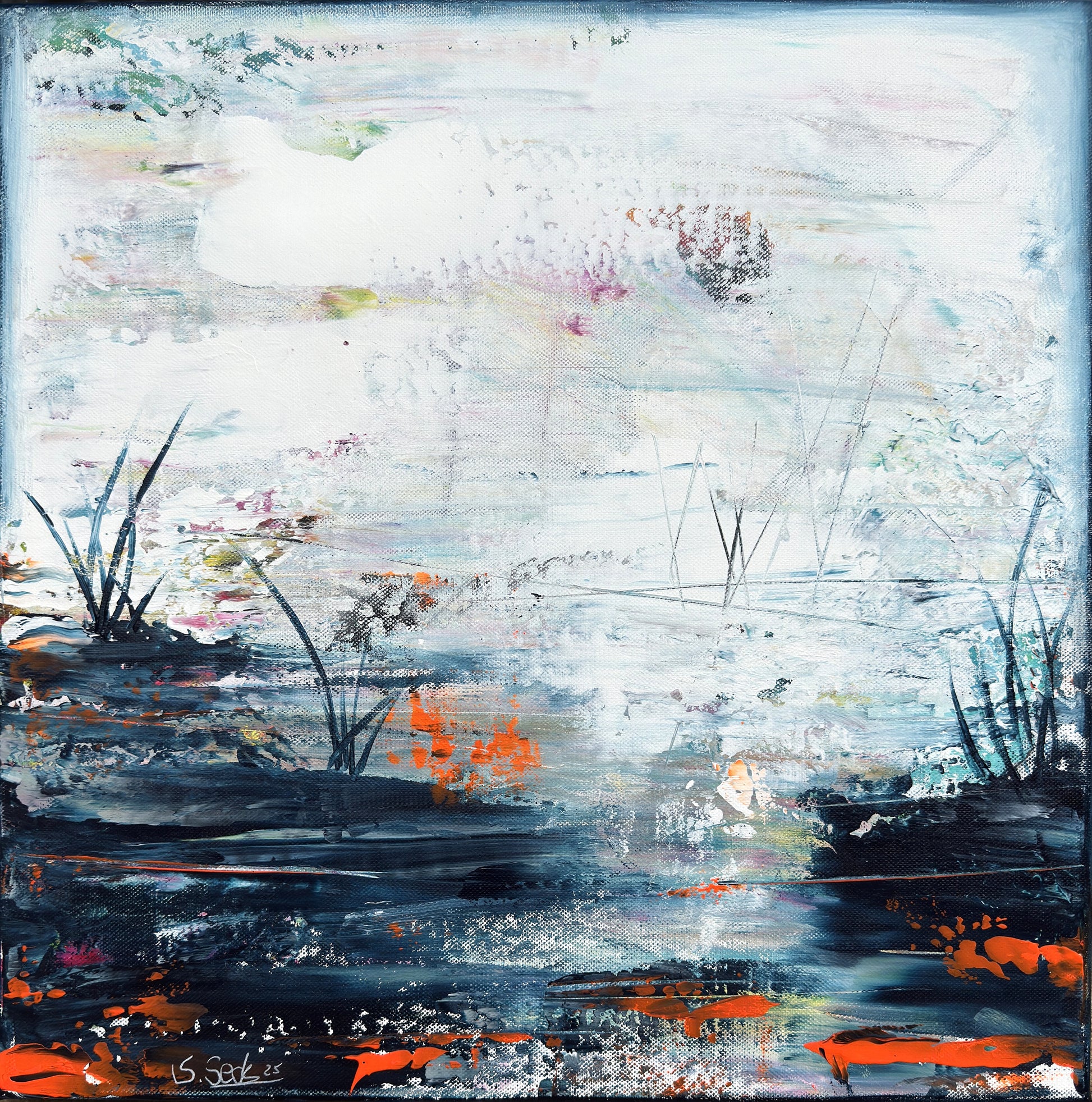 Using acrylic paints, I have created an abstract winter landscape by a lake, capturing both tranquility and coldness. The cool blues and delicate whites reflect the still water and frosty sky, while the darker shades and orange accents suggest energy and life beneath the surface. The fog lingers stubbornly. This work brings a peaceful yet dynamic atmosphere to any room.