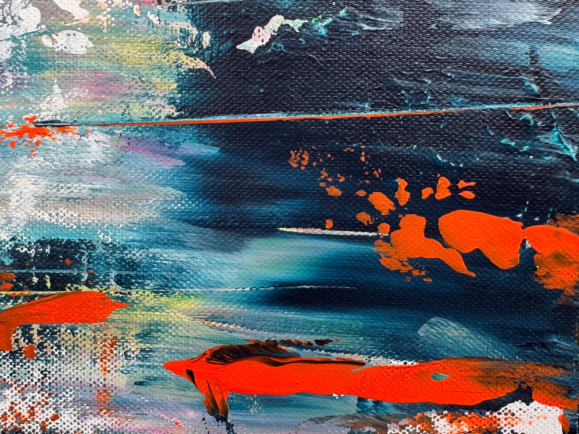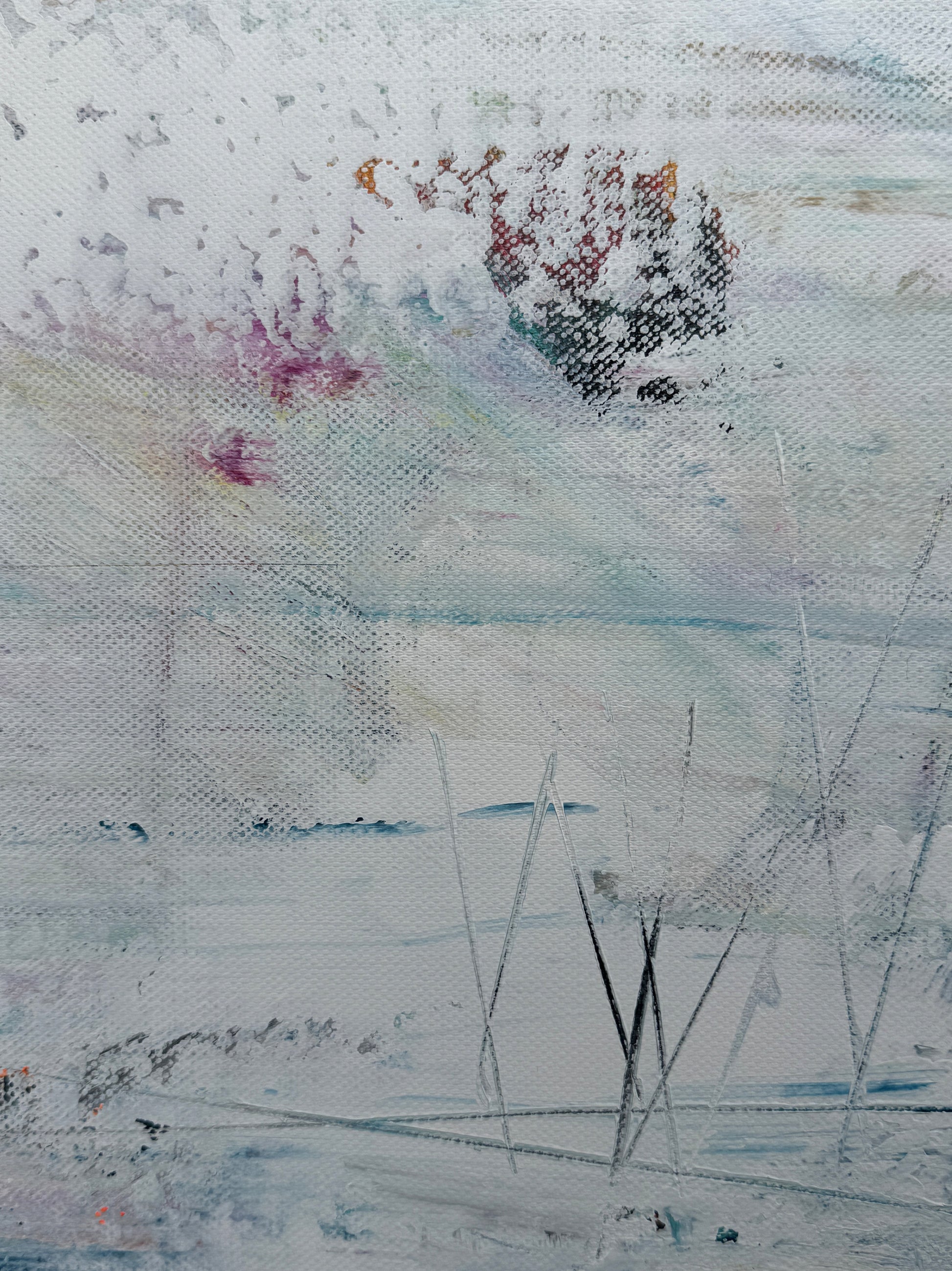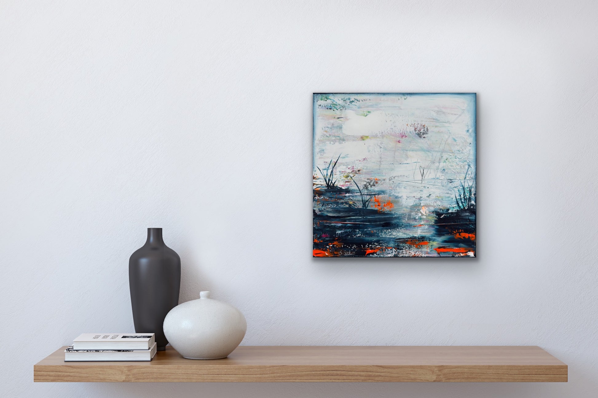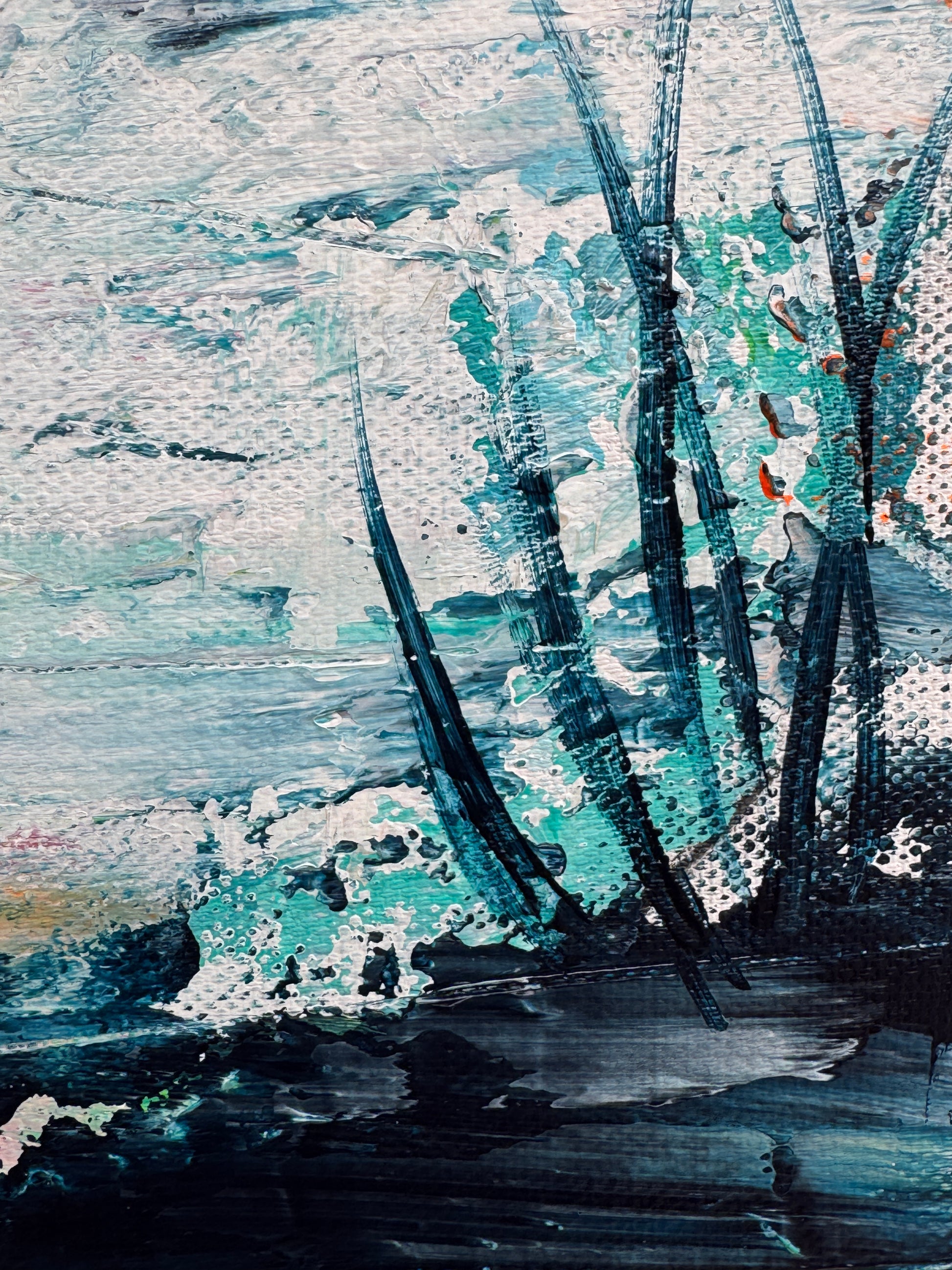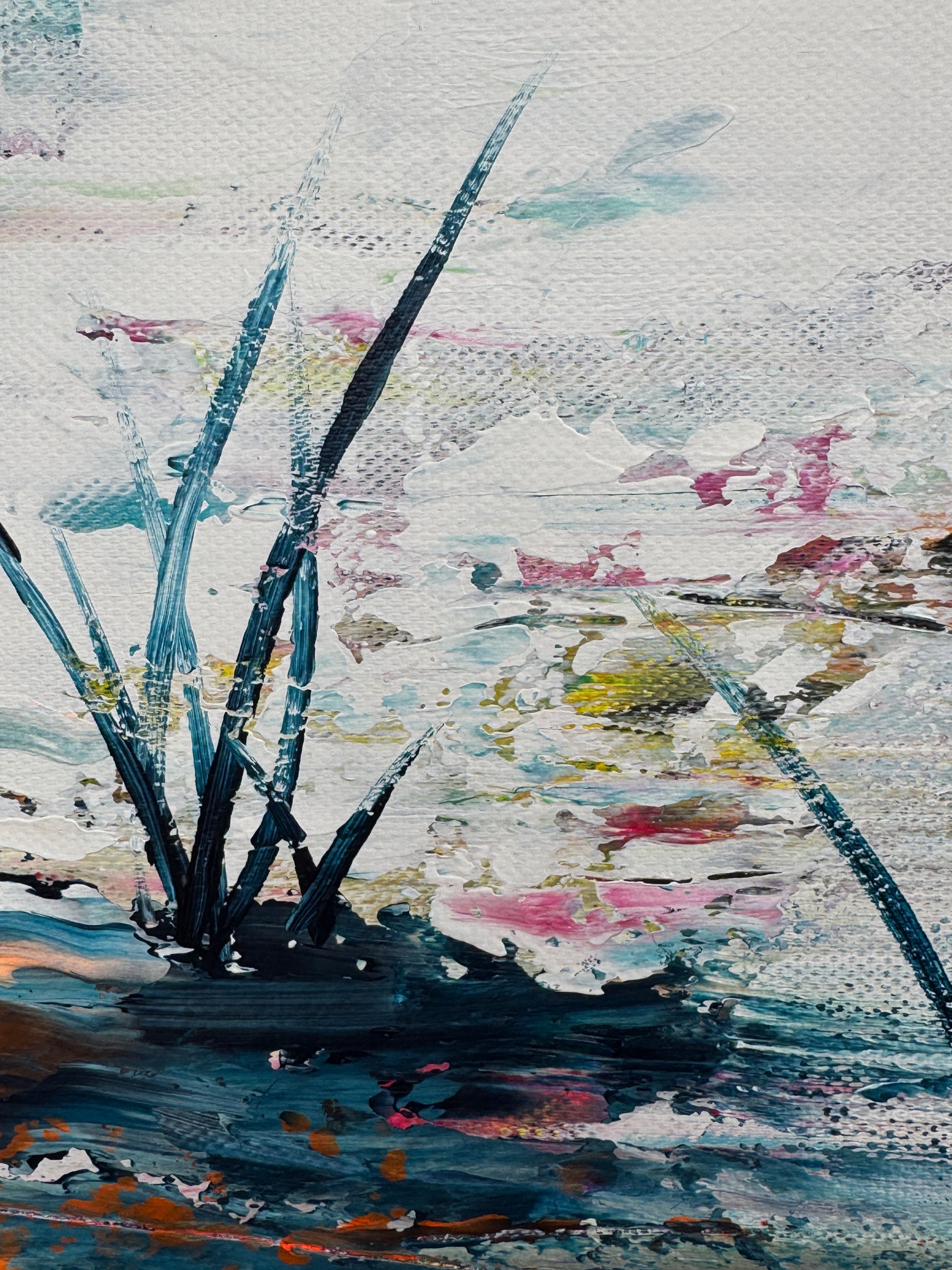Using acrylic paints, I have created an abstract winter landscape by a lake, capturing both tranquility and coldness. The cool blues and delicate whites reflect the still water and frosty sky, while the darker shades and orange accents suggest energy and life beneath the surface. The fog lingers stubbornly. This work brings a peaceful yet dynamic atmosphere to any room.