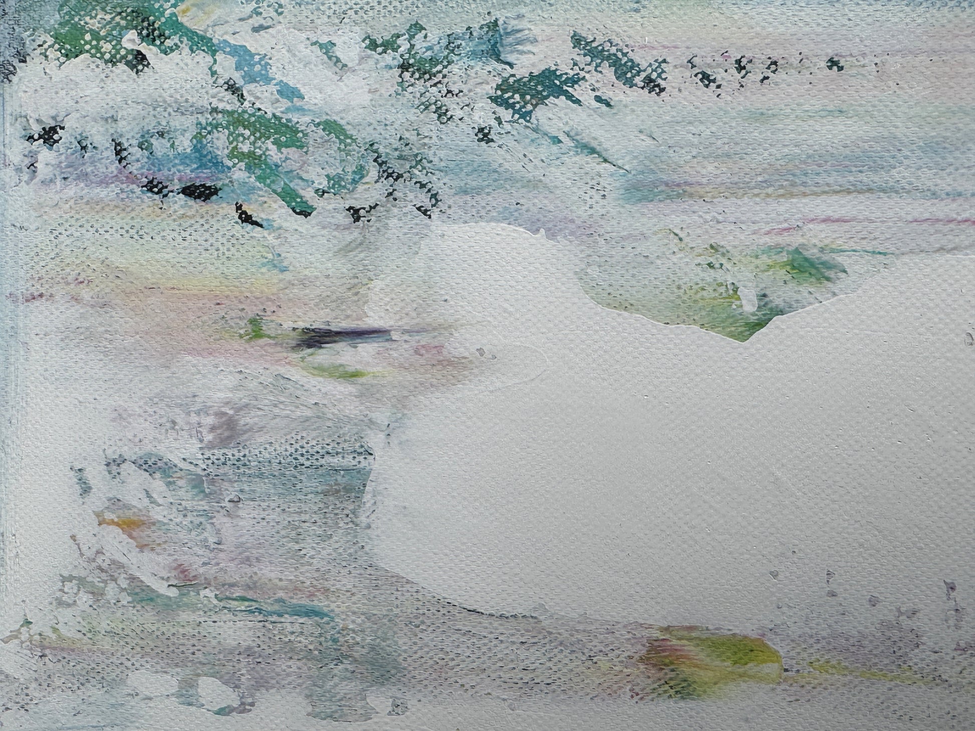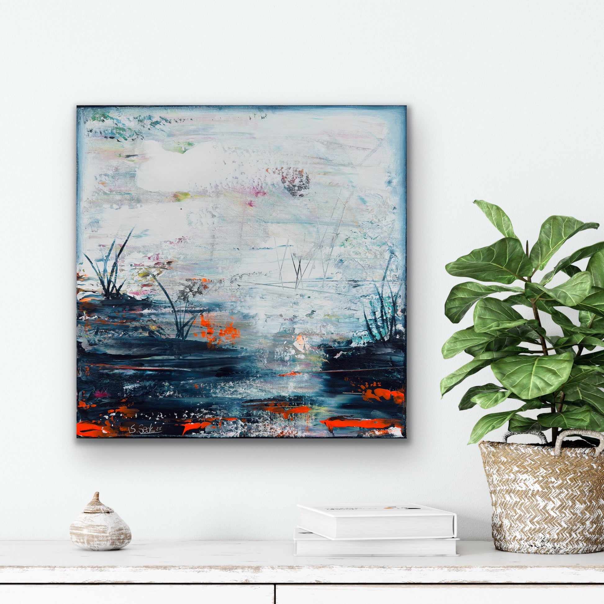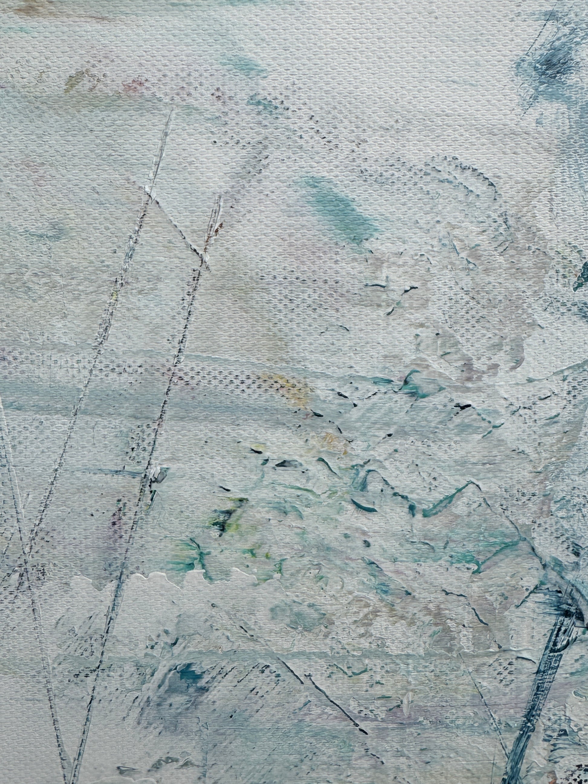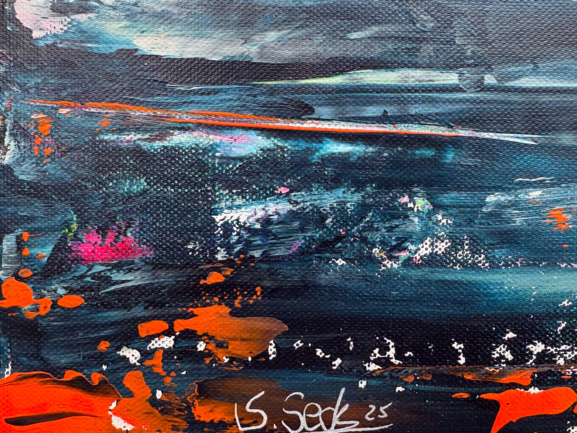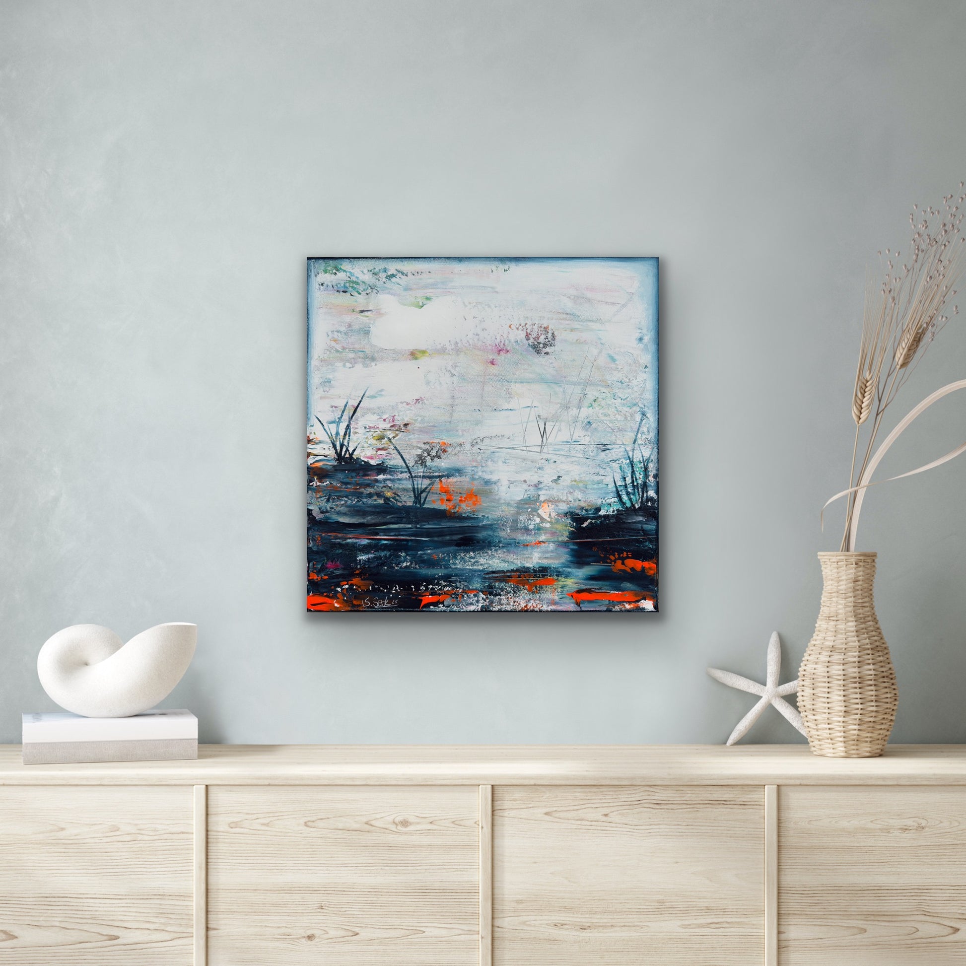 Using acrylic paints, I have created an abstract winter landscape by a lake, capturing both tranquility and coldness. The cool blues and delicate whites reflect the still water and frosty sky, while the darker shades and orange accents suggest energy and life beneath the surface. The fog lingers stubbornly. This work brings a peaceful yet dynamic atmosphere to any room.