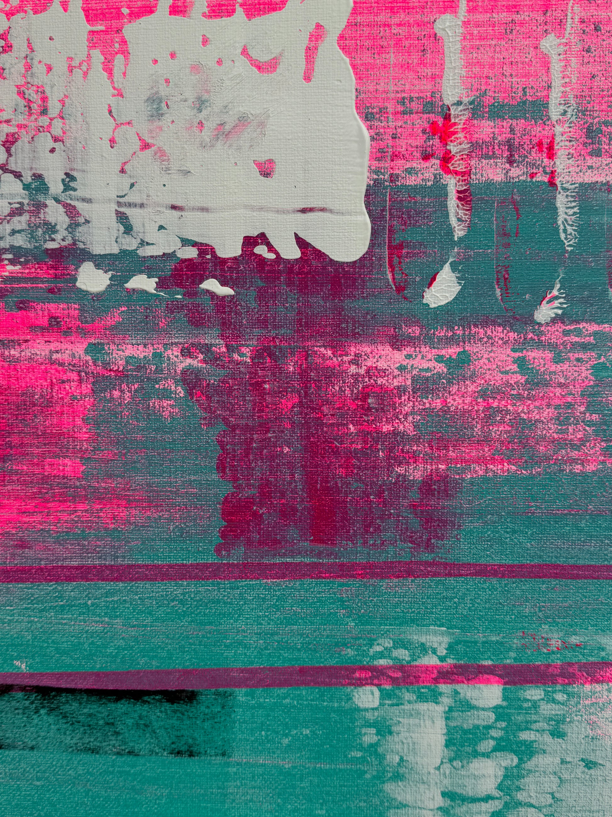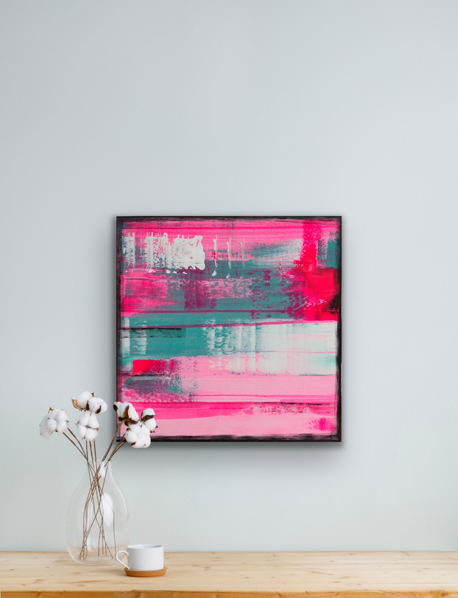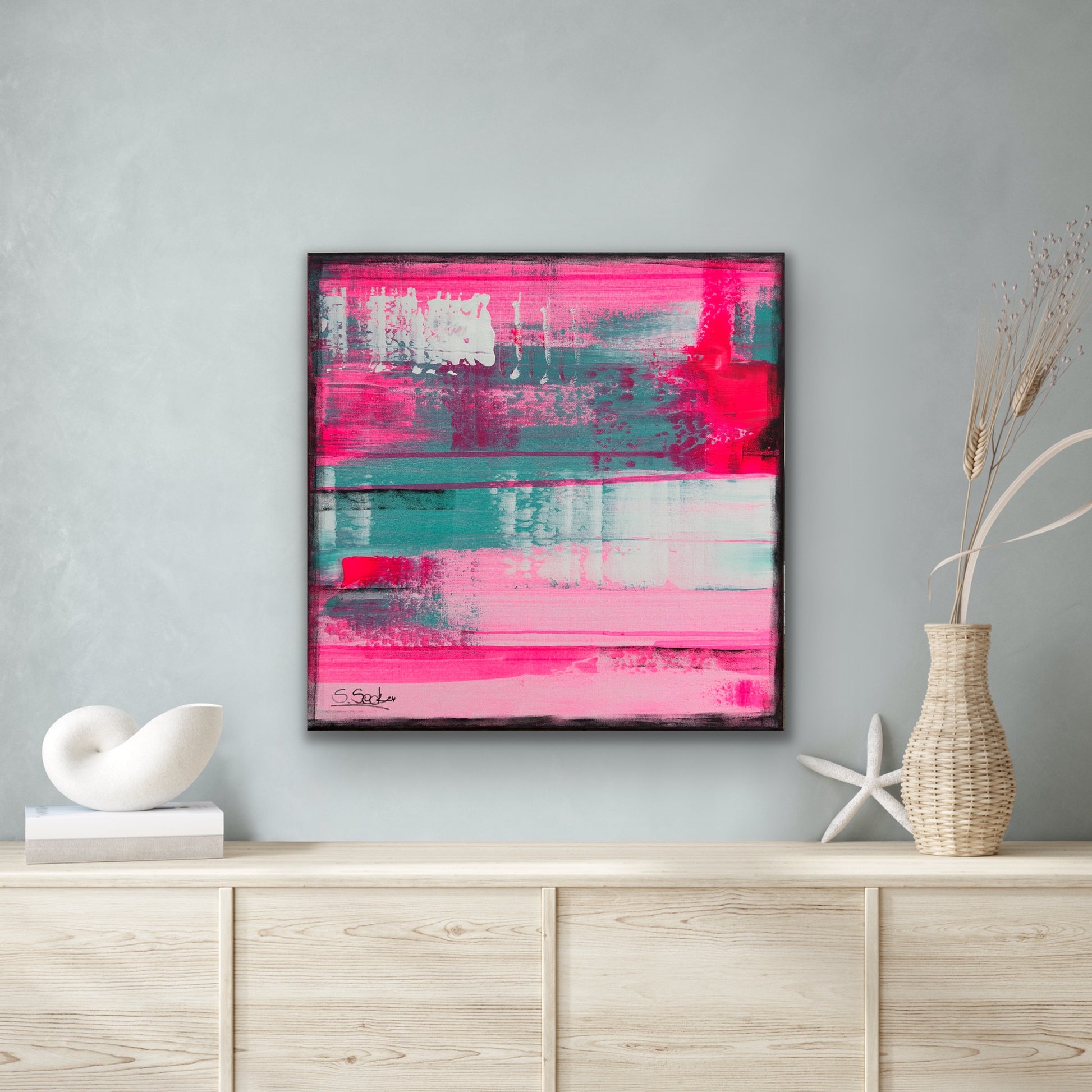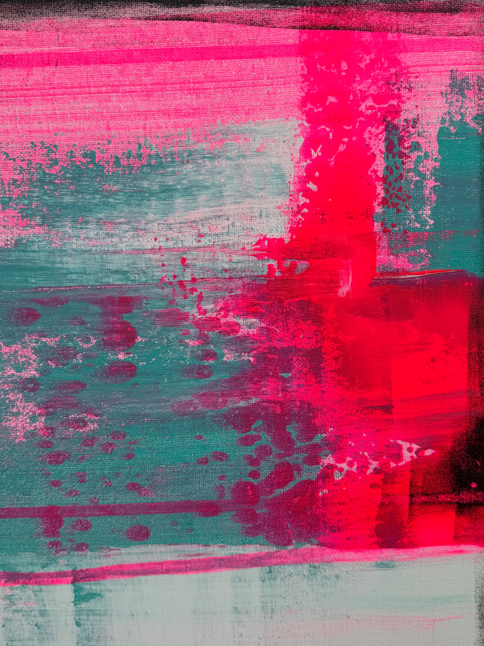 In my work, I have passionately experimented with acrylic paints to express deep emotions and a zest for life. The layers of vibrant magentas and soft turquoises symbolize the dynamic interplay between energy and tranquility. This painting brings an atmosphere of inspiration and joy to any room and invites you to embrace the beauty of the moment.