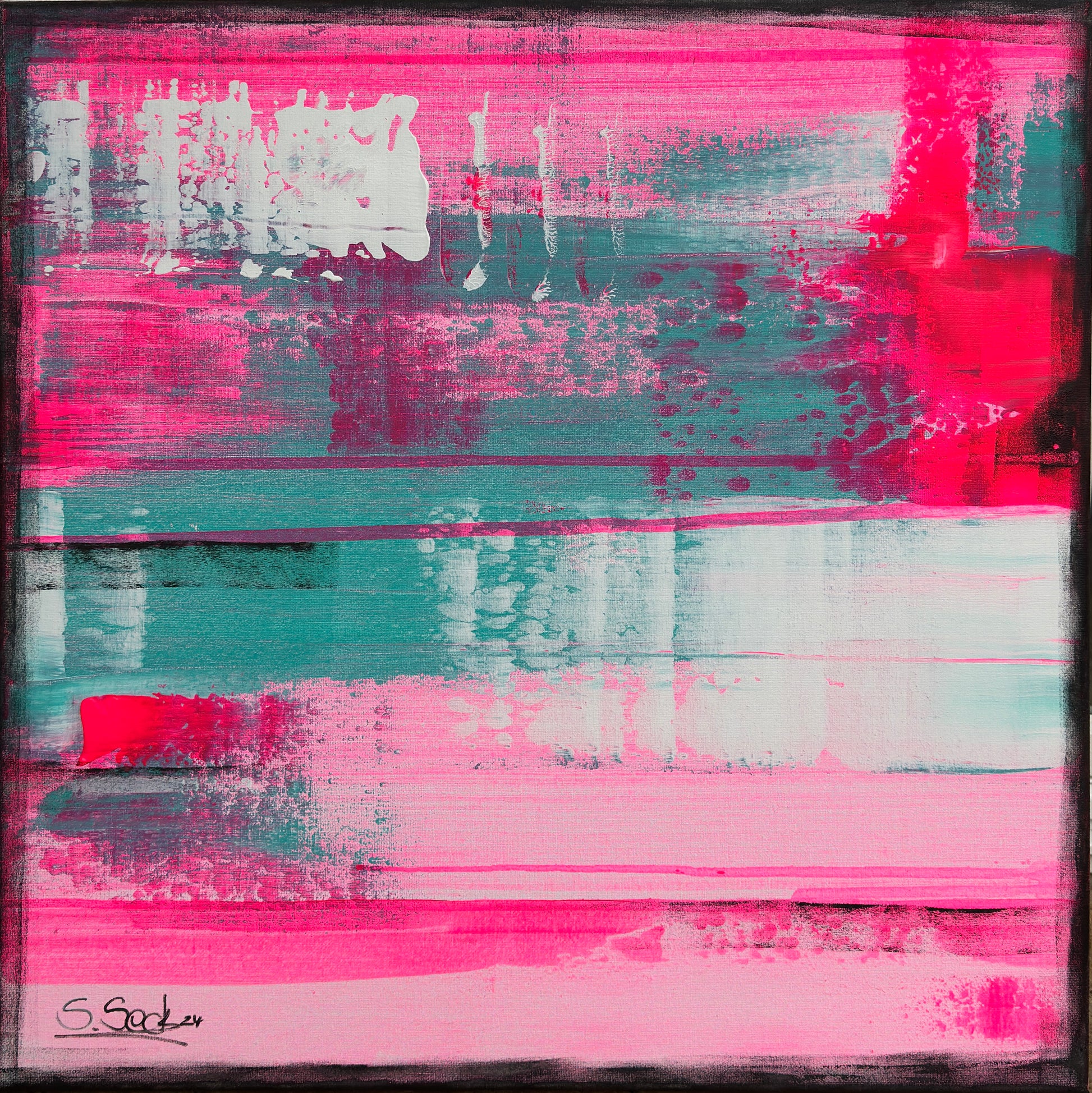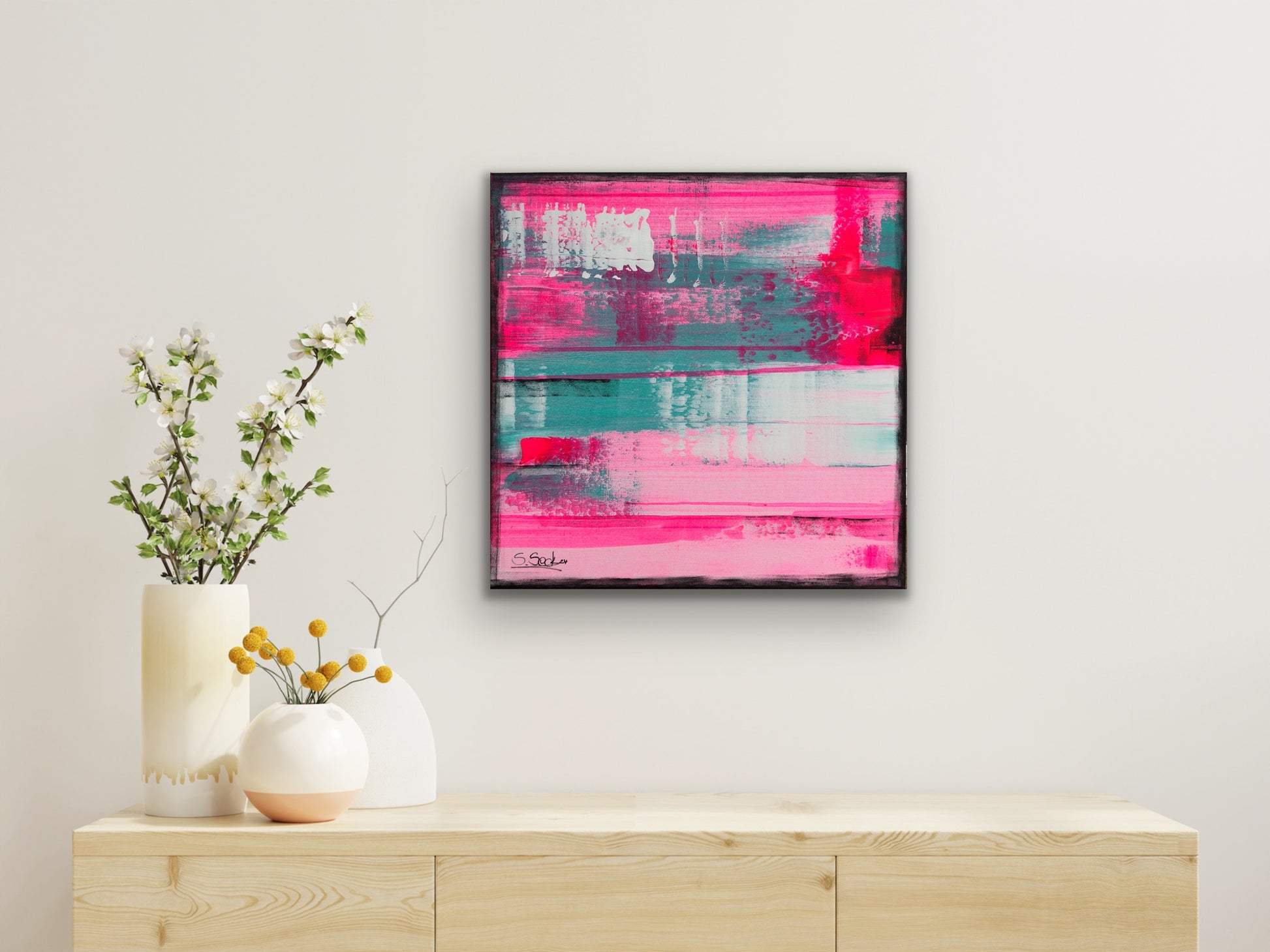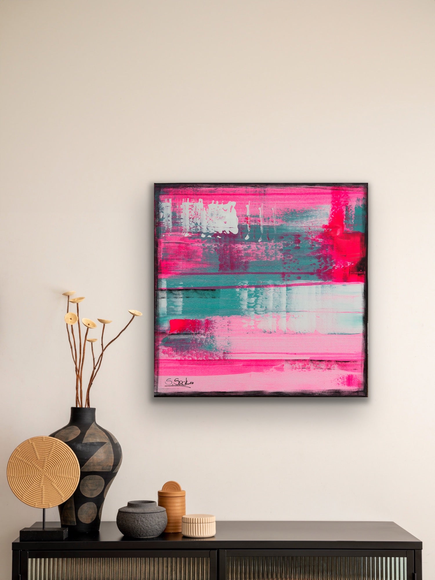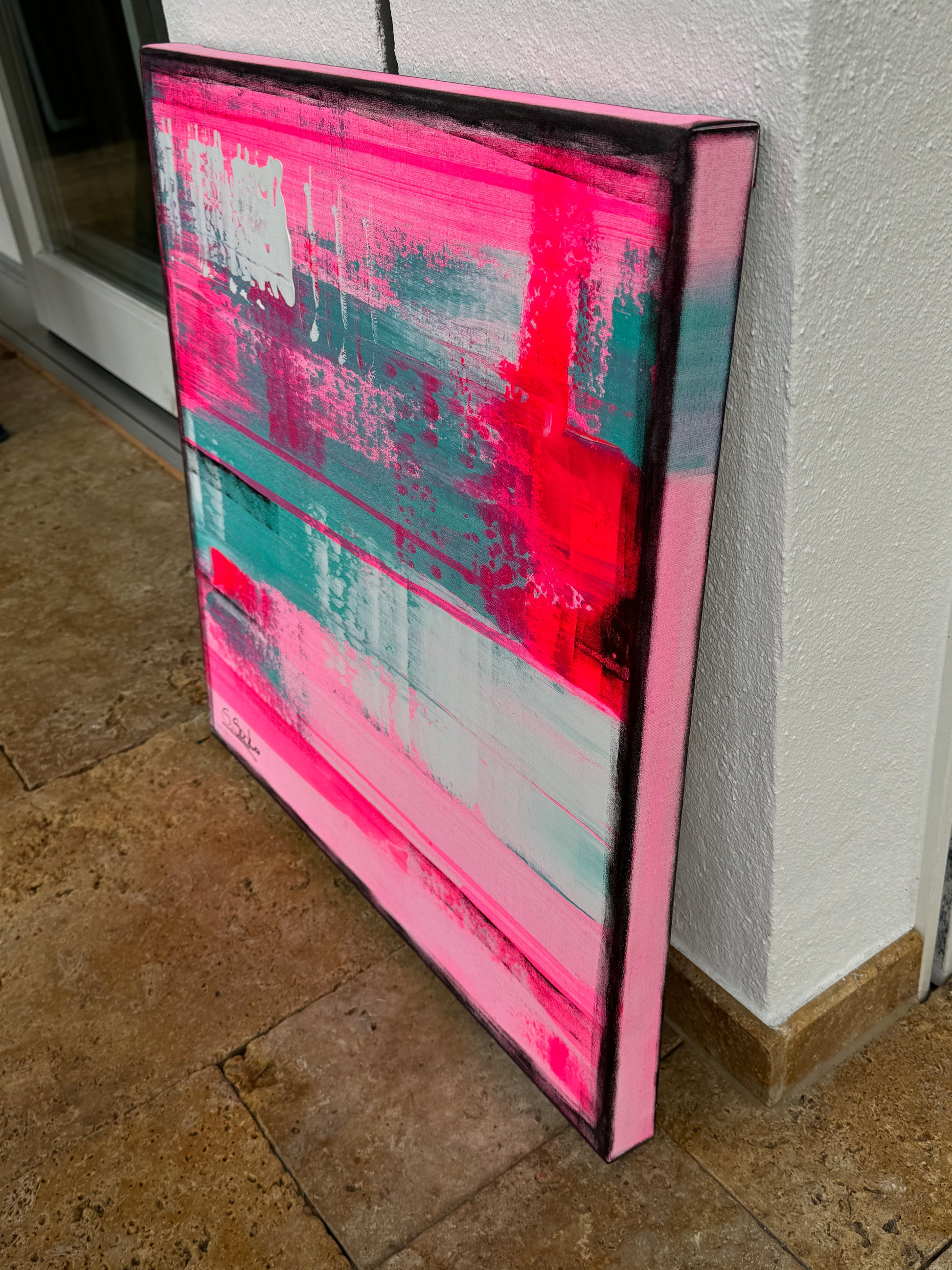 In my work, I have passionately experimented with acrylic paints to express deep emotions and a zest for life. The layers of vibrant magentas and soft turquoises symbolize the dynamic interplay between energy and tranquility. This painting brings an atmosphere of inspiration and joy to any room and invites you to embrace the beauty of the moment.