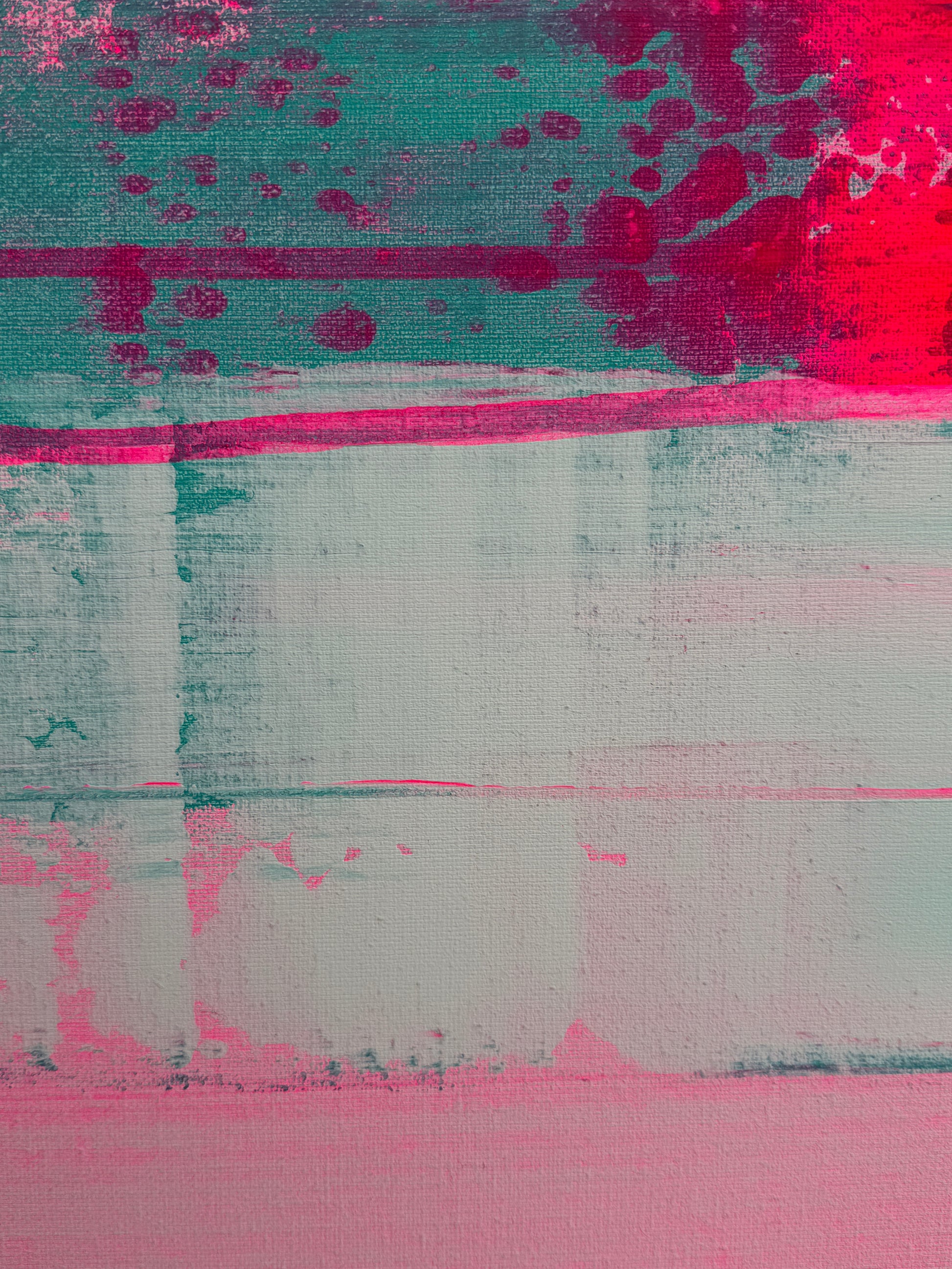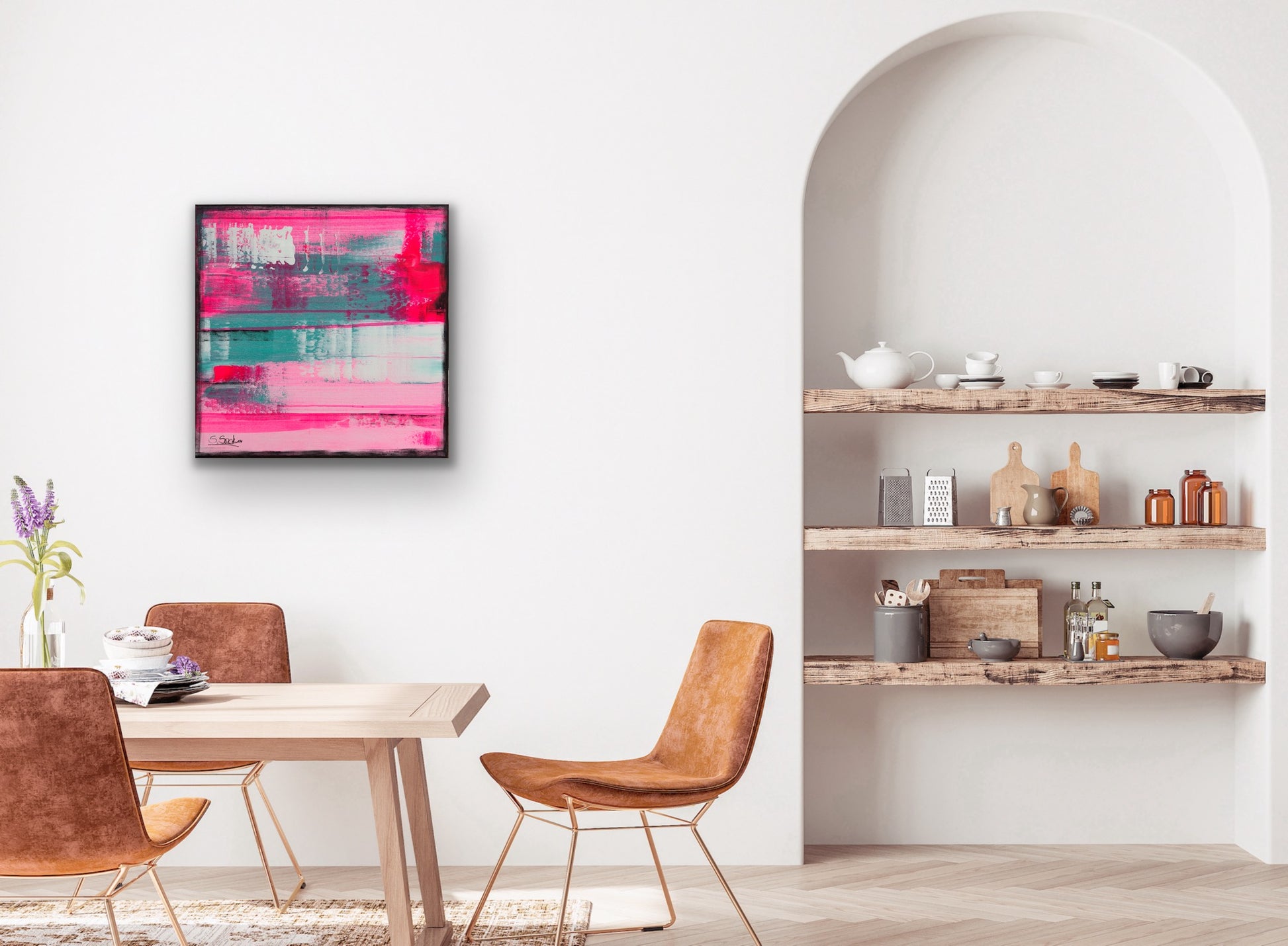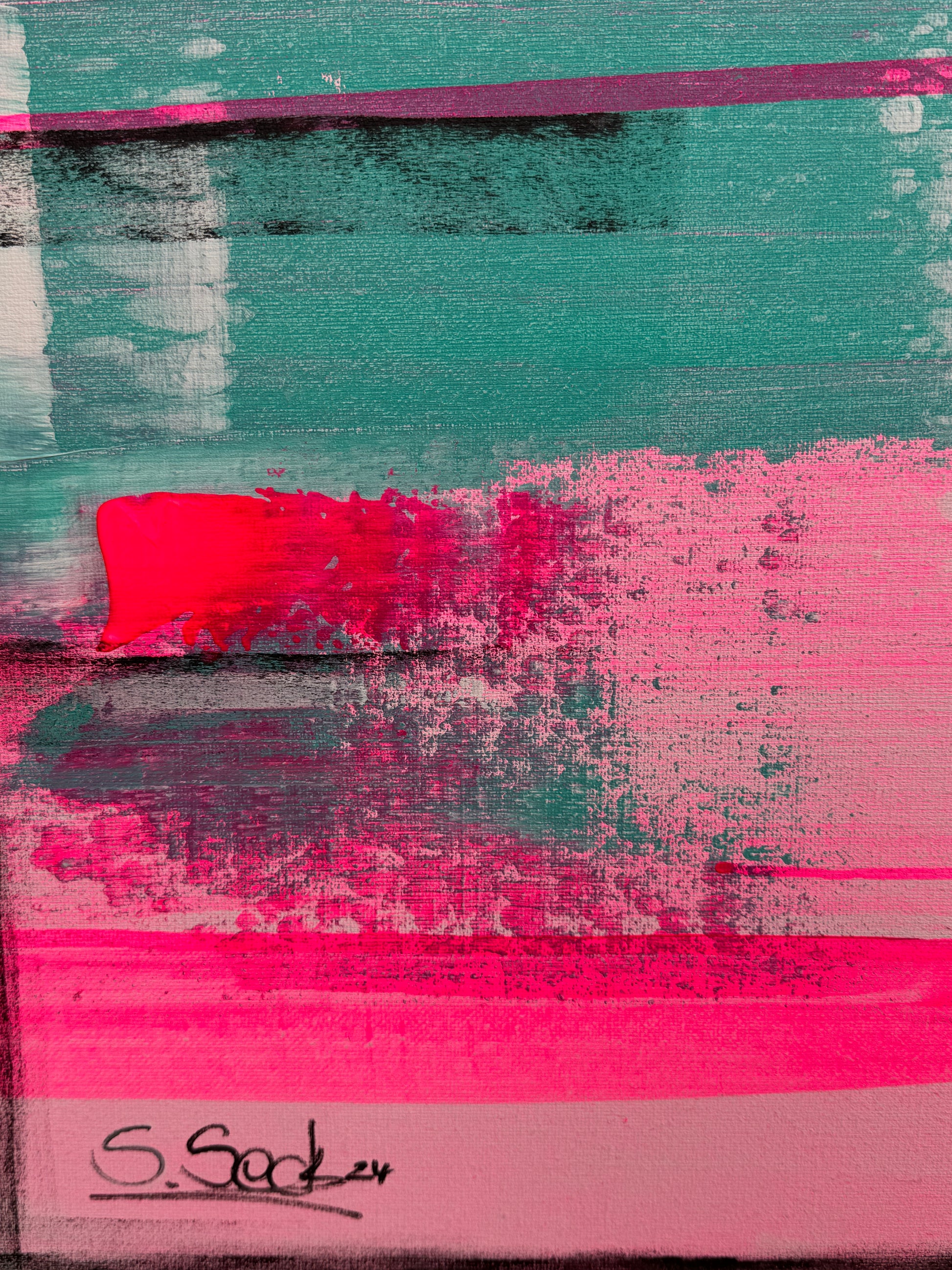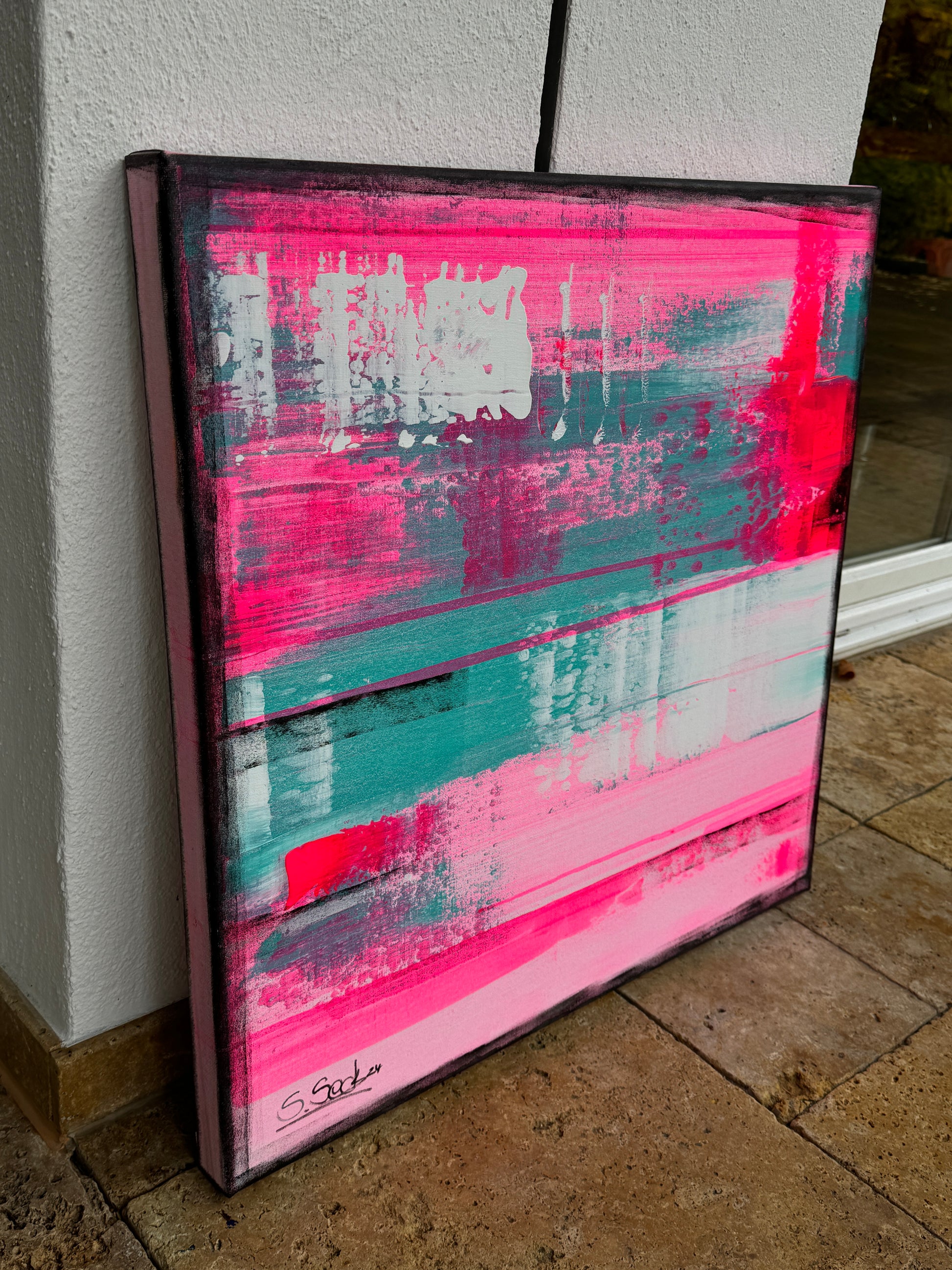 In my work, I have passionately experimented with acrylic paints to express deep emotions and a zest for life. The layers of vibrant magentas and soft turquoises symbolize the dynamic interplay between energy and tranquility. This painting brings an atmosphere of inspiration and joy to any room and invites you to embrace the beauty of the moment.