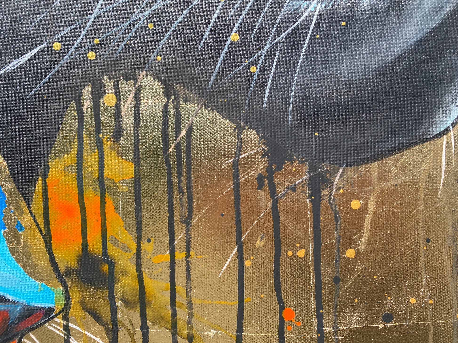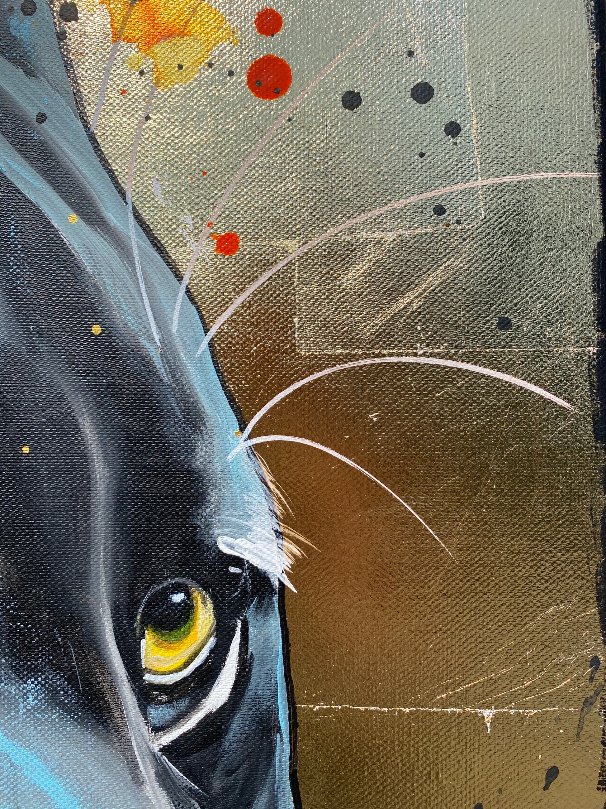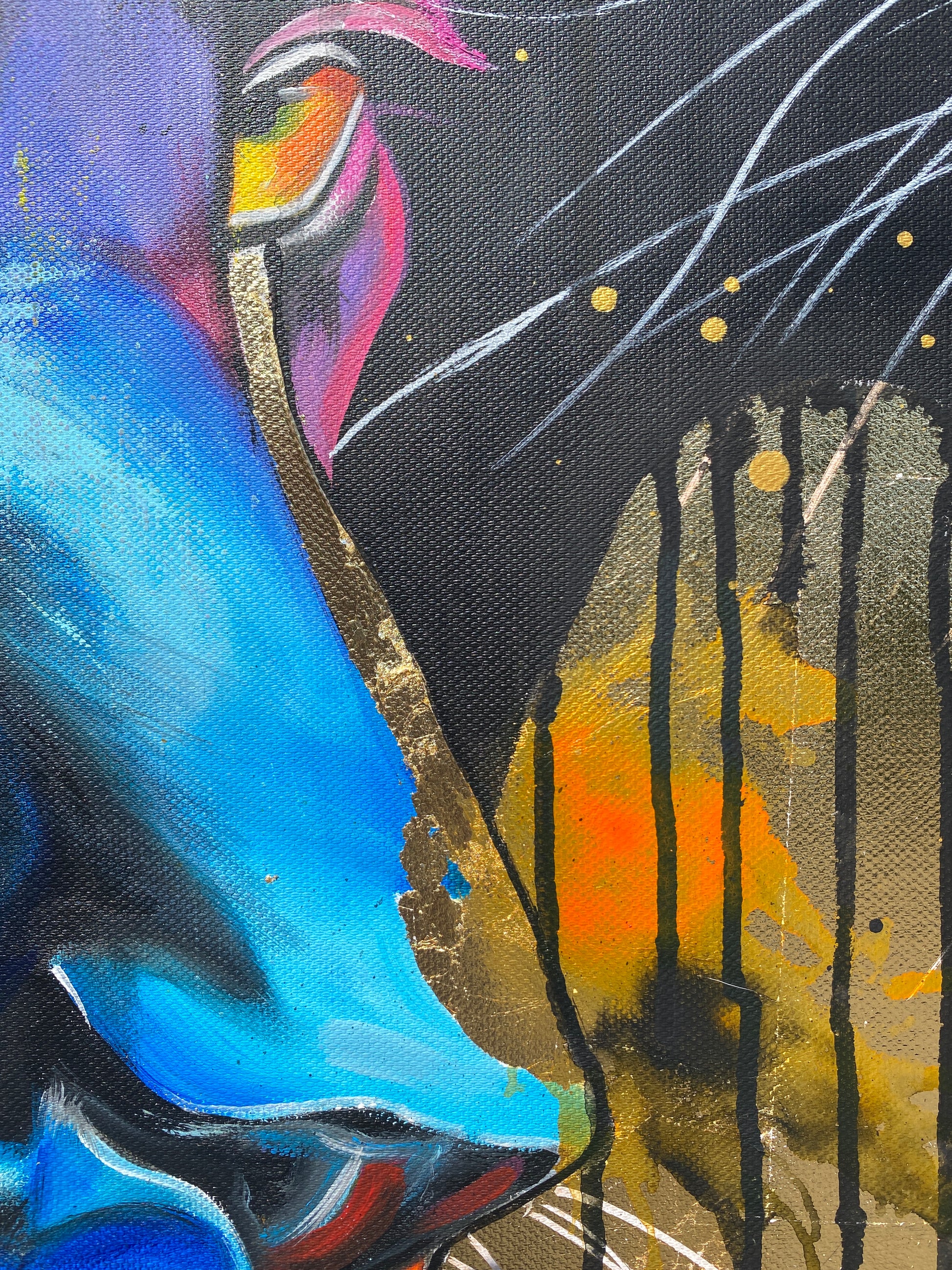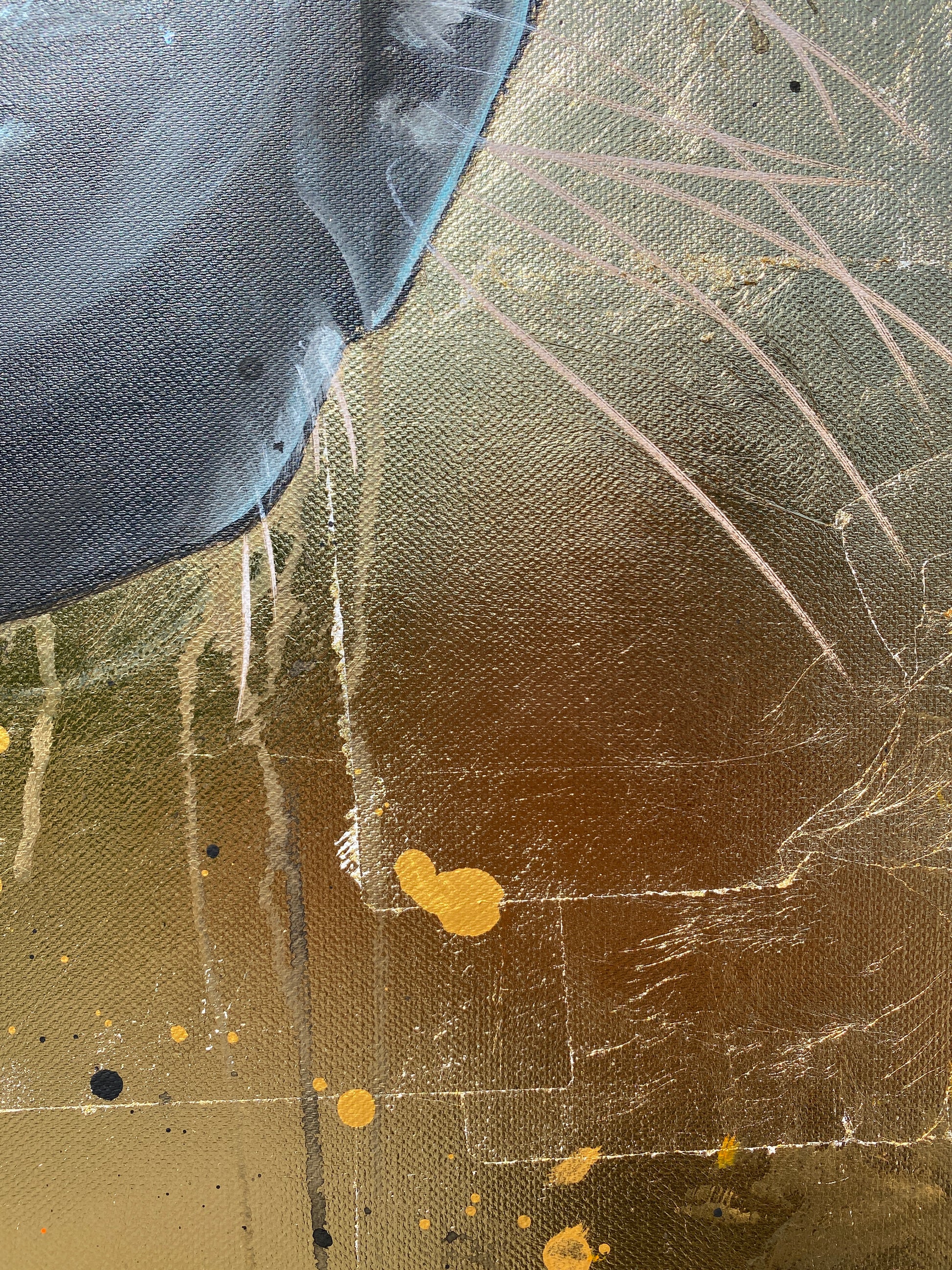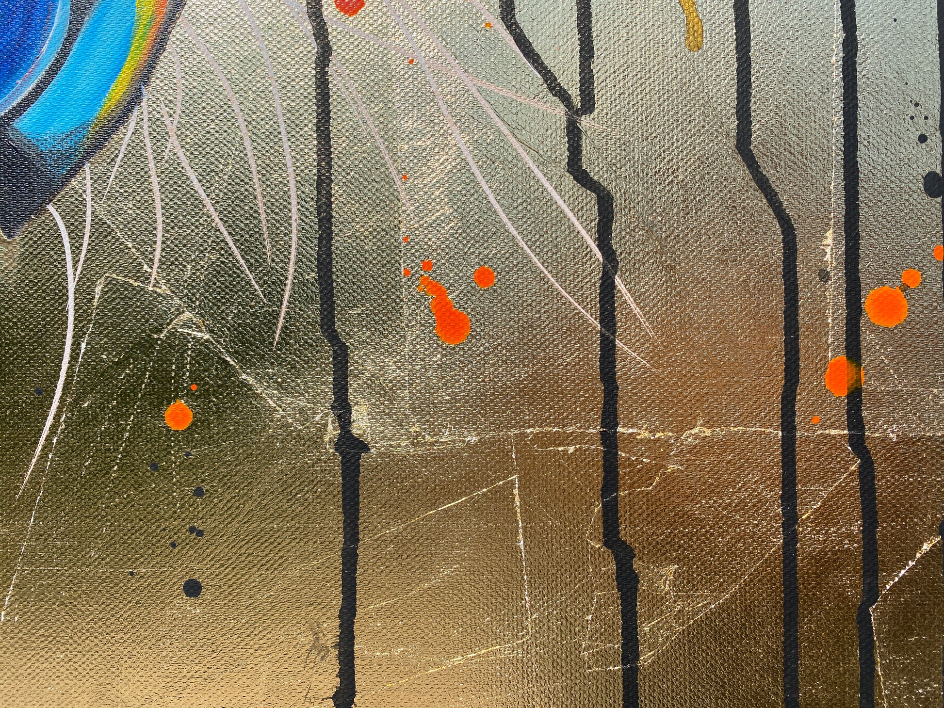 Das Werk wurde von der Künstlerin mit Acryl auf Leinwand gemalt. Der Hintergrund wurde mit Golden Leaf Metal veredelt. Das Werk wurde dann lackiert, um die Farben zu schützen.