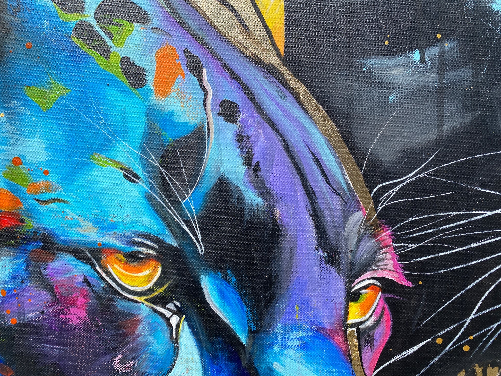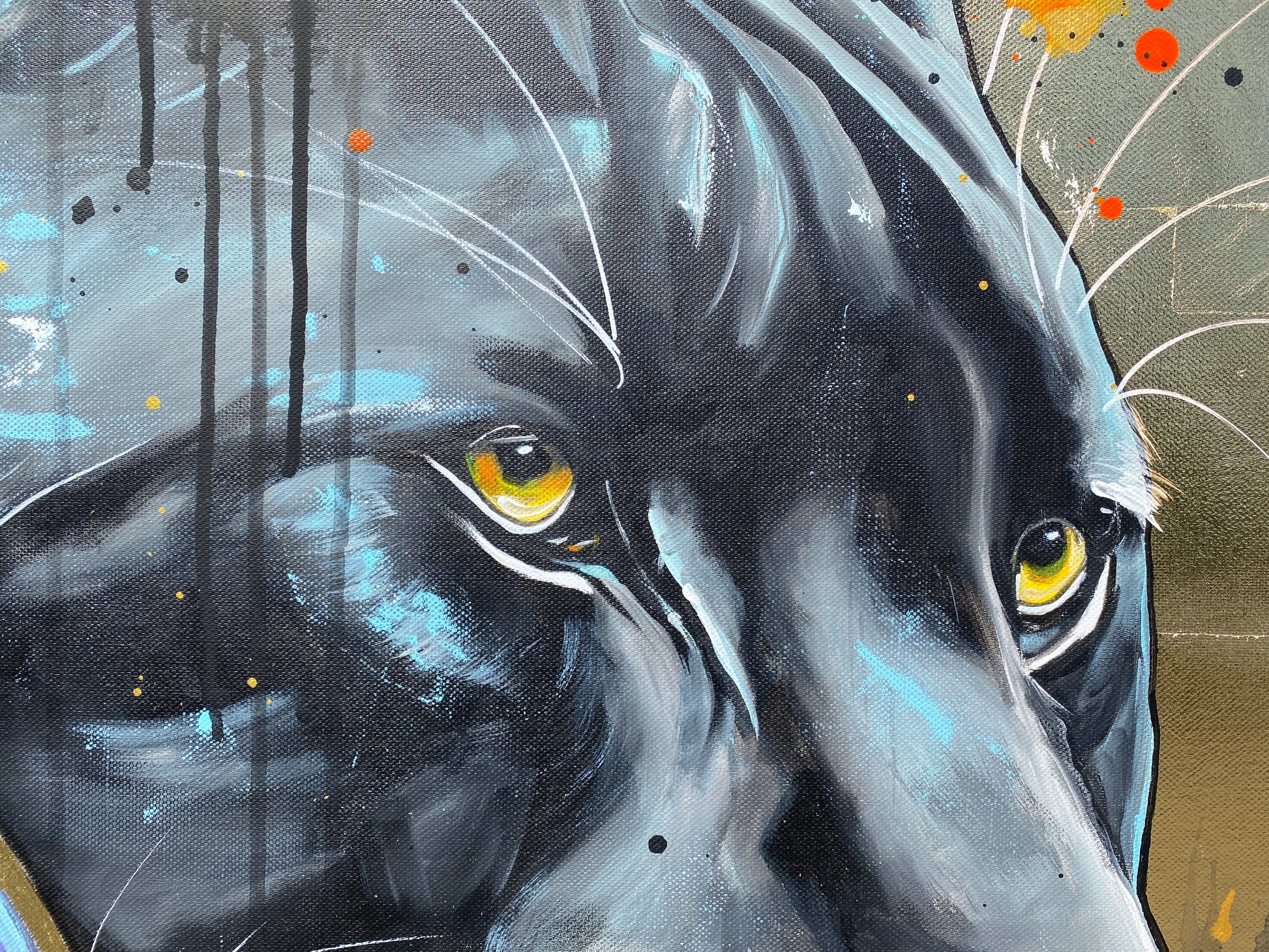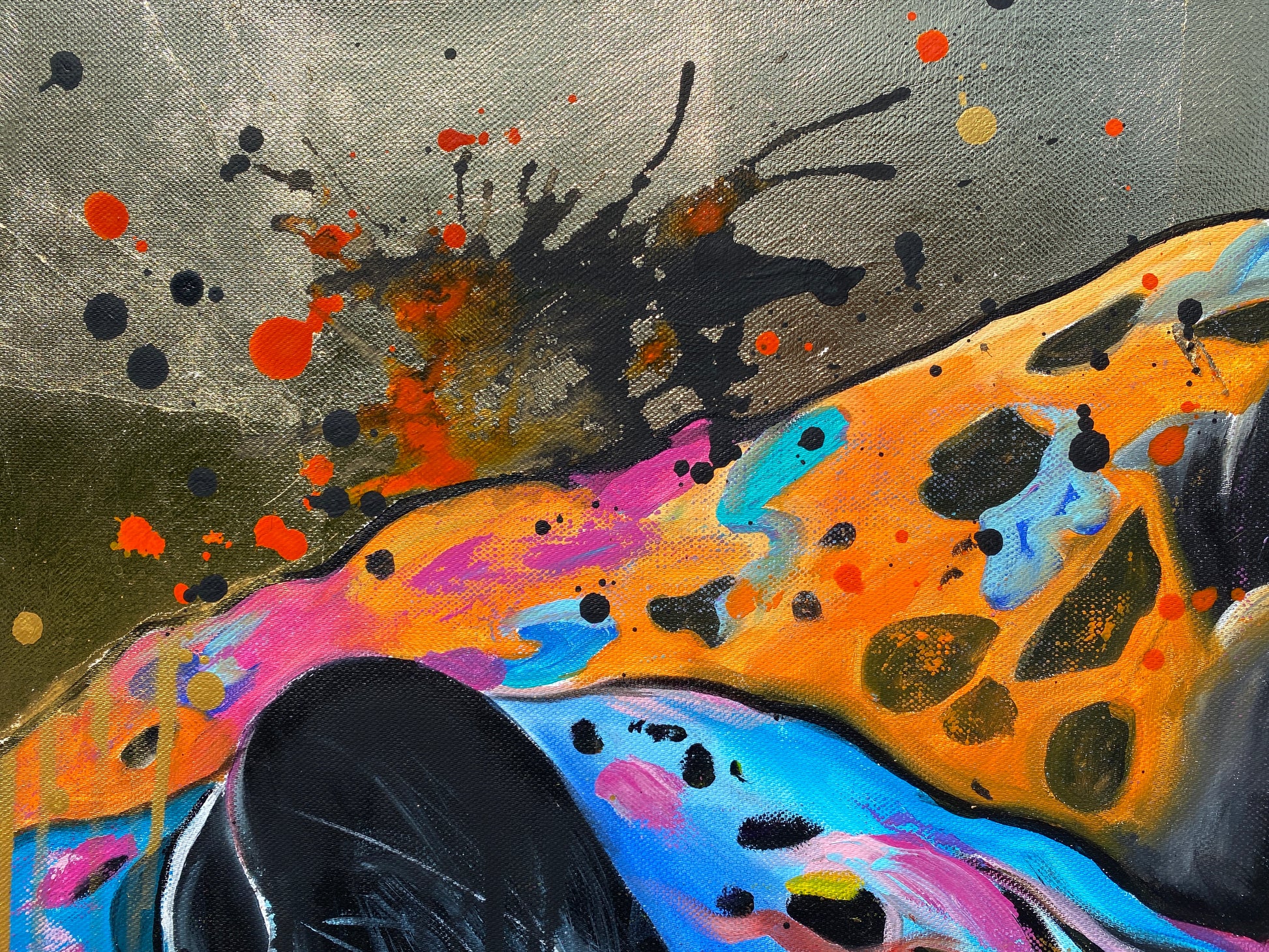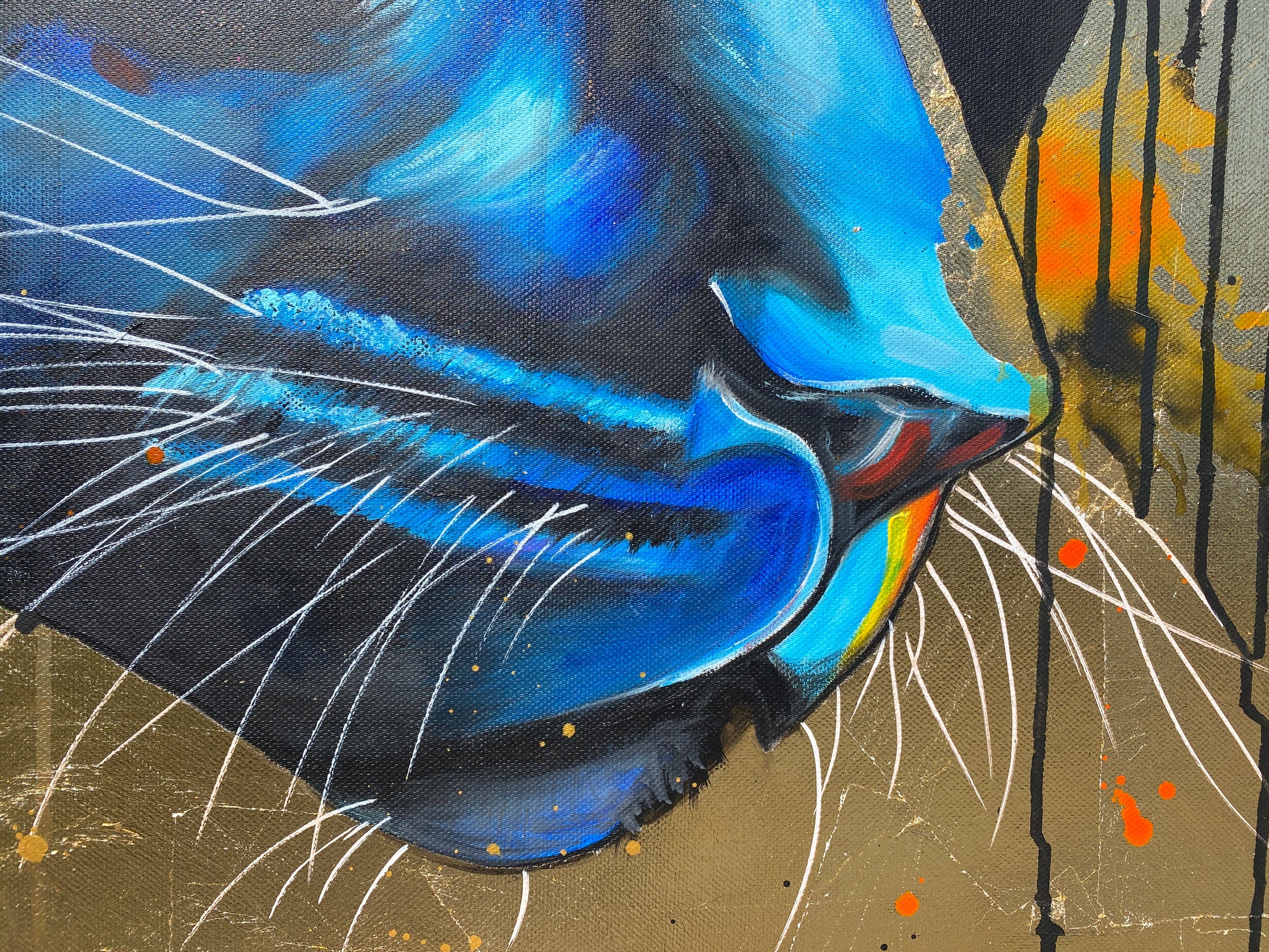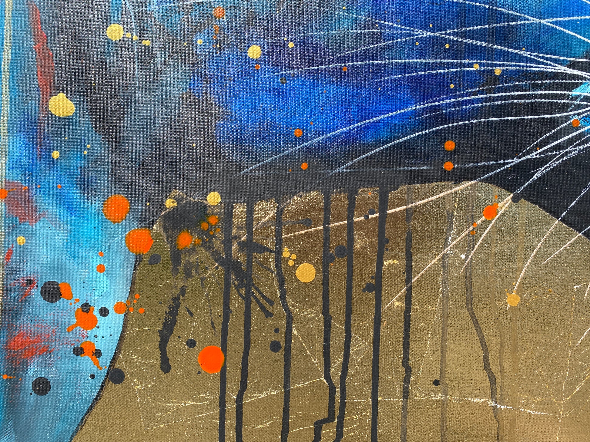 Das Werk wurde von der Künstlerin mit Acryl auf Leinwand gemalt. Der Hintergrund wurde mit Golden Leaf Metal veredelt. Das Werk wurde dann lackiert, um die Farben zu schützen.