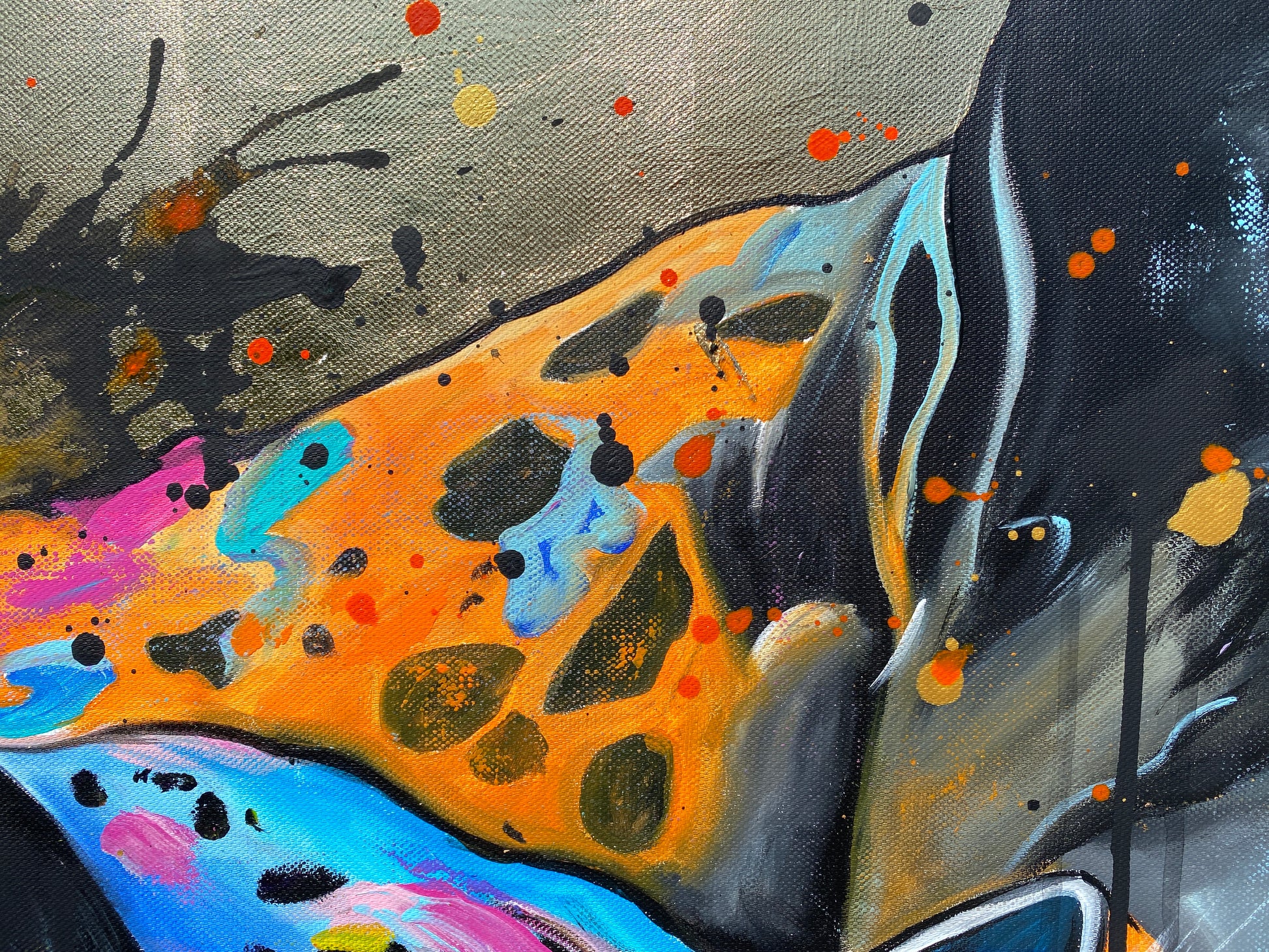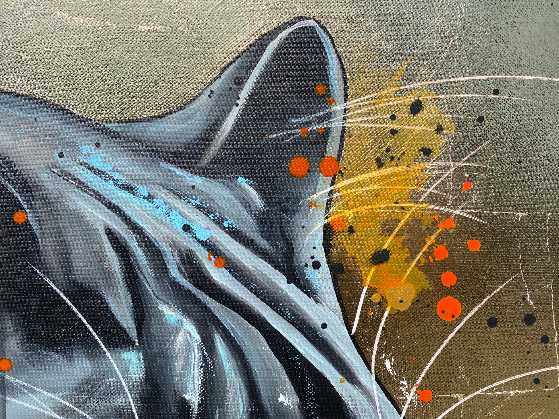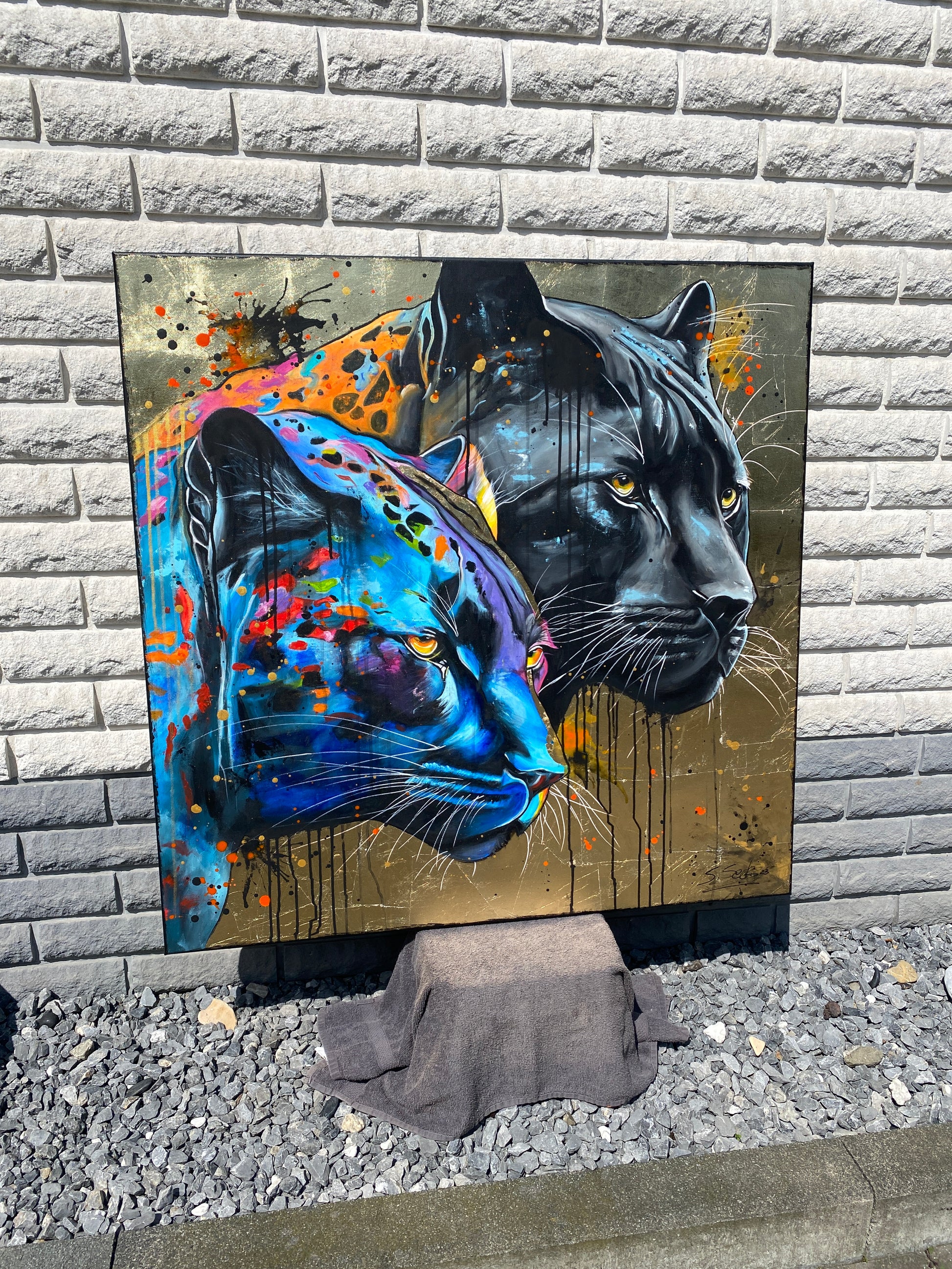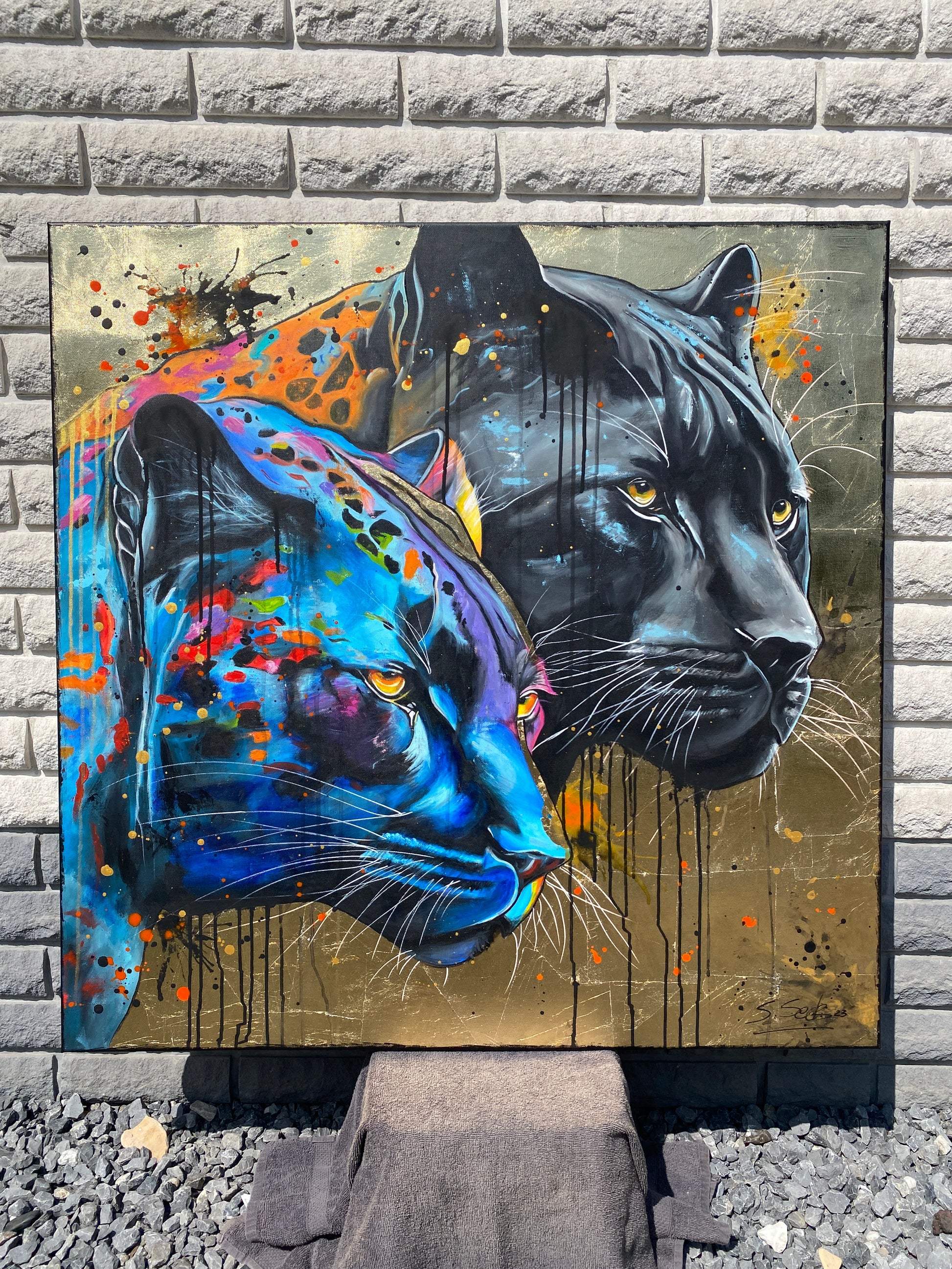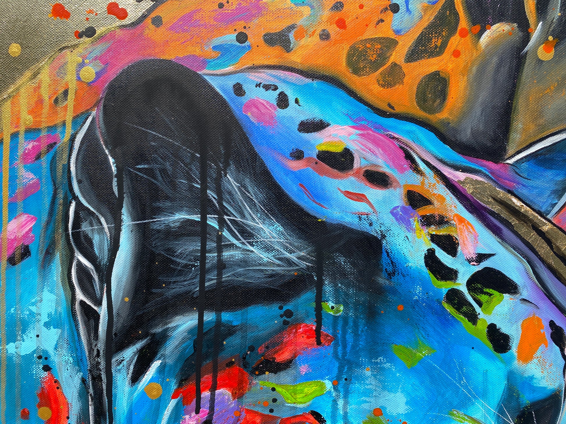 Das Werk wurde von der Künstlerin mit Acryl auf Leinwand gemalt. Der Hintergrund wurde mit Golden Leaf Metal veredelt. Das Werk wurde dann lackiert, um die Farben zu schützen.