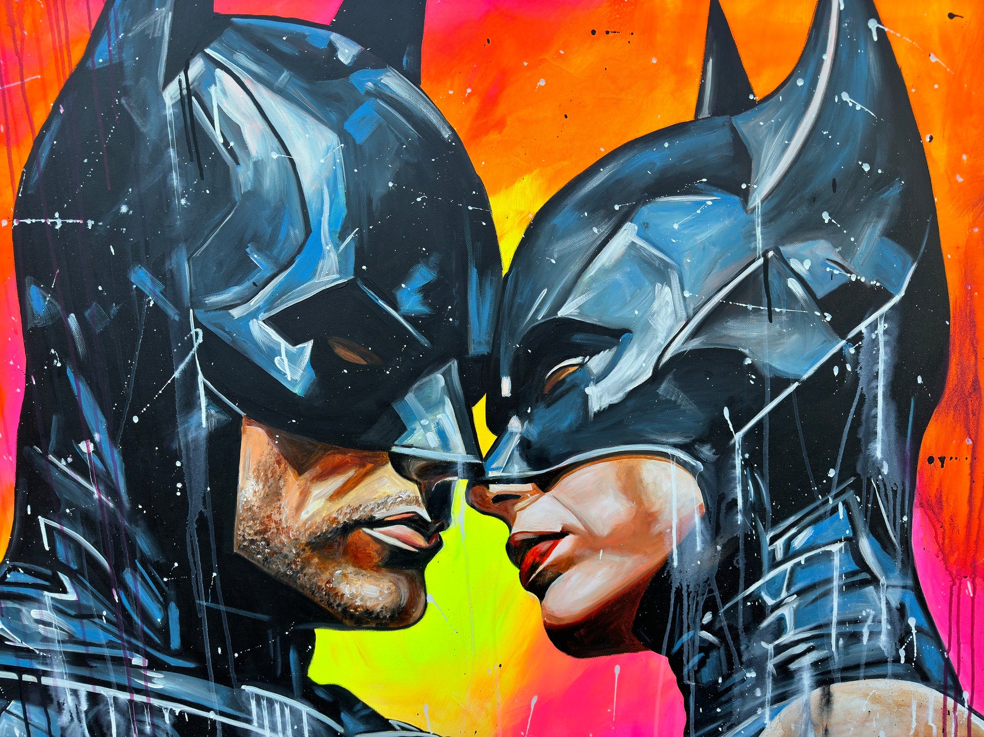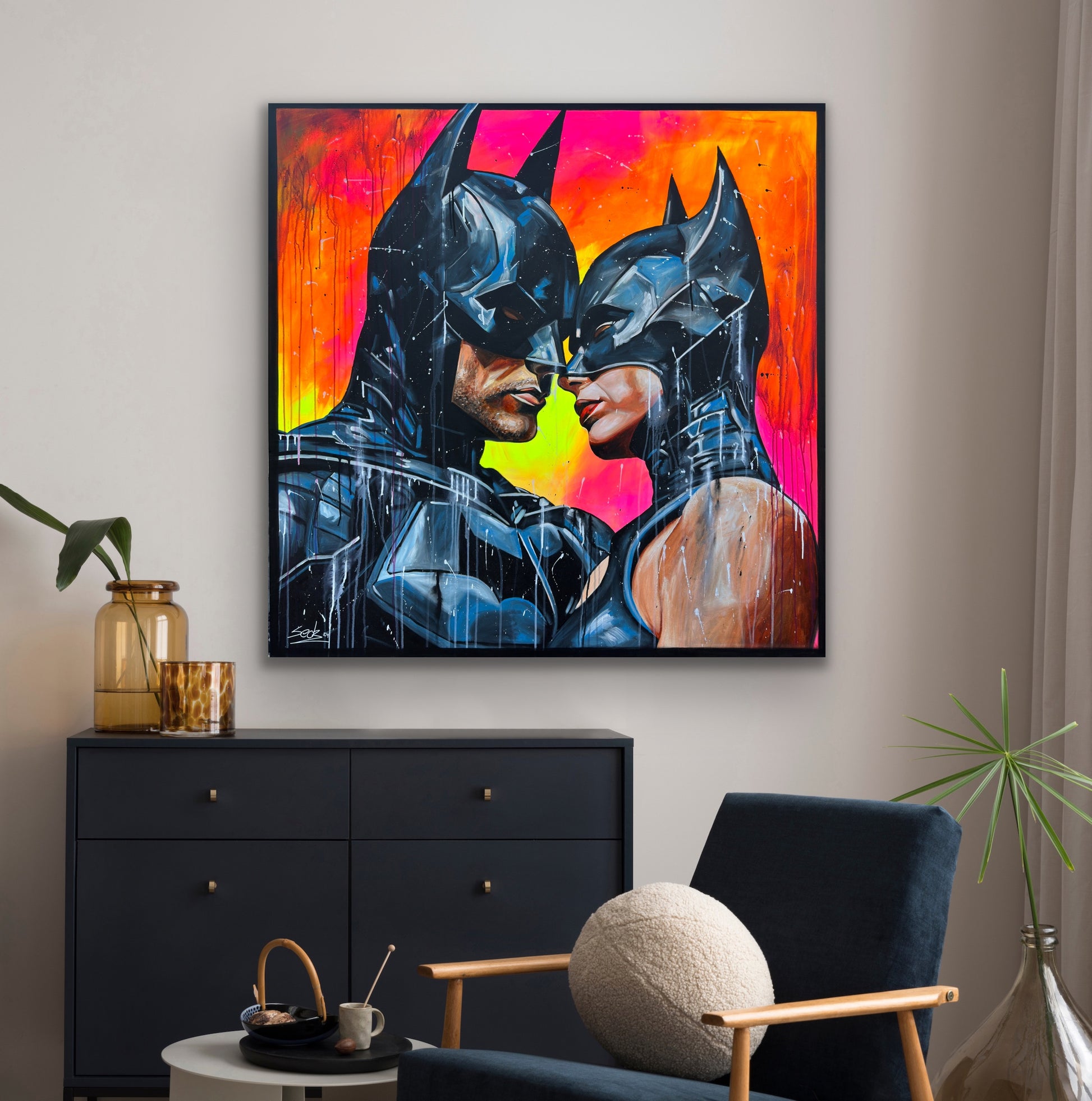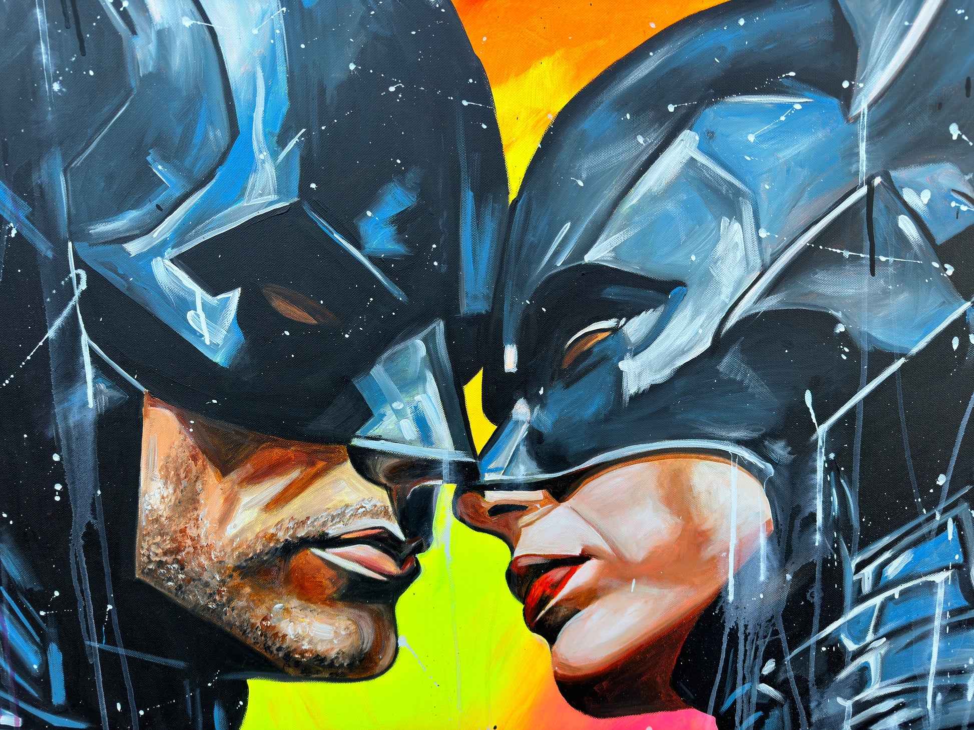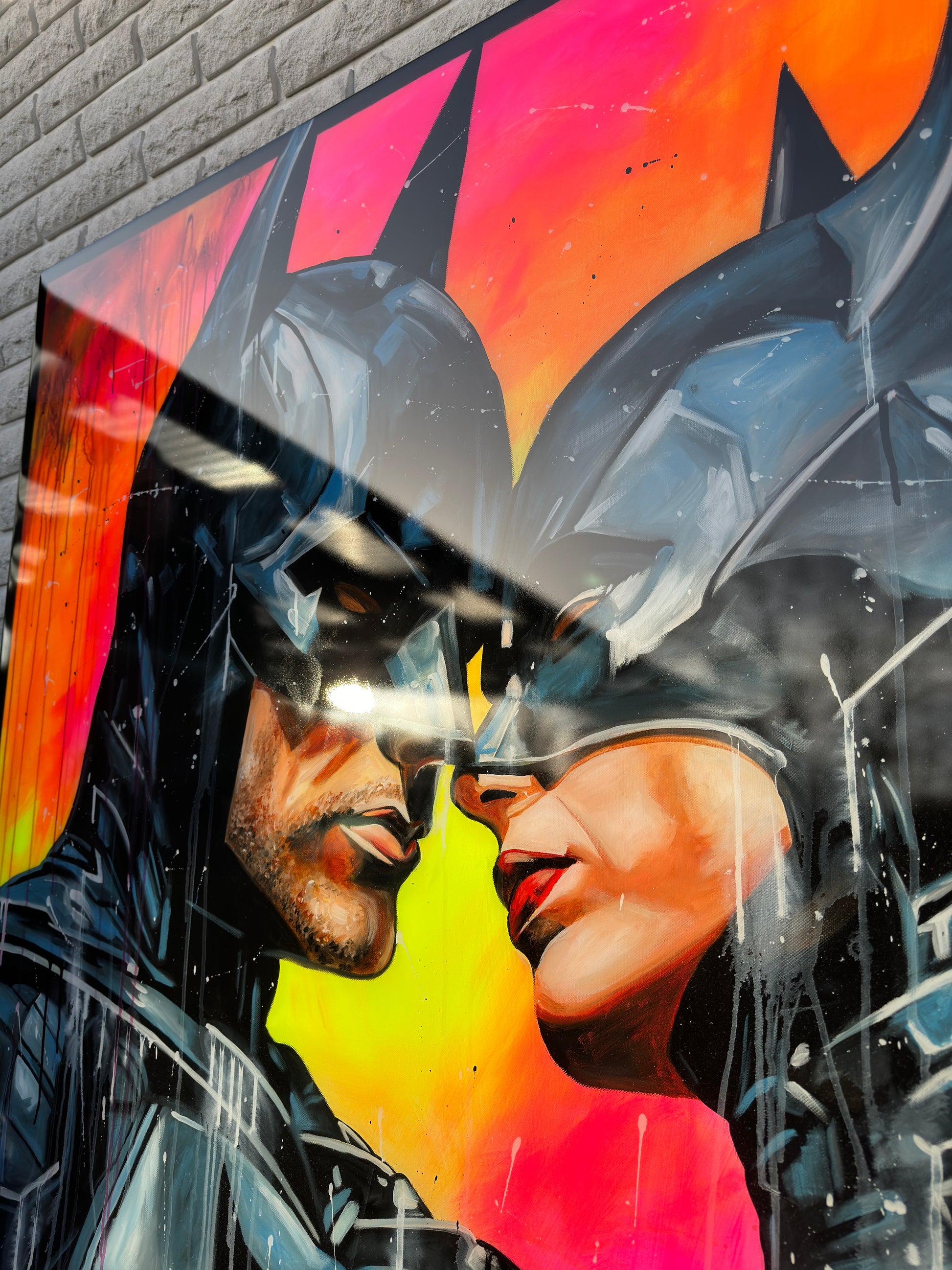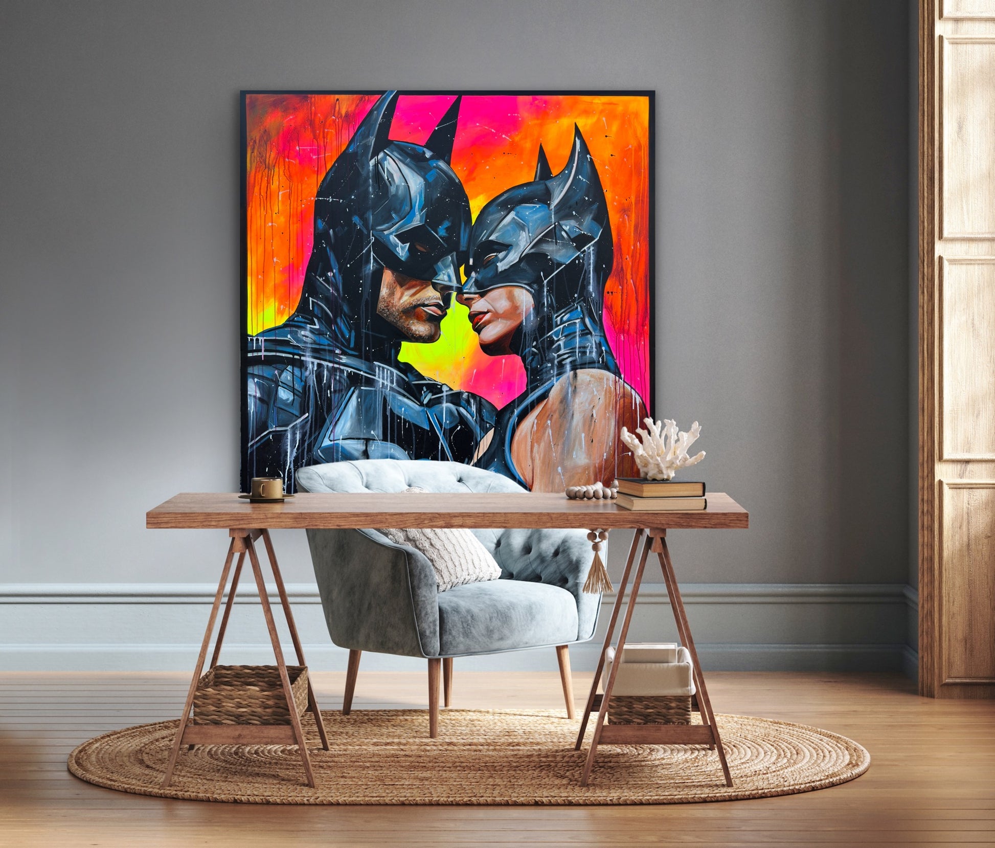 Inspiriert von Comics und Popkultur, fängt dieses Gemälde intensiv die Emotionen einer romantischen Dynamik ein, denn die beiden können sich der gegenseitigen Anziehungskraft nicht entziehen. Die Figuren stehen für Leidenschaft und Stärke, eingebunden in die Realität mit einem Hauch von Realismus. Mein Werk strahlt Energie aus und bringt lebendige Farben und Liebe ins Zuhause.