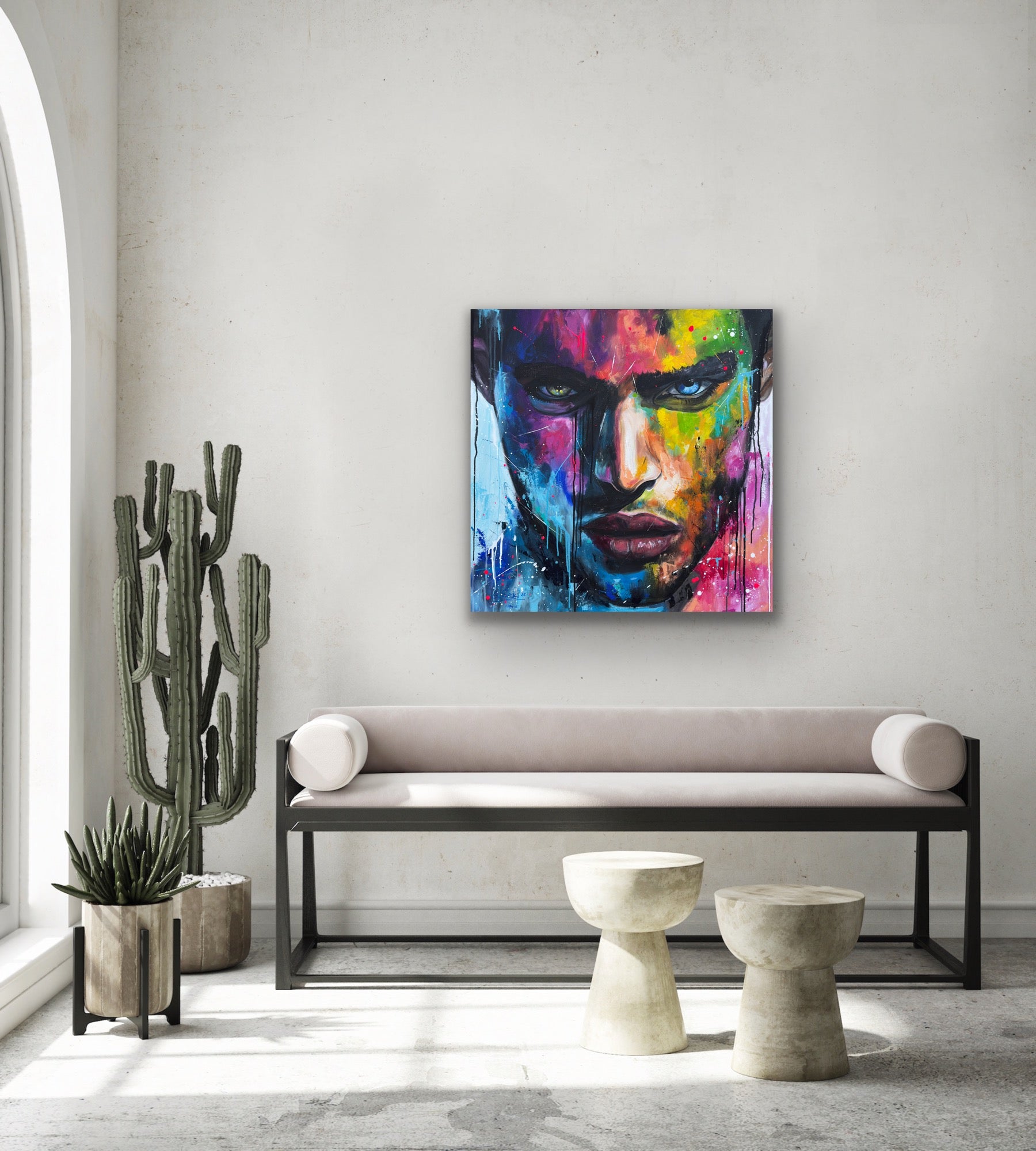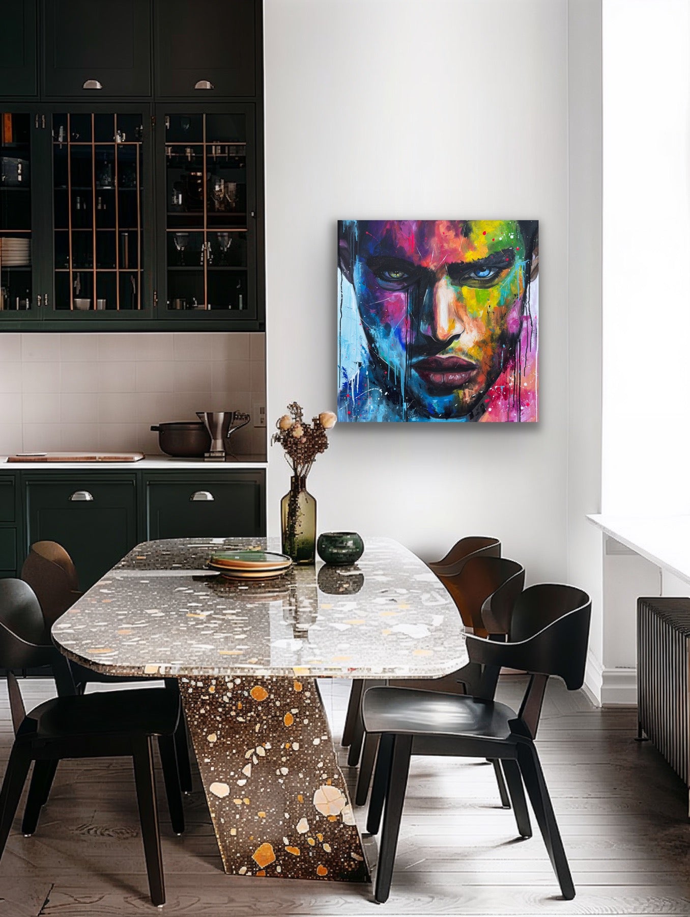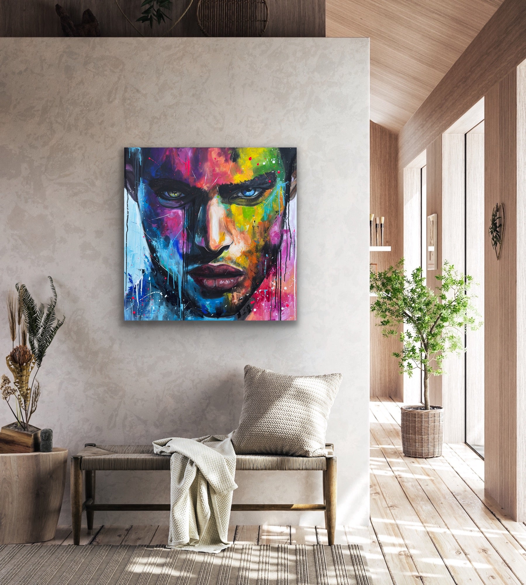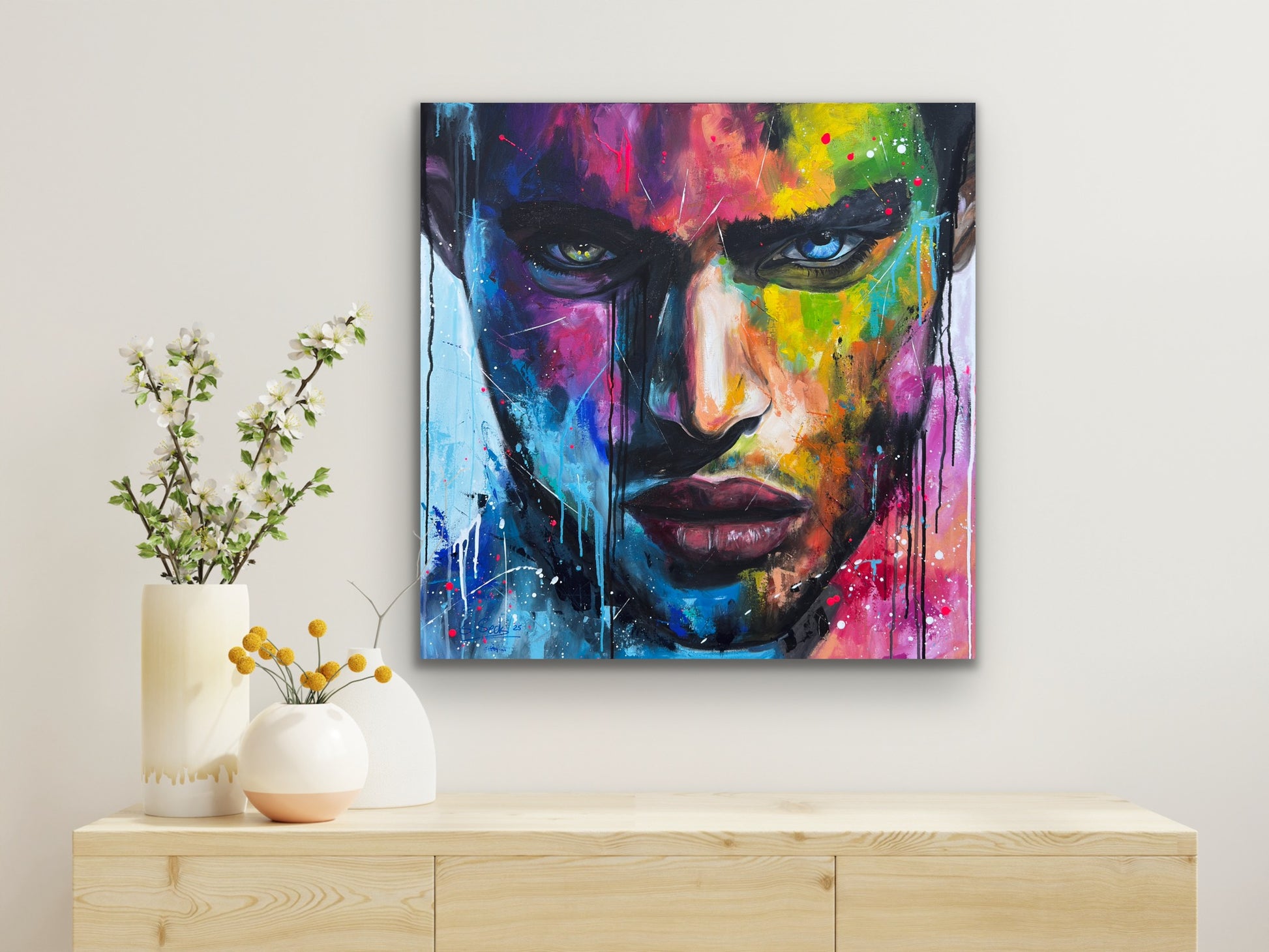 Die lebhaften, kontrastreichen Farben spiegeln einen inneren Kampf und gleichzeitig die Schönheit des menschlichen Geistes wider. Constantin ist mystisch und geheimnisvoll, sein Ausdruck voller Geheimnisse. Seine Gedanken kann man nur mutmaßen, doch seine Augen erzählen eine Geschichte. Jedem Betrachter eine andere. Dieses Gemälde fügt sich nicht nur in jede Raumgestaltung ein, sondern belebt sie auch mit Energie und tiefgreifender Emotionalität. Es ist eine Hommage an die Stärke des menschlichen Ausdrucks