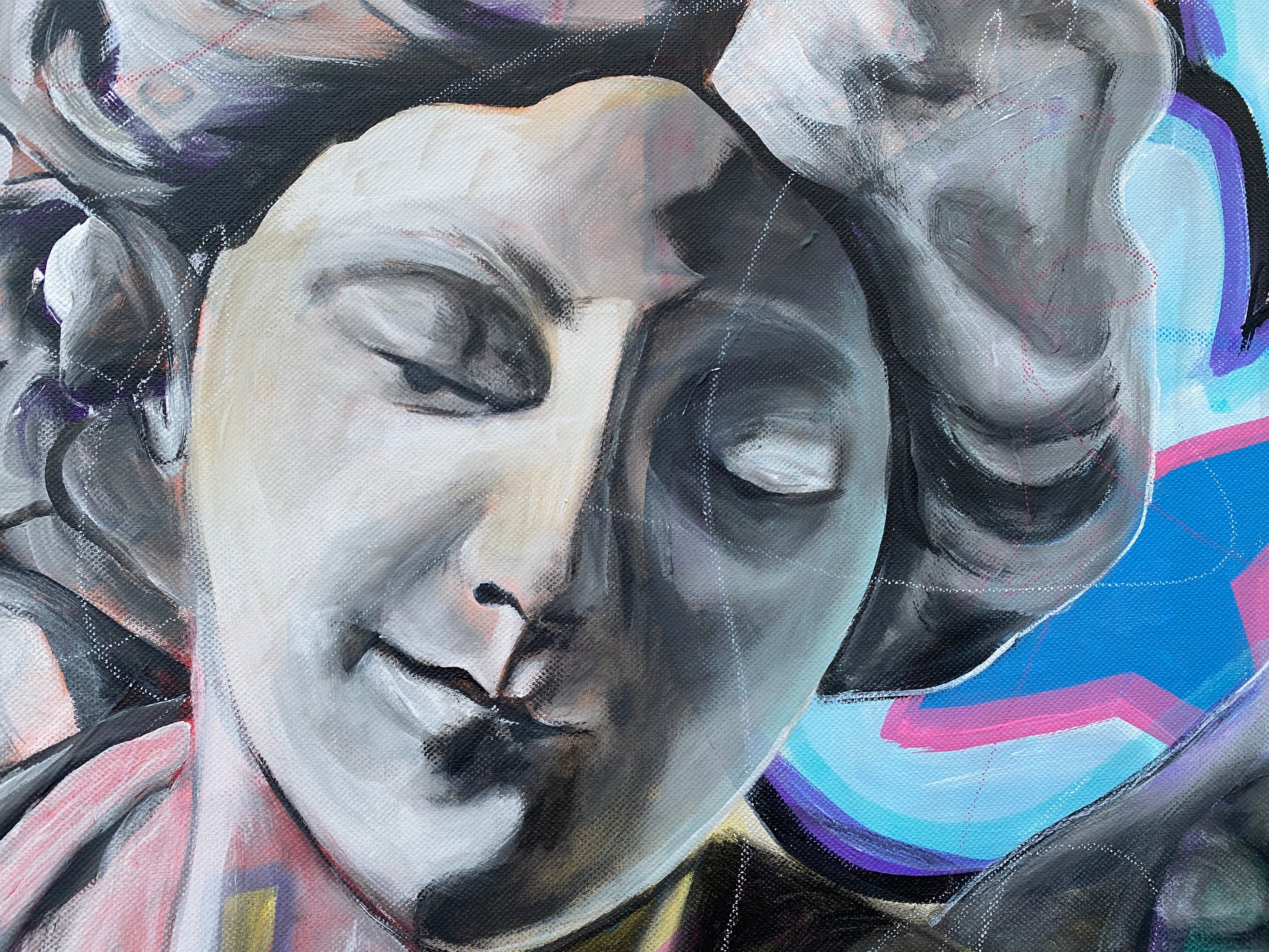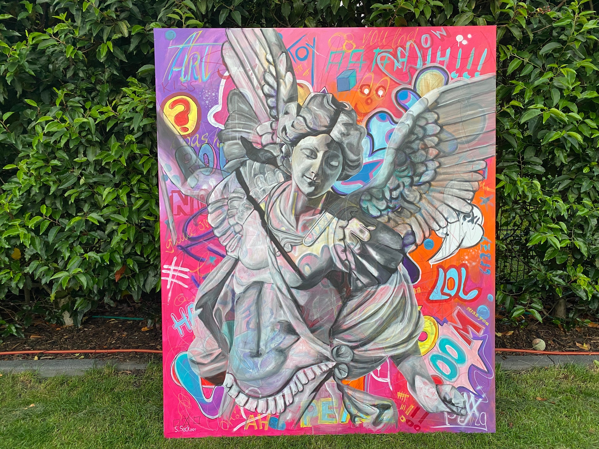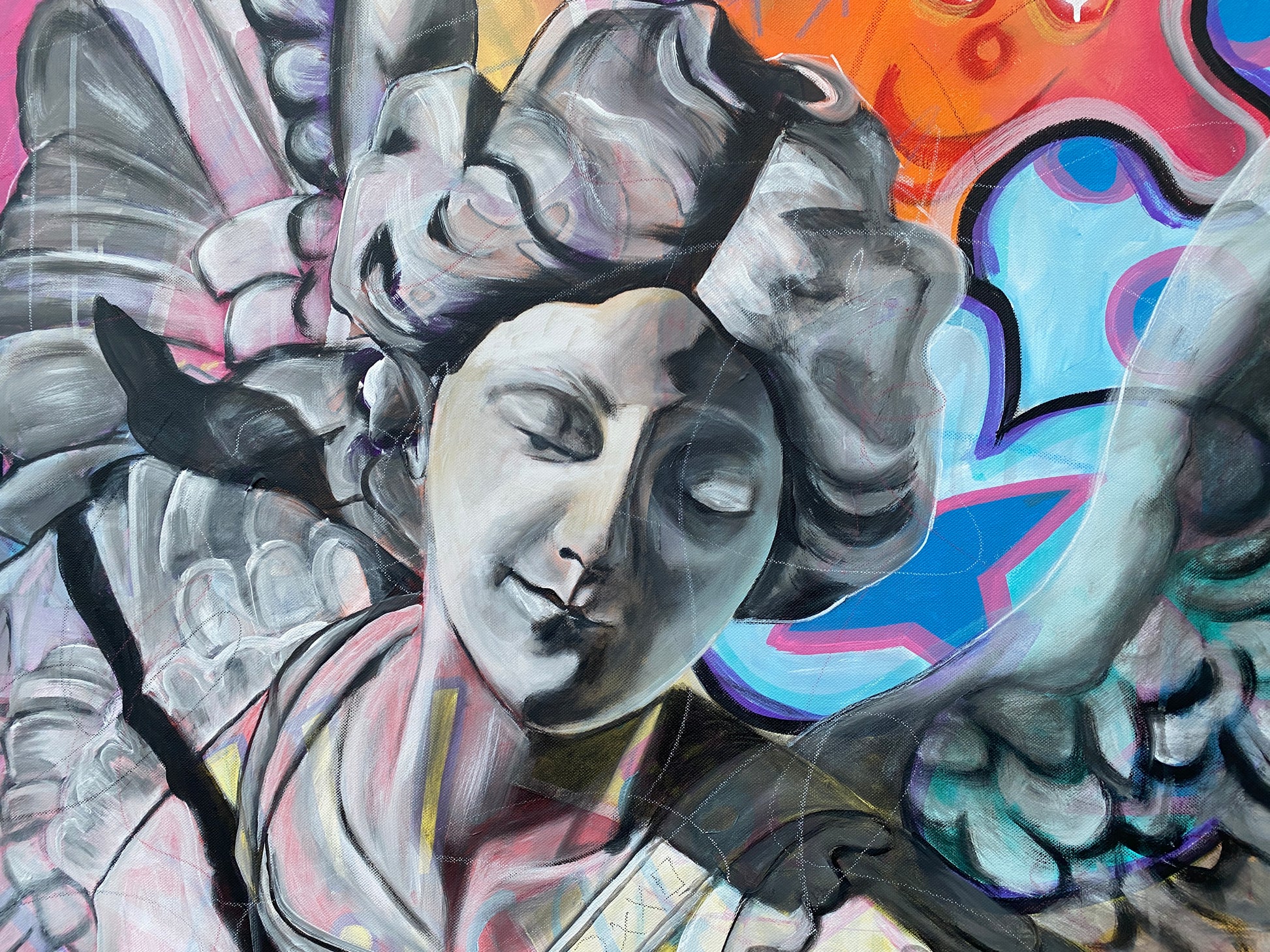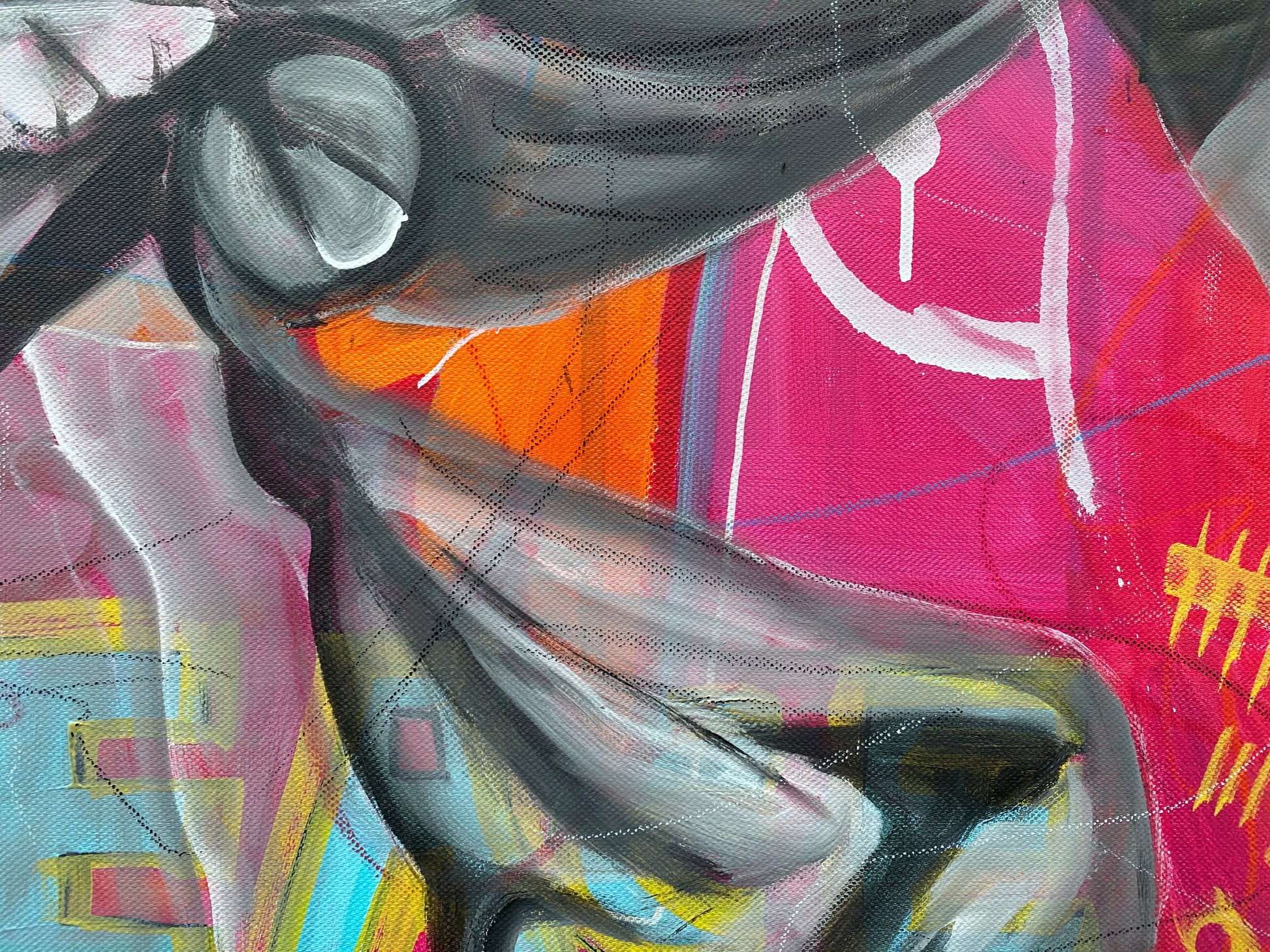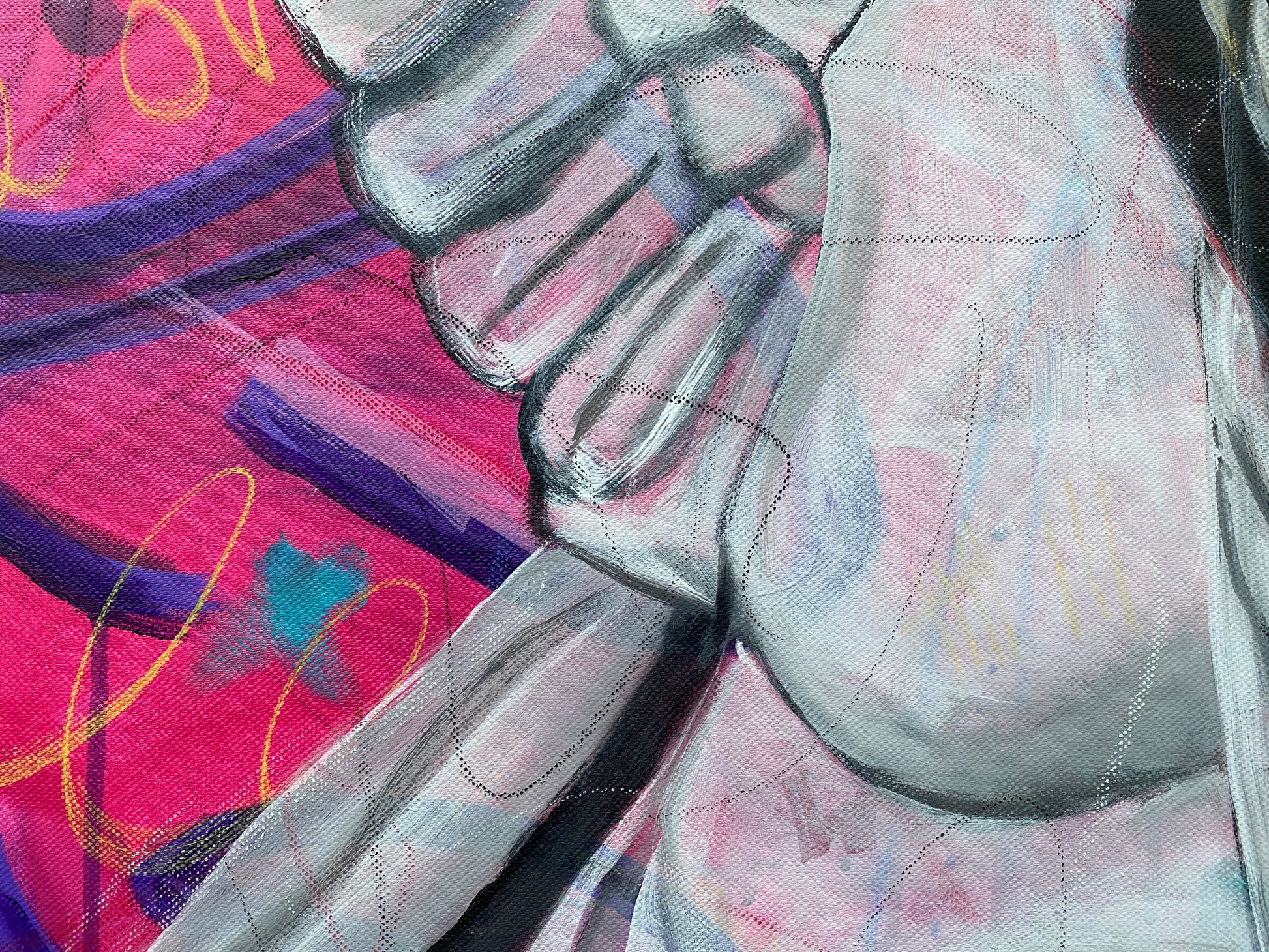 In meiner Arbeit verschmelzen klassische Schönheit und moderne Dynamik. Mit Acryl, Buntstiften und Kreide schaffe ich eine expressionistische Darstellung, die Figuratives und Pop-Art verbindet. Die Figur strahlt himmlische Ruhe aus, kontrastiert durch lebhafte Hintergrundgrafiken, die zeitgenössische Kommentare symbolisieren. Dieses Kunstwerk bringt eine kraftvolle Energie, die zugleich inspiriert und zum Nachdenken anregt – perfekt für ein lebendiges, modernes Zuhause.