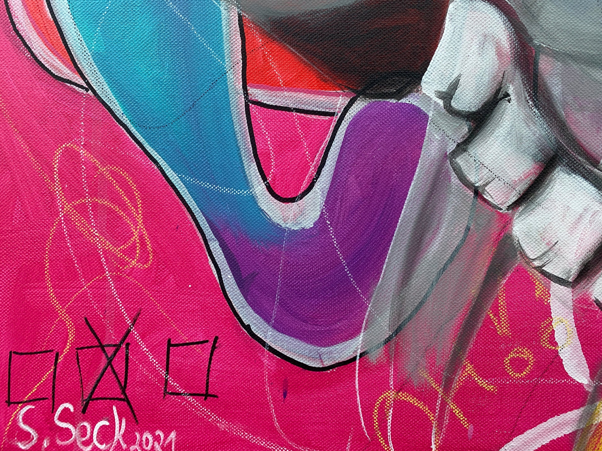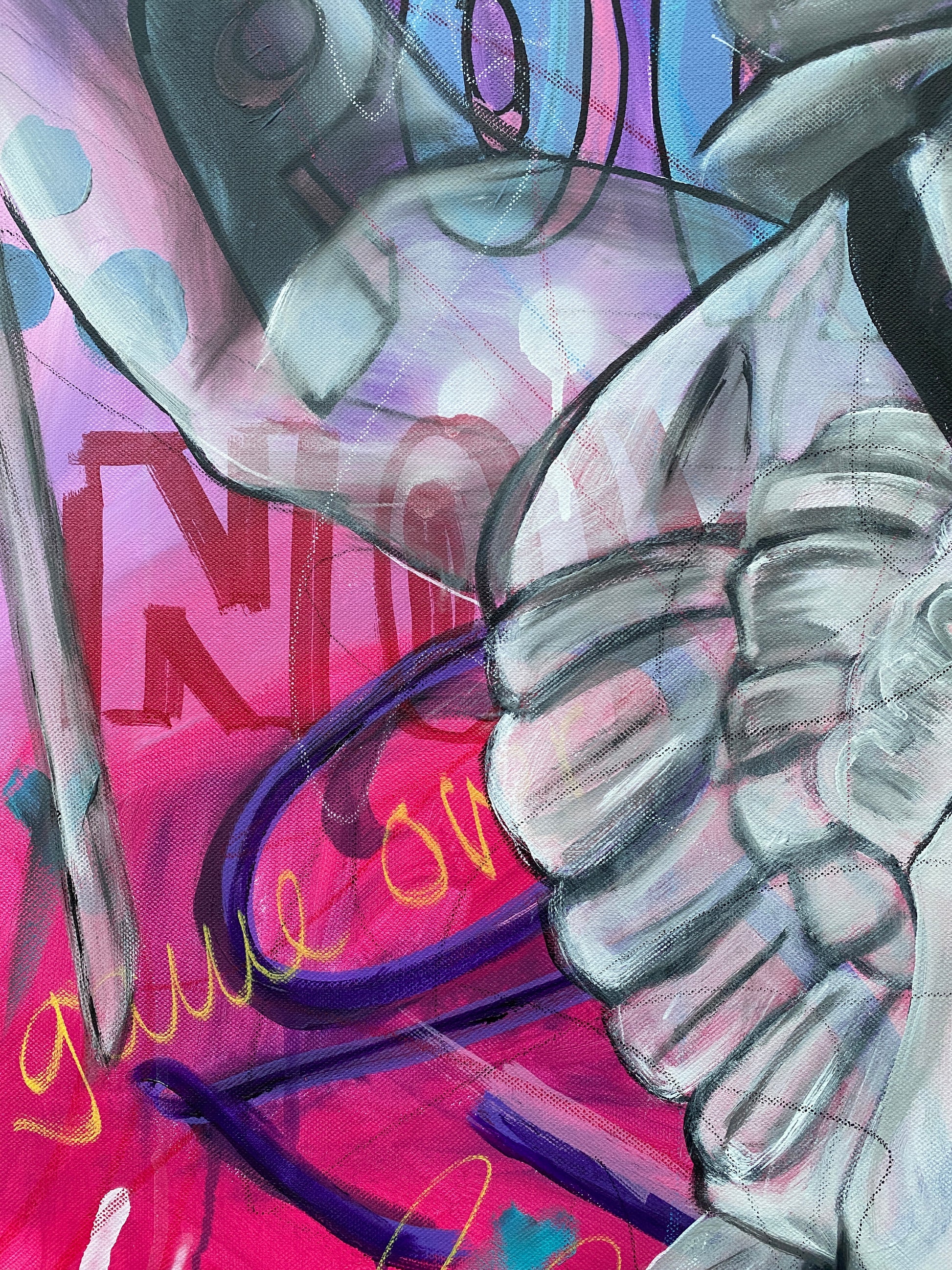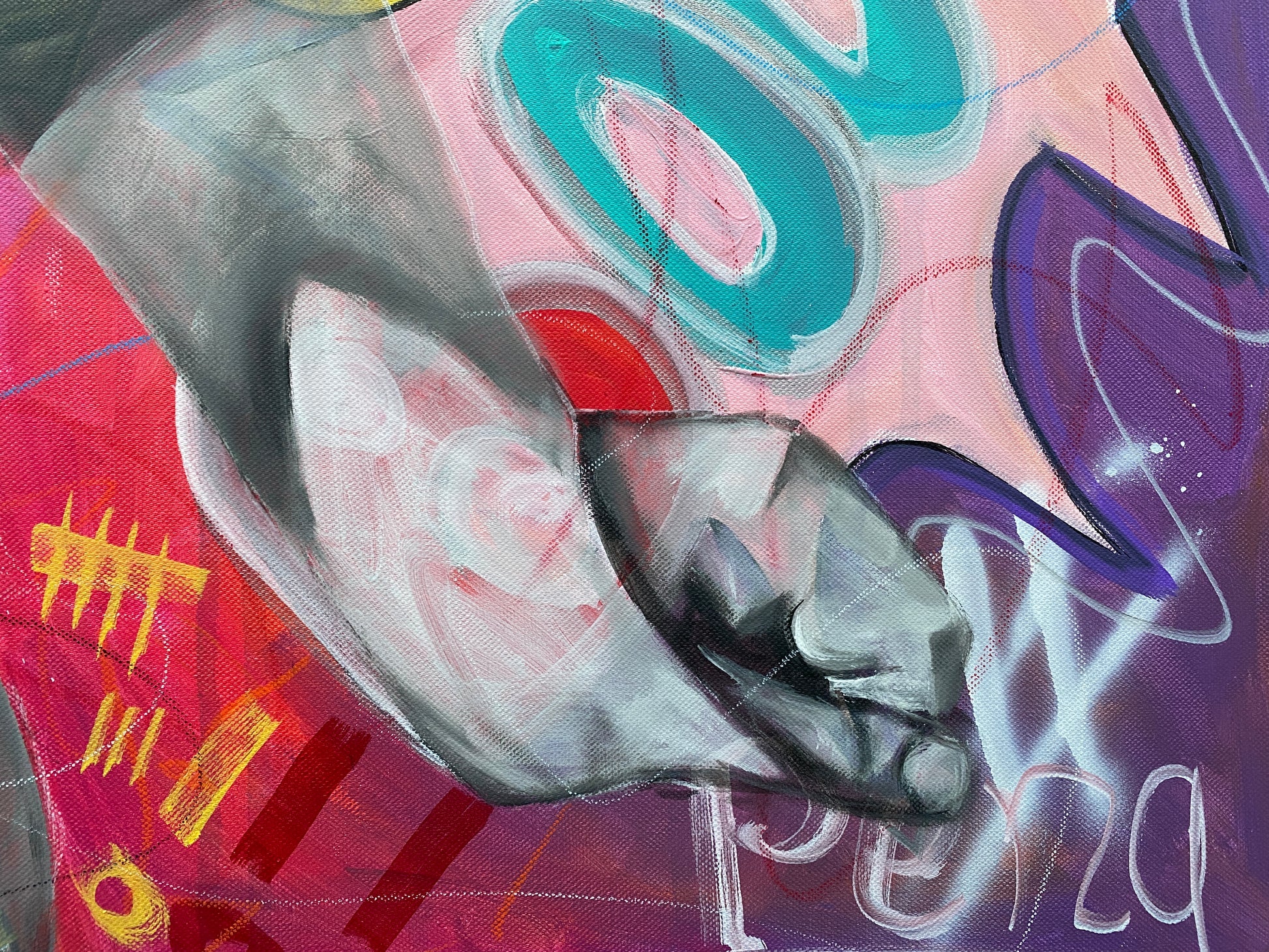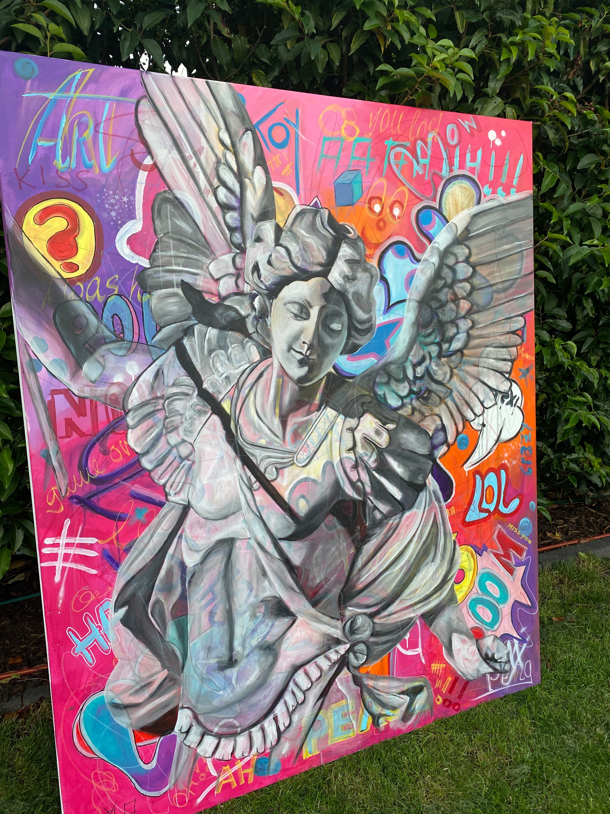 In meiner Arbeit verschmelzen klassische Schönheit und moderne Dynamik. Mit Acryl, Buntstiften und Kreide schaffe ich eine expressionistische Darstellung, die Figuratives und Pop-Art verbindet. Die Figur strahlt himmlische Ruhe aus, kontrastiert durch lebhafte Hintergrundgrafiken, die zeitgenössische Kommentare symbolisieren. Dieses Kunstwerk bringt eine kraftvolle Energie, die zugleich inspiriert und zum Nachdenken anregt – perfekt für ein lebendiges, modernes Zuhause.