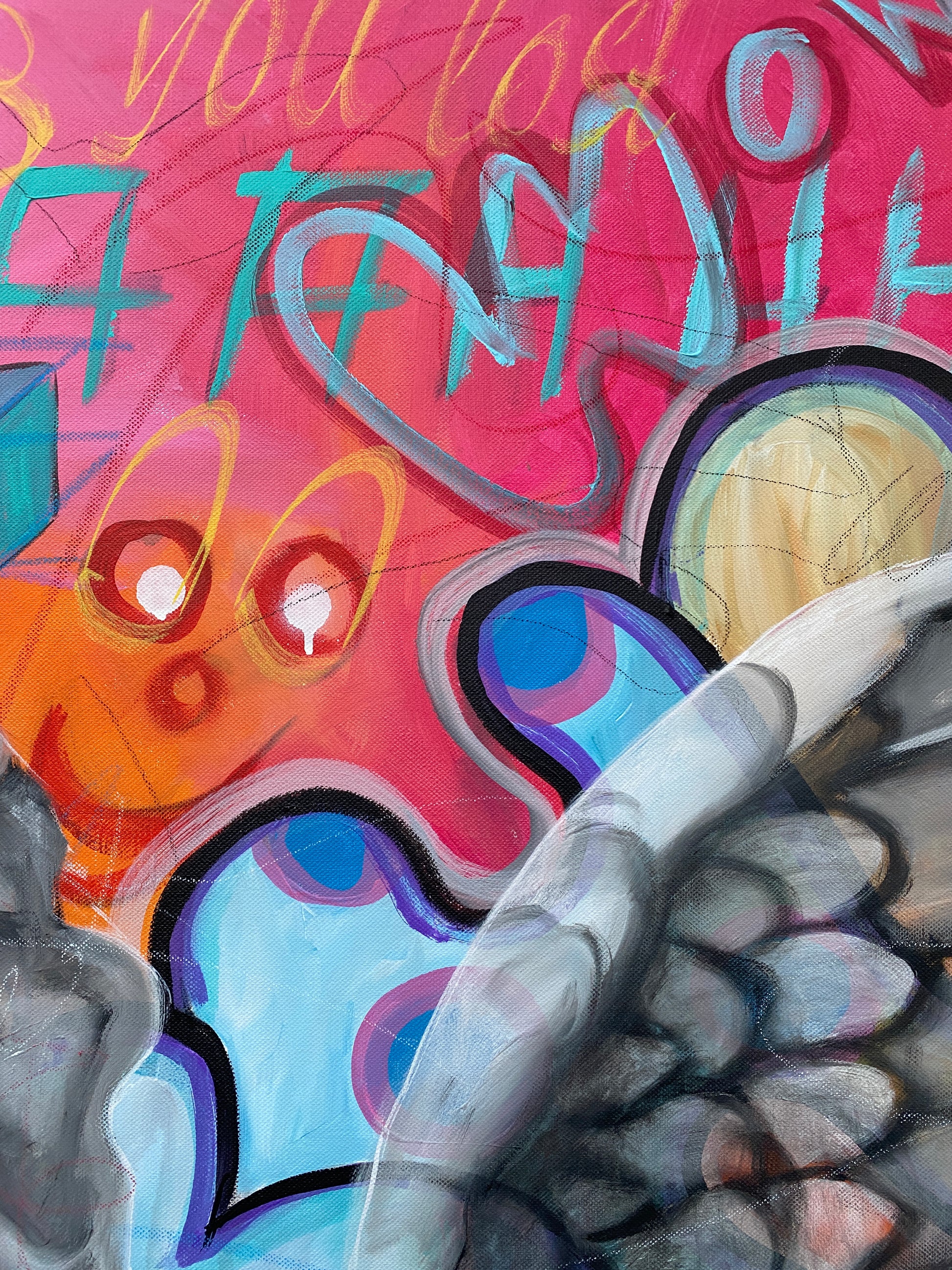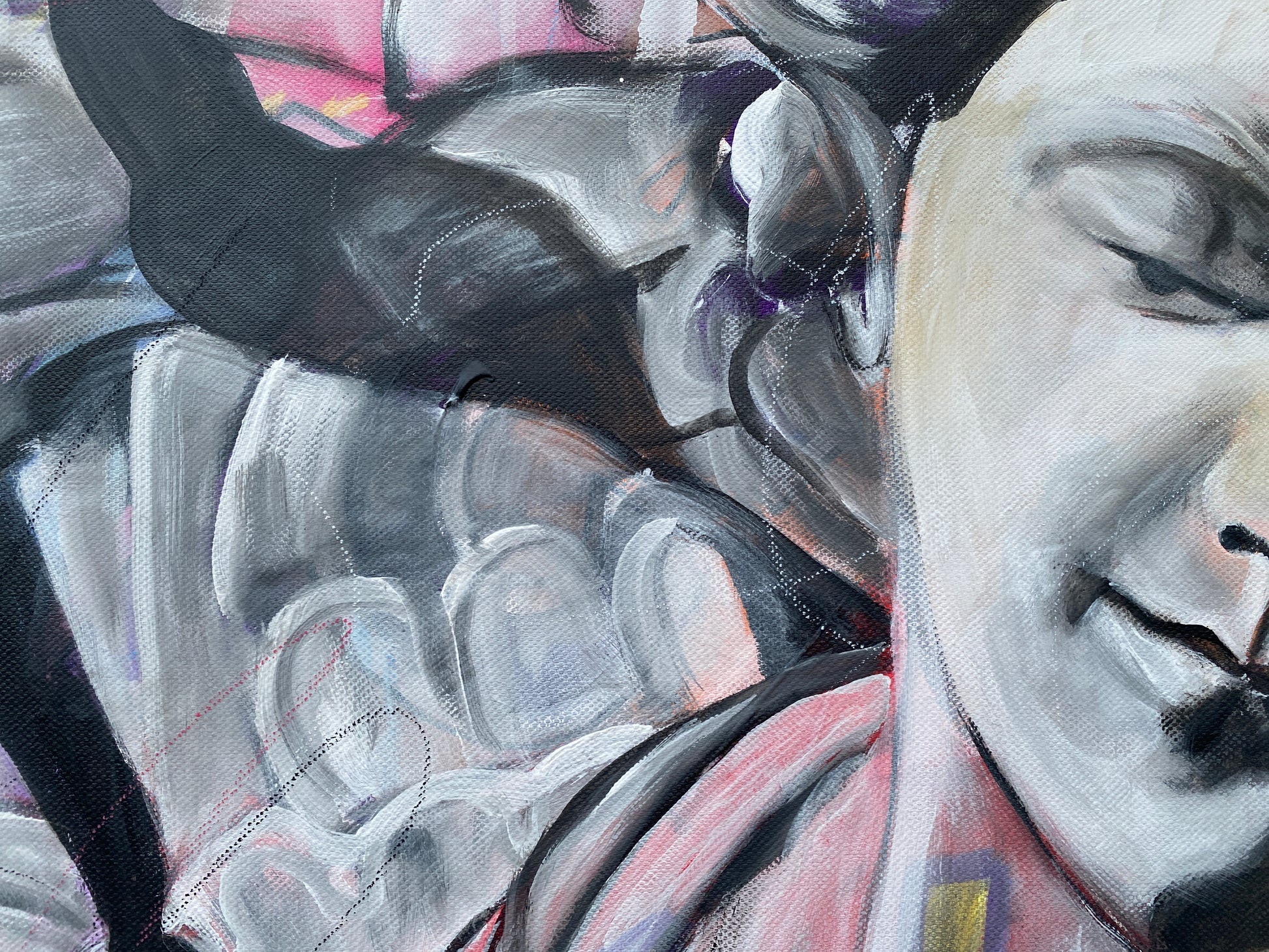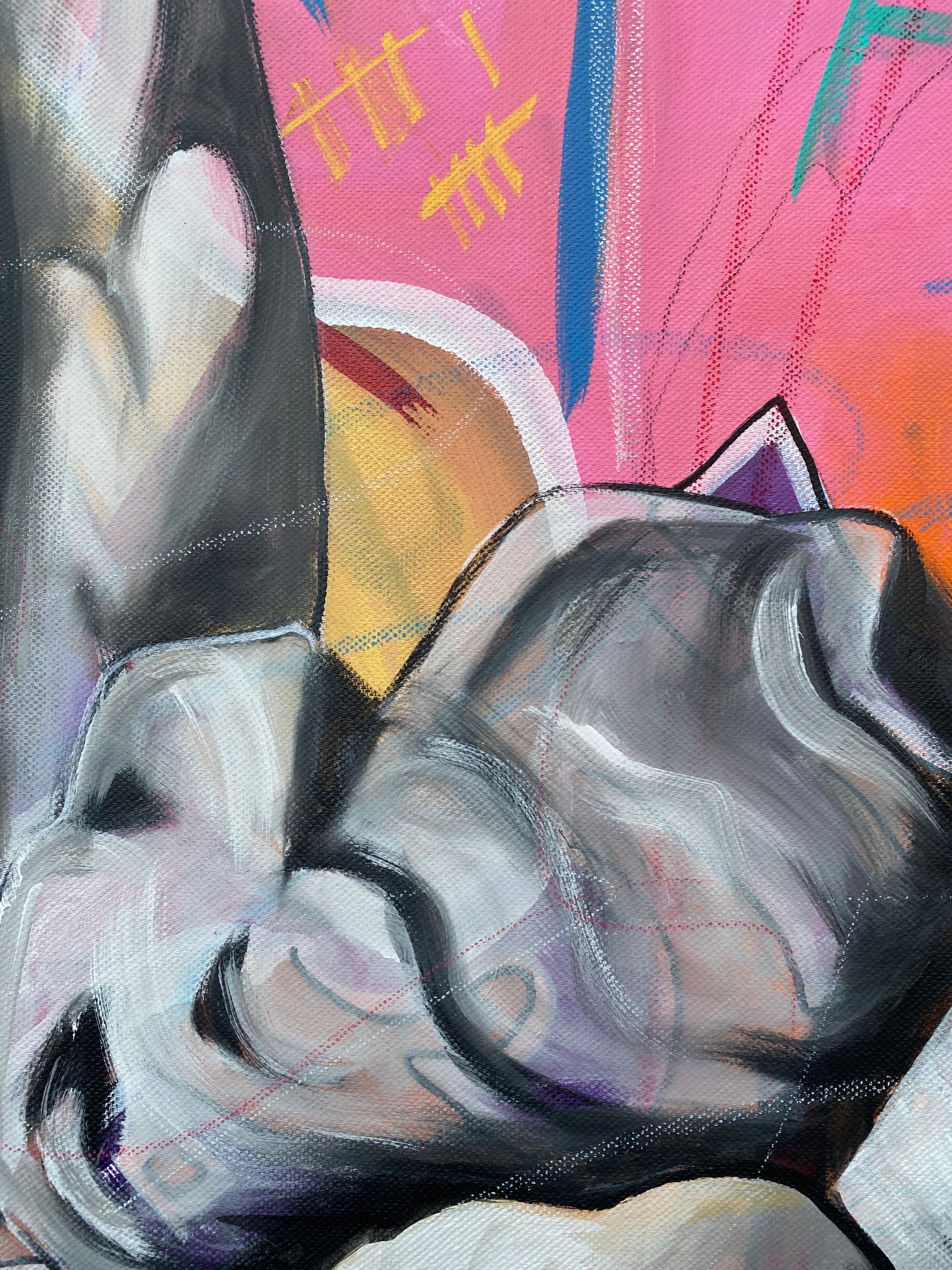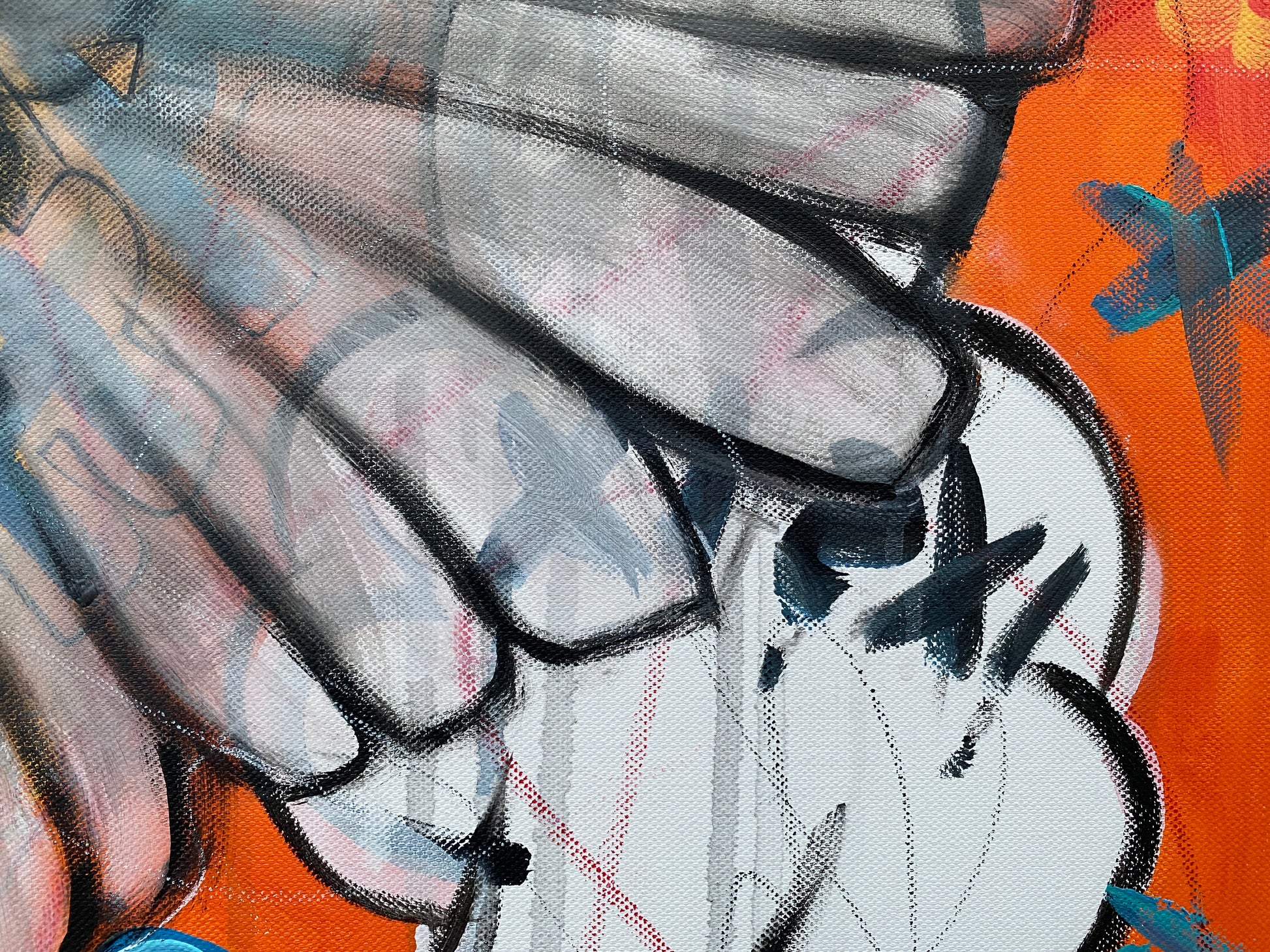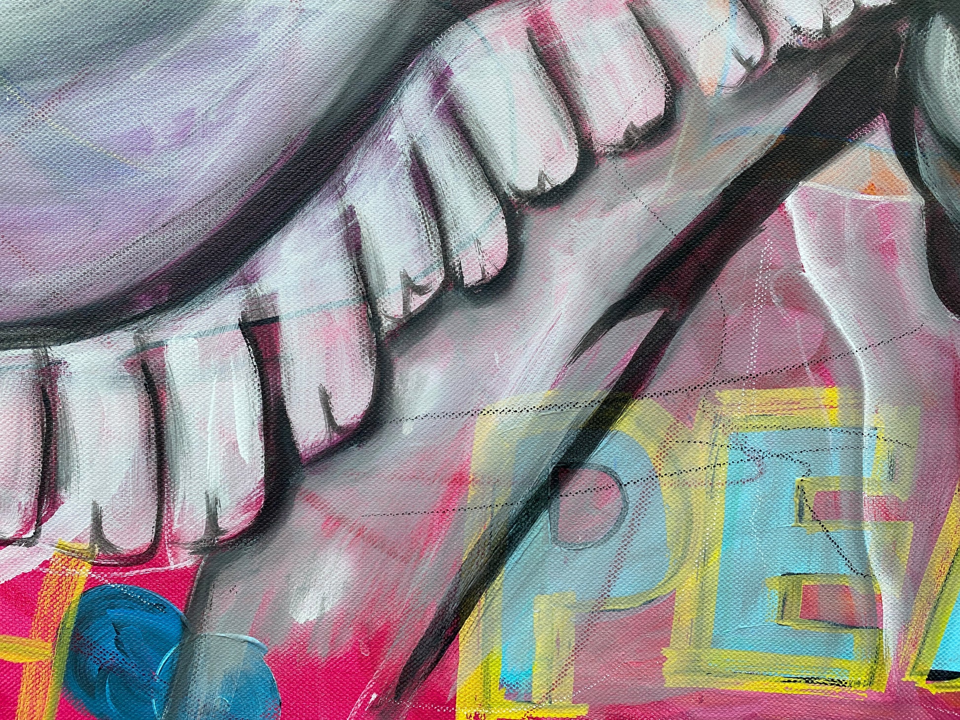 In meiner Arbeit verschmelzen klassische Schönheit und moderne Dynamik. Mit Acryl, Buntstiften und Kreide schaffe ich eine expressionistische Darstellung, die Figuratives und Pop-Art verbindet. Die Figur strahlt himmlische Ruhe aus, kontrastiert durch lebhafte Hintergrundgrafiken, die zeitgenössische Kommentare symbolisieren. Dieses Kunstwerk bringt eine kraftvolle Energie, die zugleich inspiriert und zum Nachdenken anregt – perfekt für ein lebendiges, modernes Zuhause.