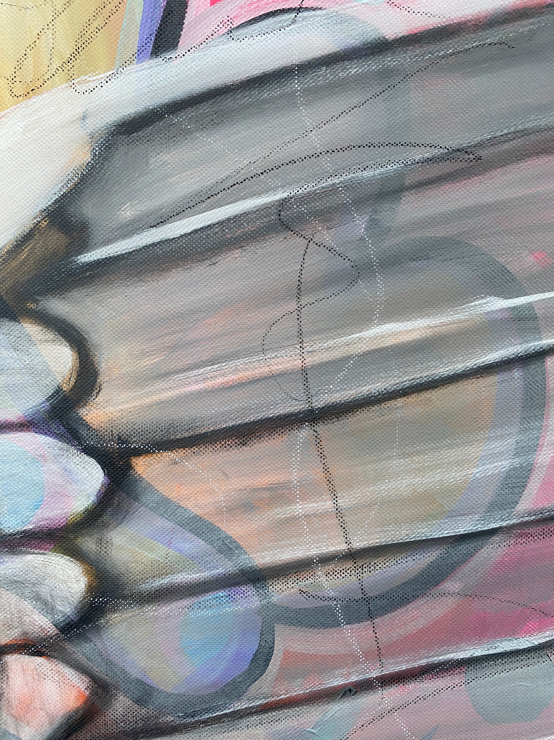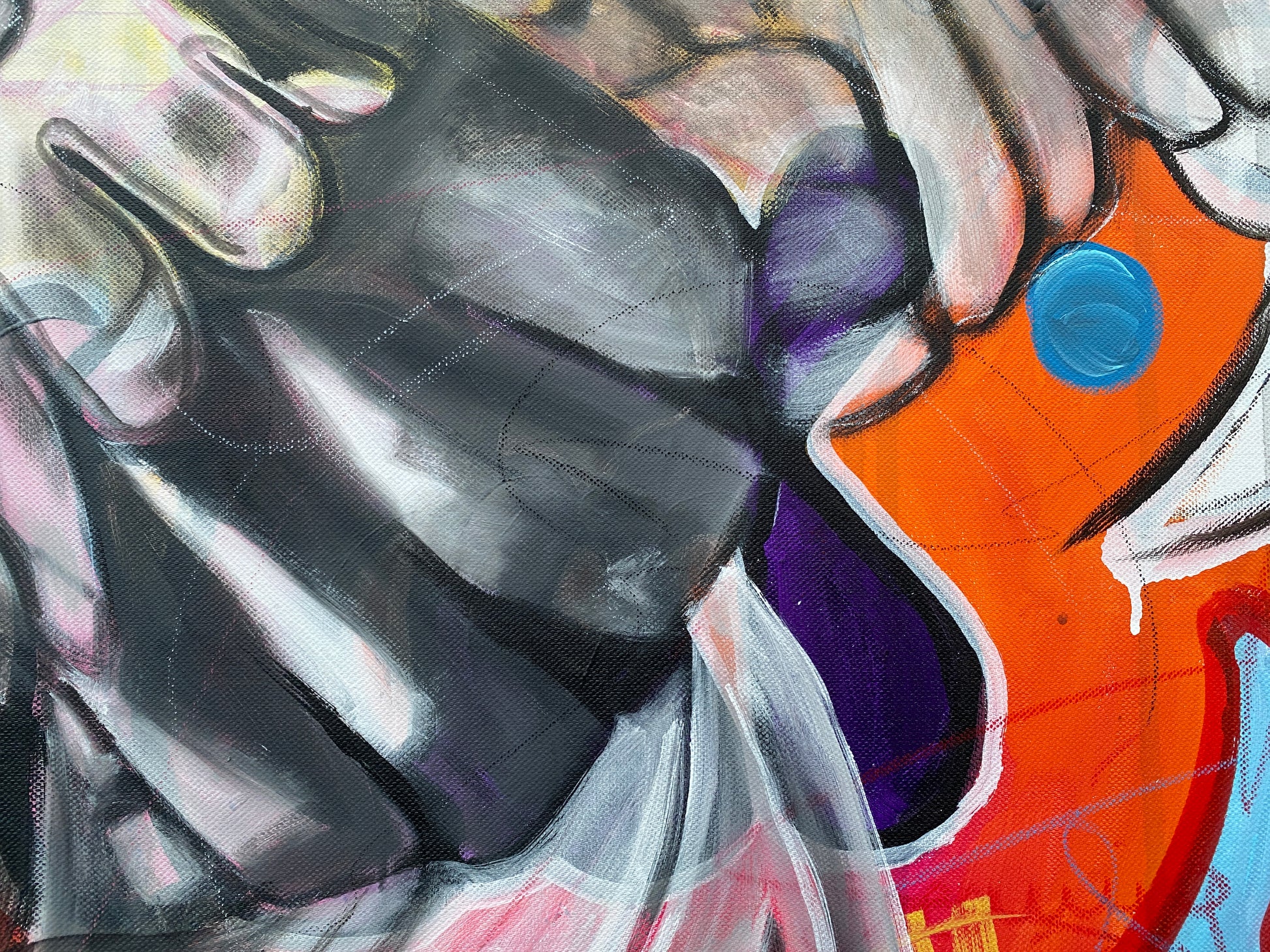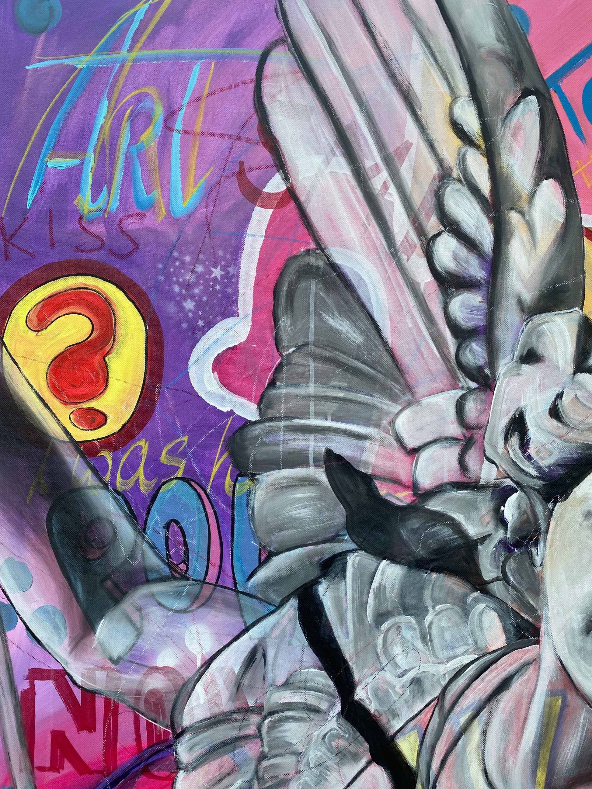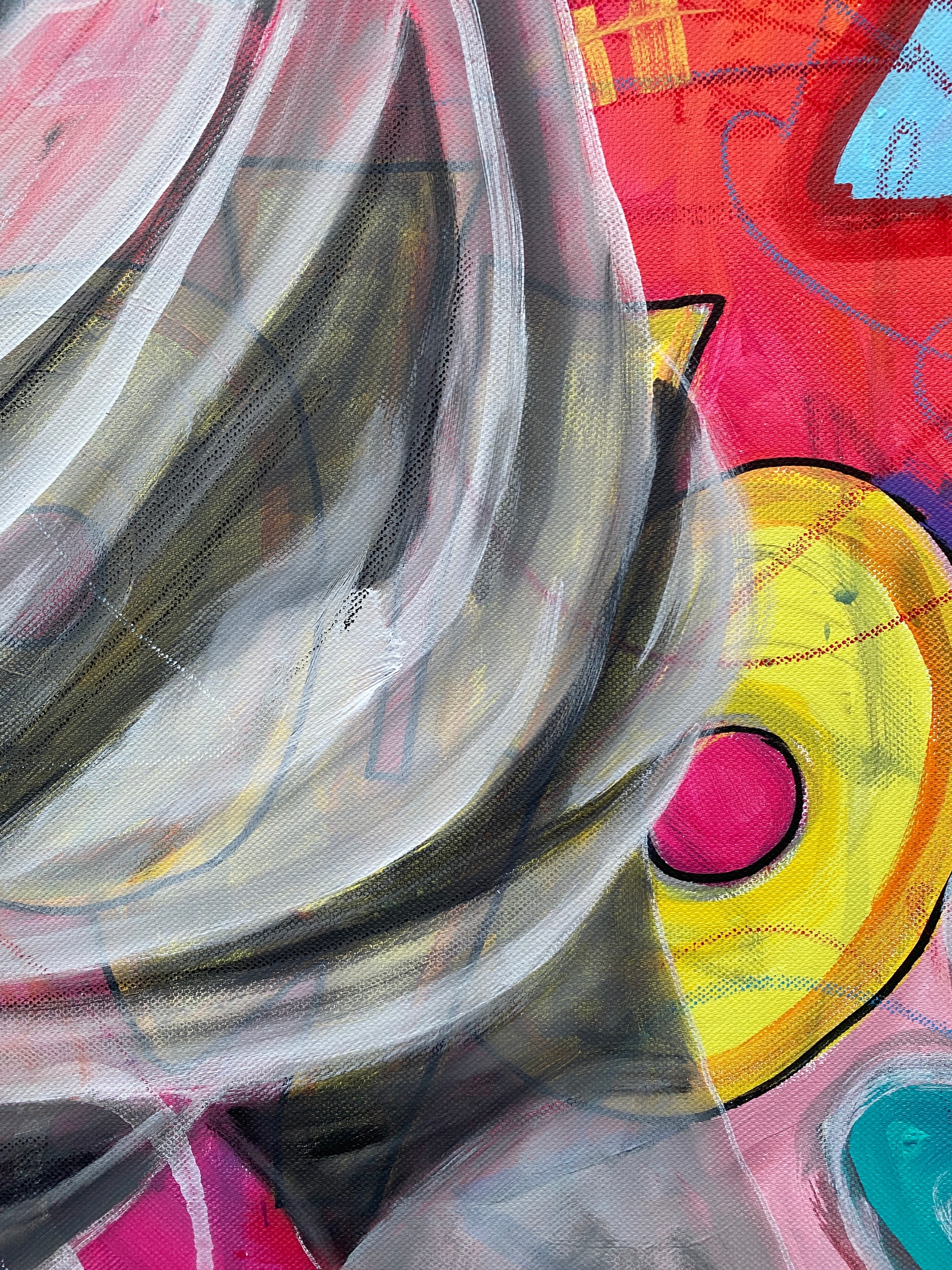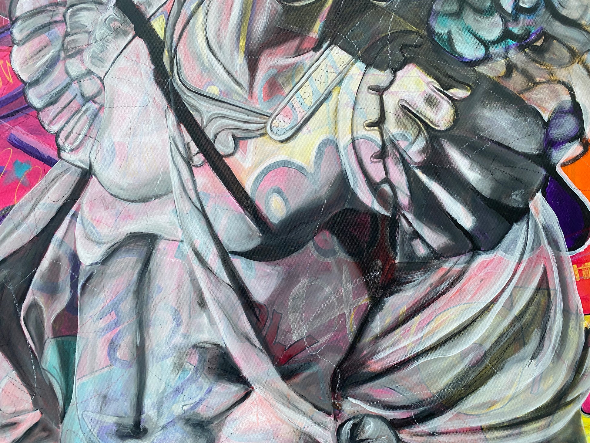 In meiner Arbeit verschmelzen klassische Schönheit und moderne Dynamik. Mit Acryl, Buntstiften und Kreide schaffe ich eine expressionistische Darstellung, die Figuratives und Pop-Art verbindet. Die Figur strahlt himmlische Ruhe aus, kontrastiert durch lebhafte Hintergrundgrafiken, die zeitgenössische Kommentare symbolisieren. Dieses Kunstwerk bringt eine kraftvolle Energie, die zugleich inspiriert und zum Nachdenken anregt – perfekt für ein lebendiges, modernes Zuhause.