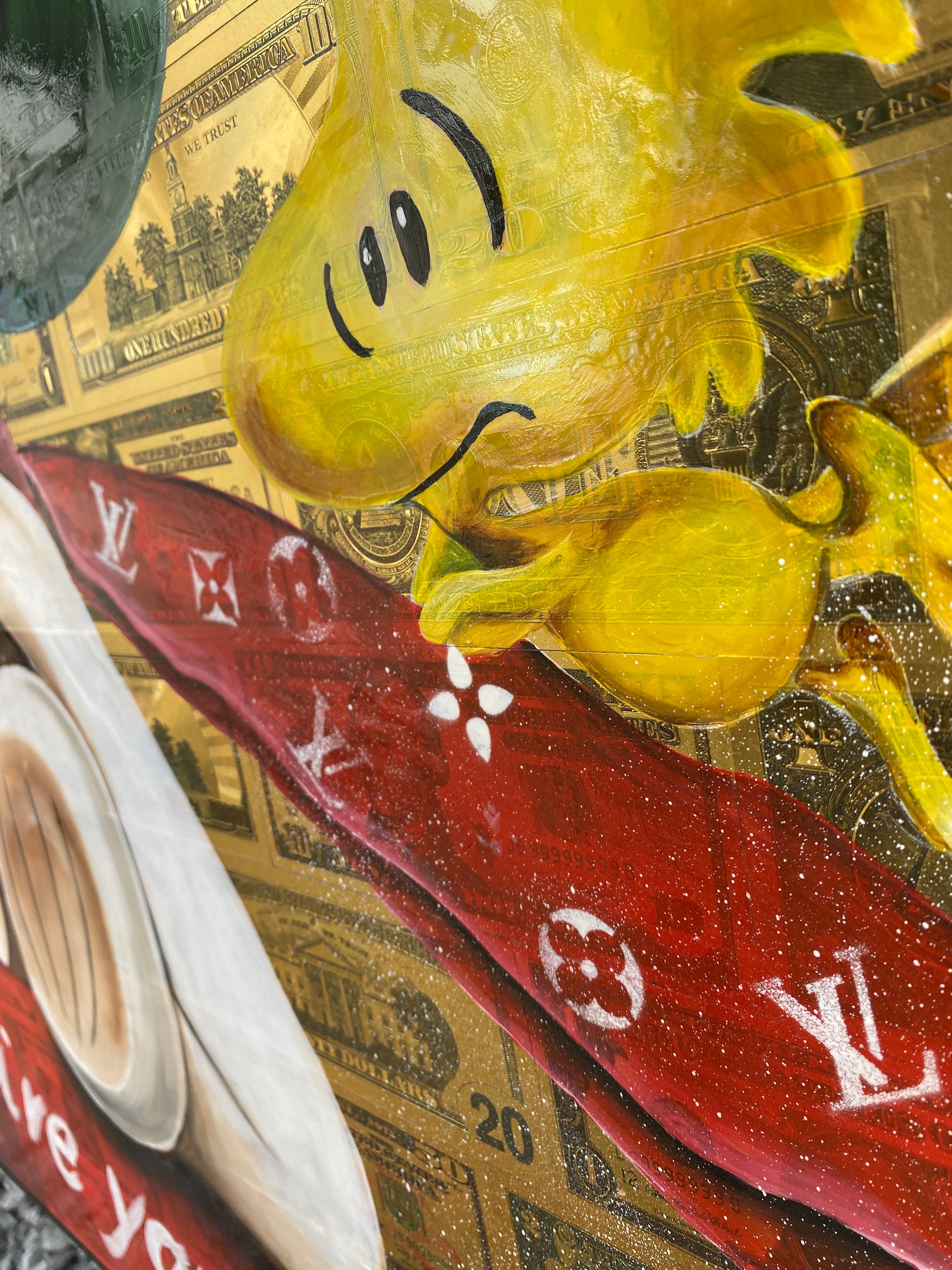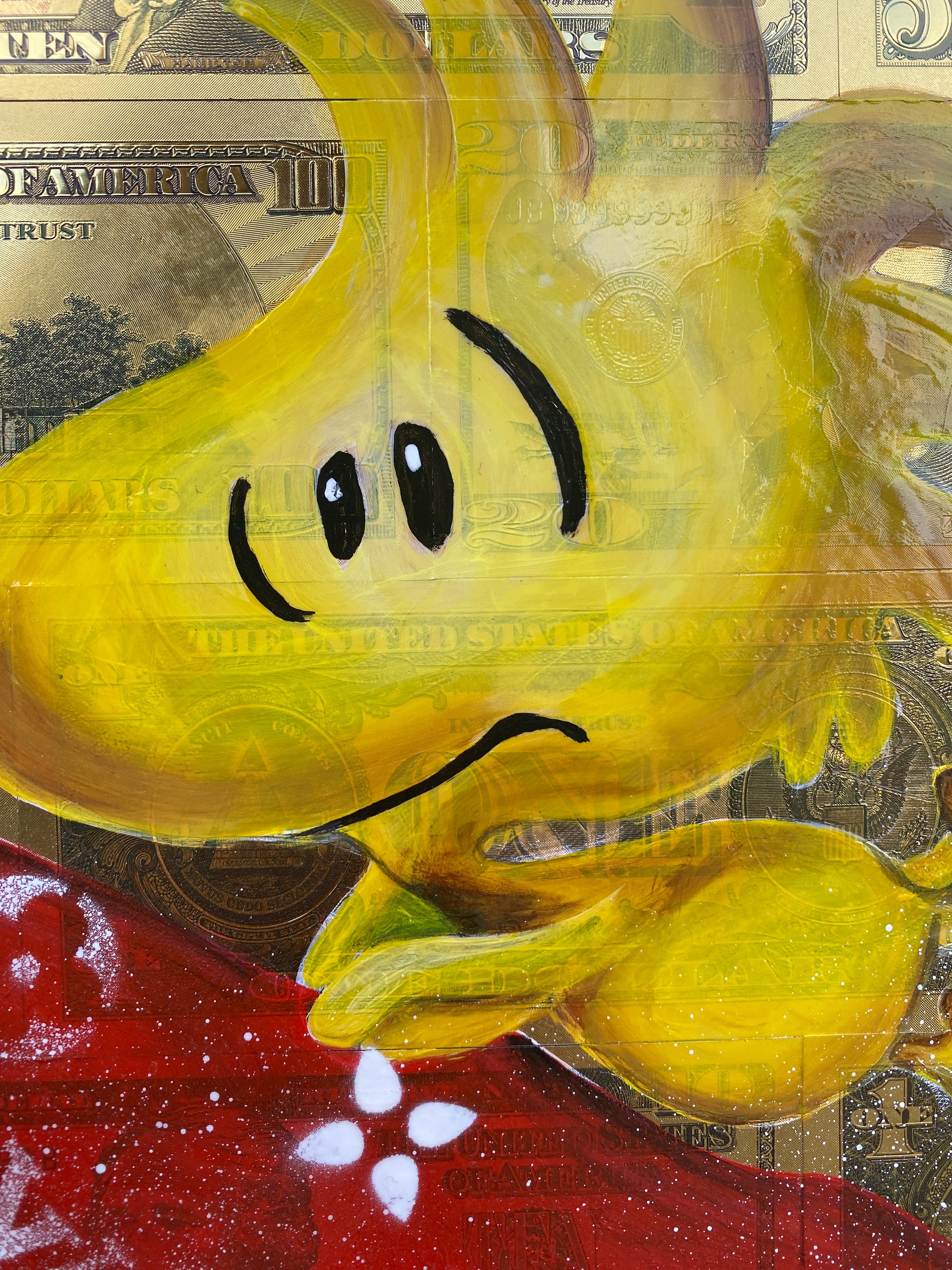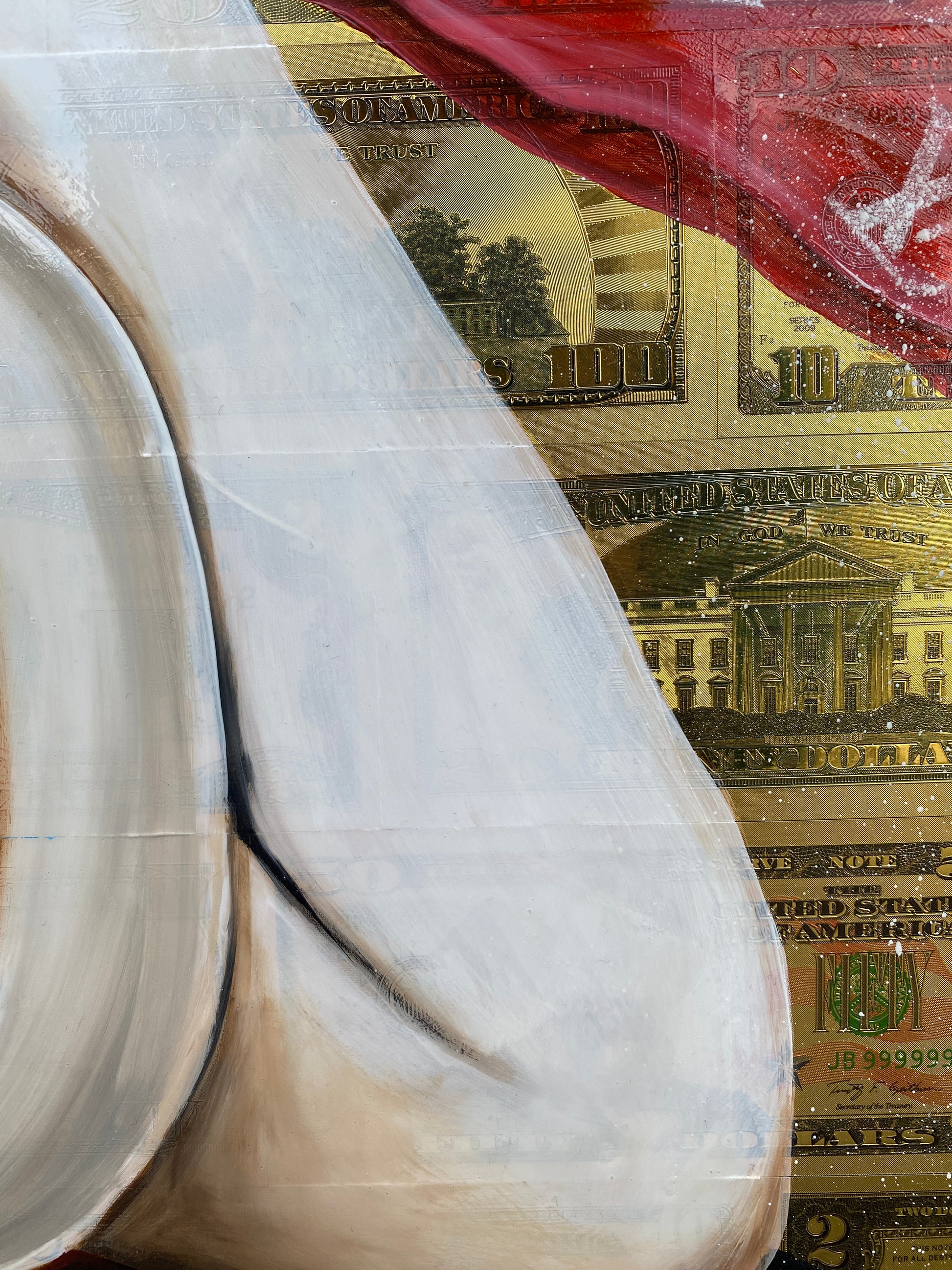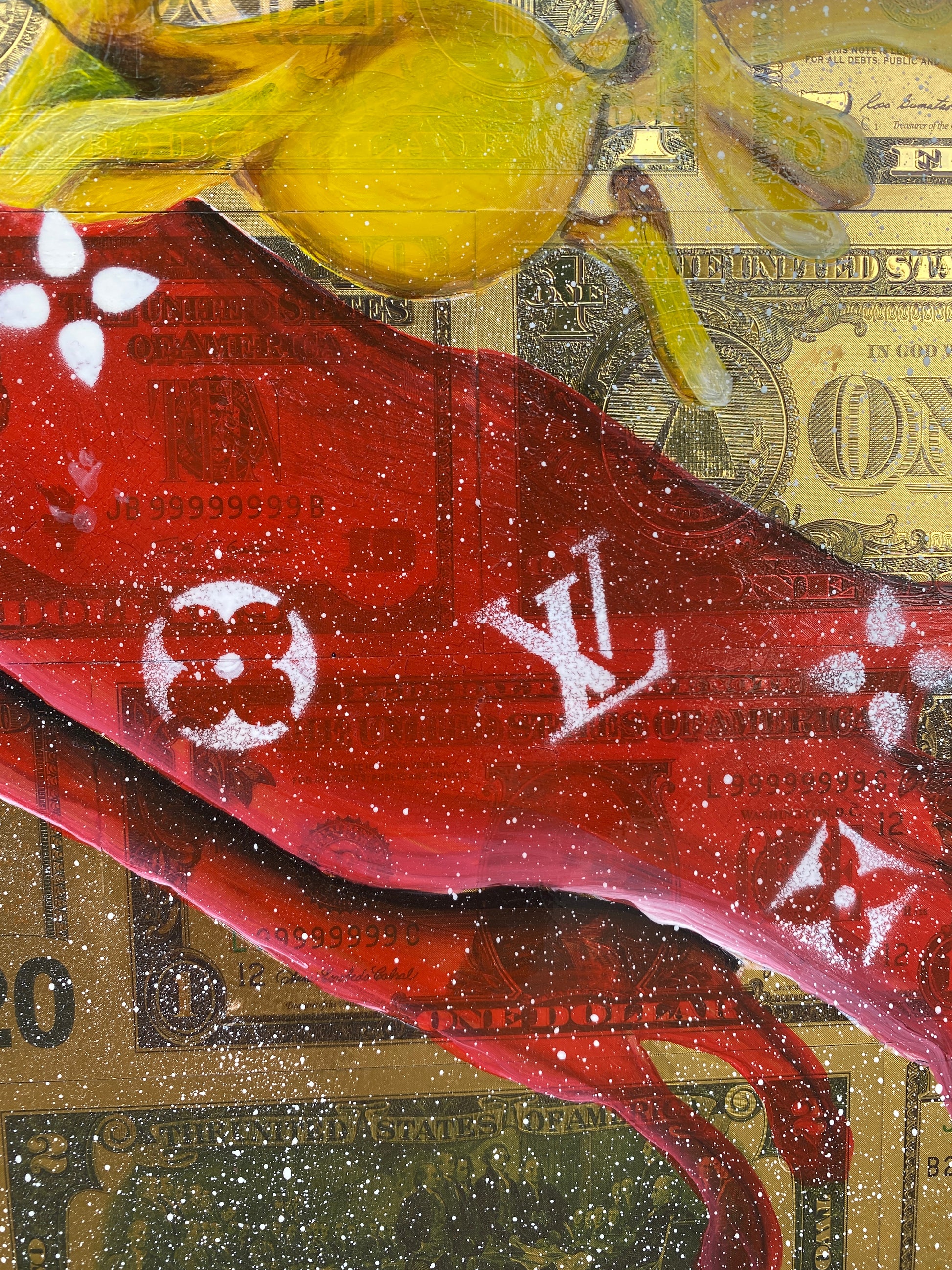 Die Leinwand wurde mit 65 vergoldeten Dollarscheinen beklebt. Auf die Dollarscheine wurde das Motiv mit Acryl gemalt. Das Motiv wurde im Anschluss mit einem Gloss-Medium fixiert. Die Dollarscheine haben durch die goldene Folierung einen schimmernden Glanz.