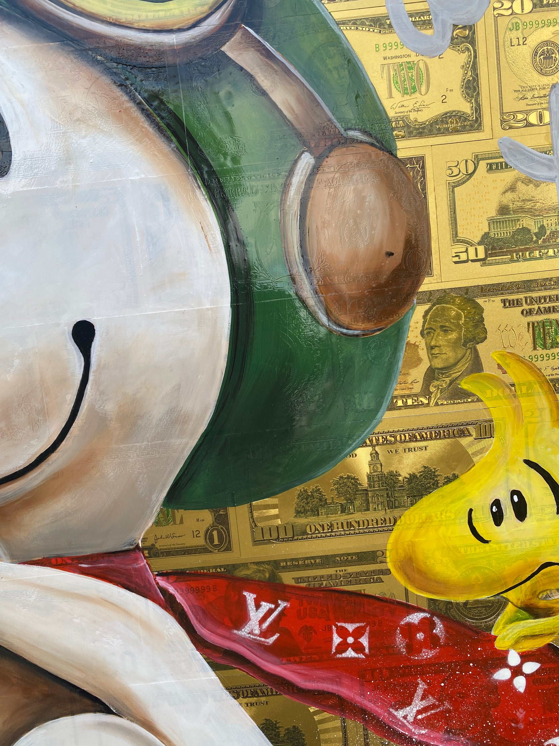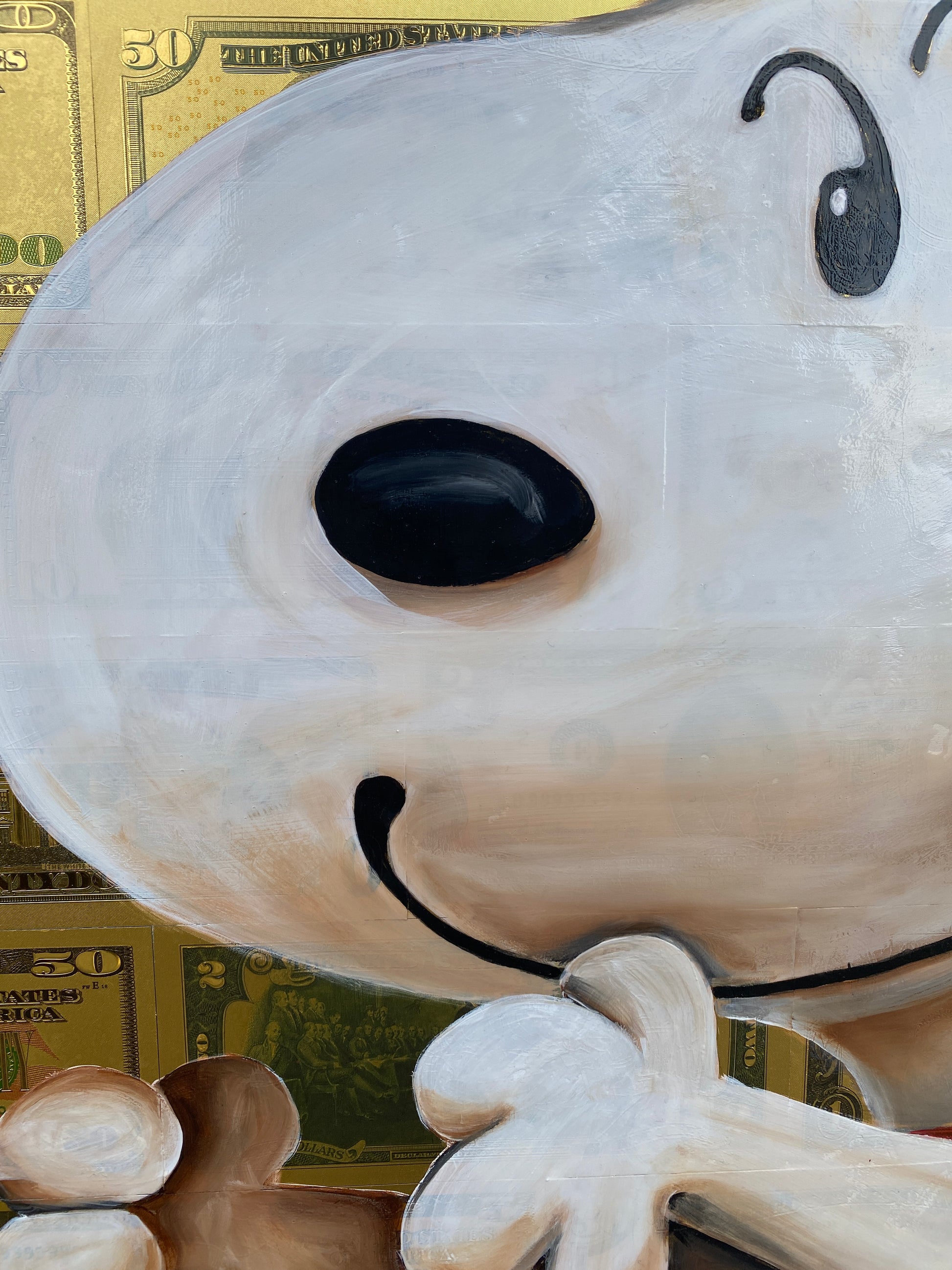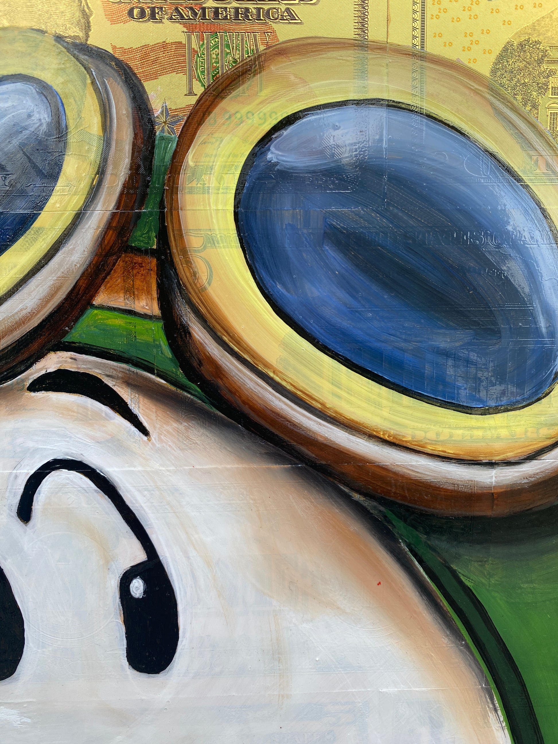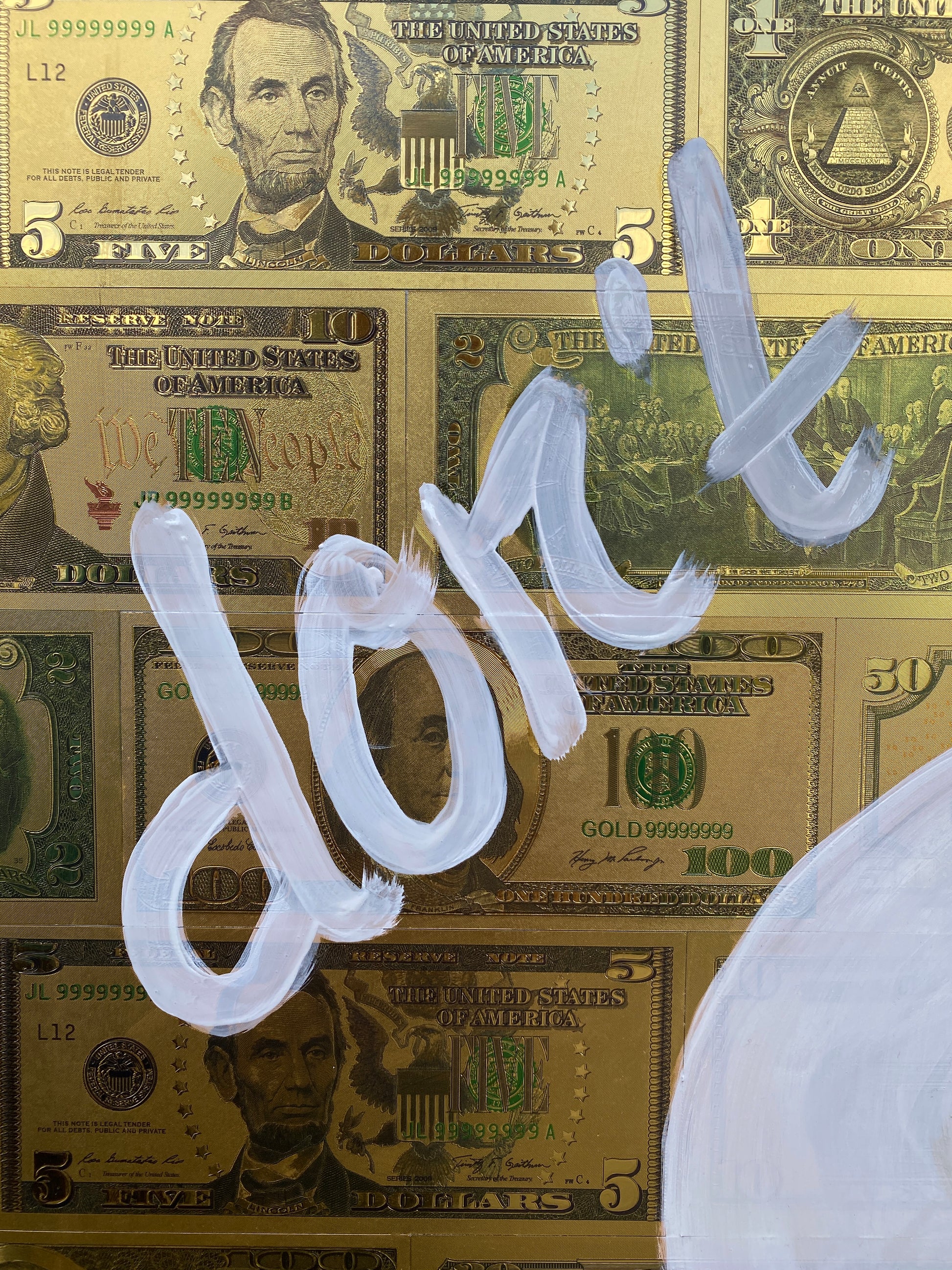 Die Leinwand wurde mit 65 vergoldeten Dollarscheinen beklebt. Auf die Dollarscheine wurde das Motiv mit Acryl gemalt. Das Motiv wurde im Anschluss mit einem Gloss-Medium fixiert. Die Dollarscheine haben durch die goldene Folierung einen schimmernden Glanz.