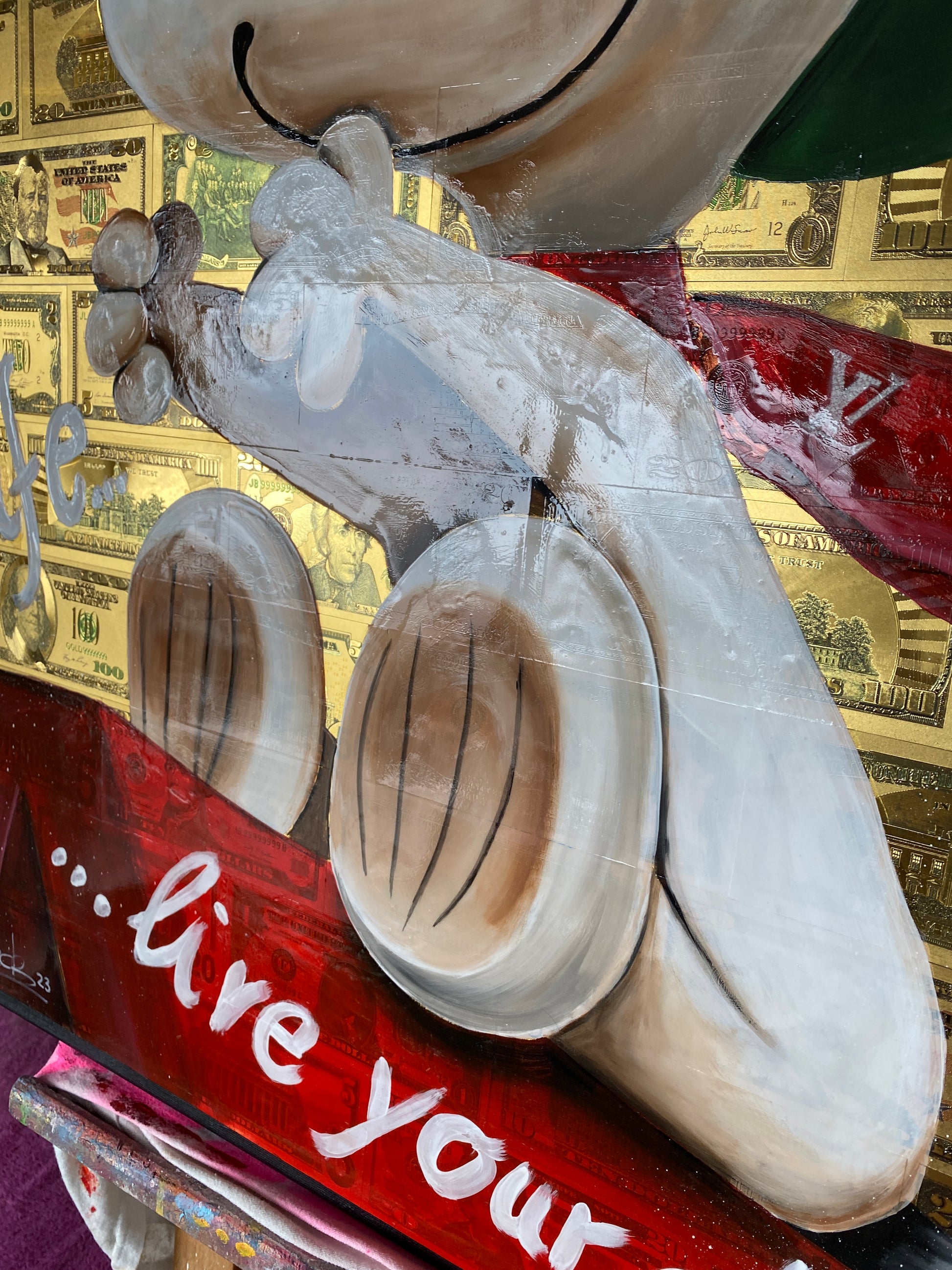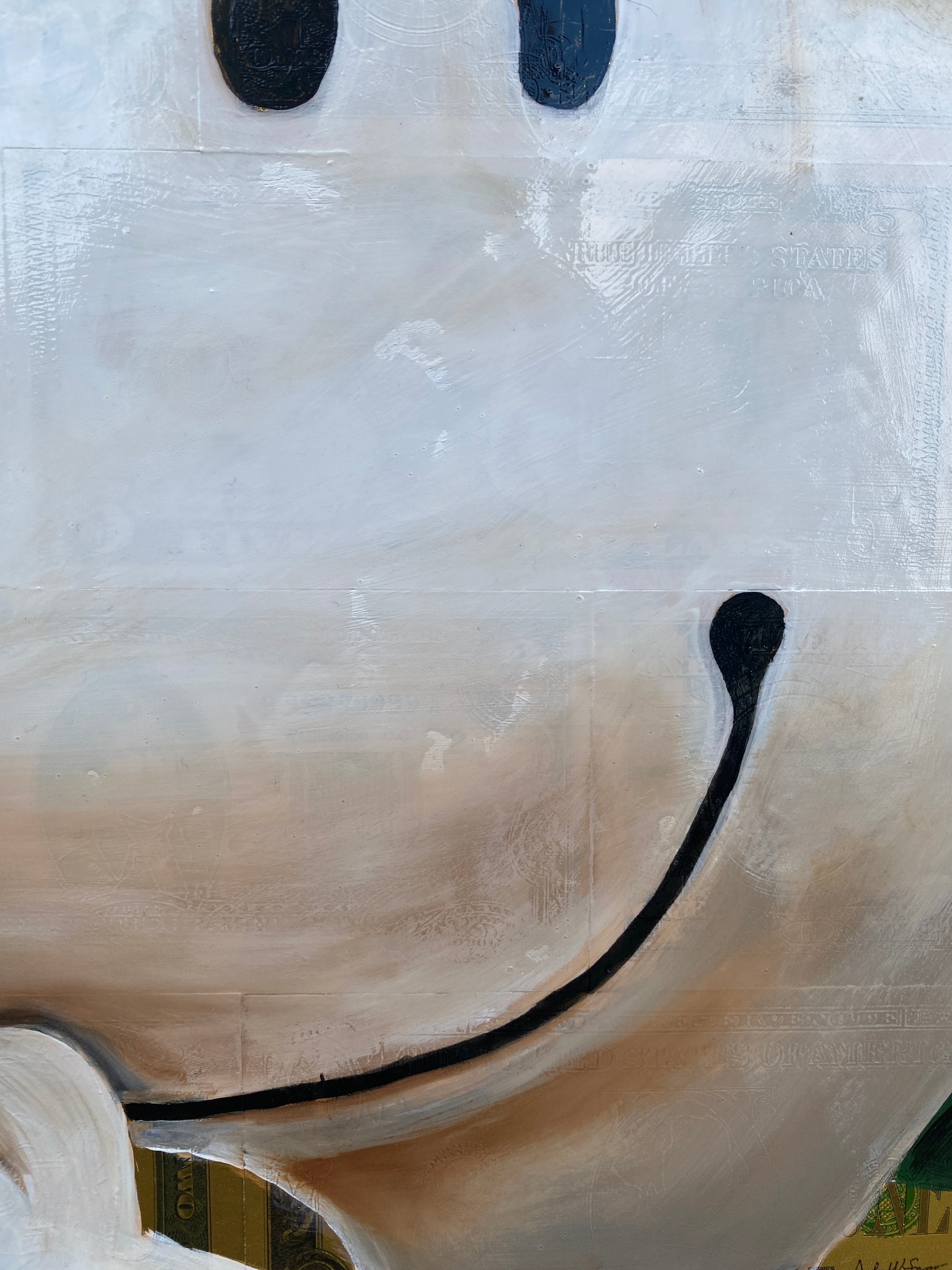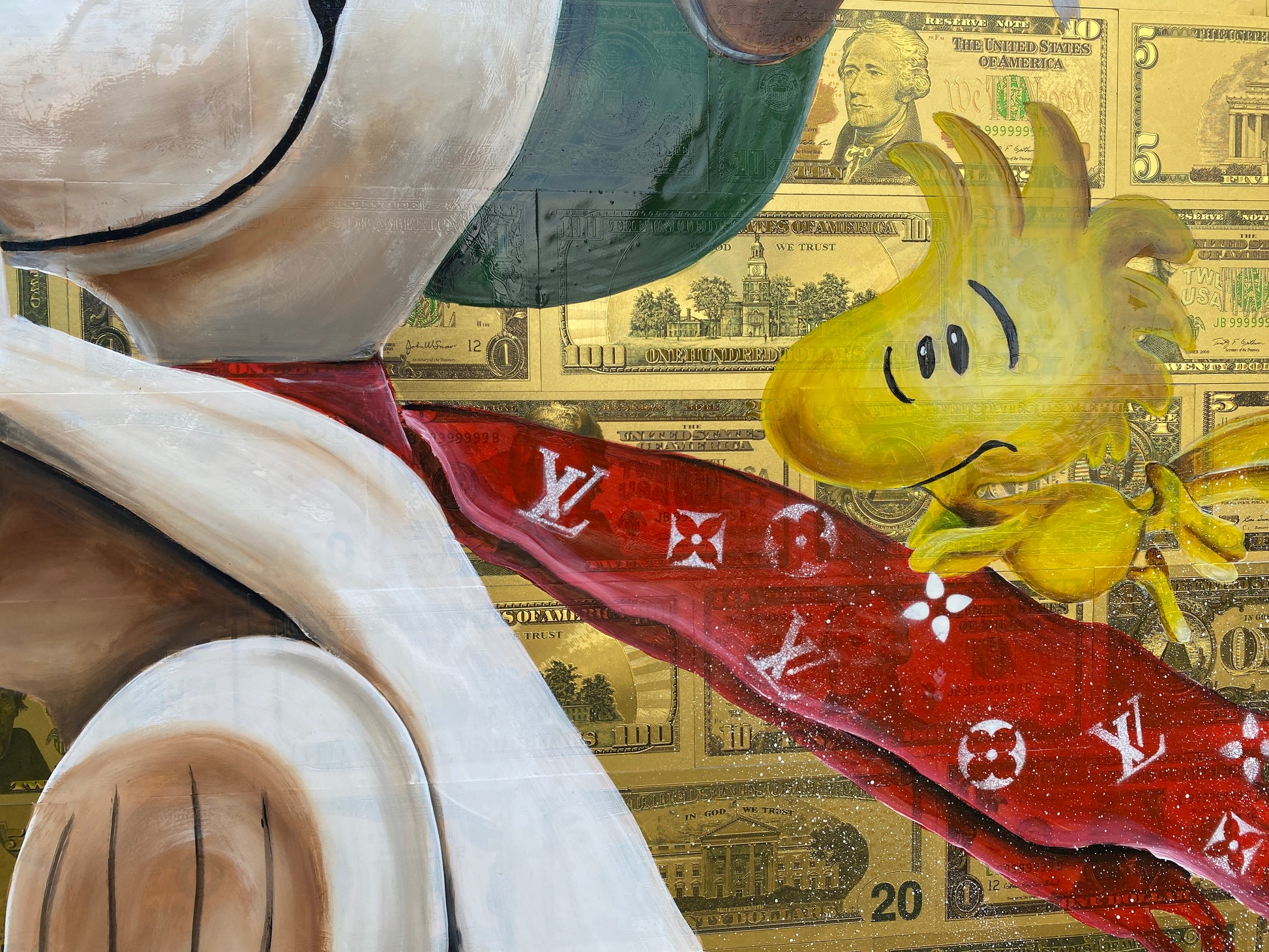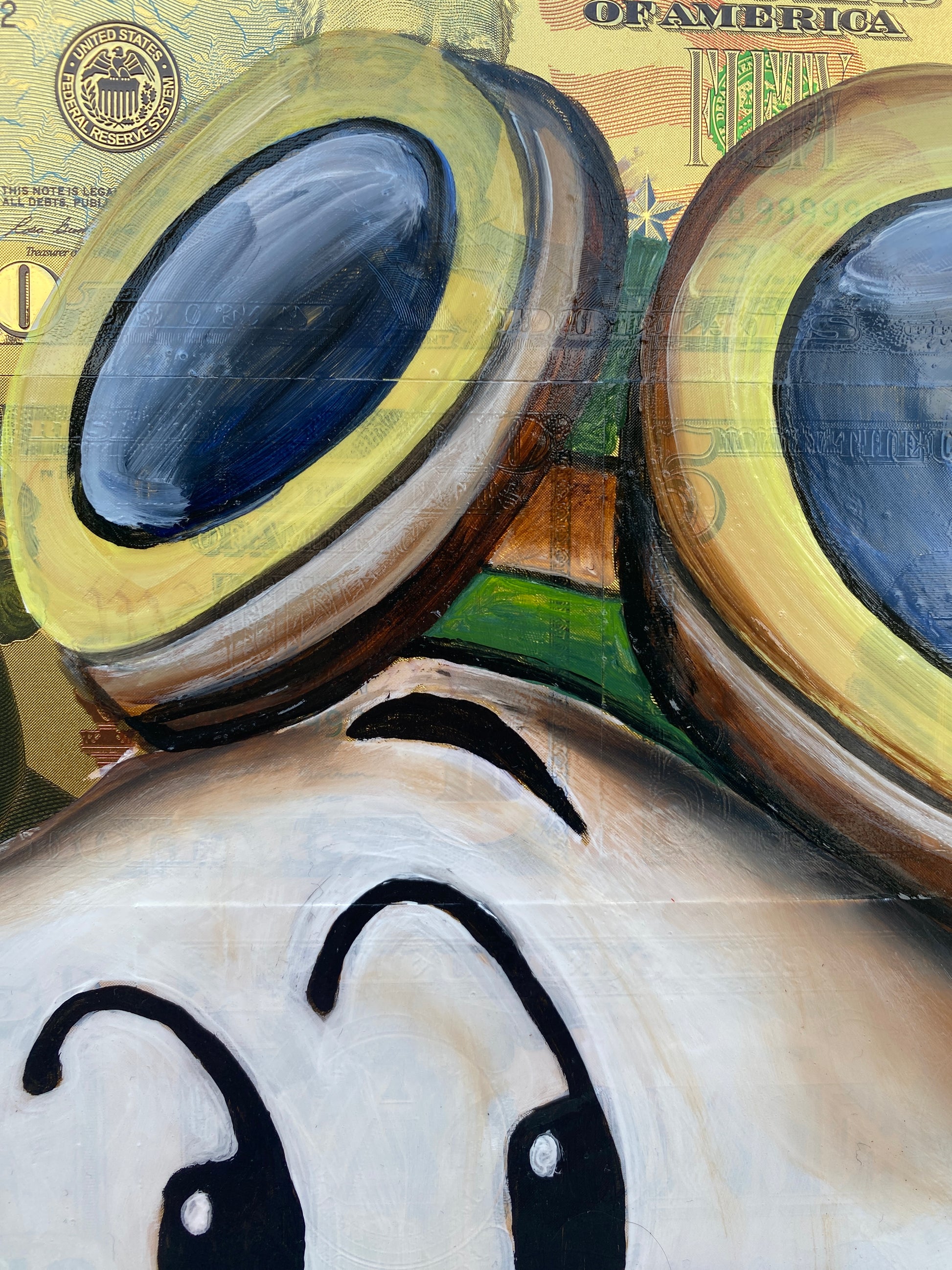Die Leinwand wurde mit 65 vergoldeten Dollarscheinen beklebt. Auf die Dollarscheine wurde das Motiv mit Acryl gemalt. Das Motiv wurde im Anschluss mit einem Gloss-Medium fixiert. Die Dollarscheine haben durch die goldene Folierung einen schimmernden Glanz.