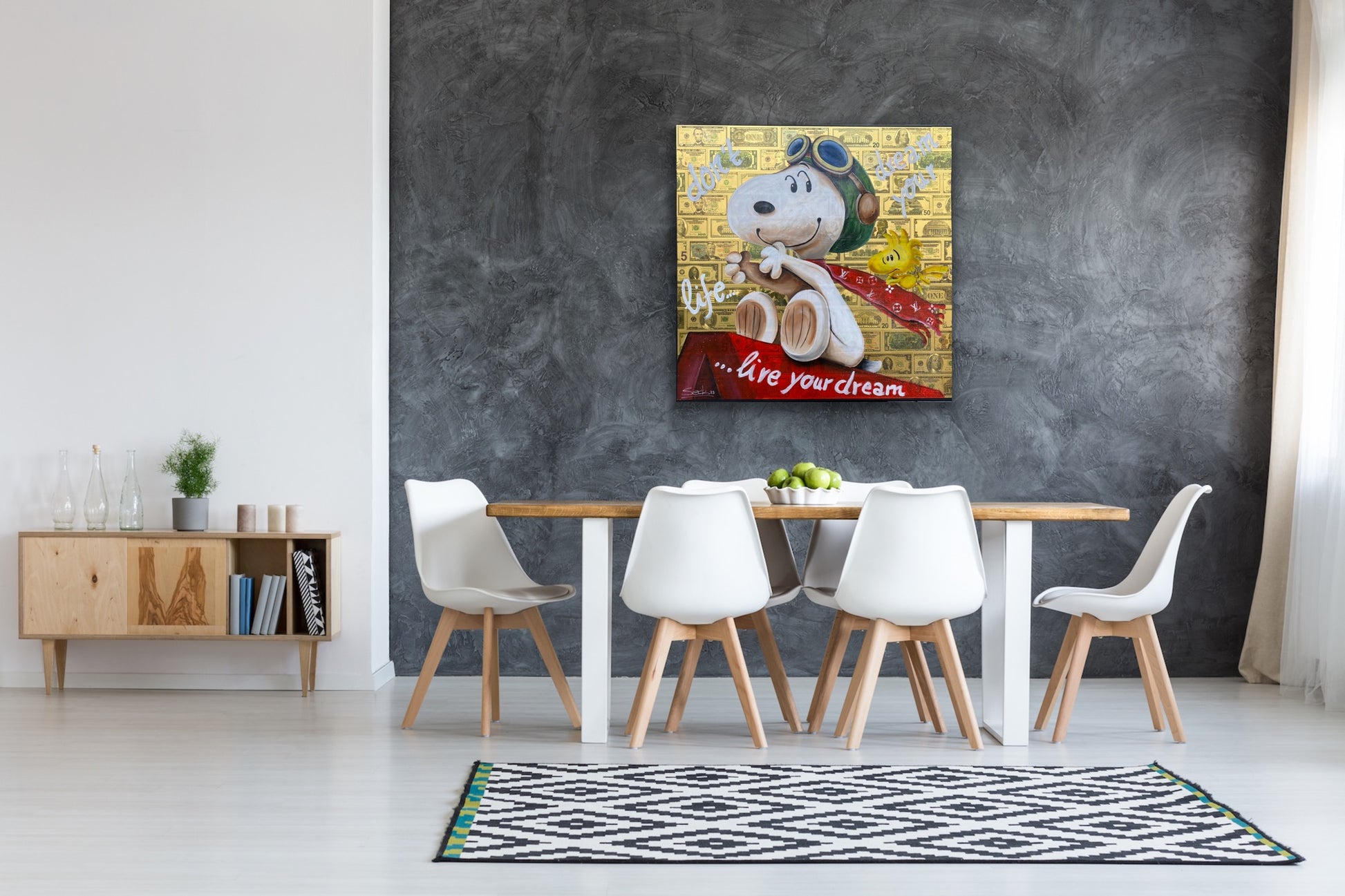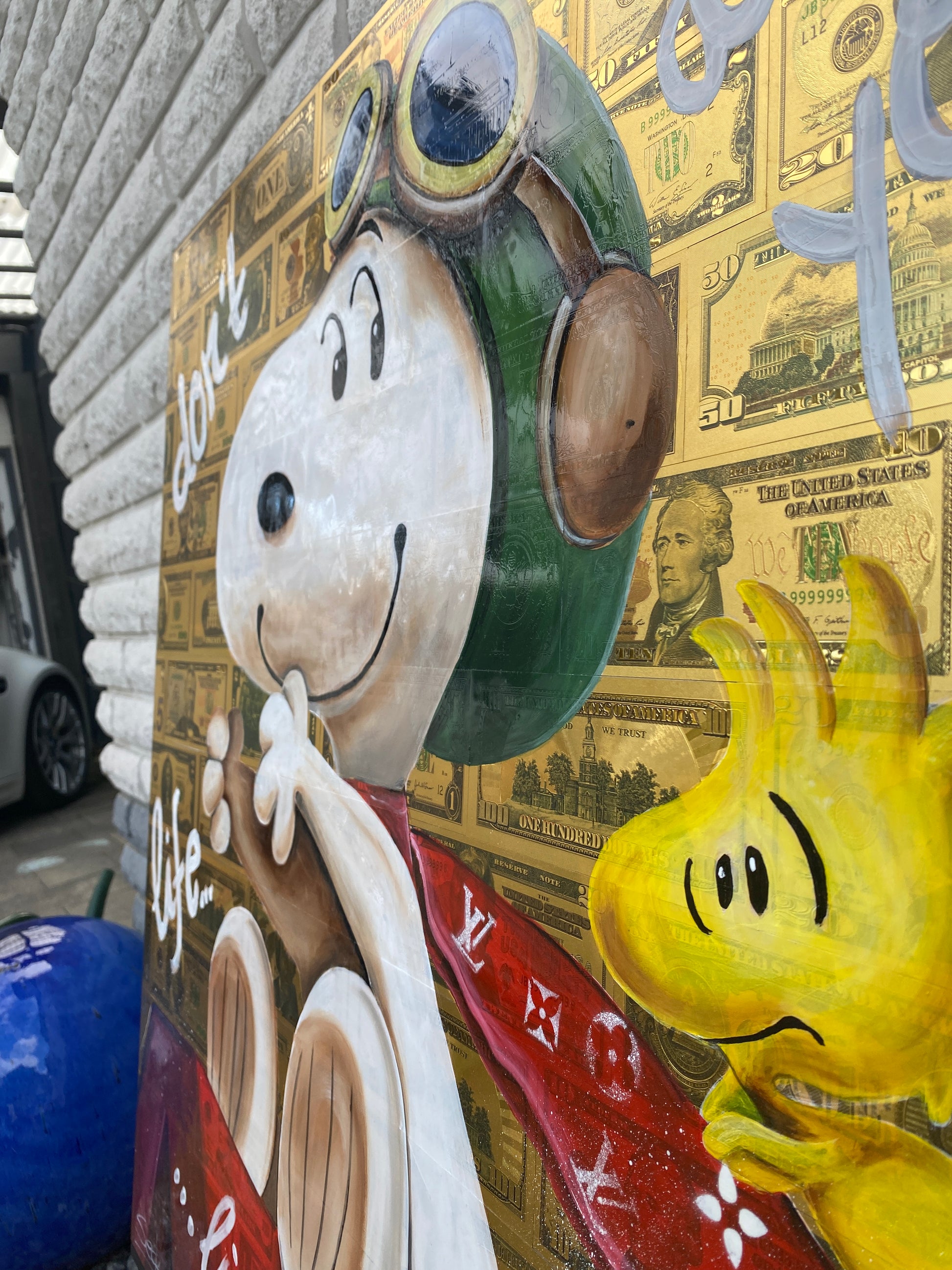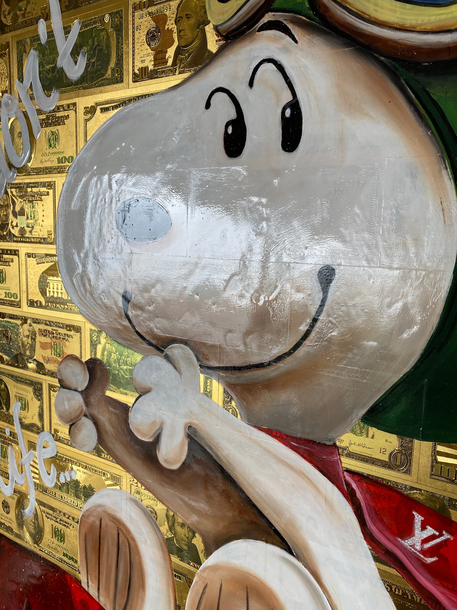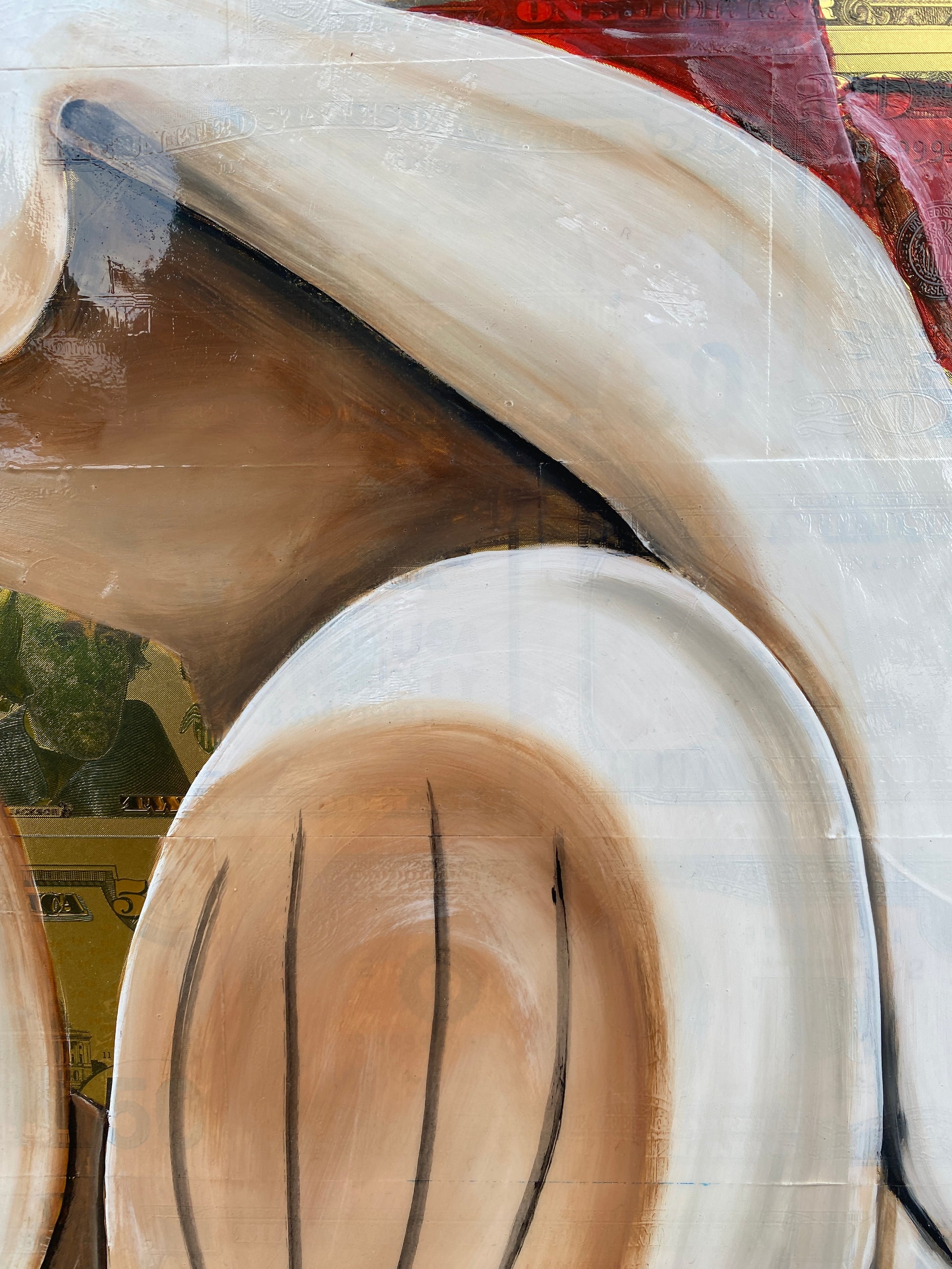 Die Leinwand wurde mit 65 vergoldeten Dollarscheinen beklebt. Auf die Dollarscheine wurde das Motiv mit Acryl gemalt. Das Motiv wurde im Anschluss mit einem Gloss-Medium fixiert. Die Dollarscheine haben durch die goldene Folierung einen schimmernden Glanz.