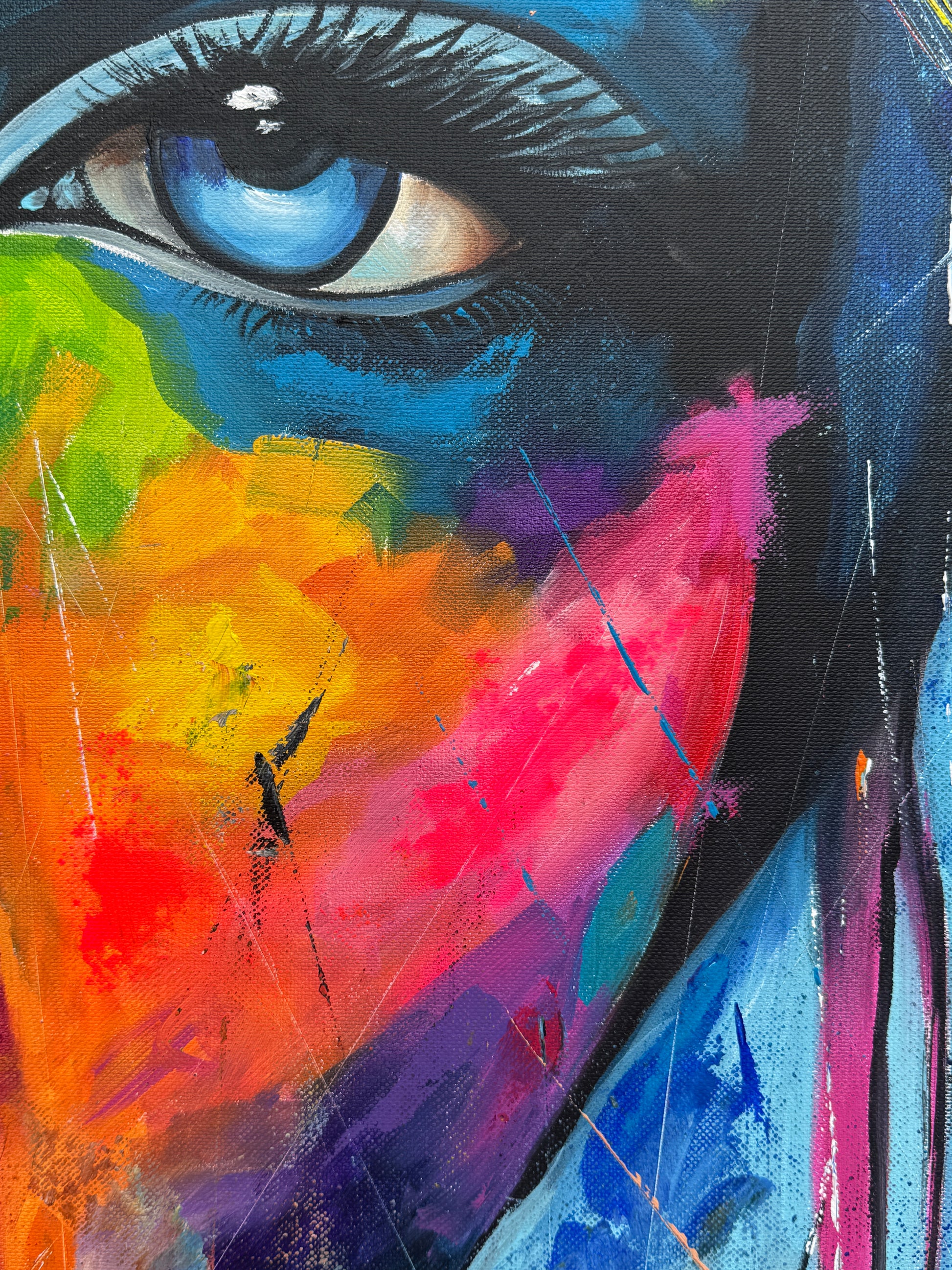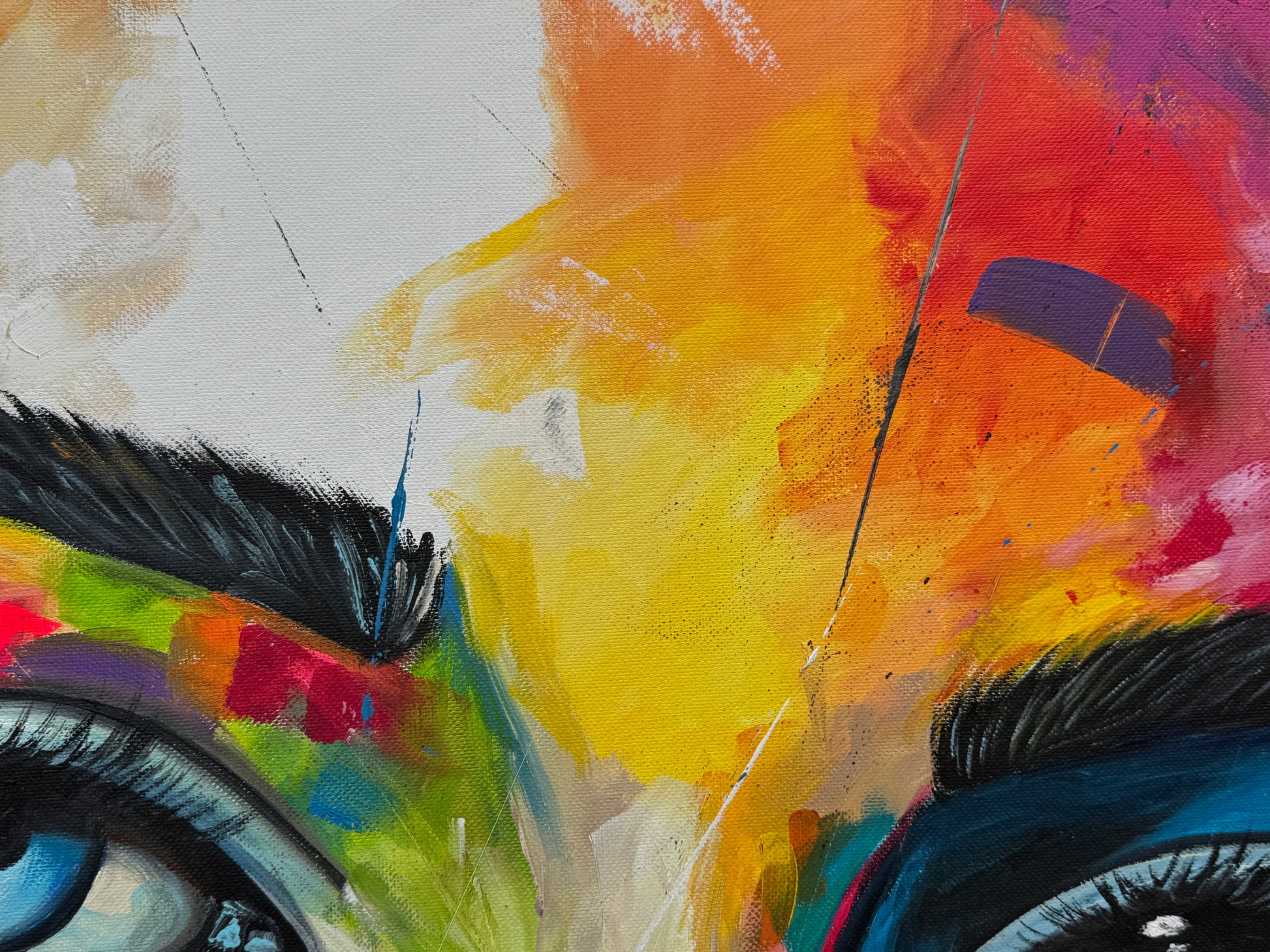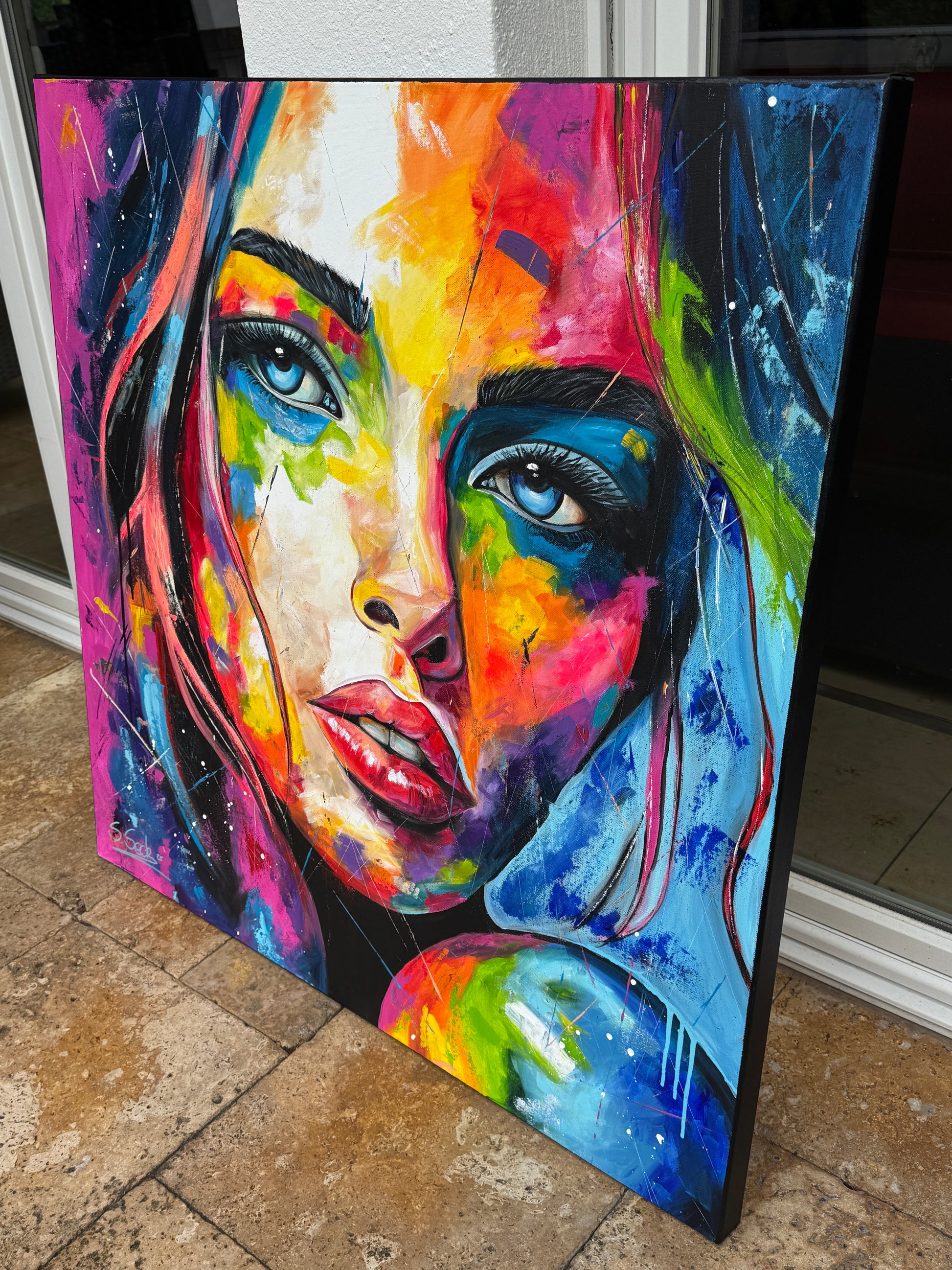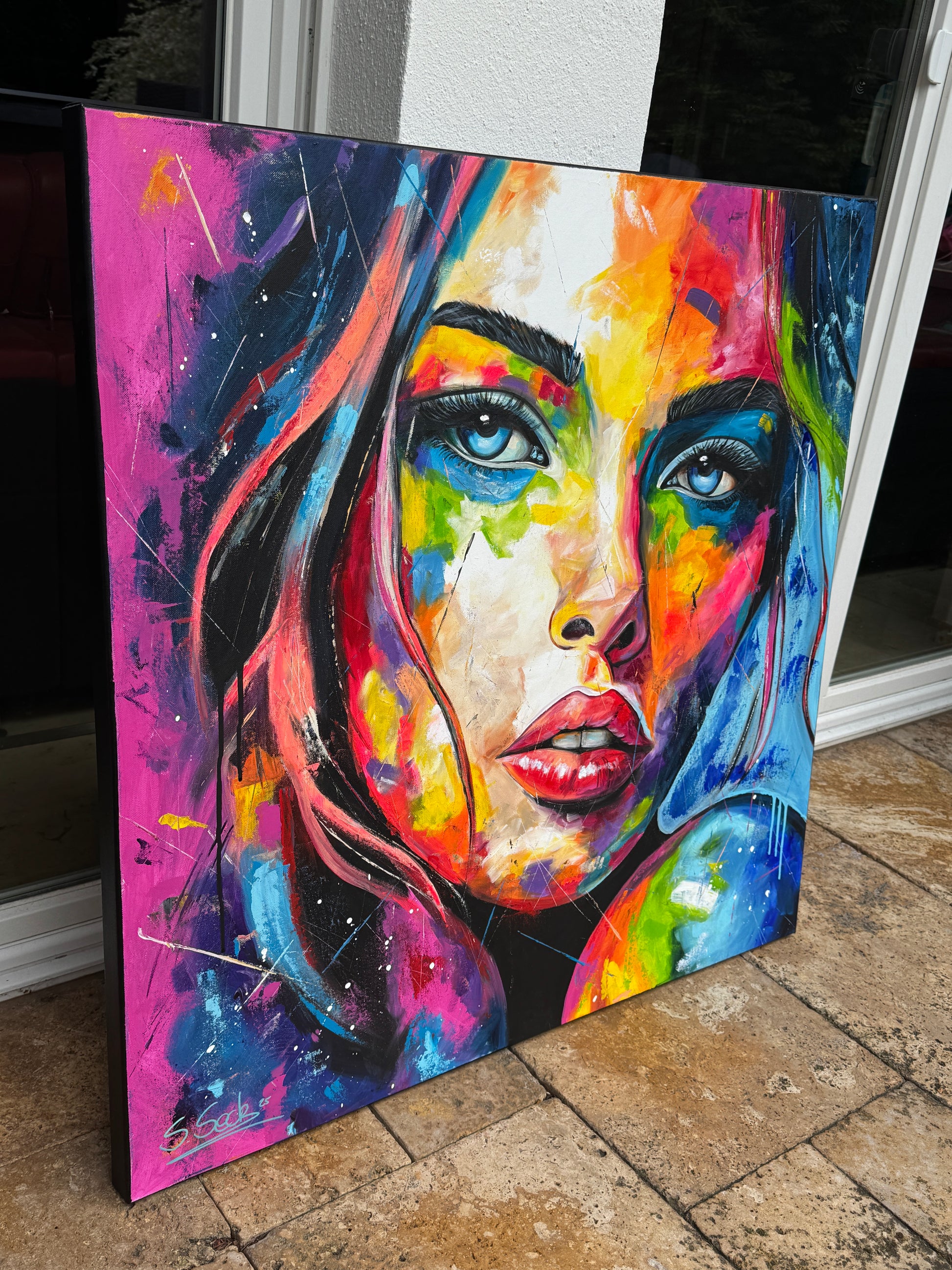 dreams....ist die Frage, wer denn hier träumt. Der Betrachter oder die Dame auf dem Bild. Fakt ist, Träume sollte jeder haben und auch versuchen, sie zu erreichen. Denn was wäre das Leben ohne Träume? Die Verschmelzung von abstrakten, expressionistischen und pop-artigen Elementen spiegelt das Auf und Ab der Gefühle wider. Jede kräftige Farbe bringt Energie und Leben in den Raum, während die intensiven Augen die Tiefe und Seele offenbaren. Es ist eine Einladung, zu träumen..:-).