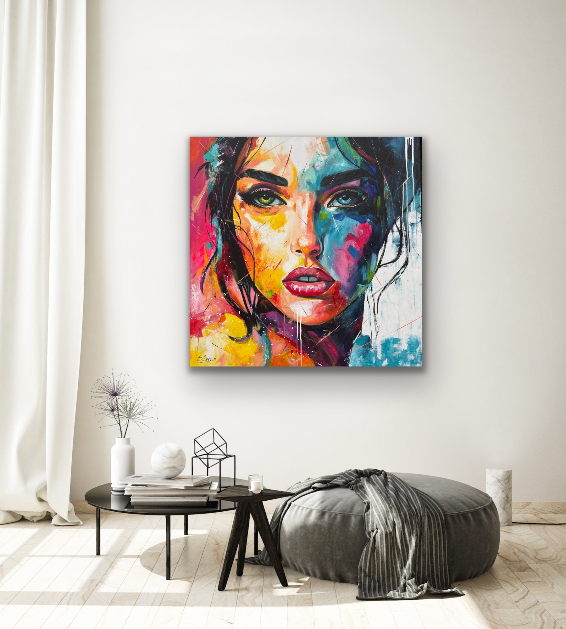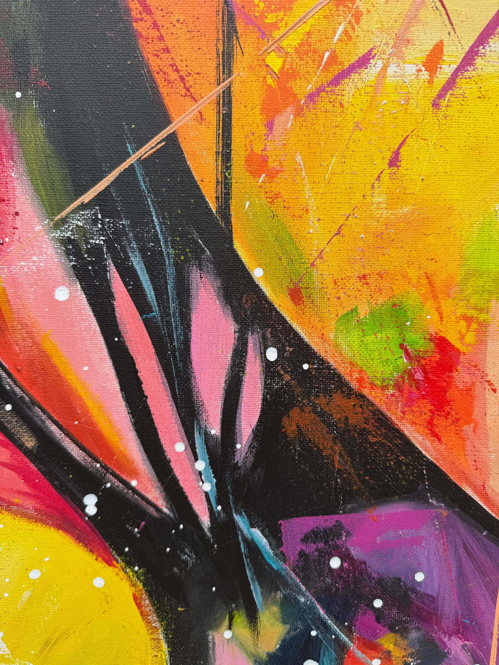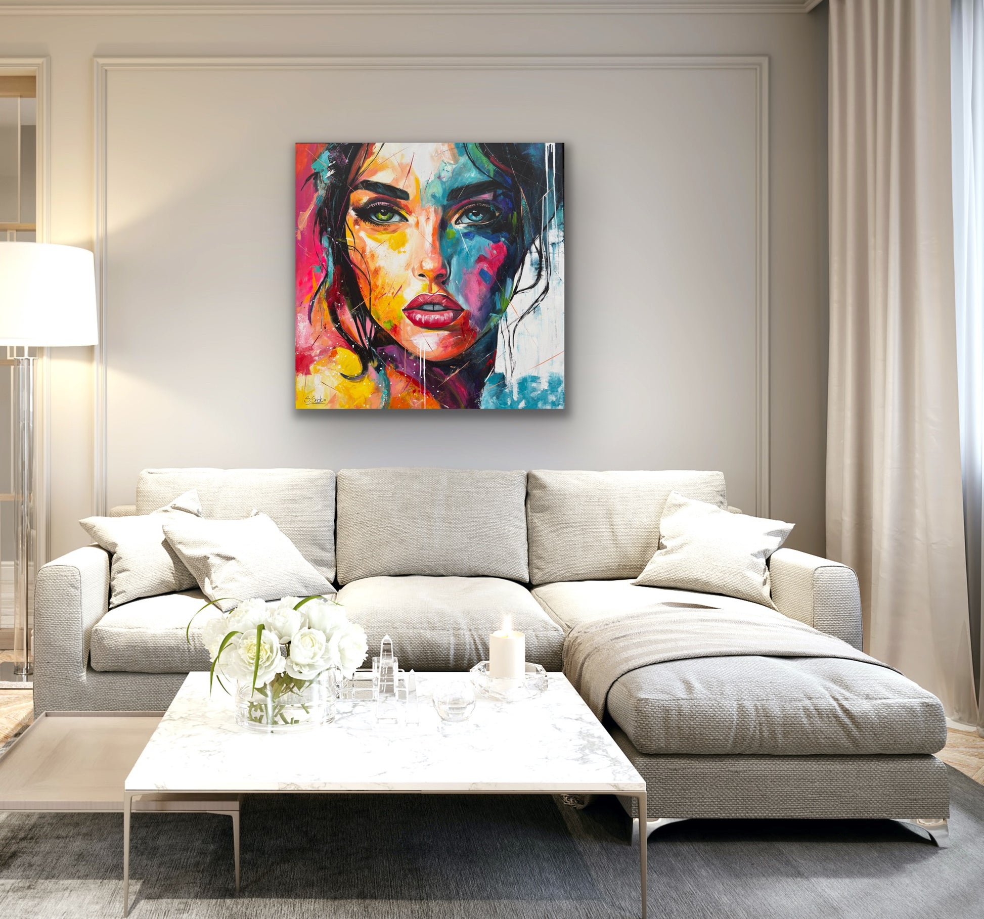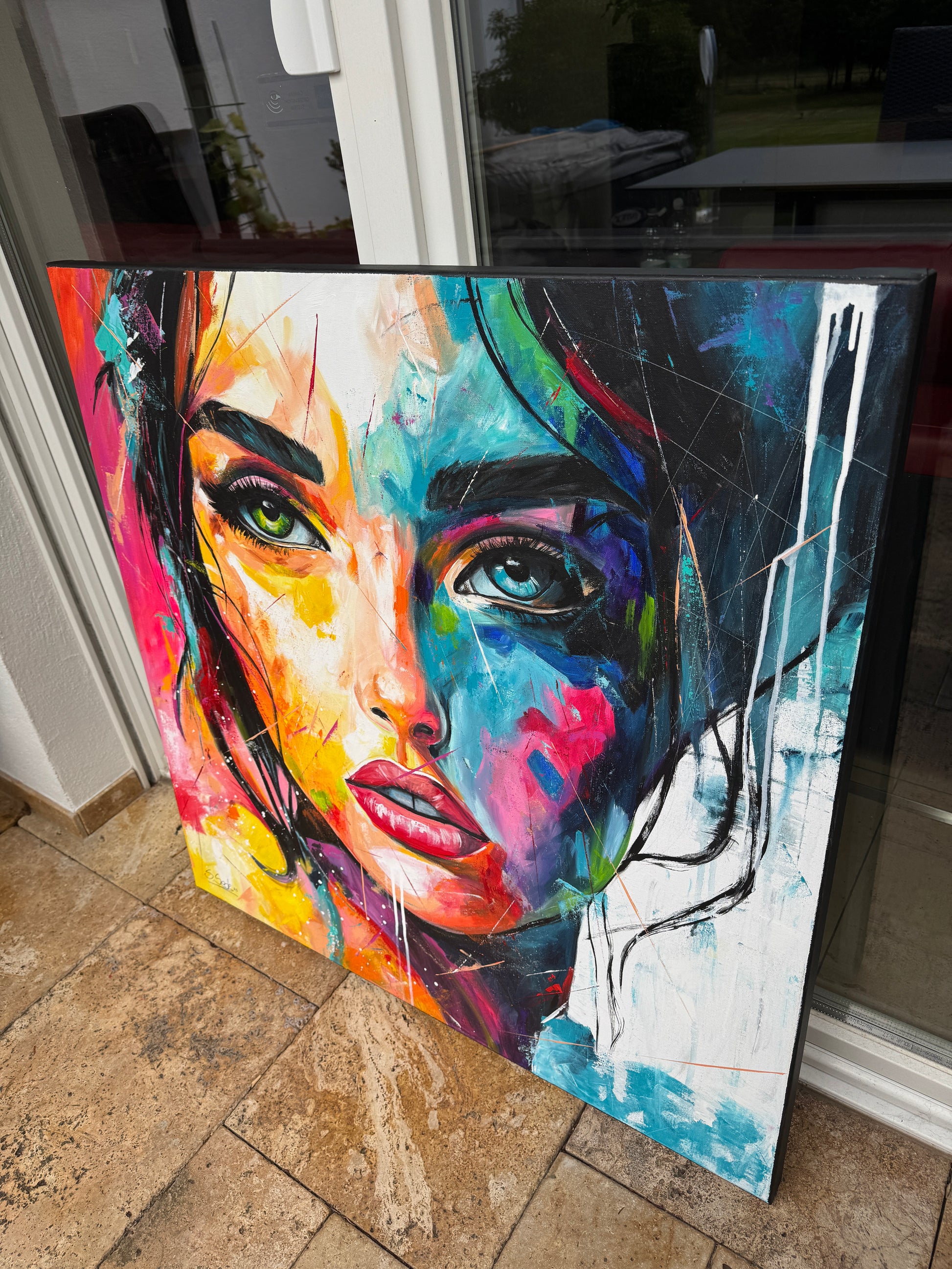 Das Werk bringt eine energiegeladene Atmosphäre in jeden Raum, die den Betrachter fesselt und zum Nachdenken anregt. Ein Kaleidoskop aus Gefühlen – lebendig und unverkennbar.