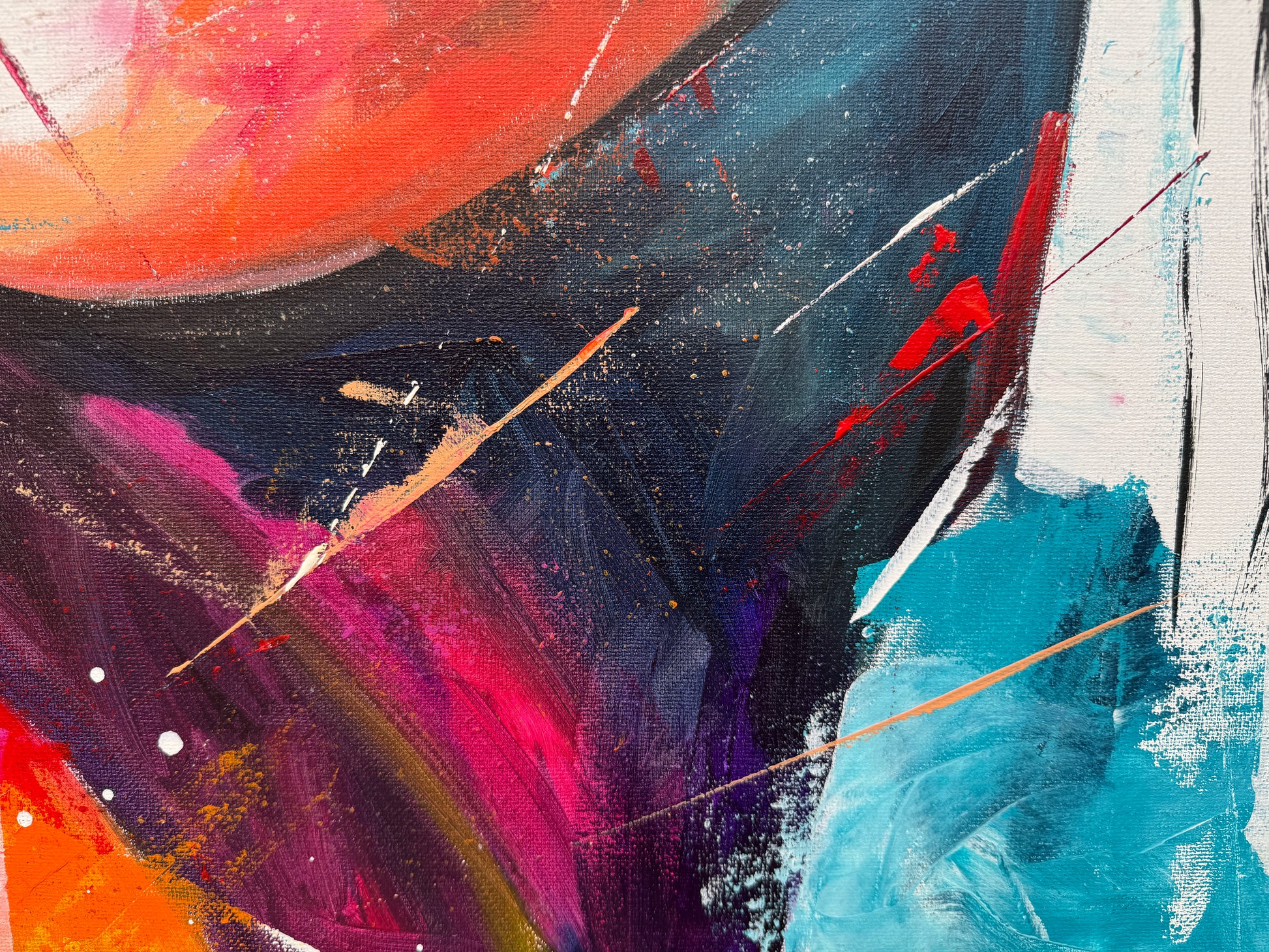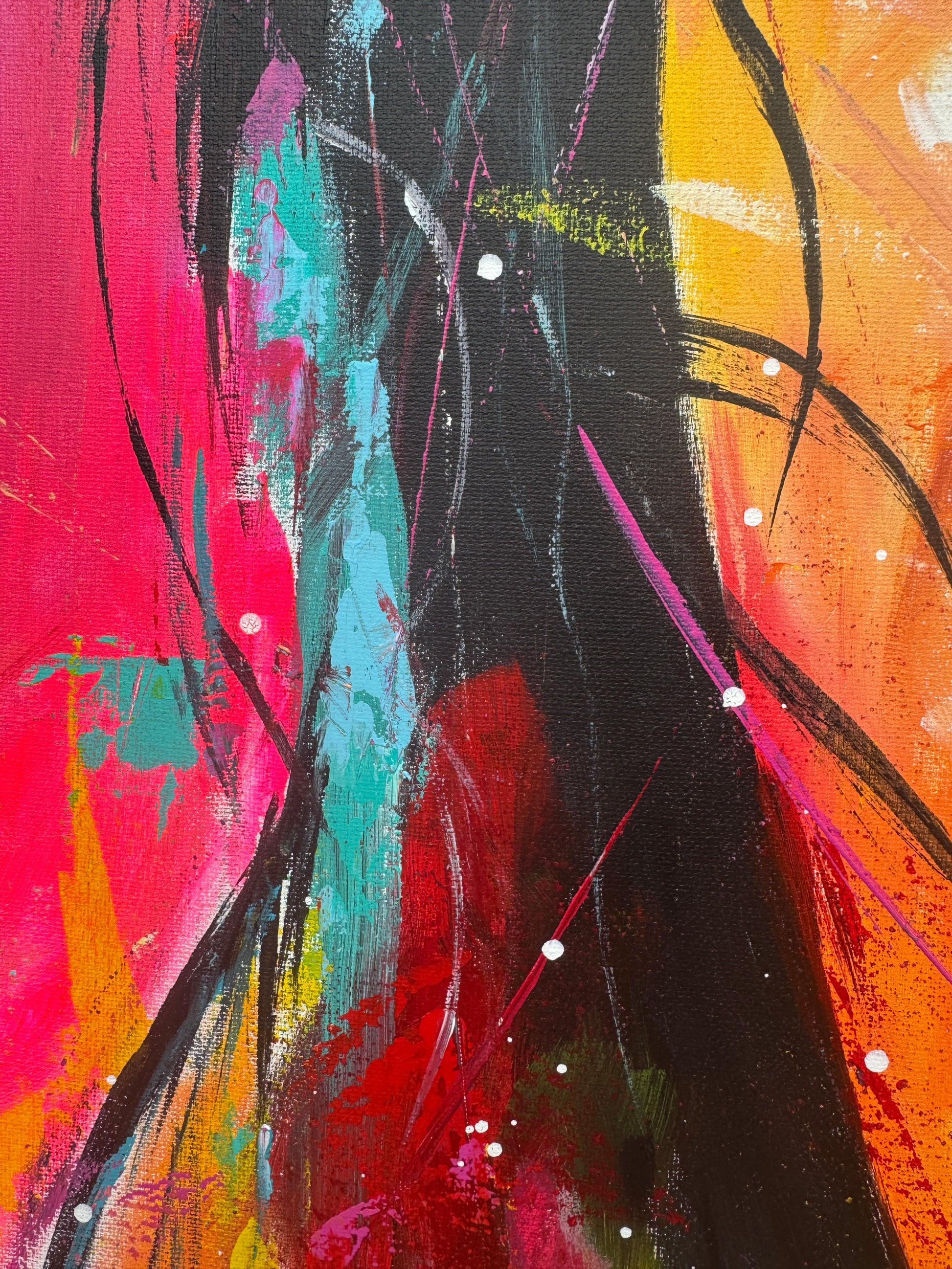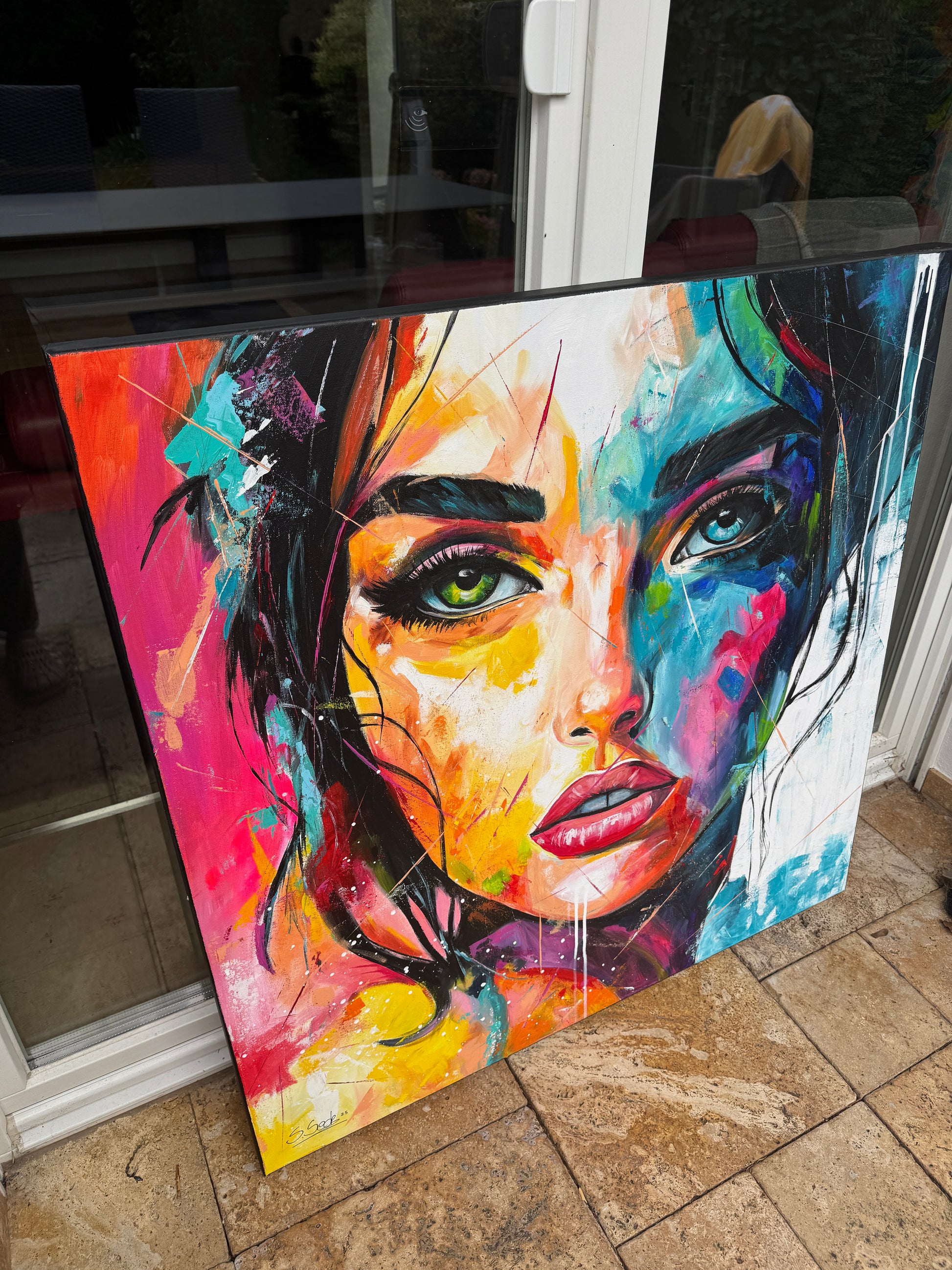 Das Werk bringt eine energiegeladene Atmosphäre in jeden Raum, die den Betrachter fesselt und zum Nachdenken anregt. Ein Kaleidoskop aus Gefühlen – lebendig und unverkennbar.