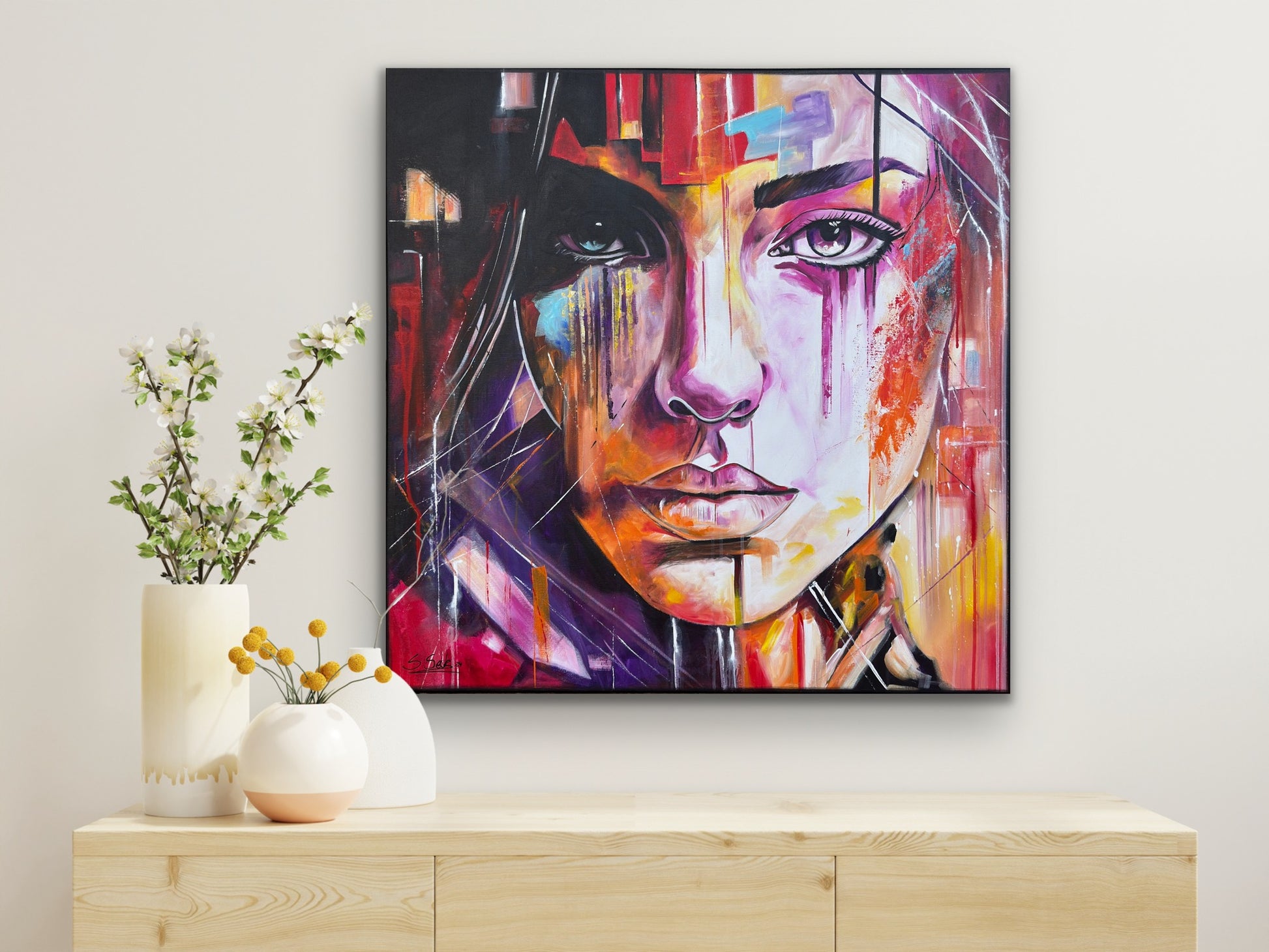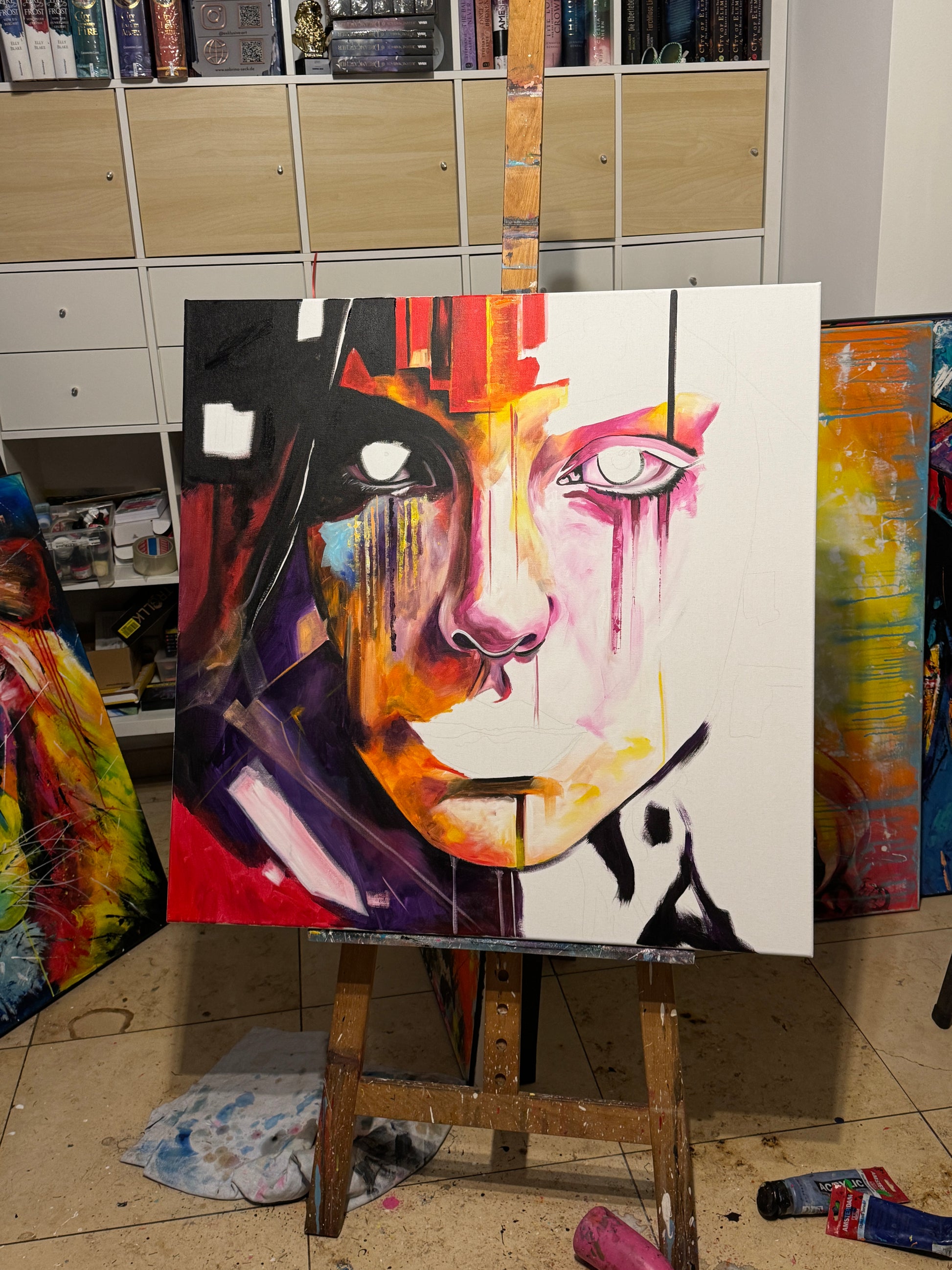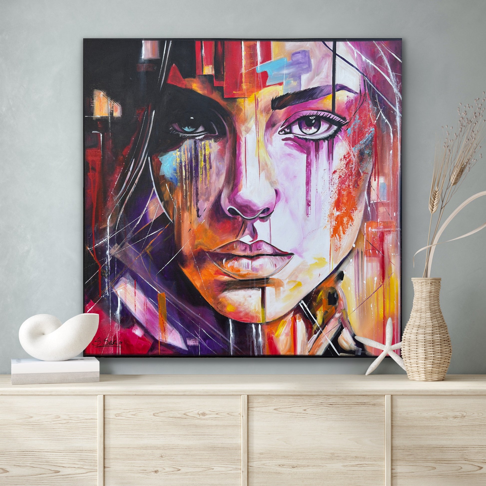 In diesem Gemälde fange ich die Vielschichtigkeit der menschlichen Emotionen ein, gemischt mit einem Hauch von Pop-Art-Flair. Die lebendigen Akrylfarben reflektieren die Tiefe und die unterschiedlichen Facetten unserer Seele. Die abstrakte und expressionistische Herangehensweise verleiht dem Werk eine dynamische und dennoch mysteriöse Atmosphäre, die den Betrachter fesselt und zum Nachdenken anregt. In jedem Raum wird dieses Kunstwerk ein Gefühl von Energie und Inspiration bringen.