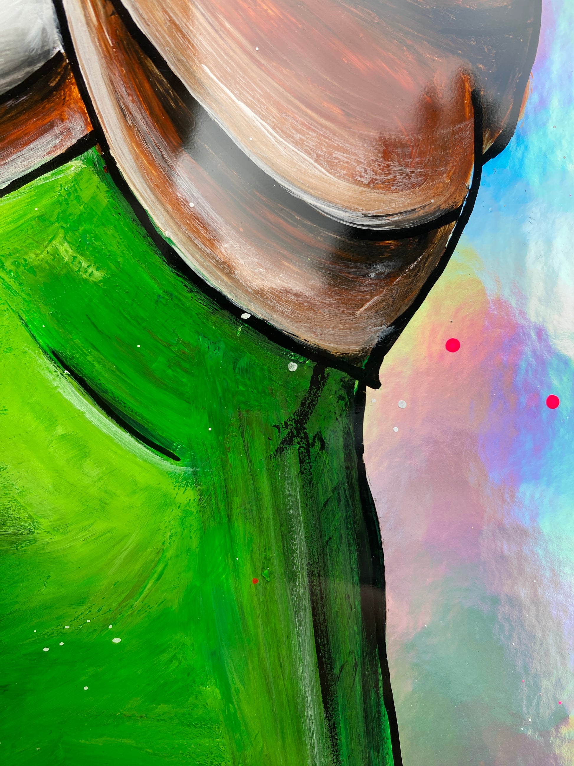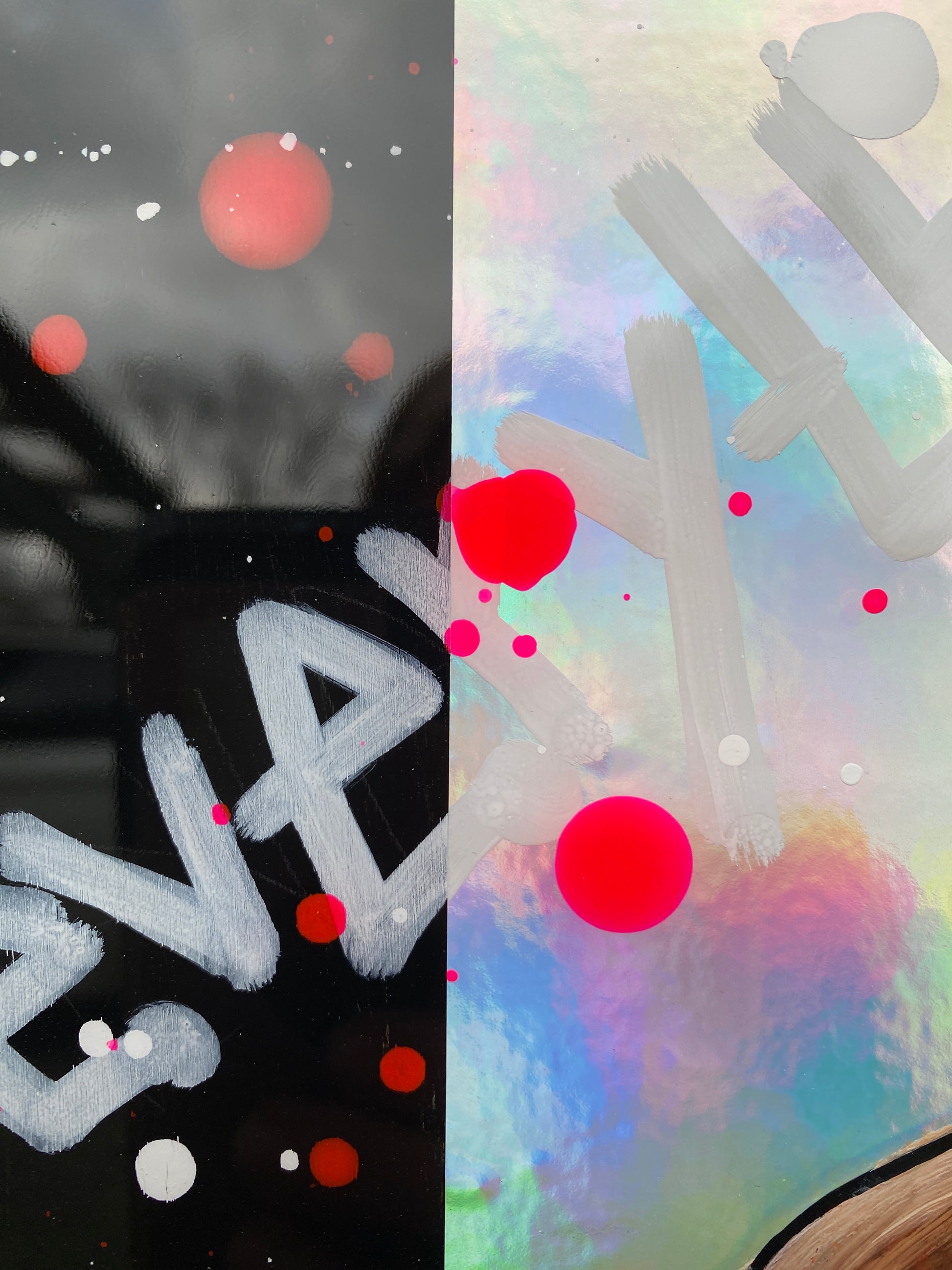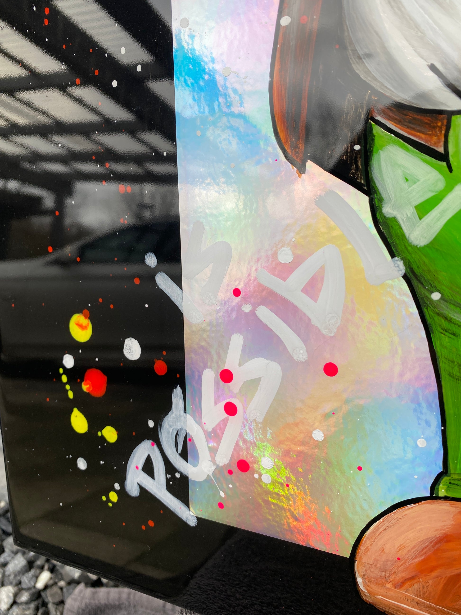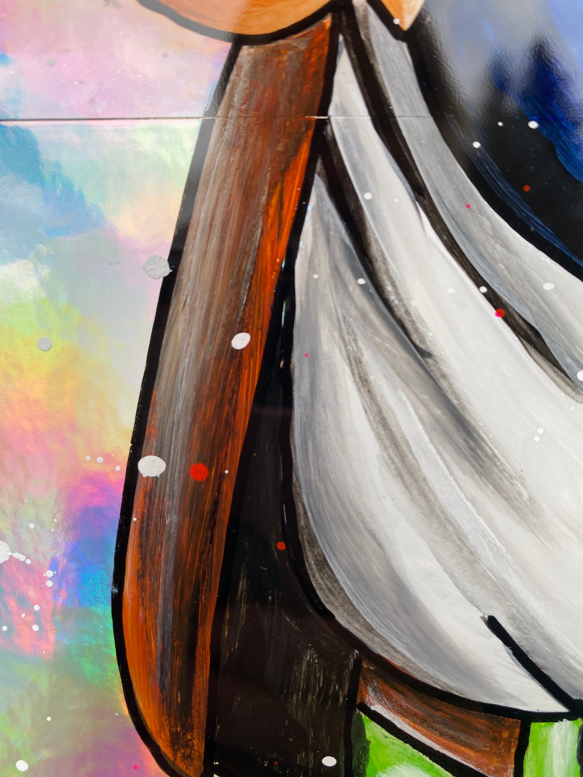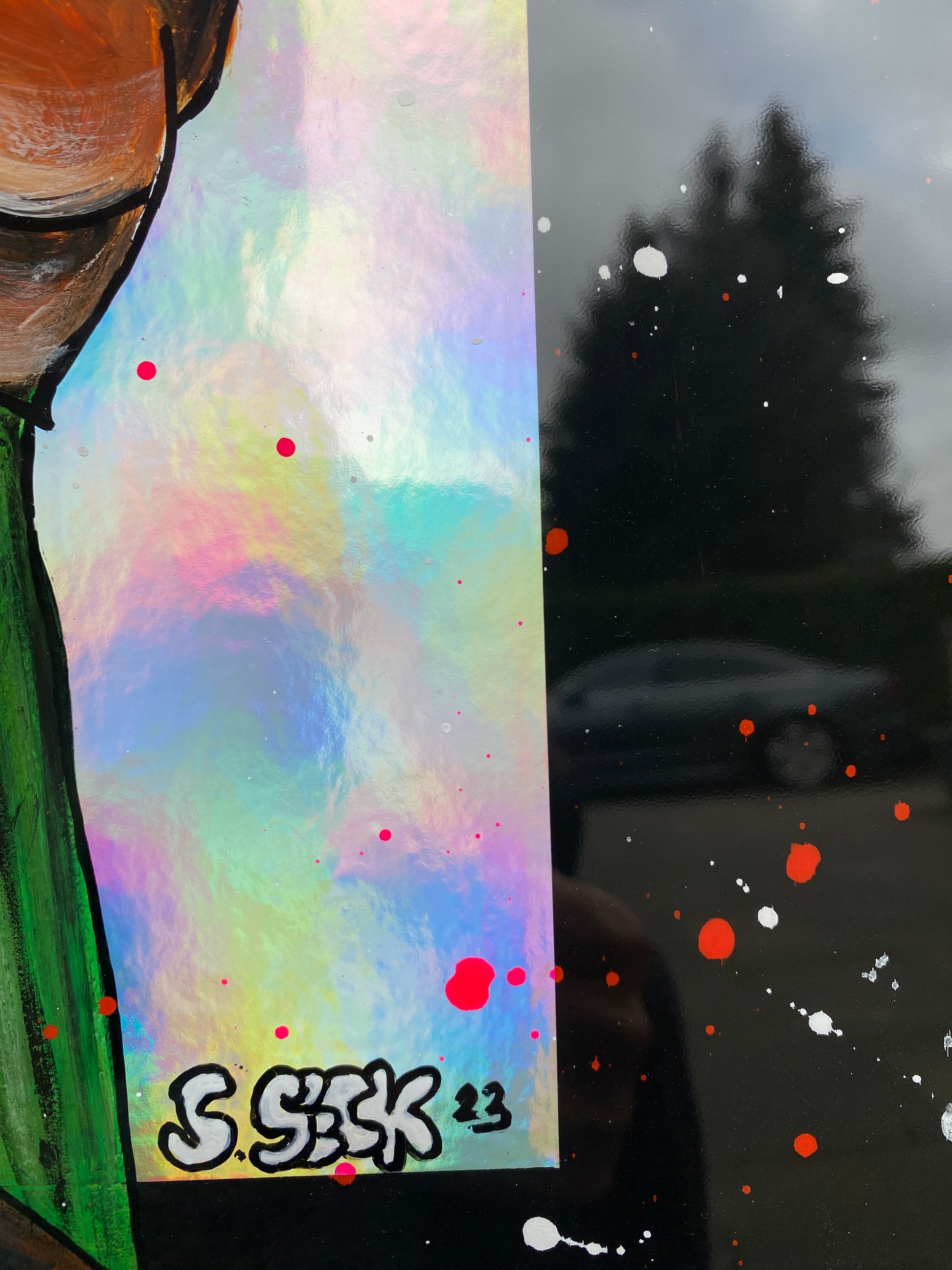 Dieses Werk wurde auf eine Holzleinwand gemalt. Der Hintergrund ist neben dem schwarz mit einer besonderen Folie versehen, die bei Bewegung in vielen verschiedenen Farben schimmert. Die Fotos zeigen diverse Farbgebungen, die entstehen können, wenn man an dem Werk vorbeiläuft.