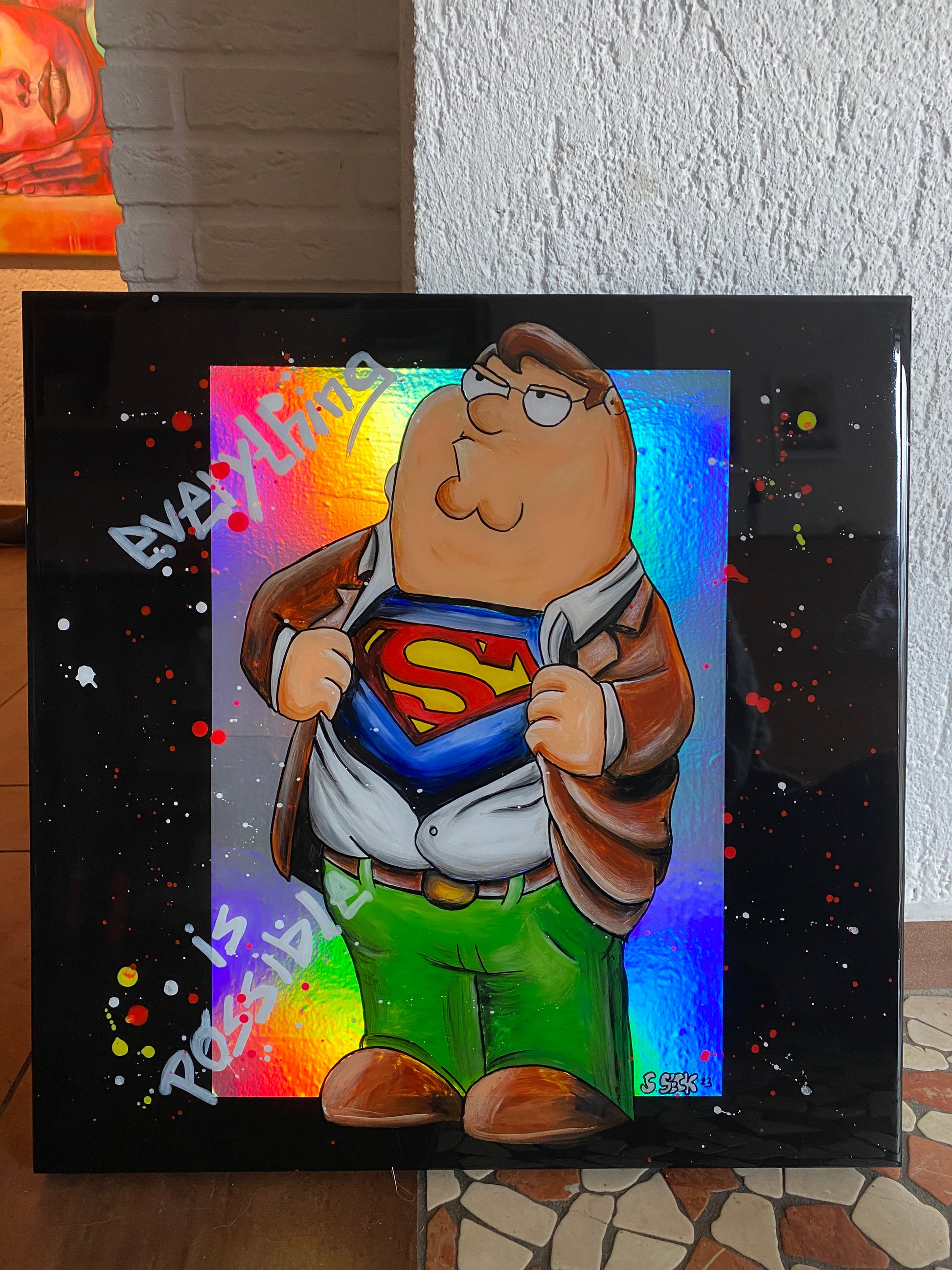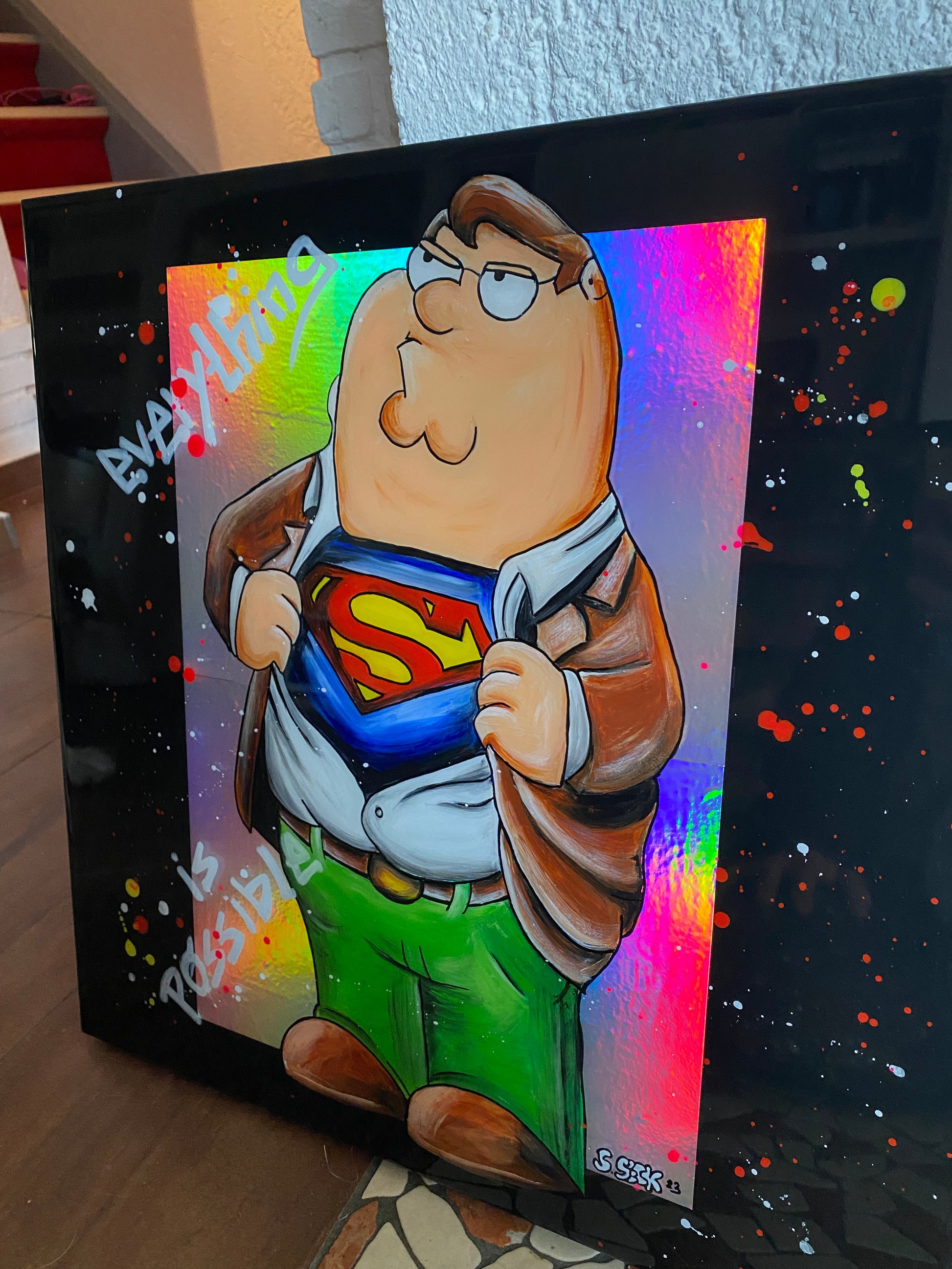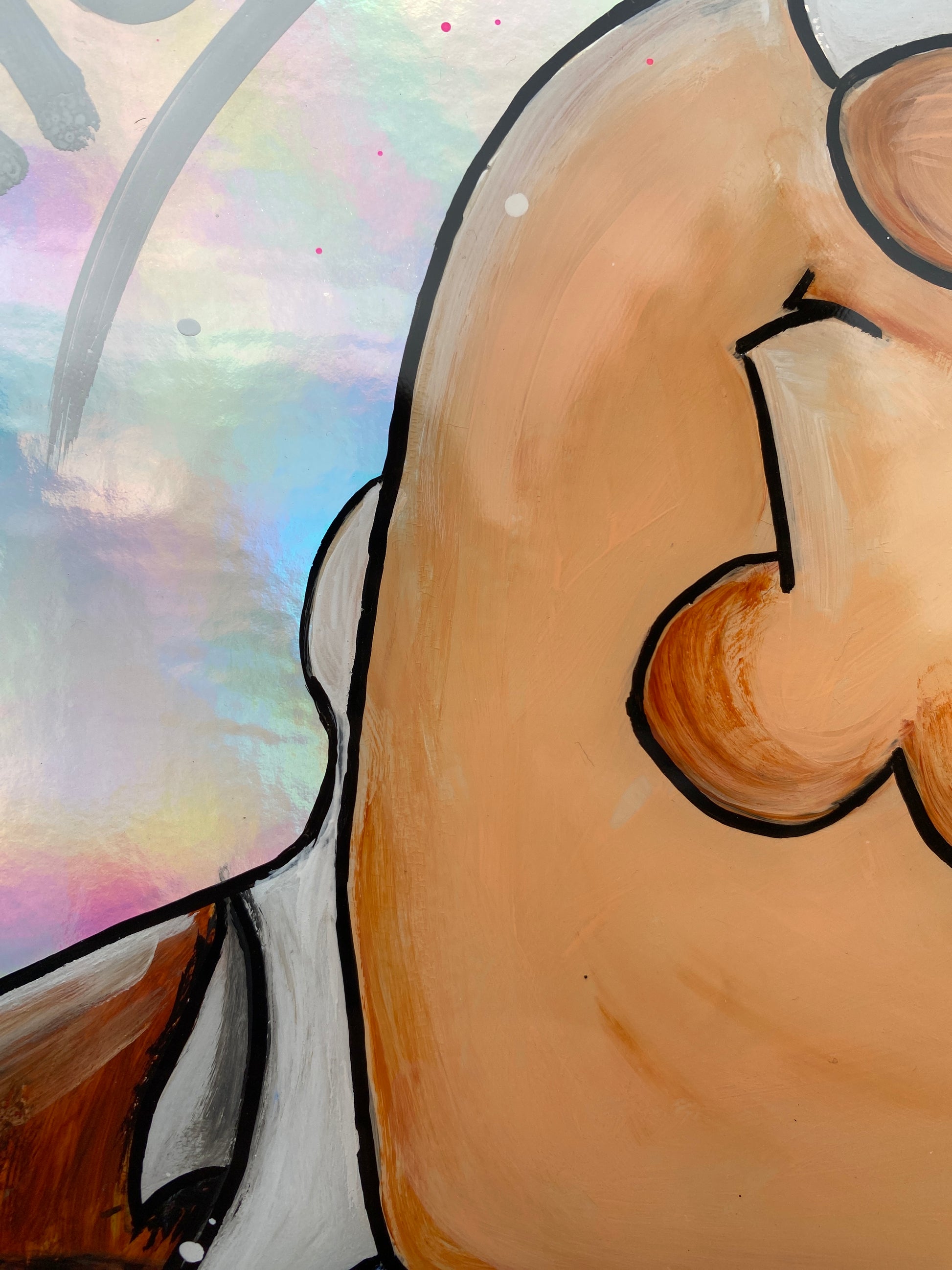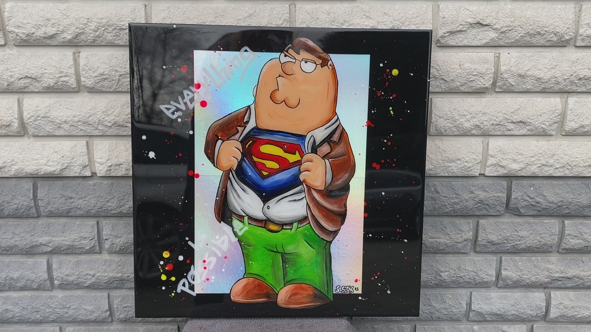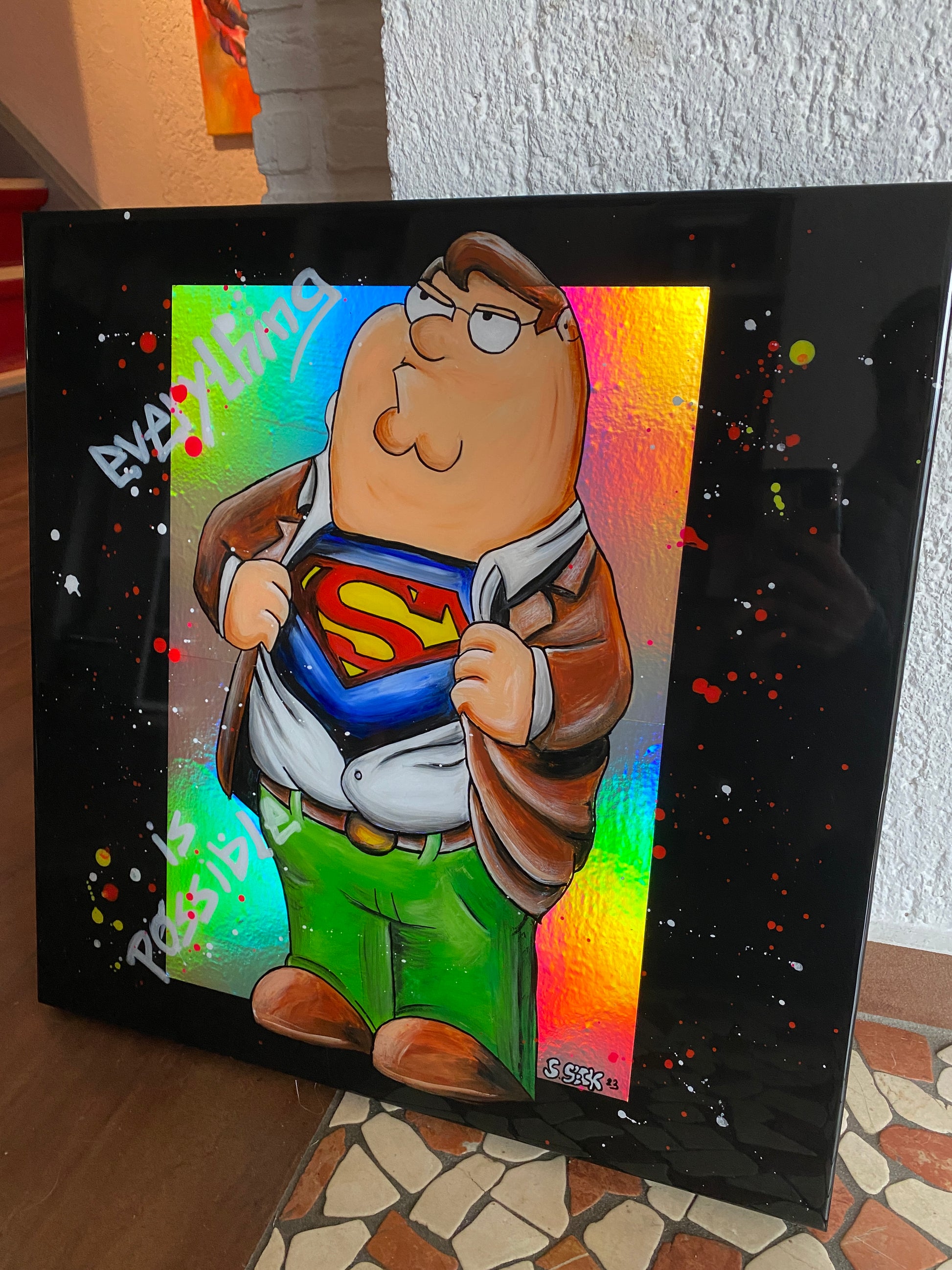 Dieses Werk wurde auf eine Holzleinwand gemalt. Der Hintergrund ist neben dem schwarz mit einer besonderen Folie versehen, die bei Bewegung in vielen verschiedenen Farben schimmert. Die Fotos zeigen diverse Farbgebungen, die entstehen können, wenn man an dem Werk vorbeiläuft.