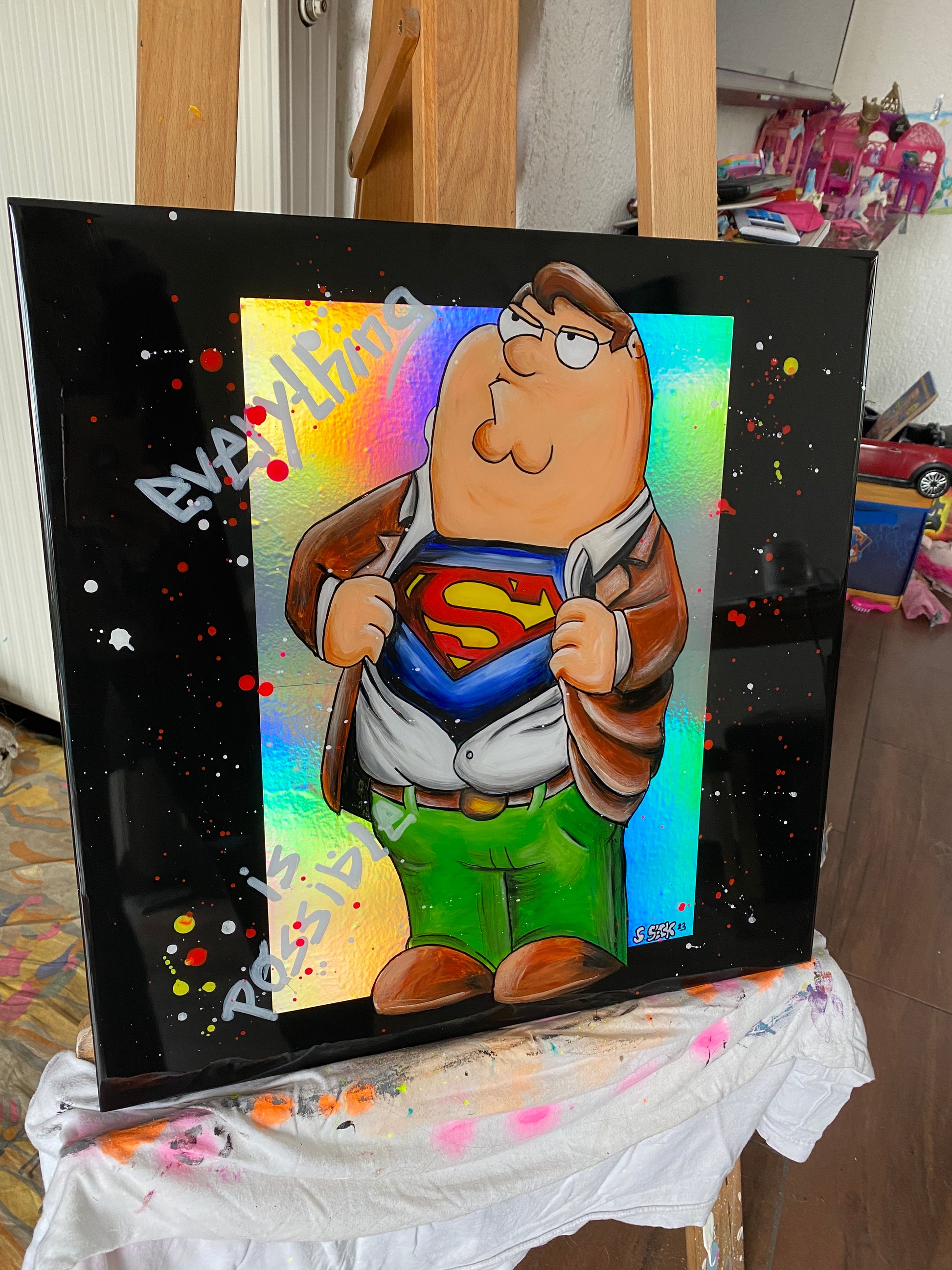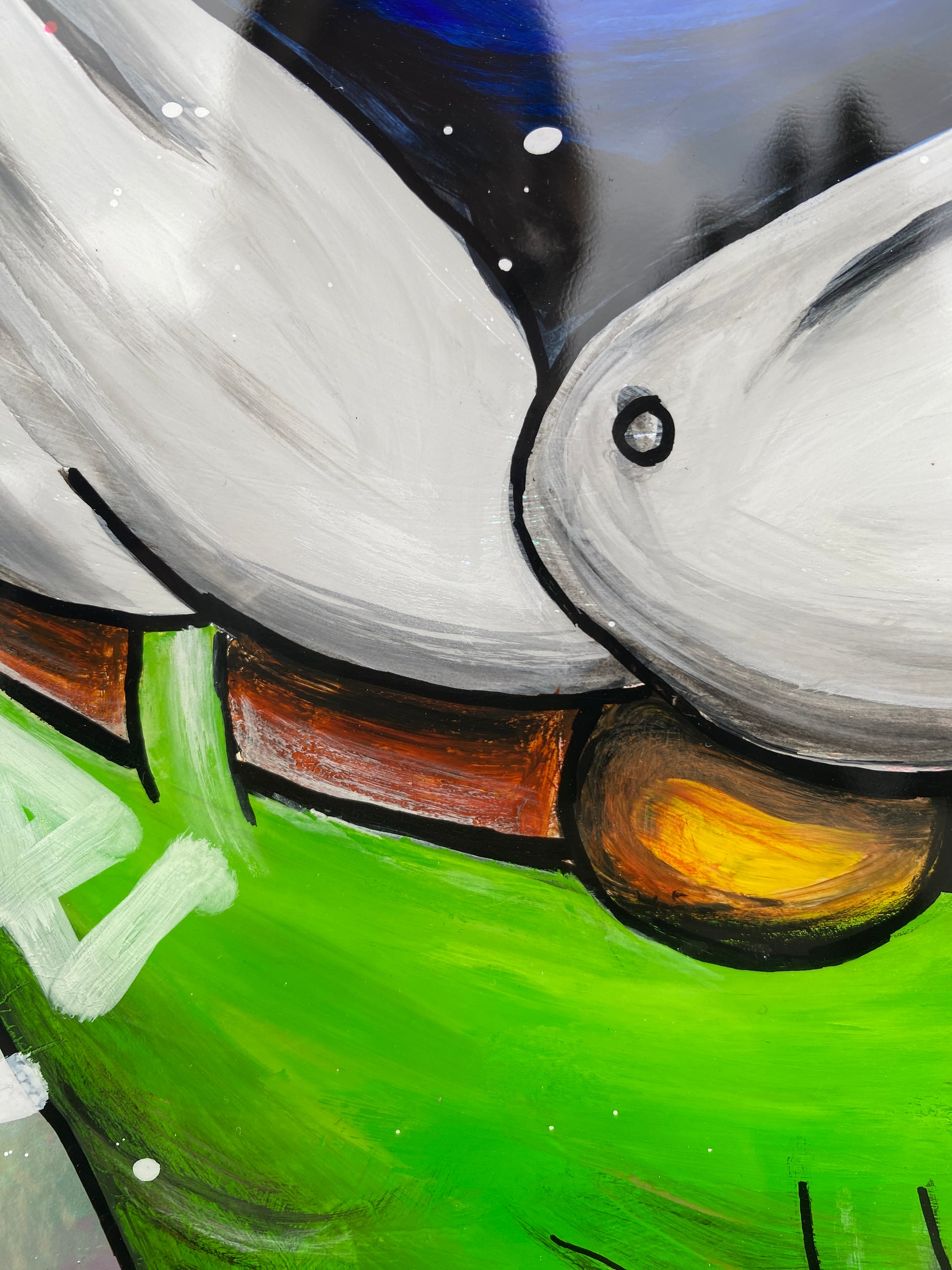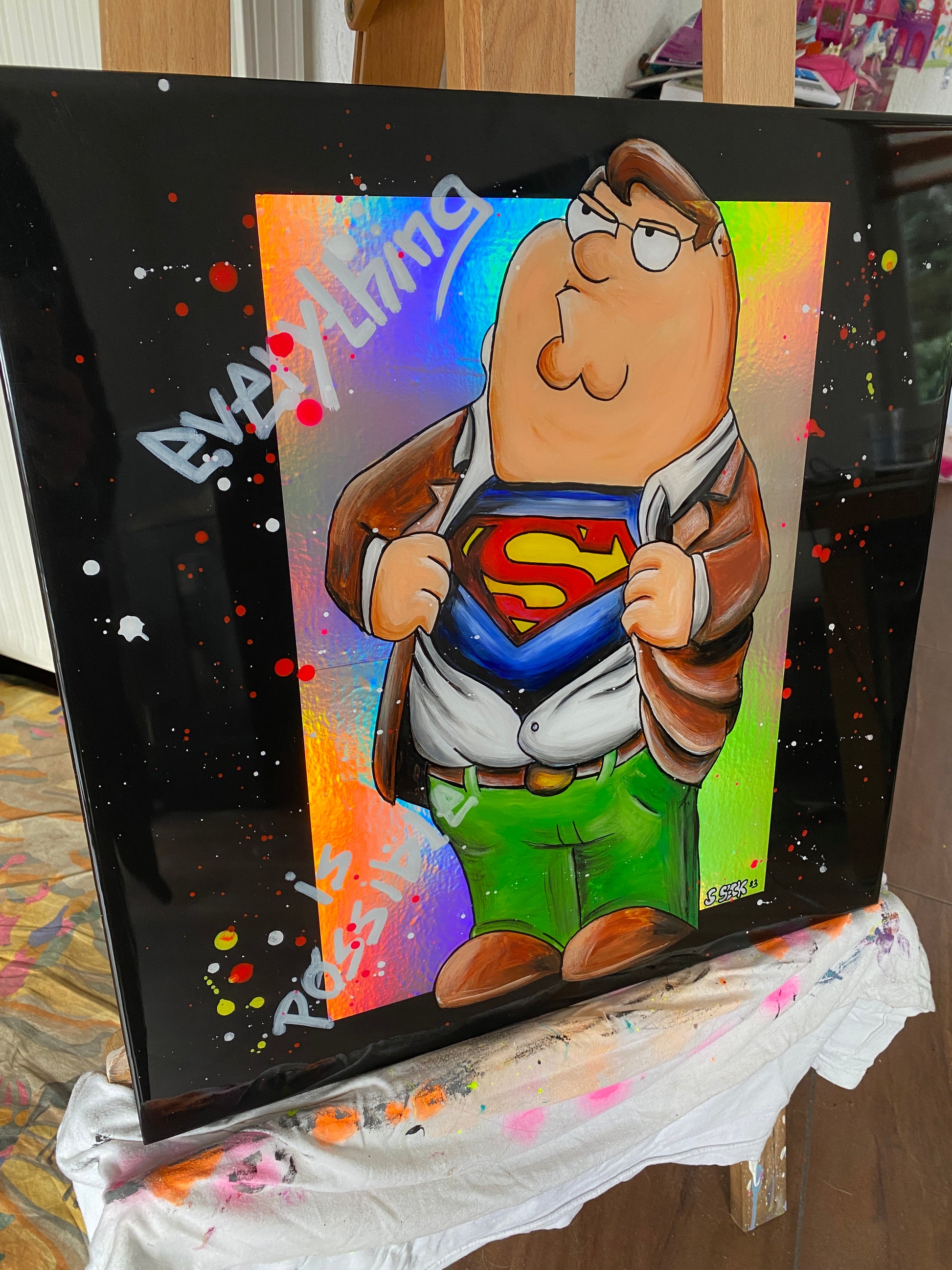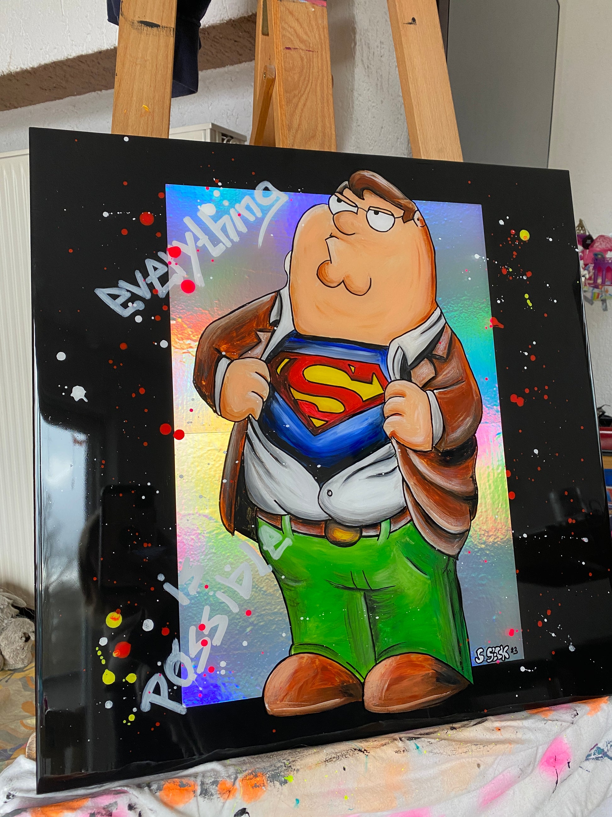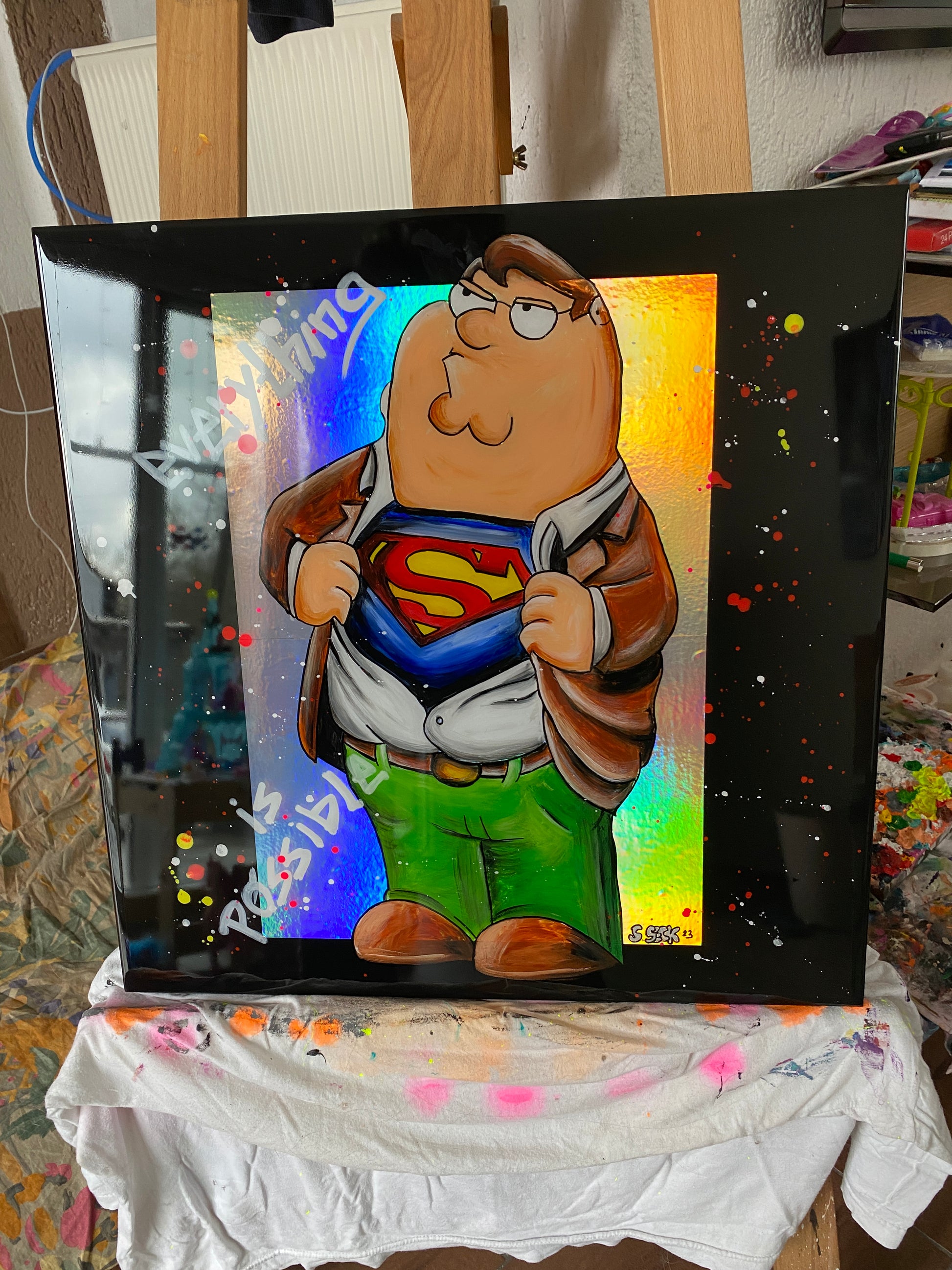 Dieses Werk wurde auf eine Holzleinwand gemalt. Der Hintergrund ist neben dem schwarz mit einer besonderen Folie versehen, die bei Bewegung in vielen verschiedenen Farben schimmert. Die Fotos zeigen diverse Farbgebungen, die entstehen können, wenn man an dem Werk vorbeiläuft.