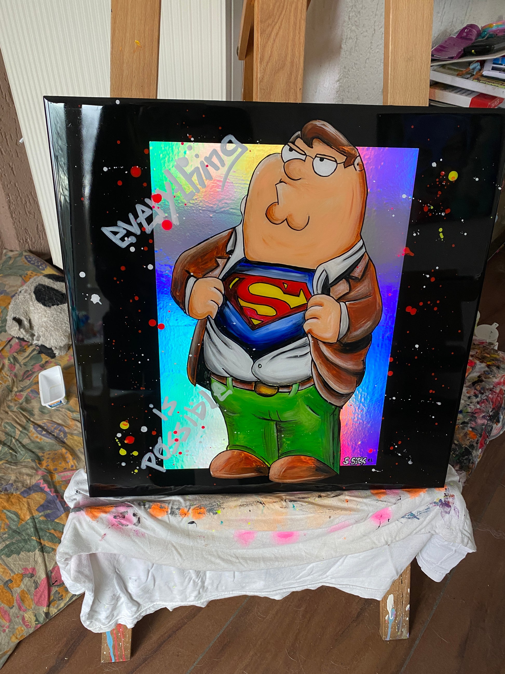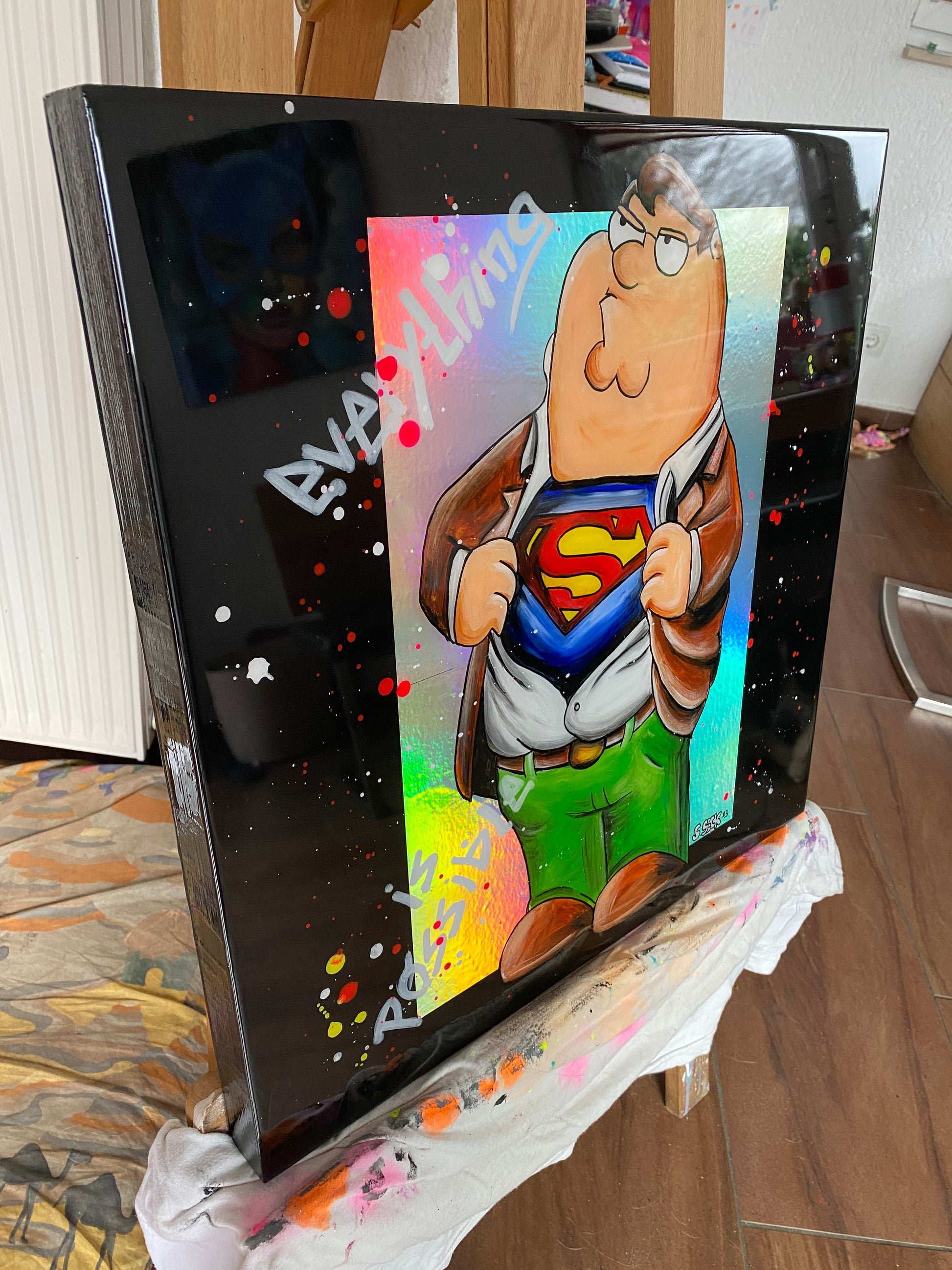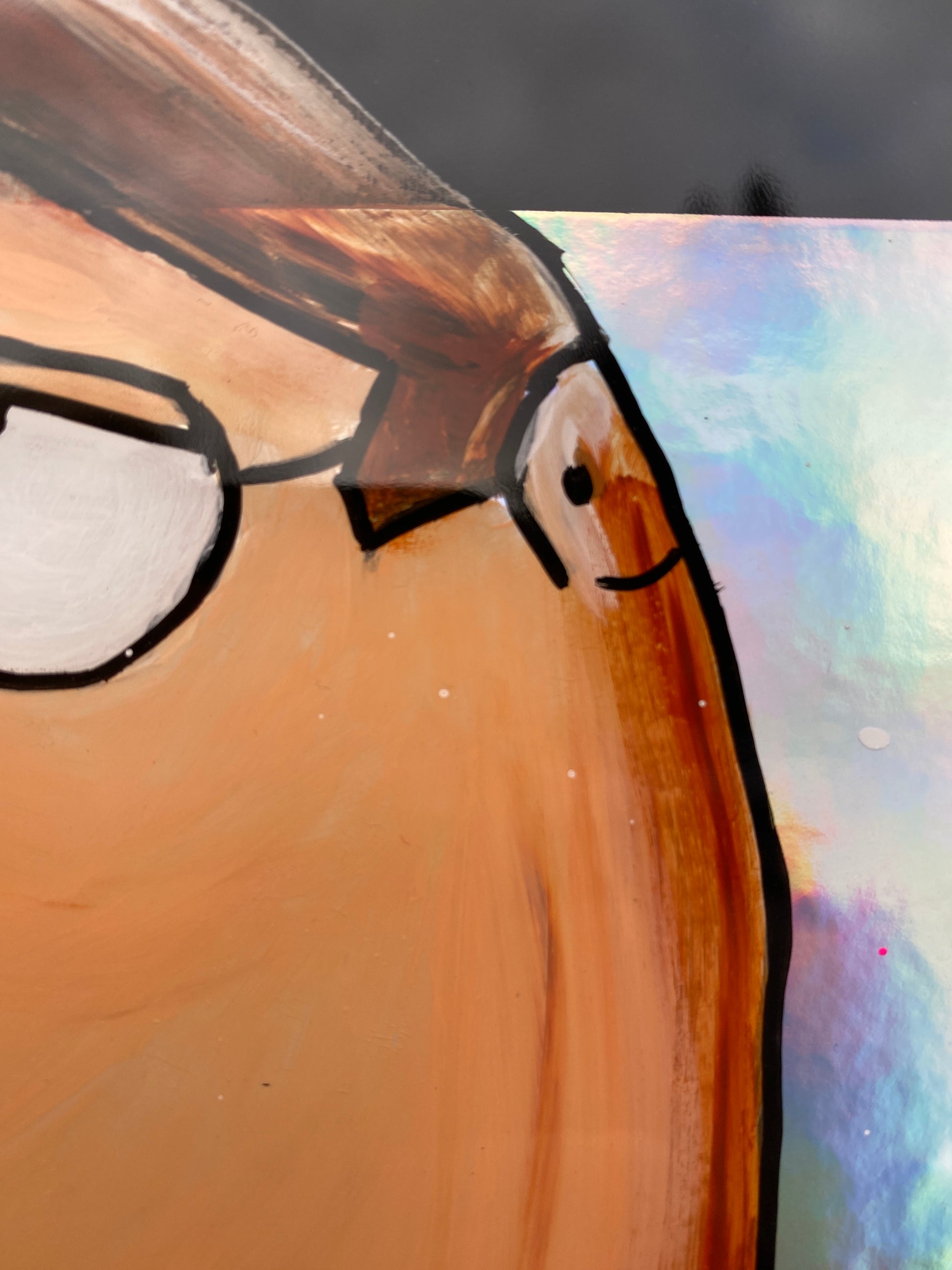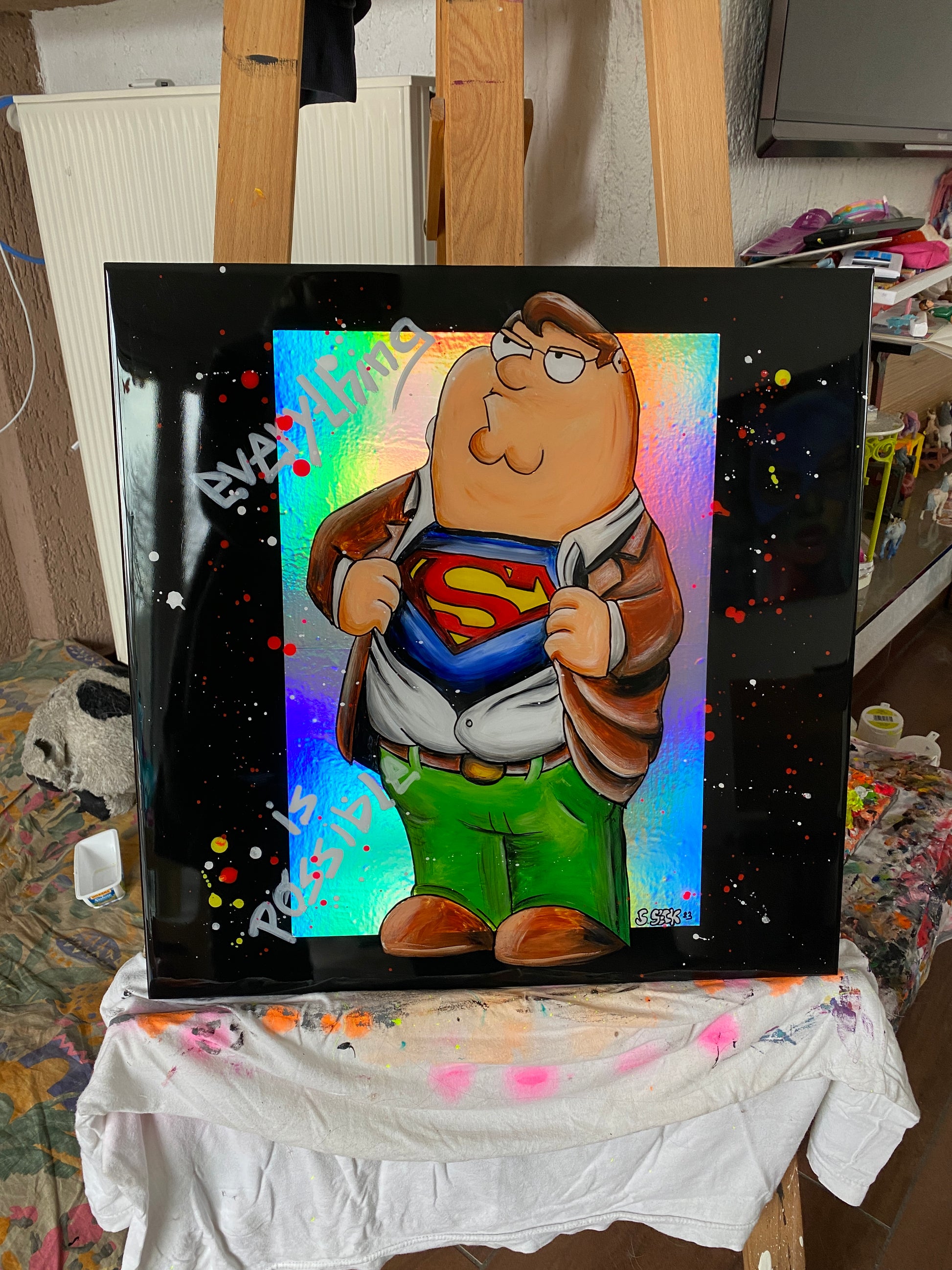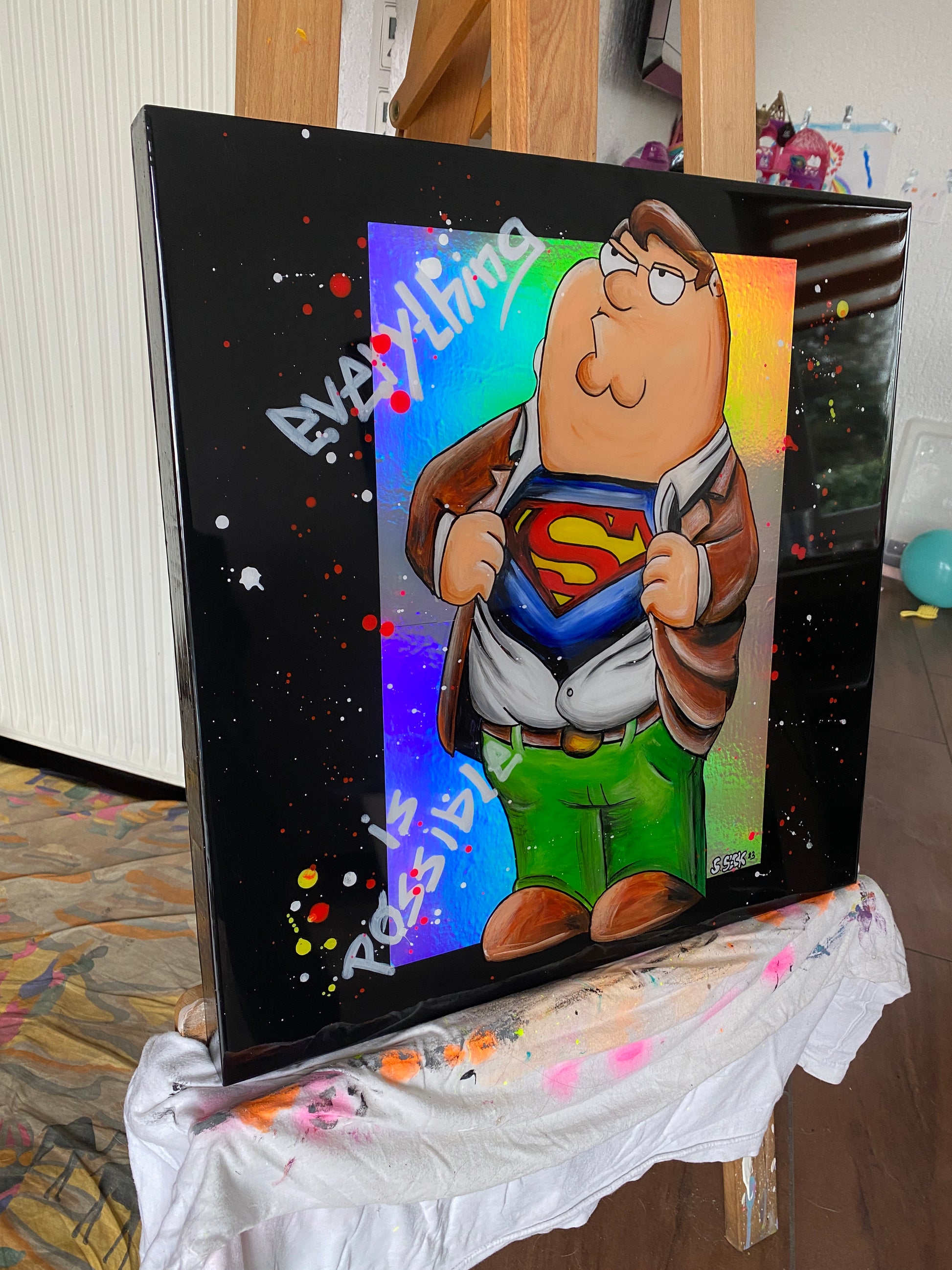 Dieses Werk wurde auf eine Holzleinwand gemalt. Der Hintergrund ist neben dem schwarz mit einer besonderen Folie versehen, die bei Bewegung in vielen verschiedenen Farben schimmert. Die Fotos zeigen diverse Farbgebungen, die entstehen können, wenn man an dem Werk vorbeiläuft.