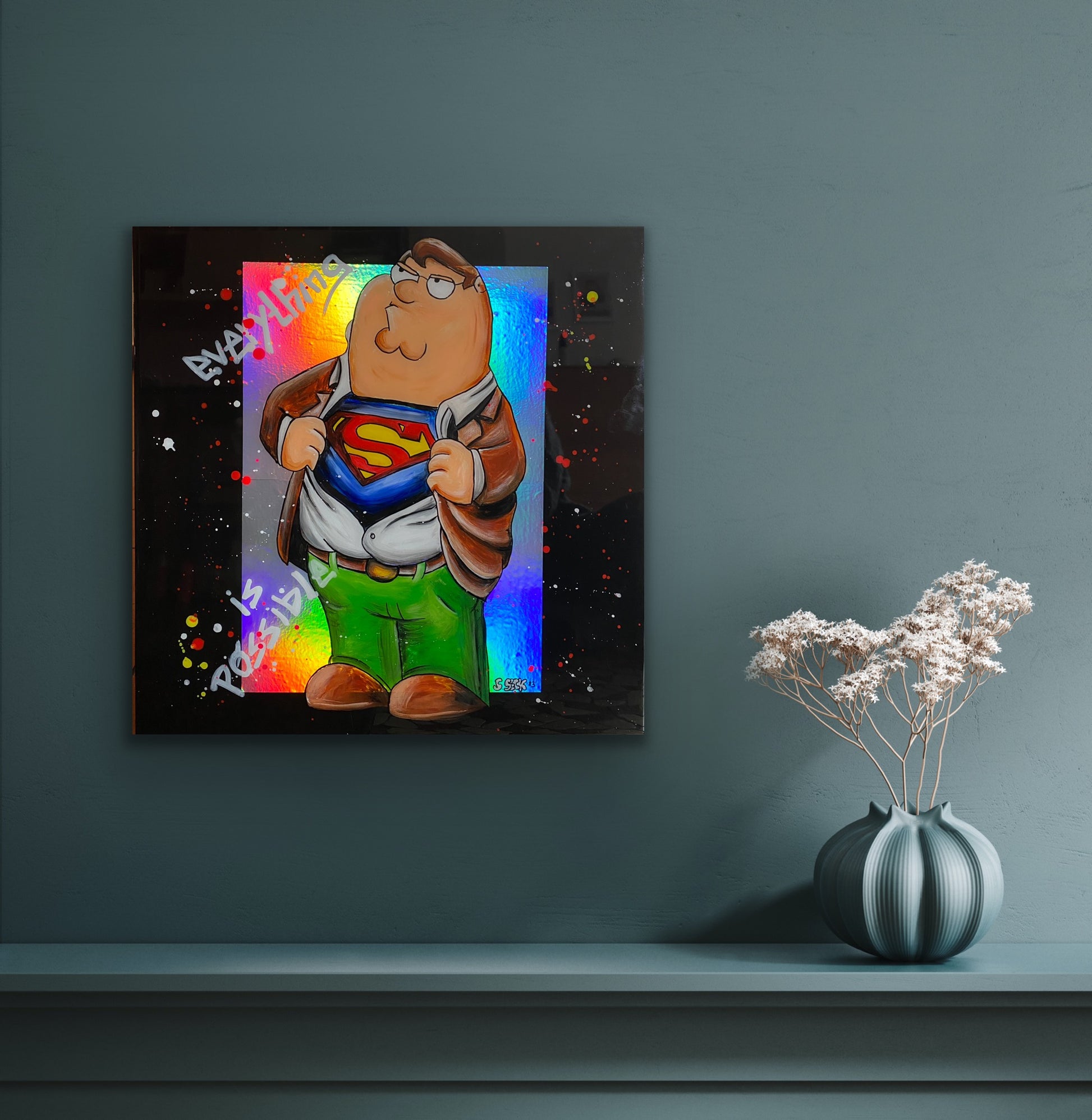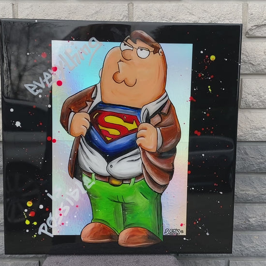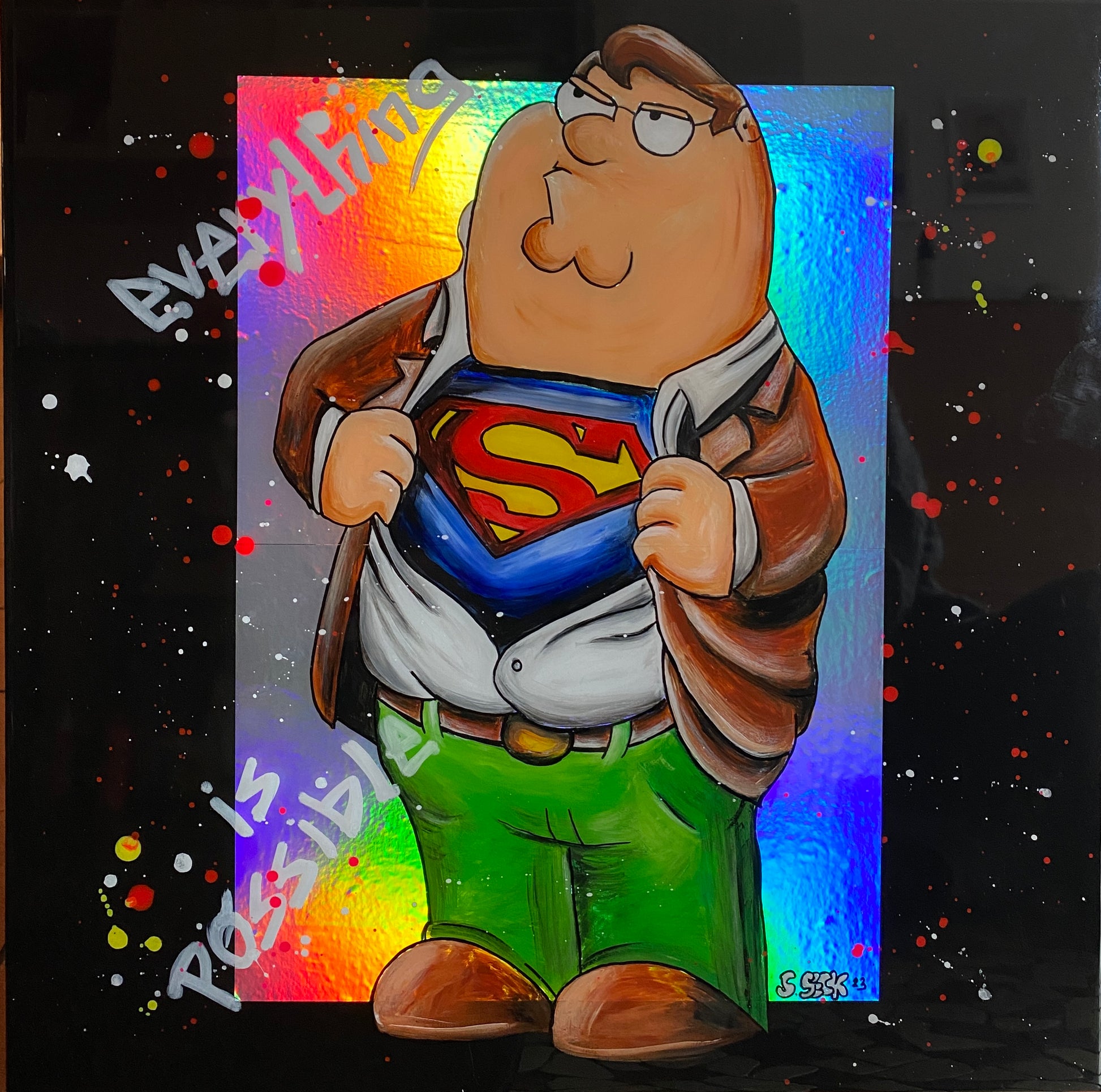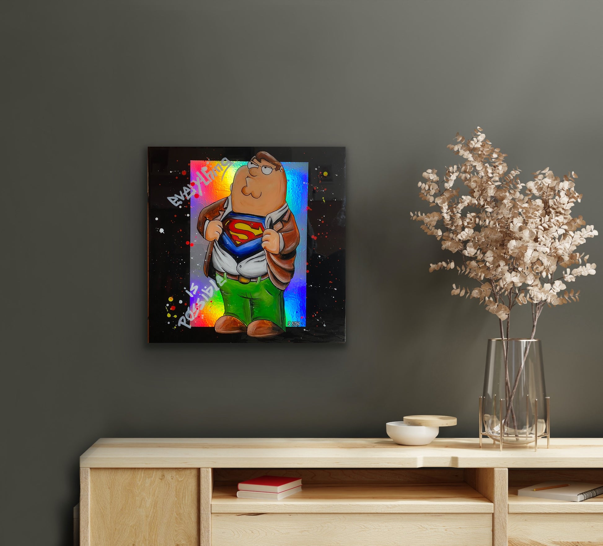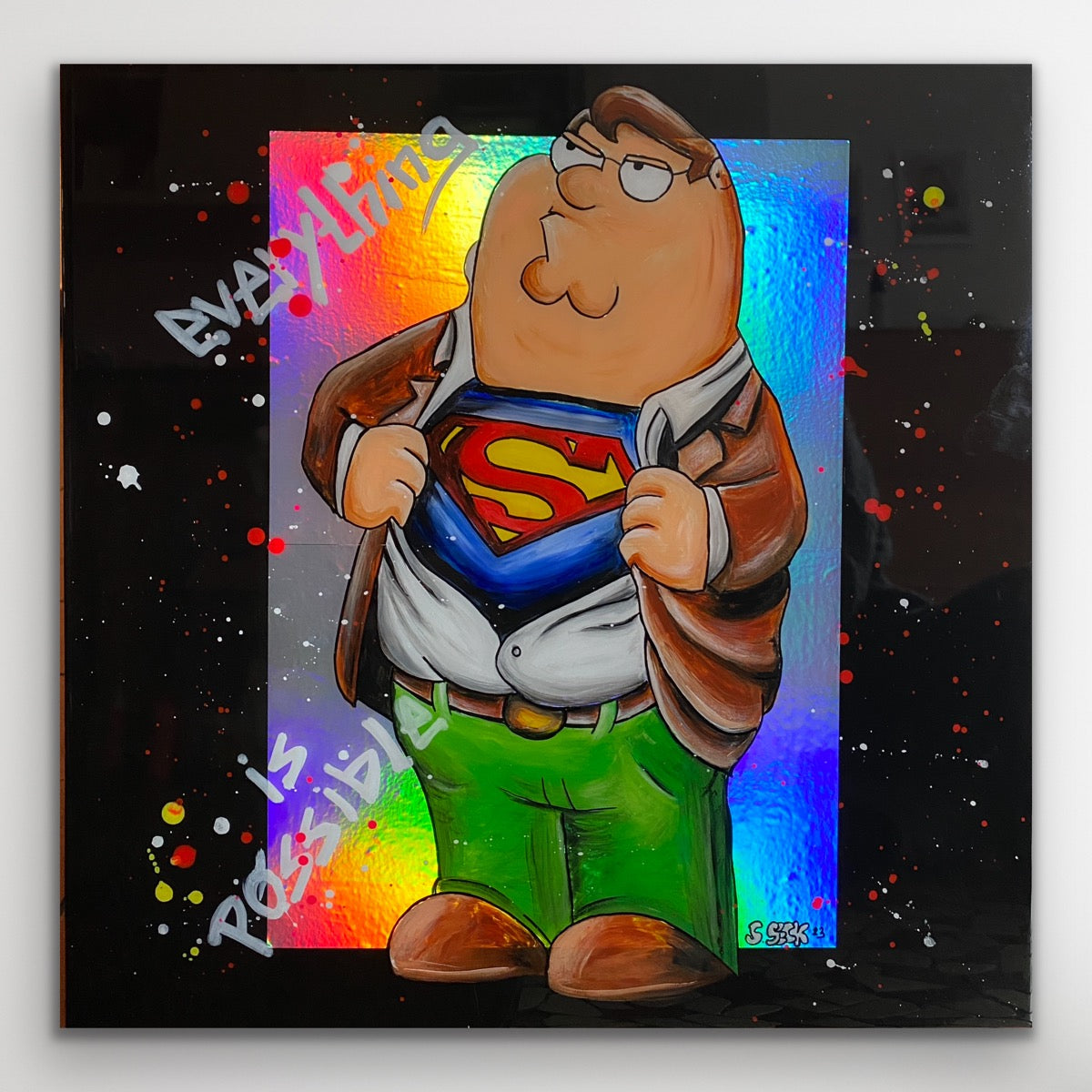 Dieses Werk wurde auf eine Holzleinwand gemalt. Der Hintergrund ist neben dem schwarz mit einer besonderen Folie versehen, die bei Bewegung in vielen verschiedenen Farben schimmert. Die Fotos zeigen diverse Farbgebungen, die entstehen können, wenn man an dem Werk vorbeiläuft.