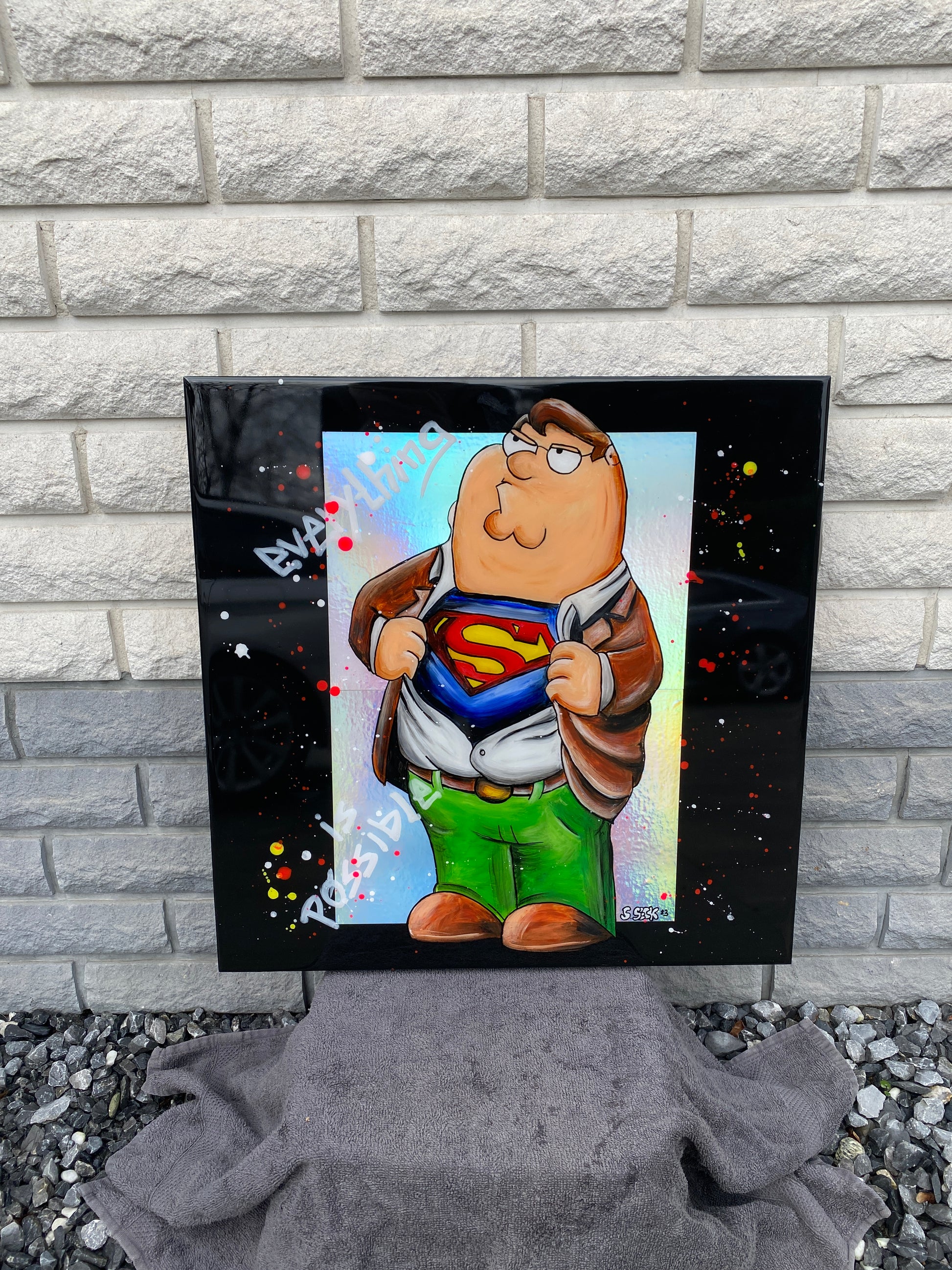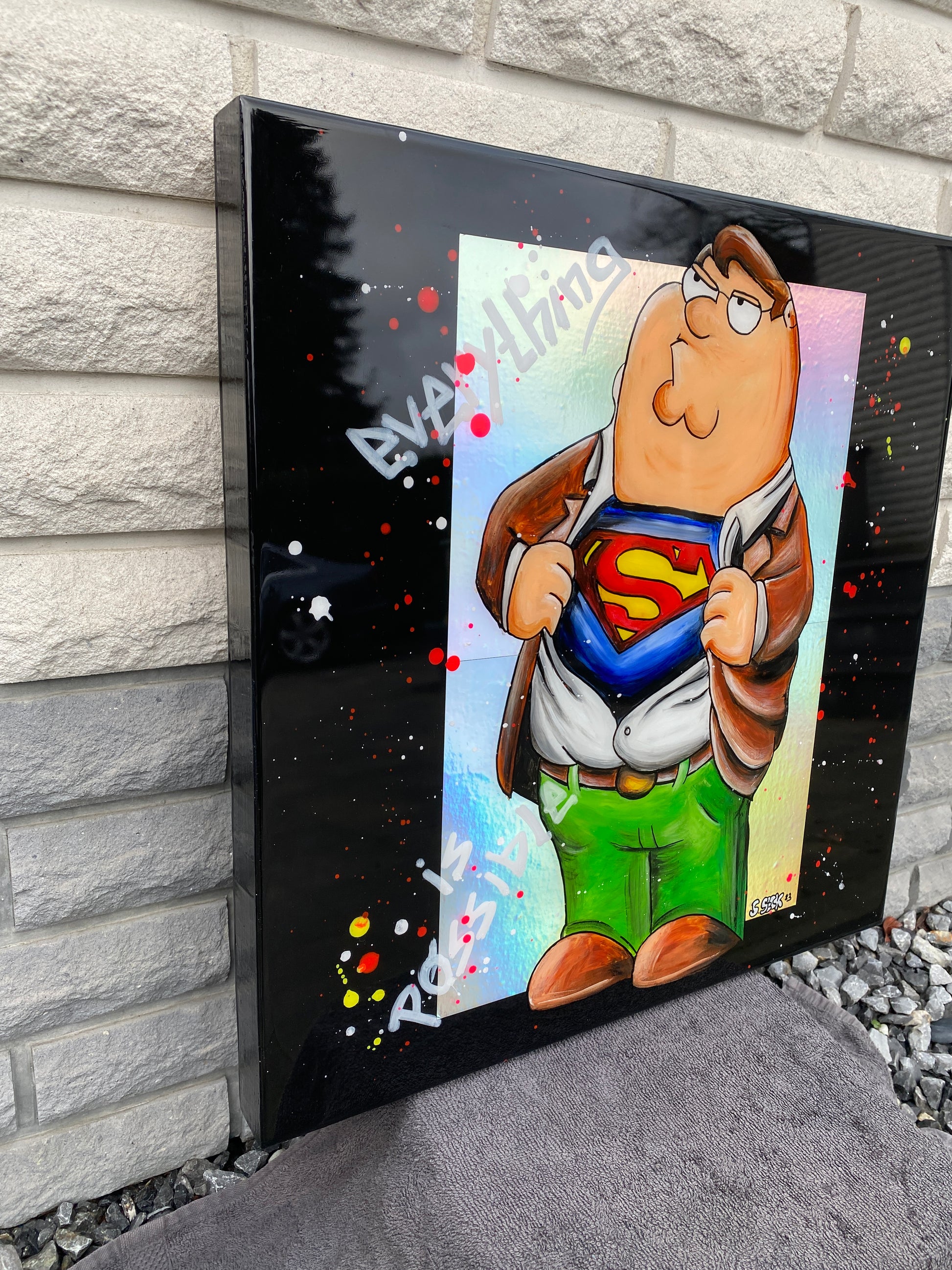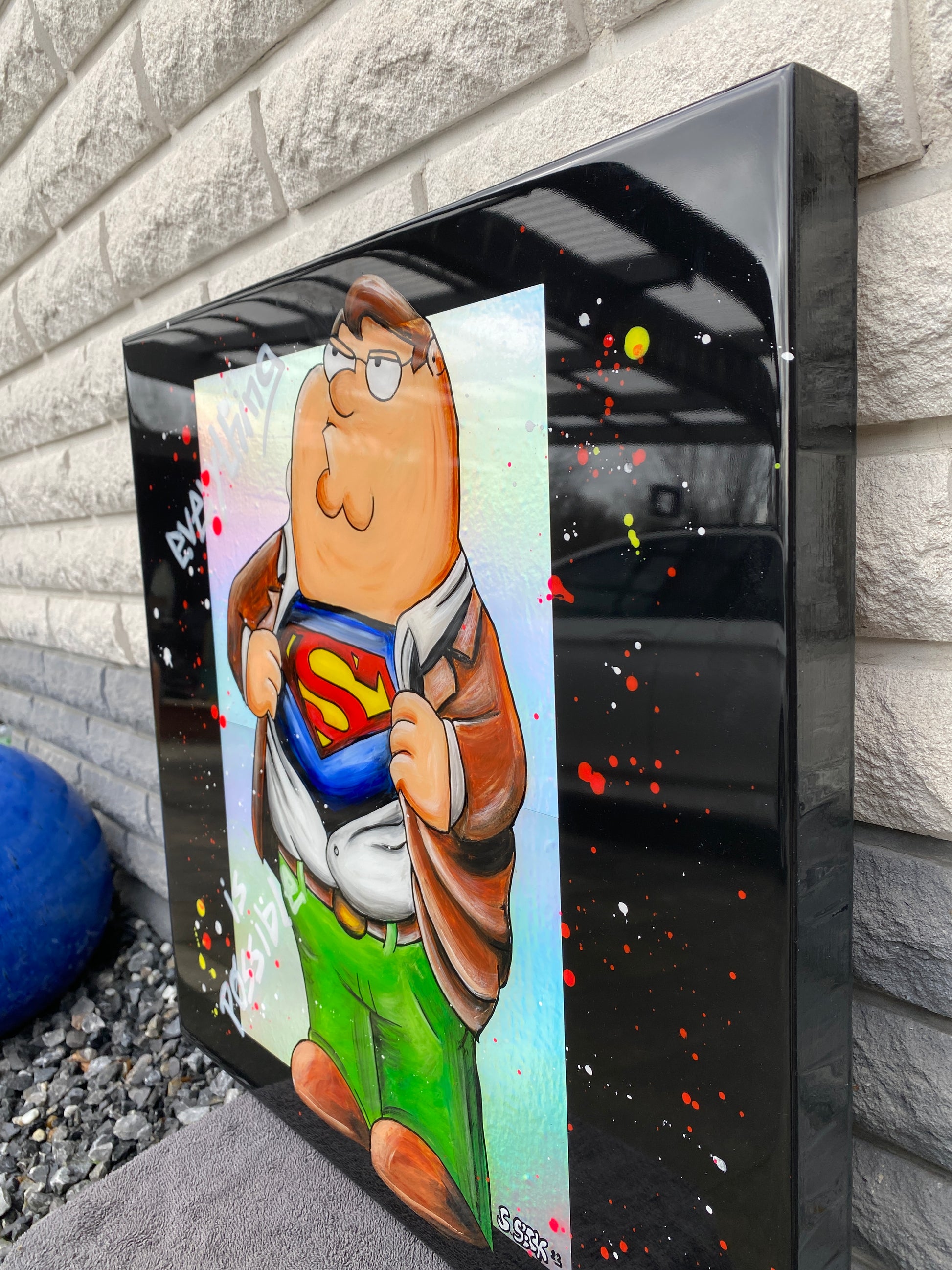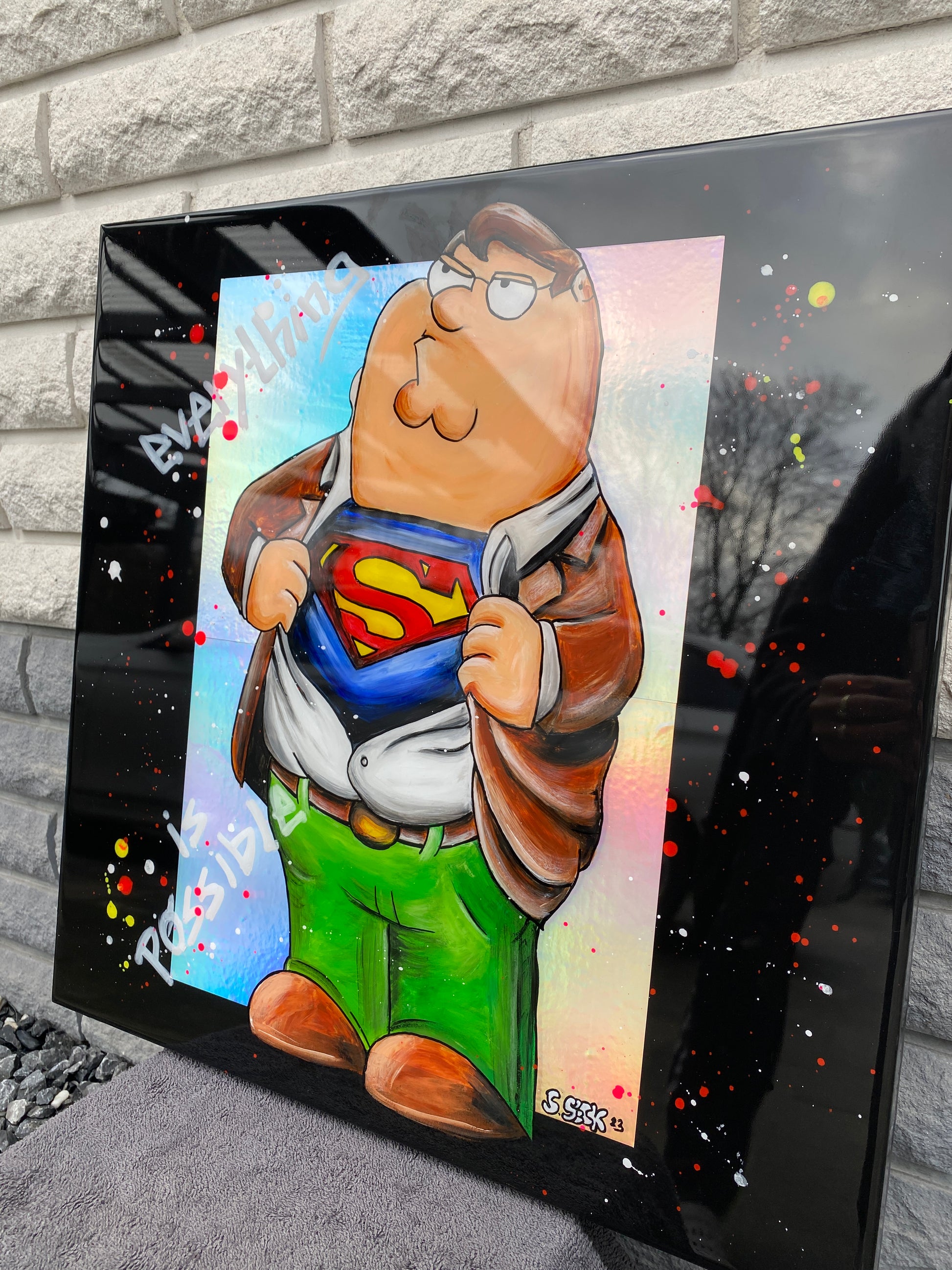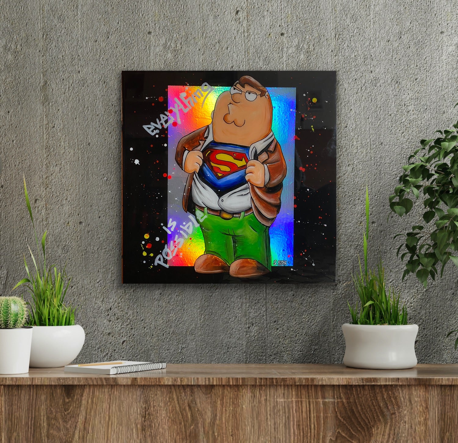 Dieses Werk wurde auf eine Holzleinwand gemalt. Der Hintergrund ist neben dem schwarz mit einer besonderen Folie versehen, die bei Bewegung in vielen verschiedenen Farben schimmert. Die Fotos zeigen diverse Farbgebungen, die entstehen können, wenn man an dem Werk vorbeiläuft.