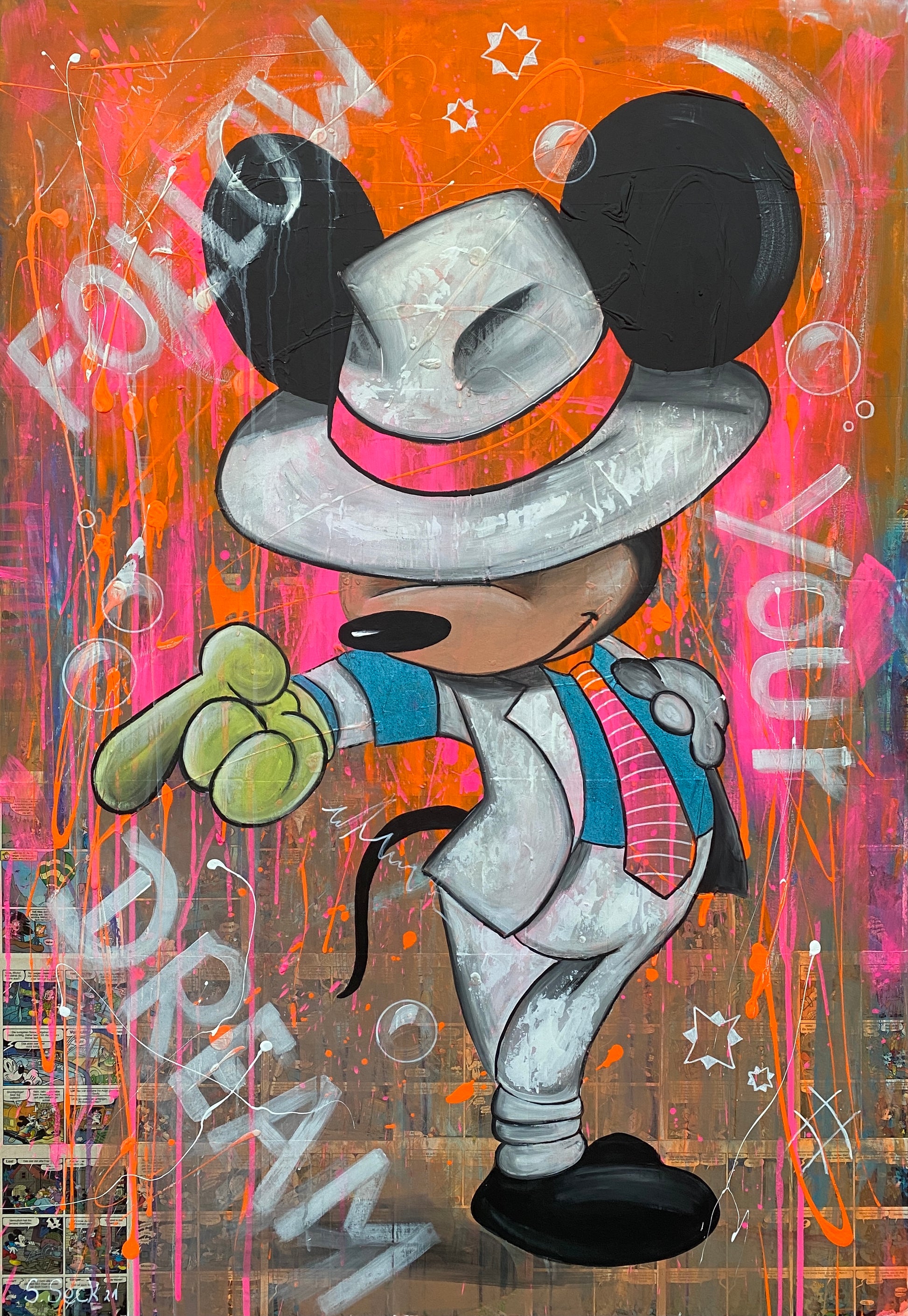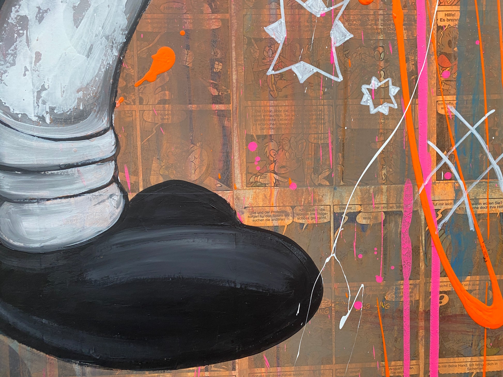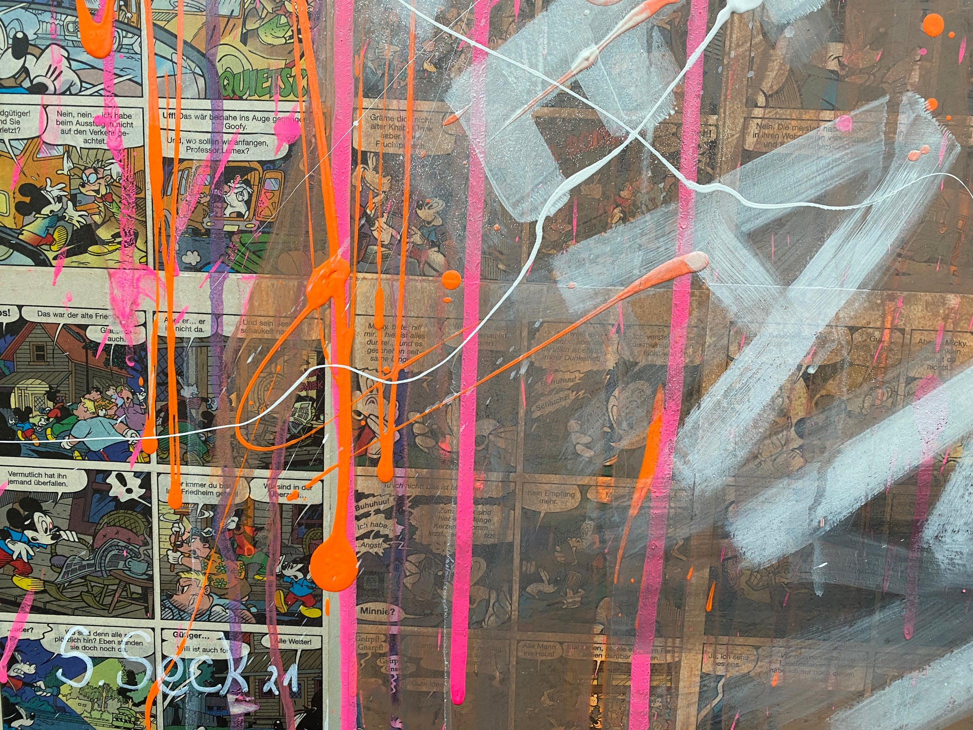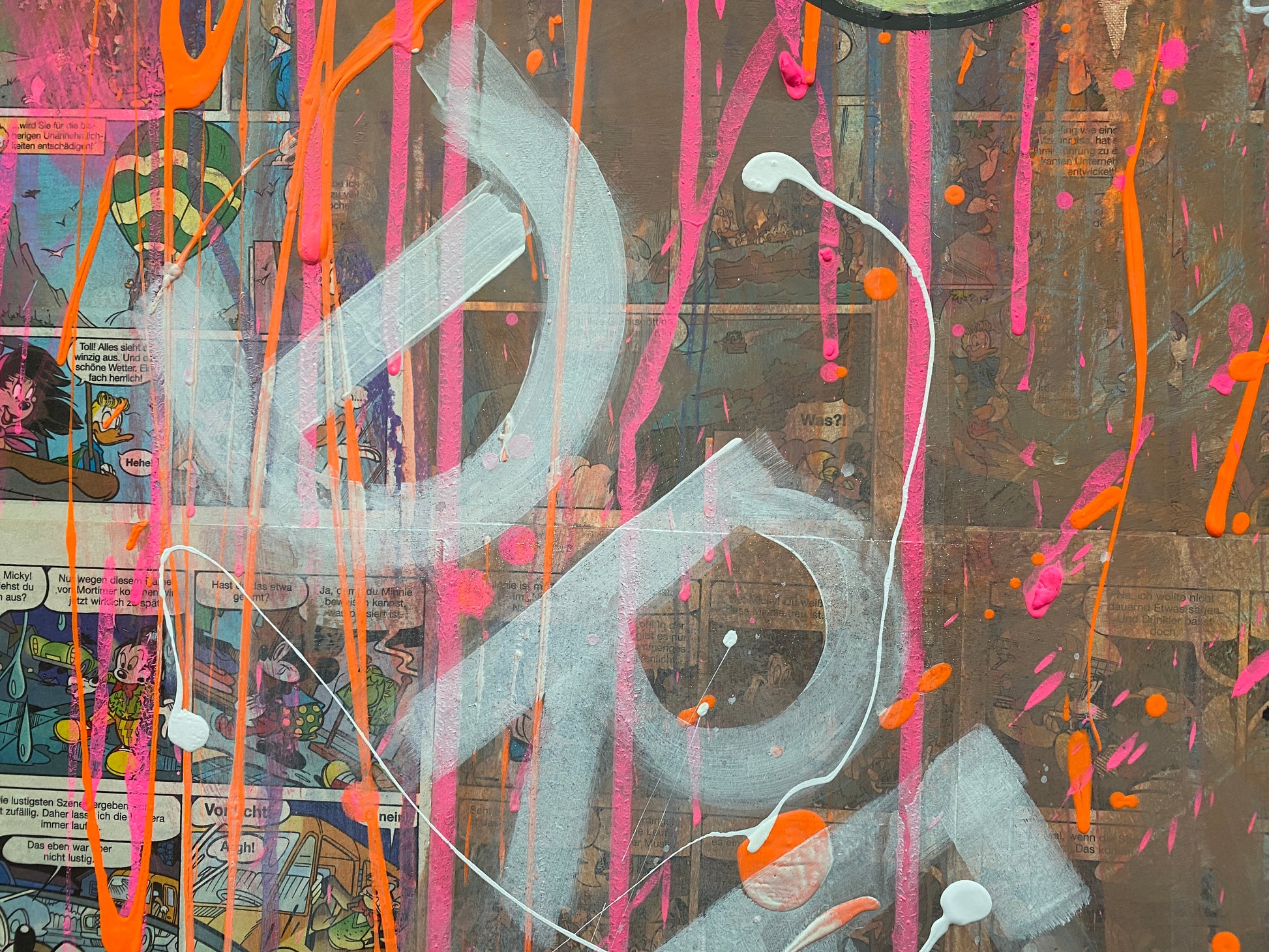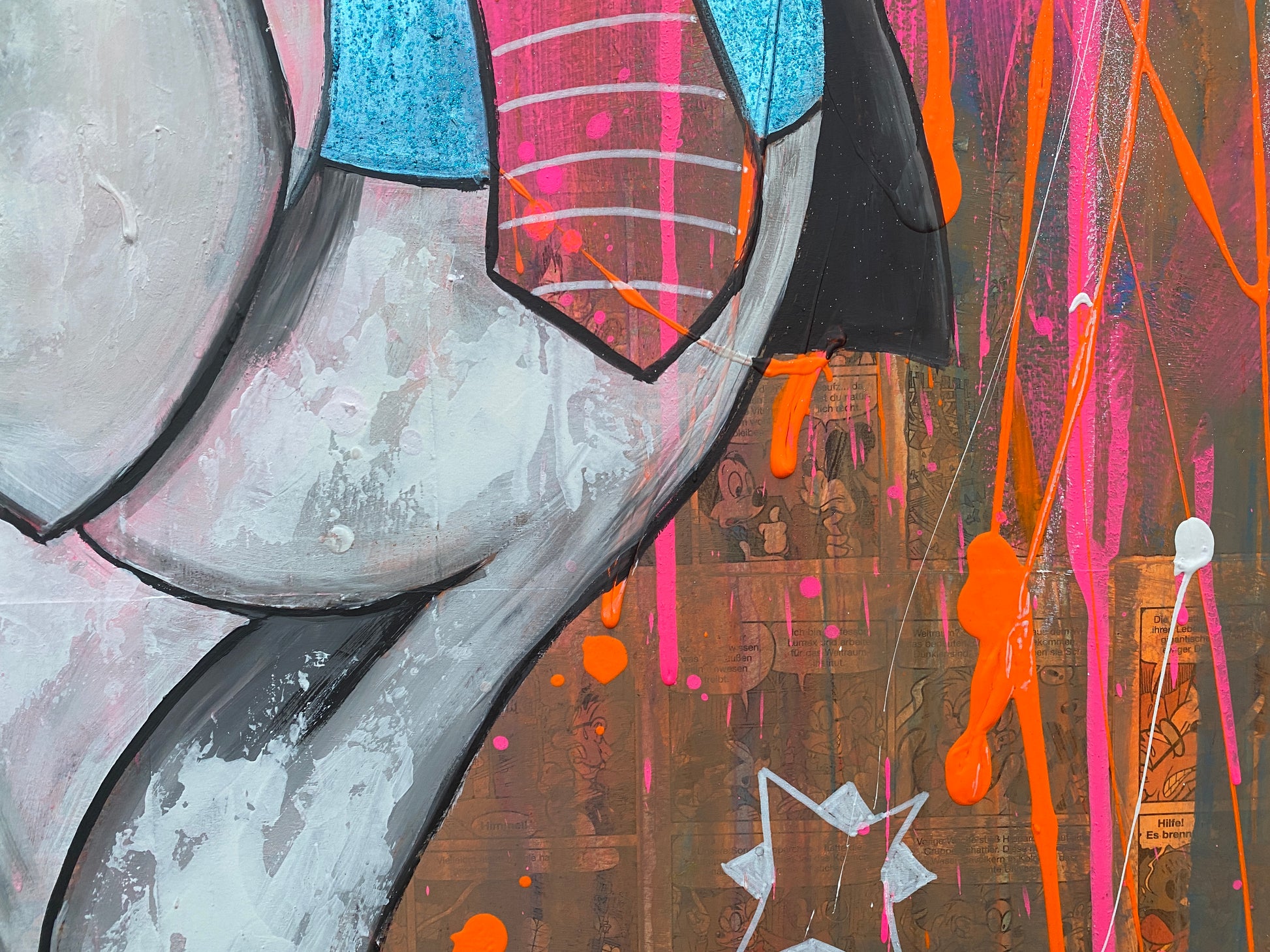 Die Leinwand wurde mit einzelnen Seiten eines Comic-Buches versehen. So entstand ein interessanter Untergrund, denn die einzelnen Comicseiten sind zum Teil gut zu sehen oder schimmern noch etwas durch. Durch die zum Teil welligen Seiten entstand zusätzlich eine interessante Struktur, der Pop-Art Stil in seinen grellen Farben rundet das Ganze ab.