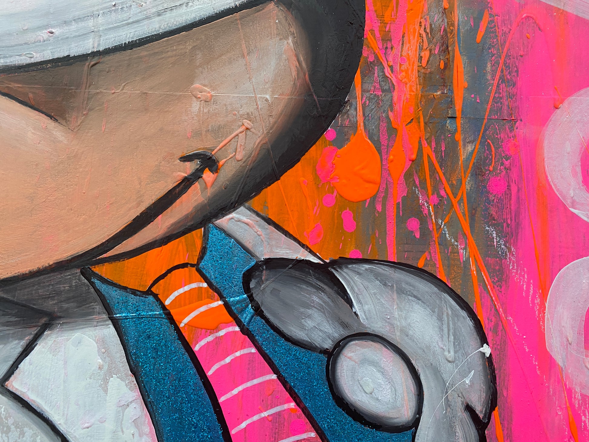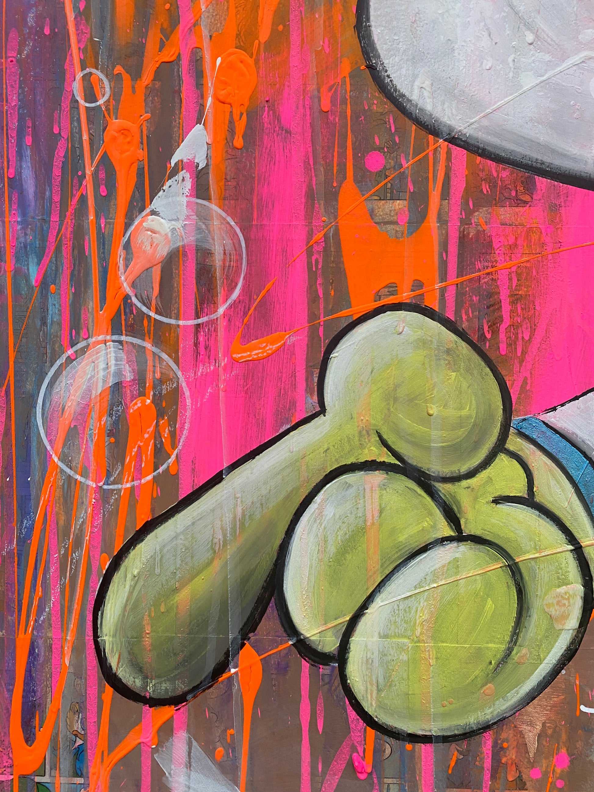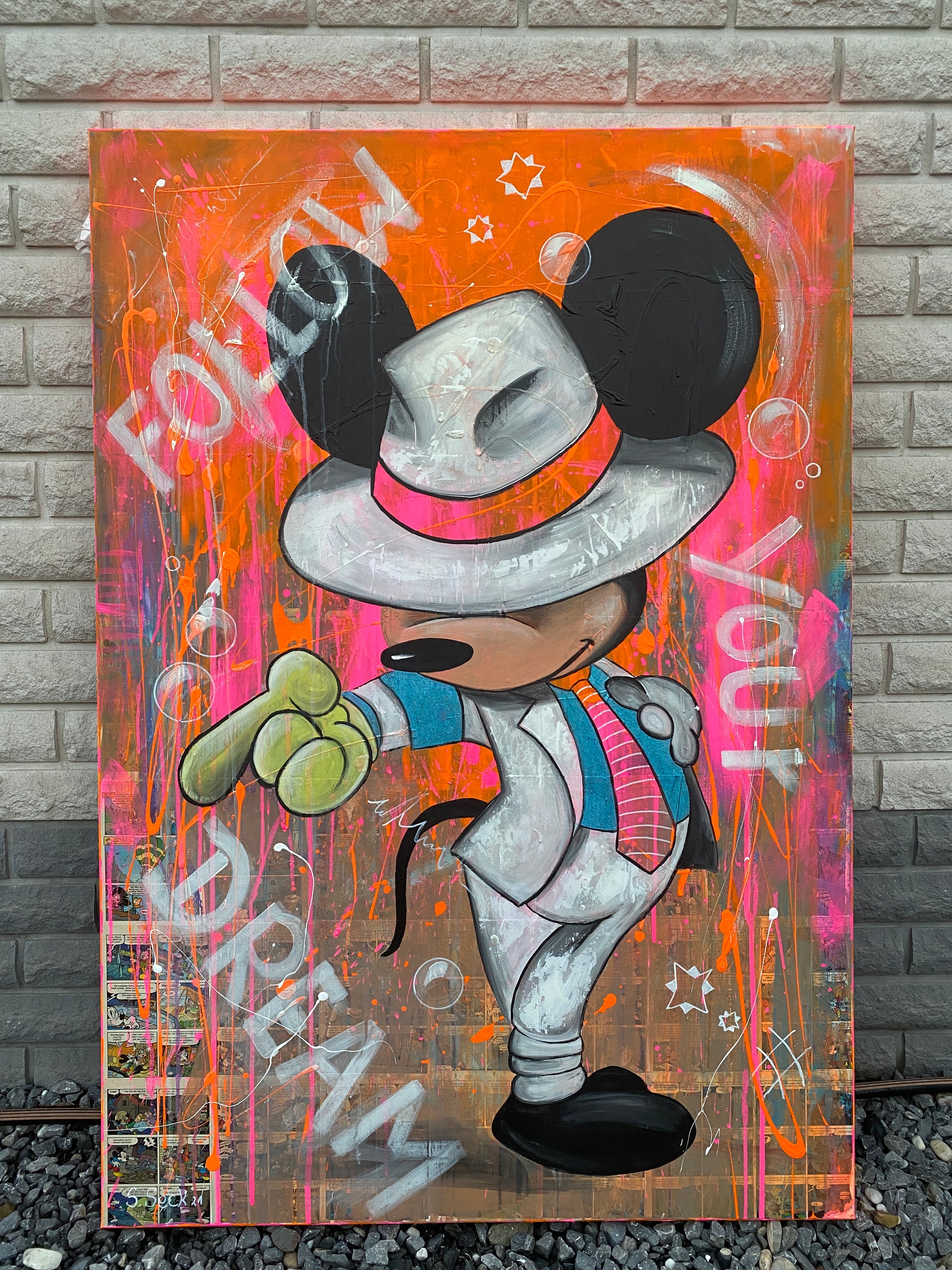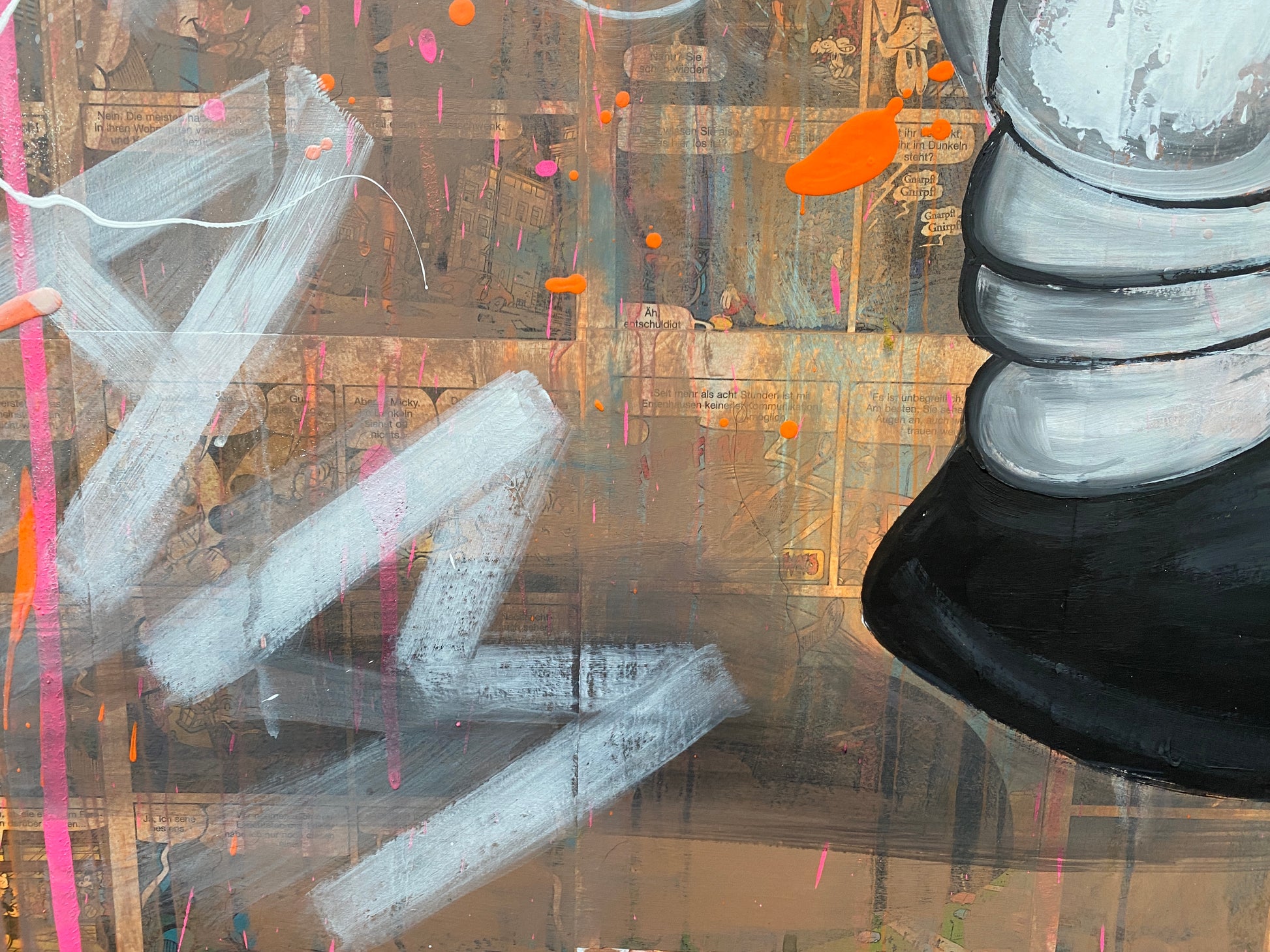 Die Leinwand wurde mit einzelnen Seiten eines Comic-Buches versehen. So entstand ein interessanter Untergrund, denn die einzelnen Comicseiten sind zum Teil gut zu sehen oder schimmern noch etwas durch. Durch die zum Teil welligen Seiten entstand zusätzlich eine interessante Struktur, der Pop-Art Stil in seinen grellen Farben rundet das Ganze ab.