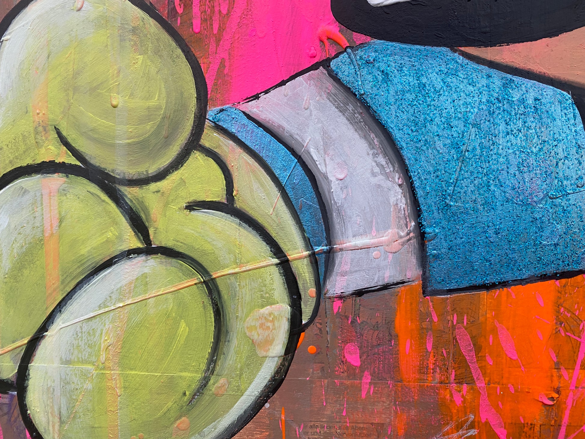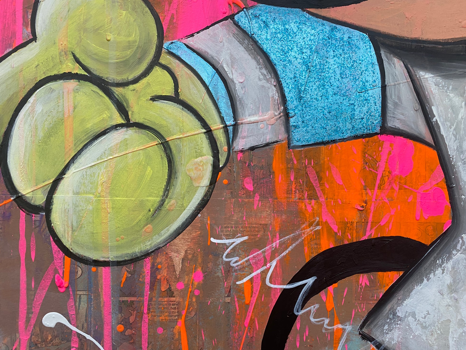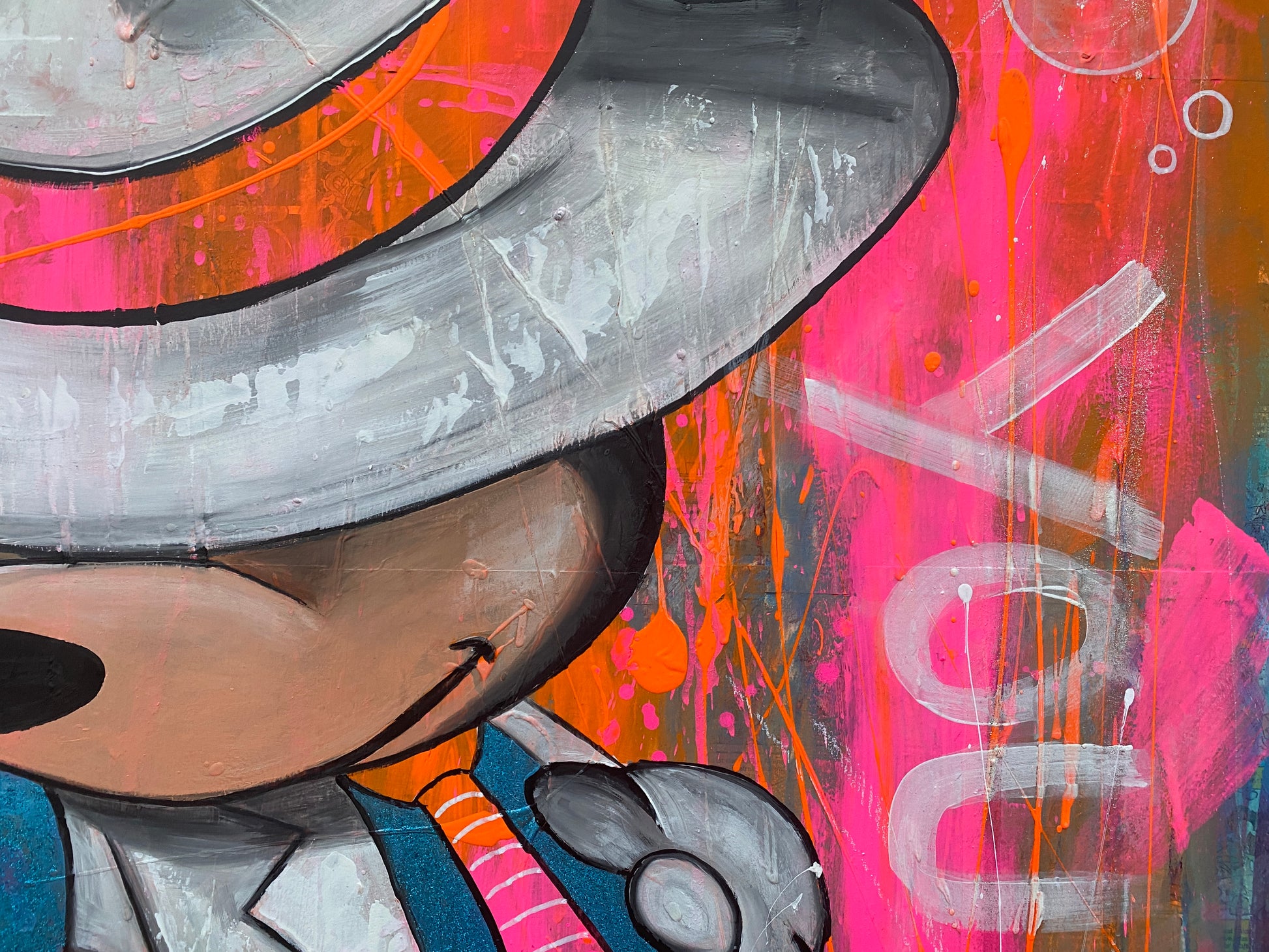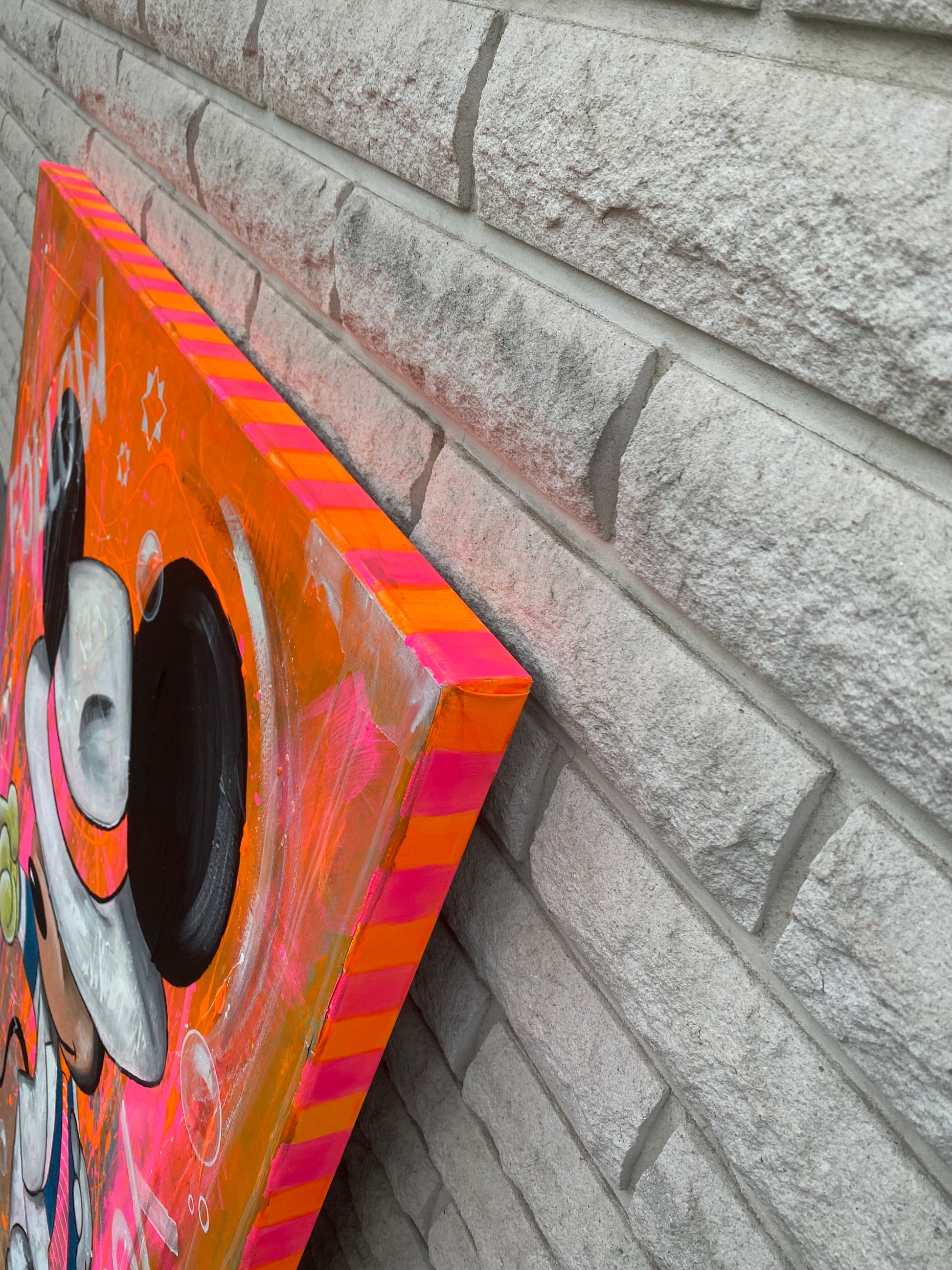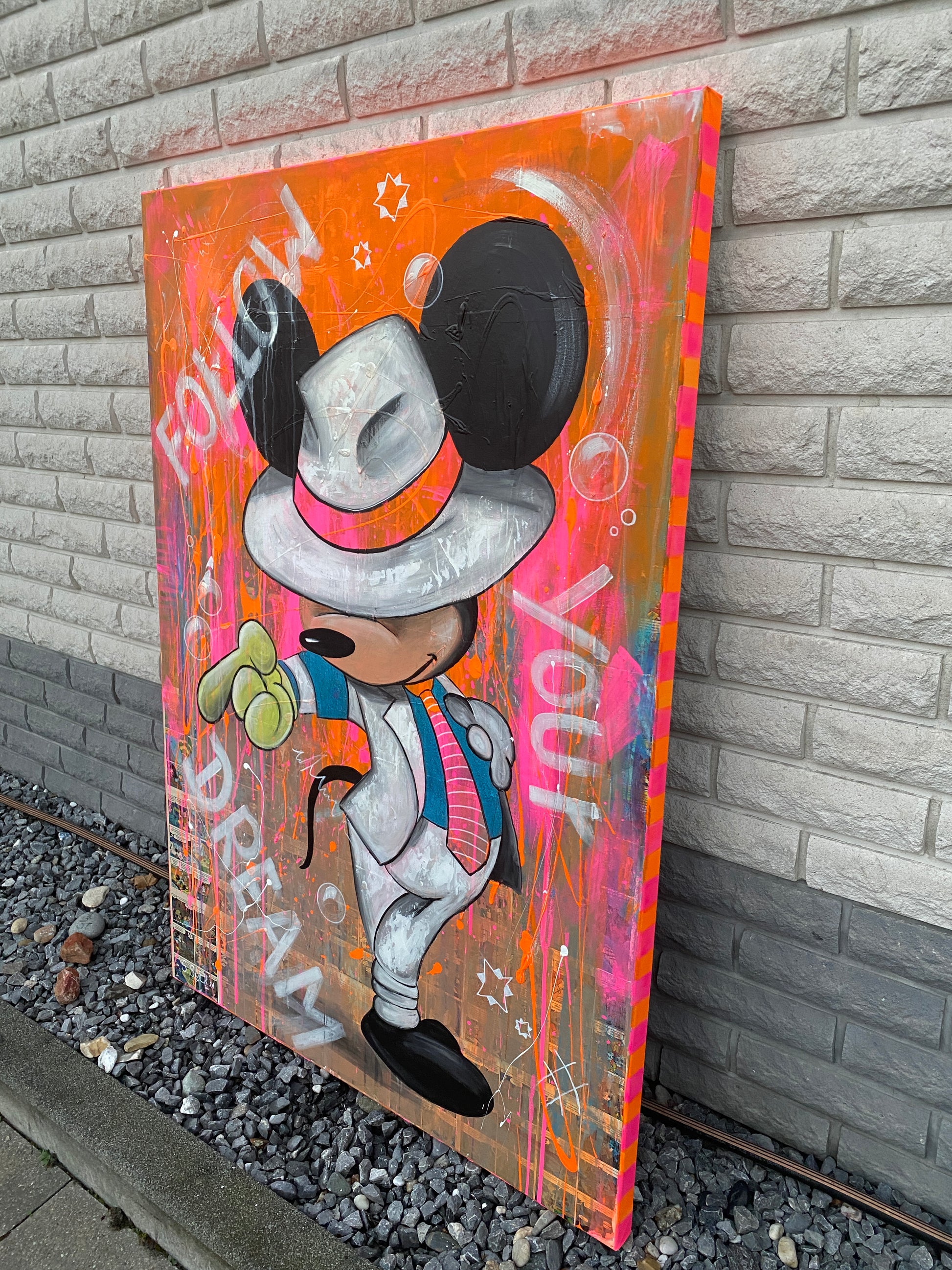 Die Leinwand wurde mit einzelnen Seiten eines Comic-Buches versehen. So entstand ein interessanter Untergrund, denn die einzelnen Comicseiten sind zum Teil gut zu sehen oder schimmern noch etwas durch. Durch die zum Teil welligen Seiten entstand zusätzlich eine interessante Struktur, der Pop-Art Stil in seinen grellen Farben rundet das Ganze ab.